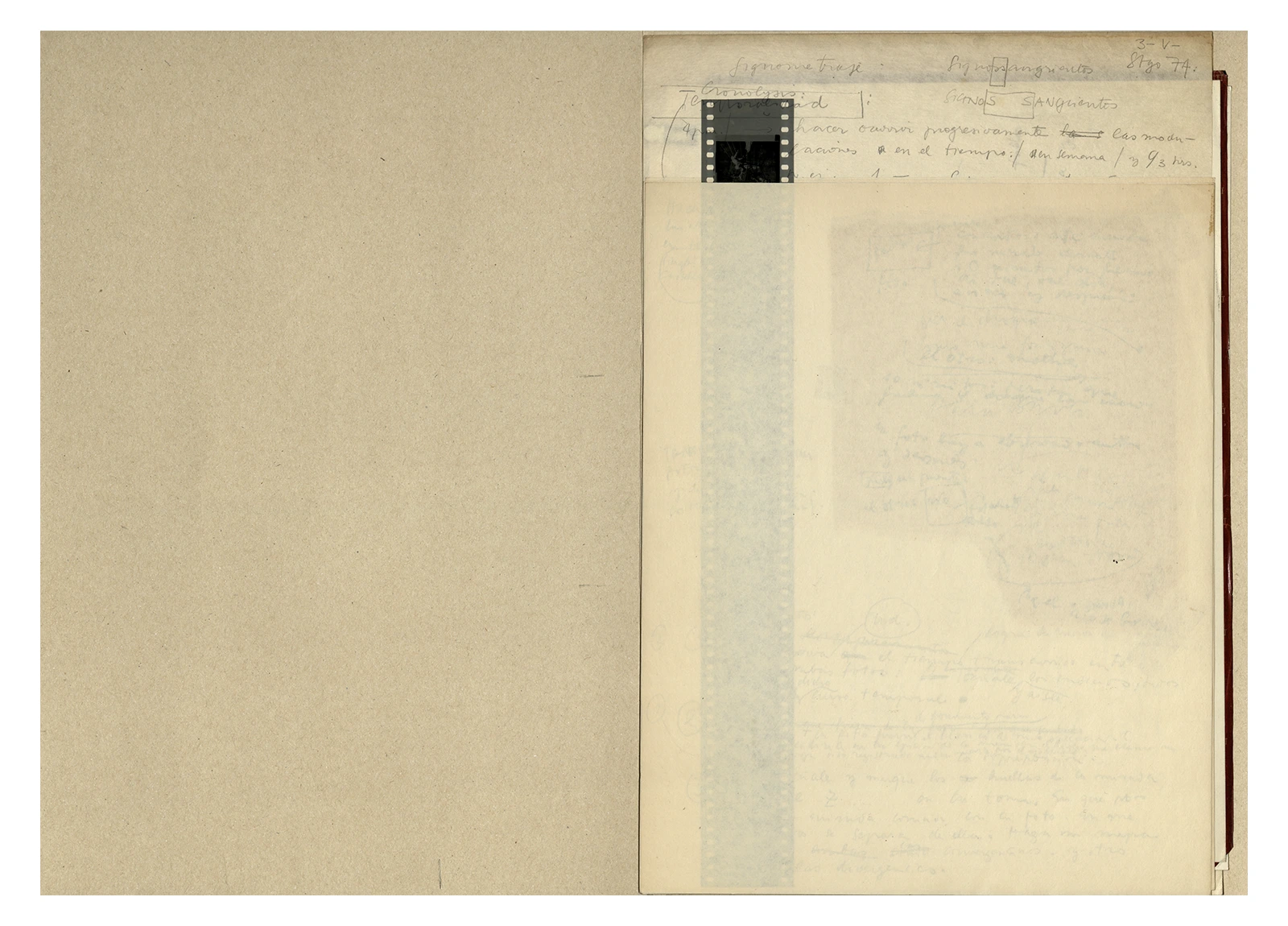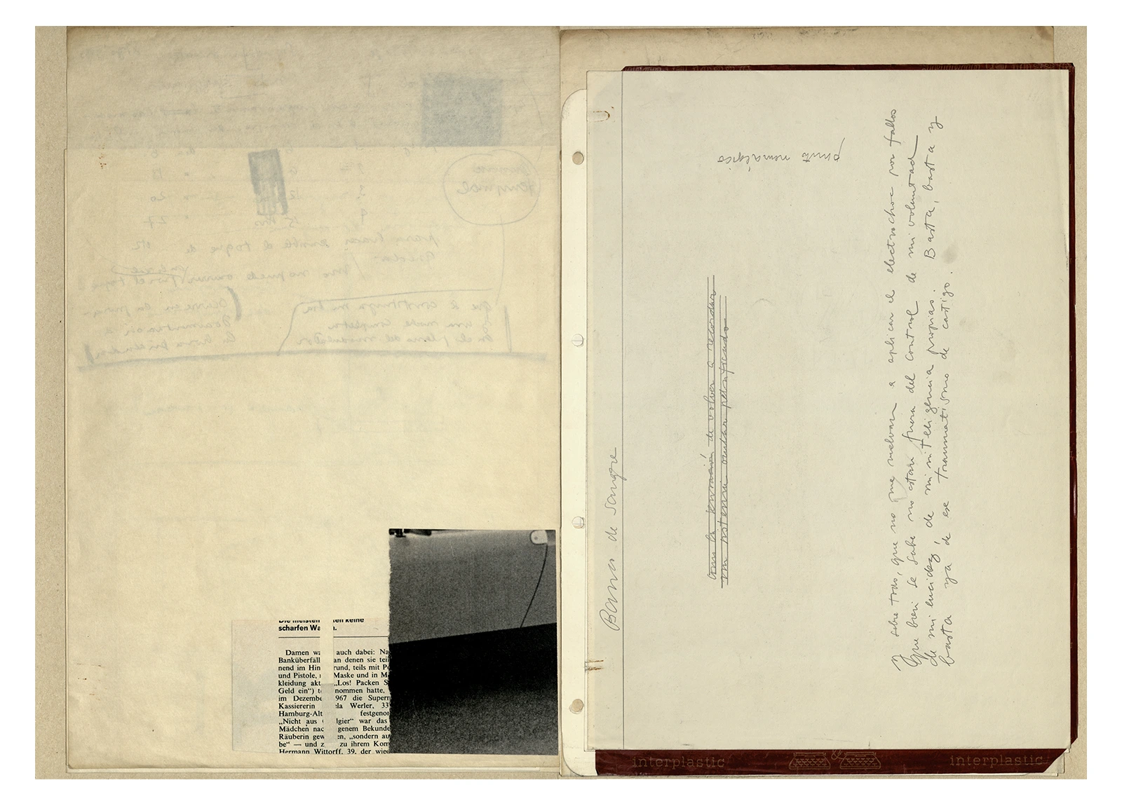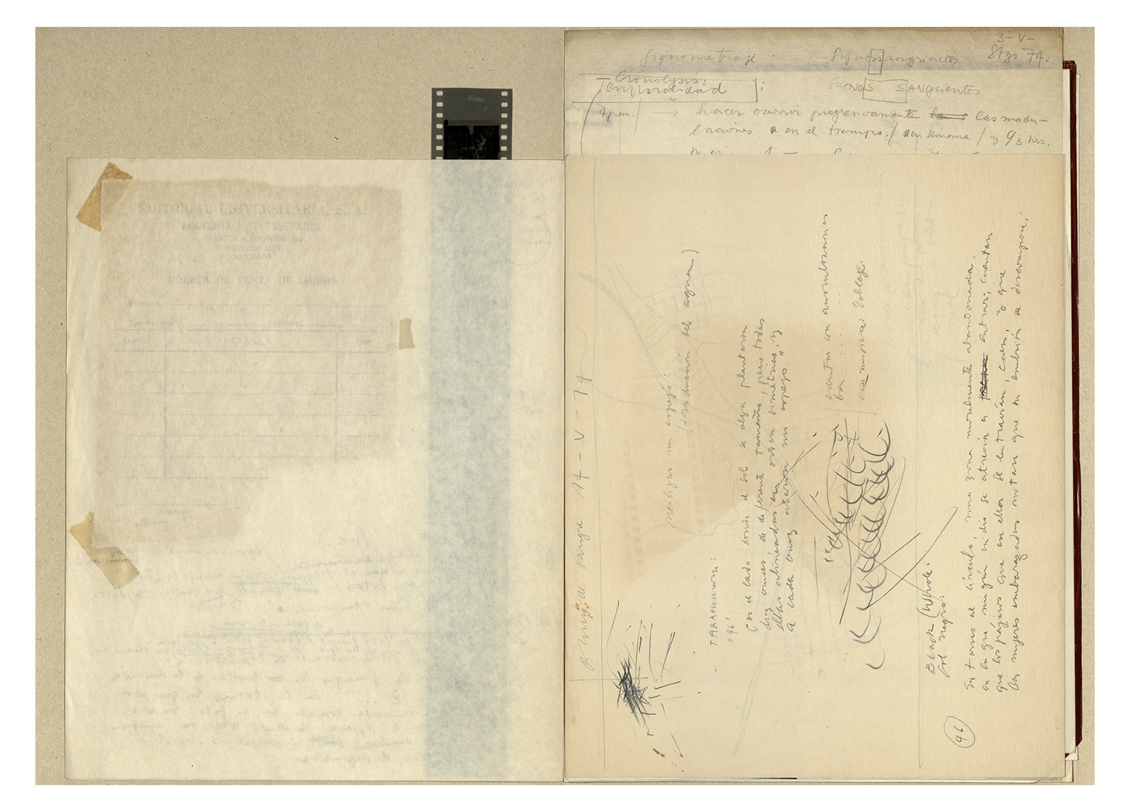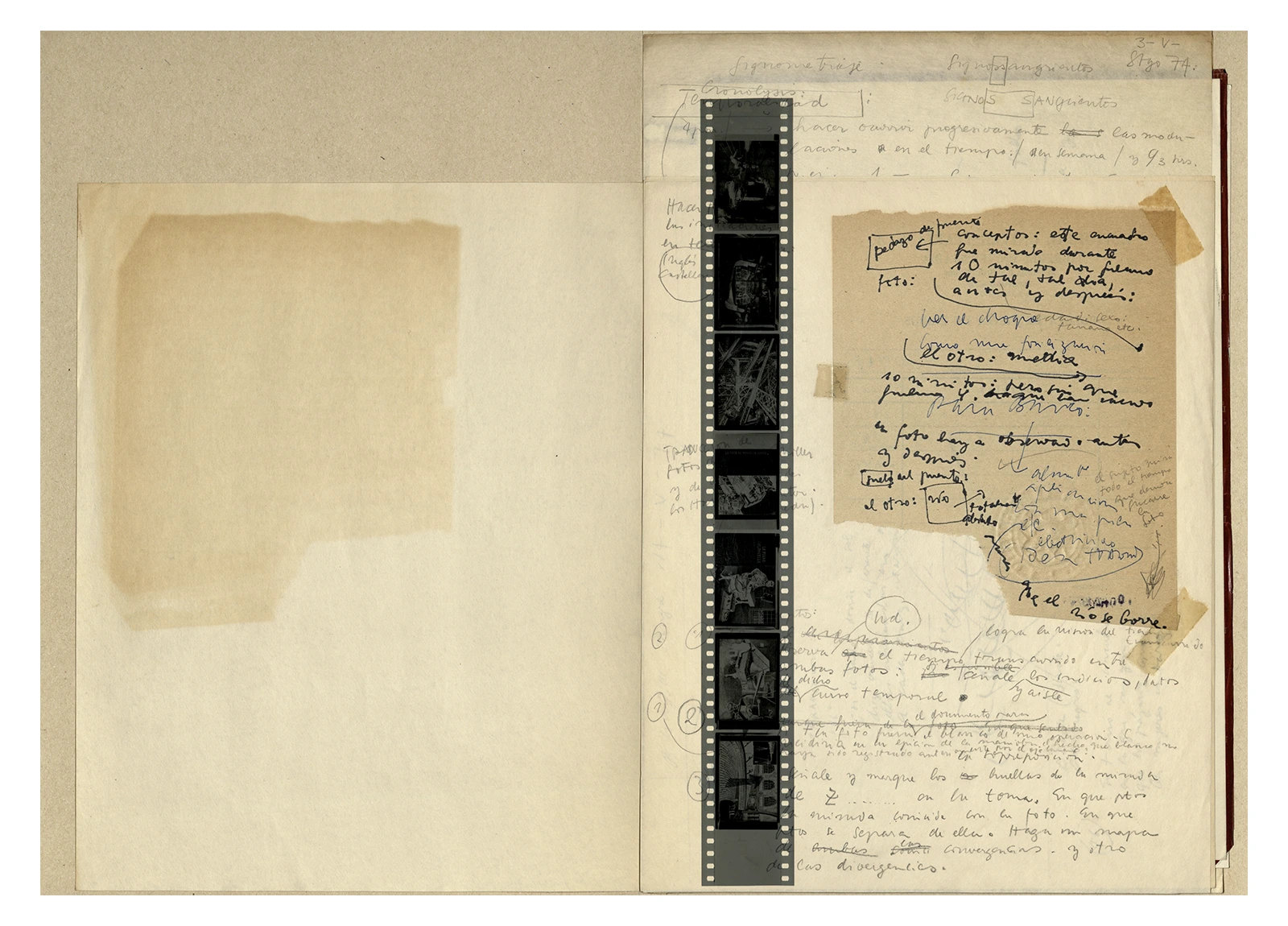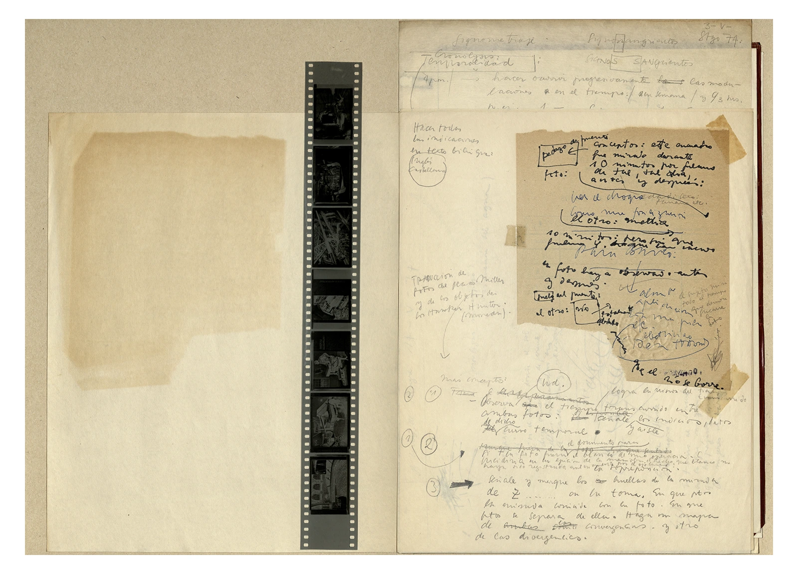 Notas manuscritas sobre papel en grafito, tinta y pasta, tira de negativo, fotografía en color, recortes de diarios y revistas, papel calco, cartón perforado, cinta adhesiva transparente.