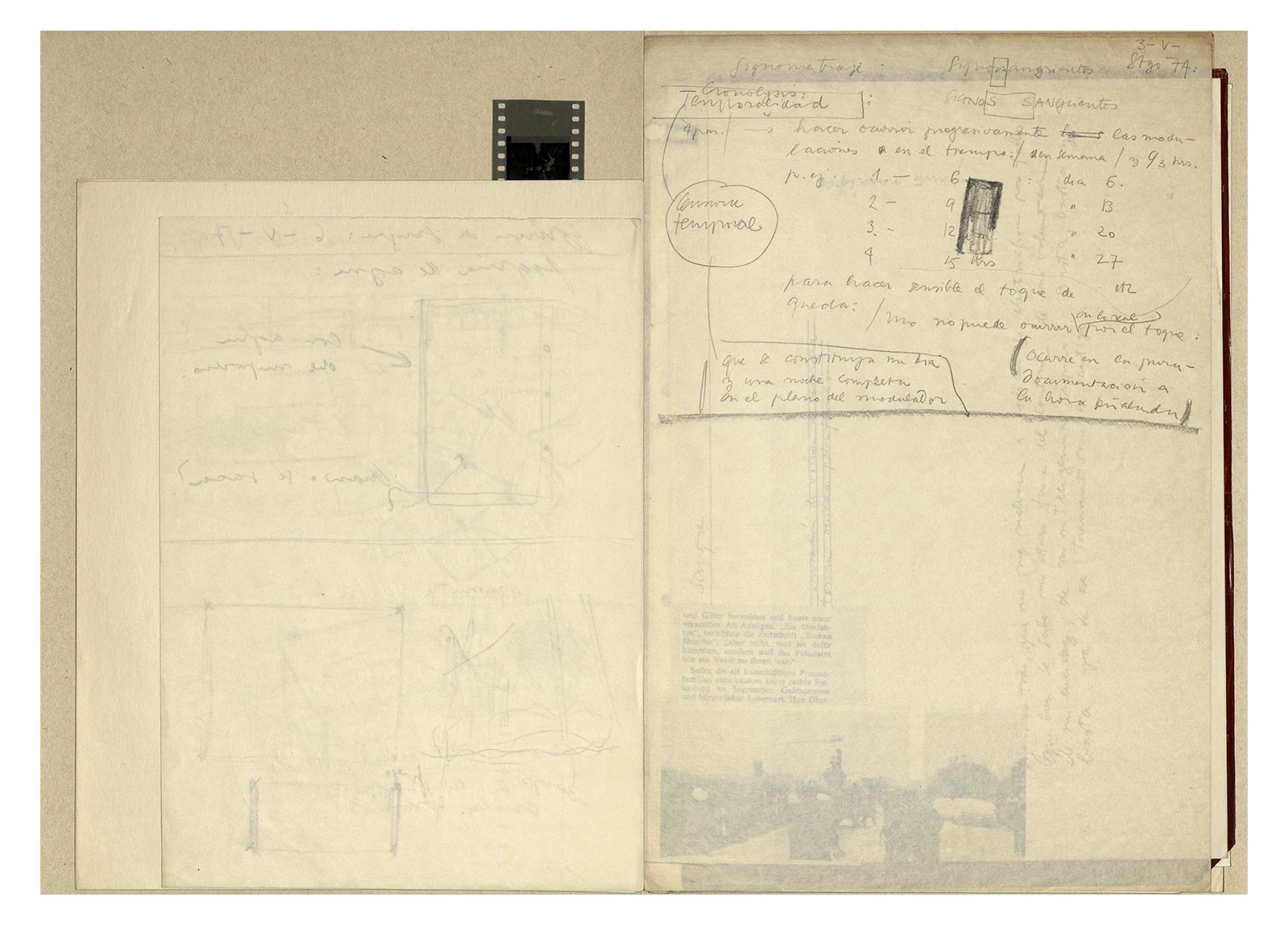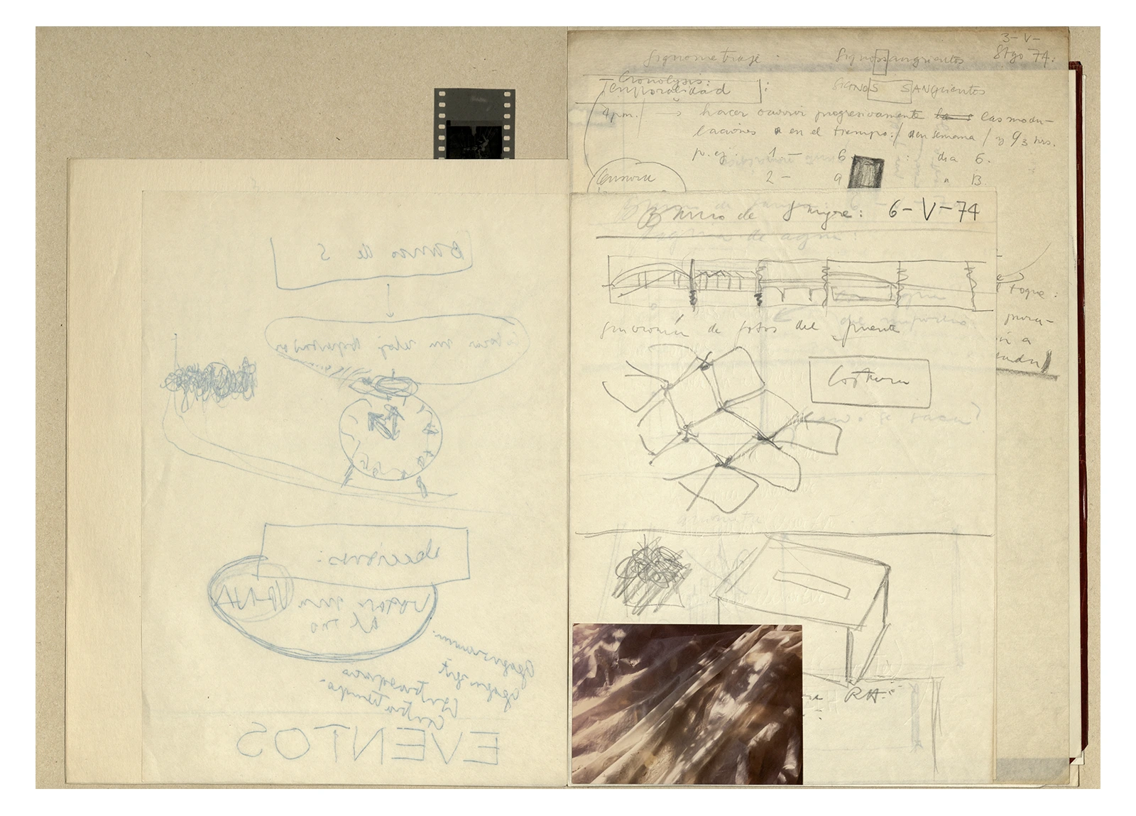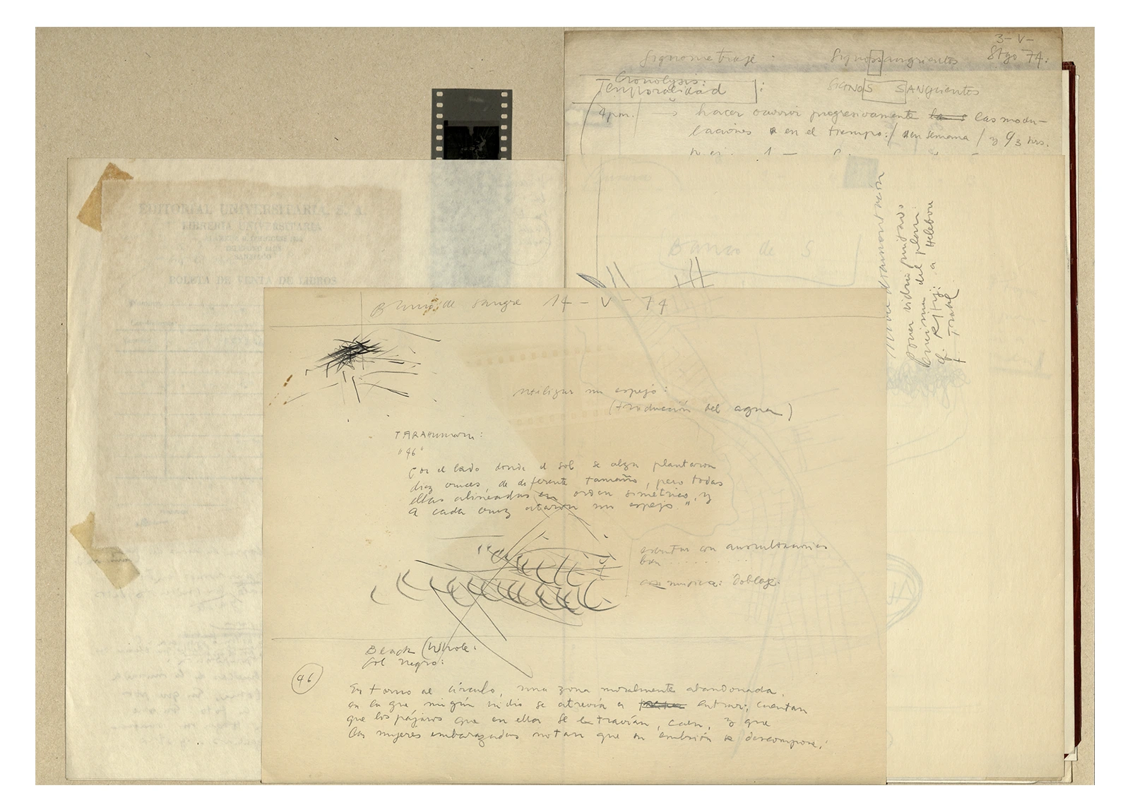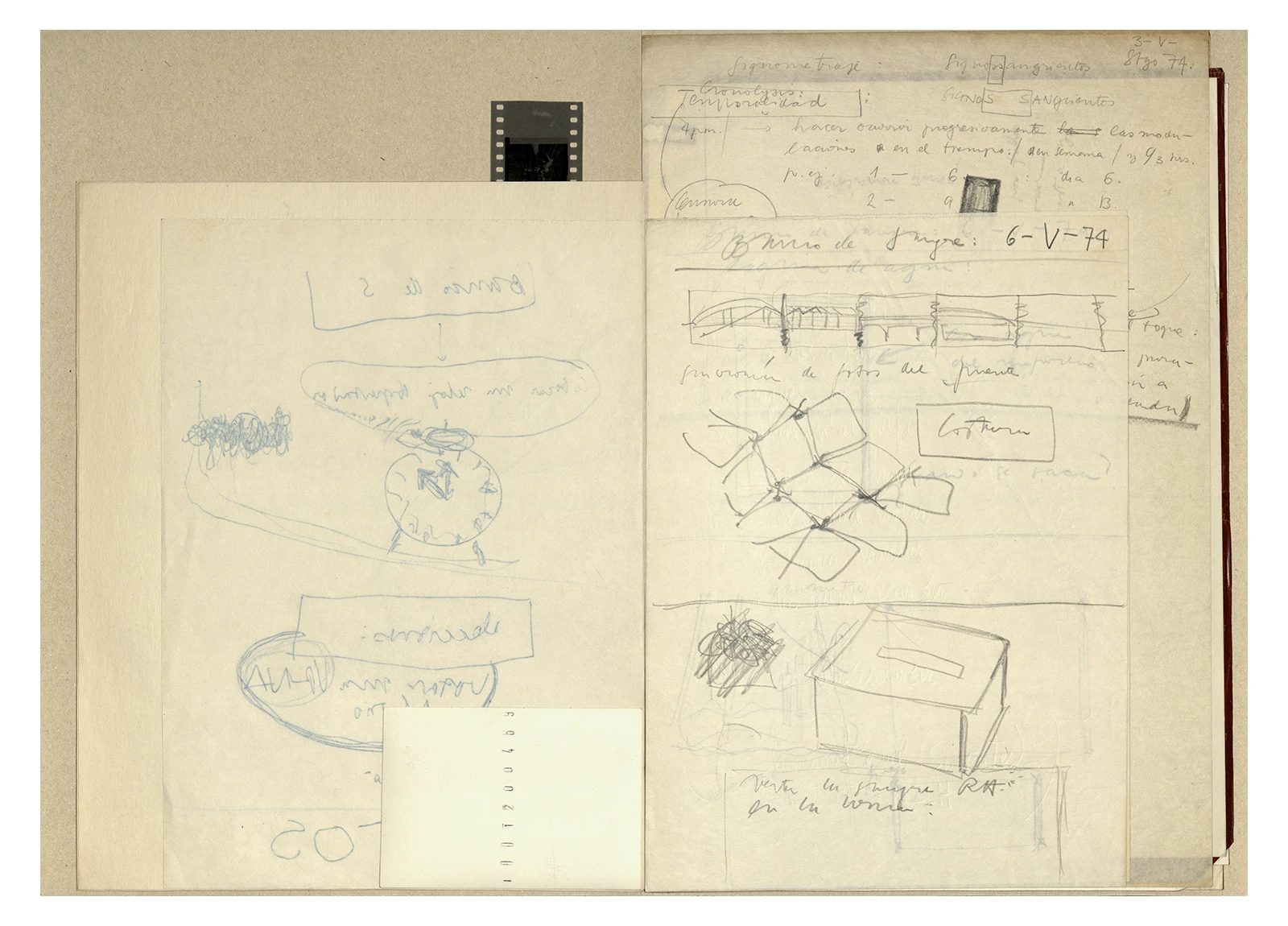 Notas manuscritas sobre papel en grafito, tinta y pasta, tira de negativo, fotografía en color, recortes de diarios y revistas, papel calco, cartón perforado, cinta adhesiva transparente.