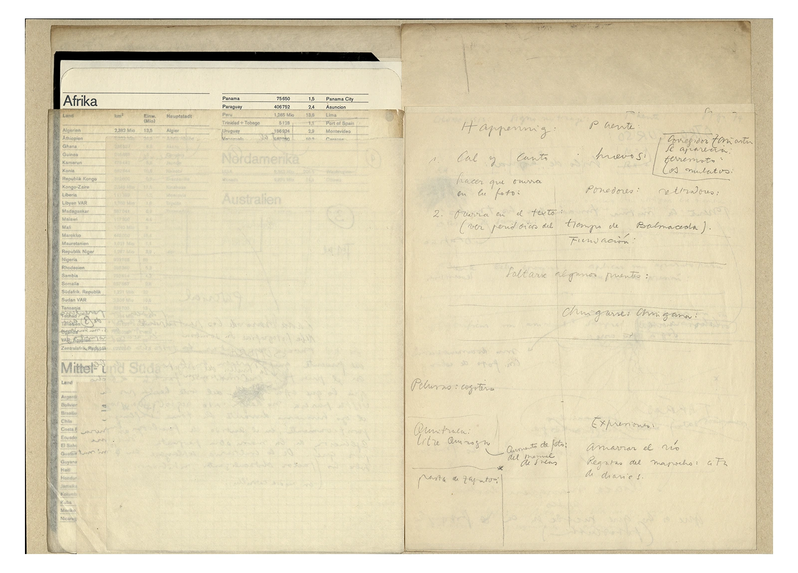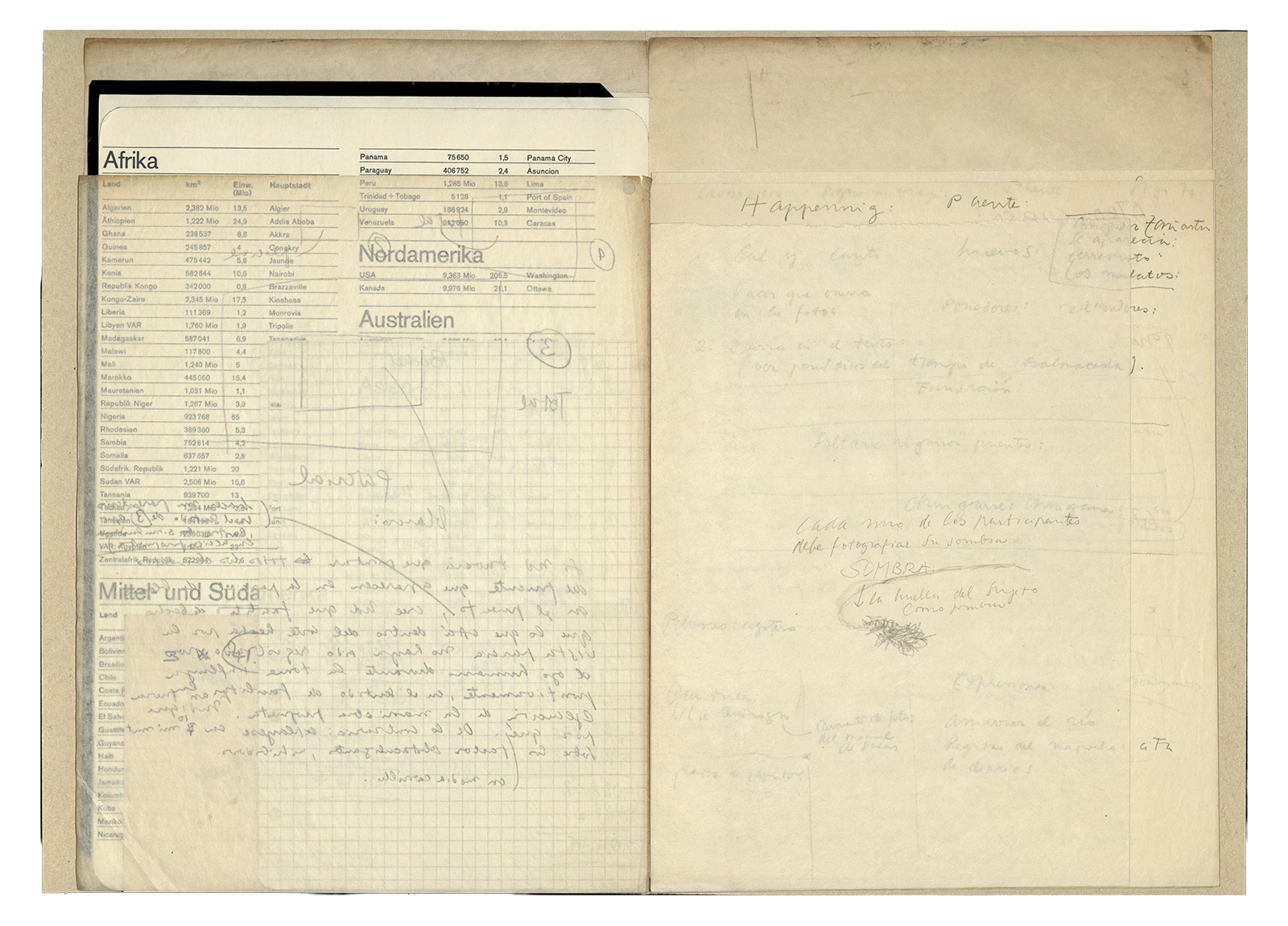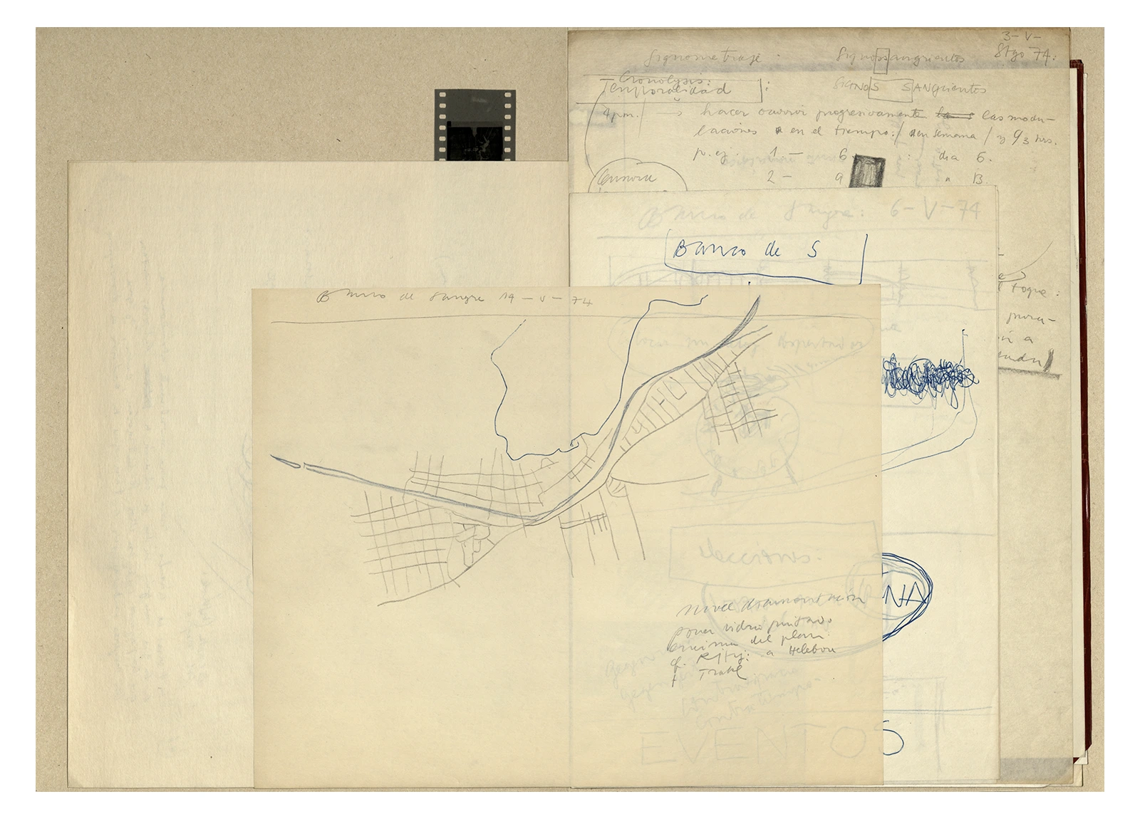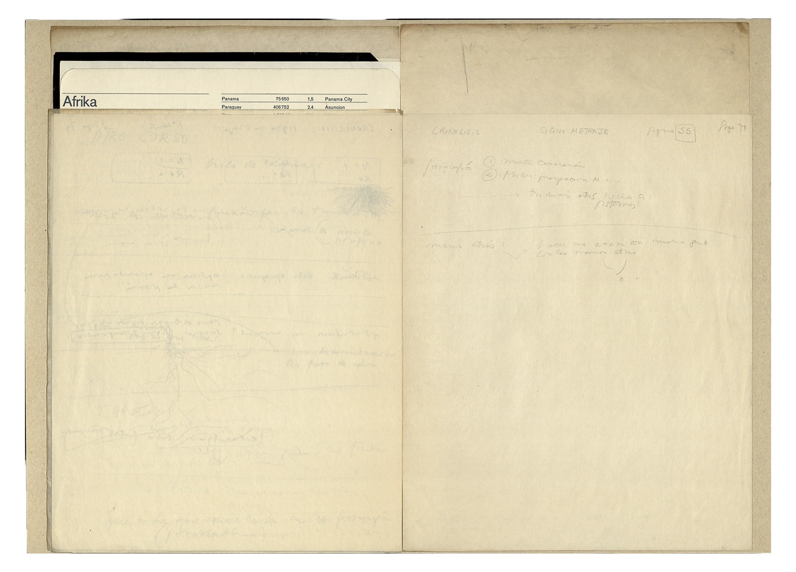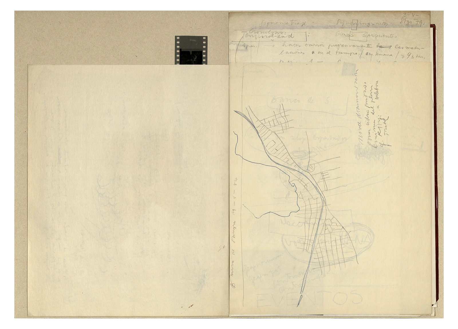 Notas manuscritas sobre papel en grafito, tinta y pasta, tira de negativo, fotografía en color, recortes de diarios y revistas, papel calco, cartón perforado, cinta adhesiva transparente.