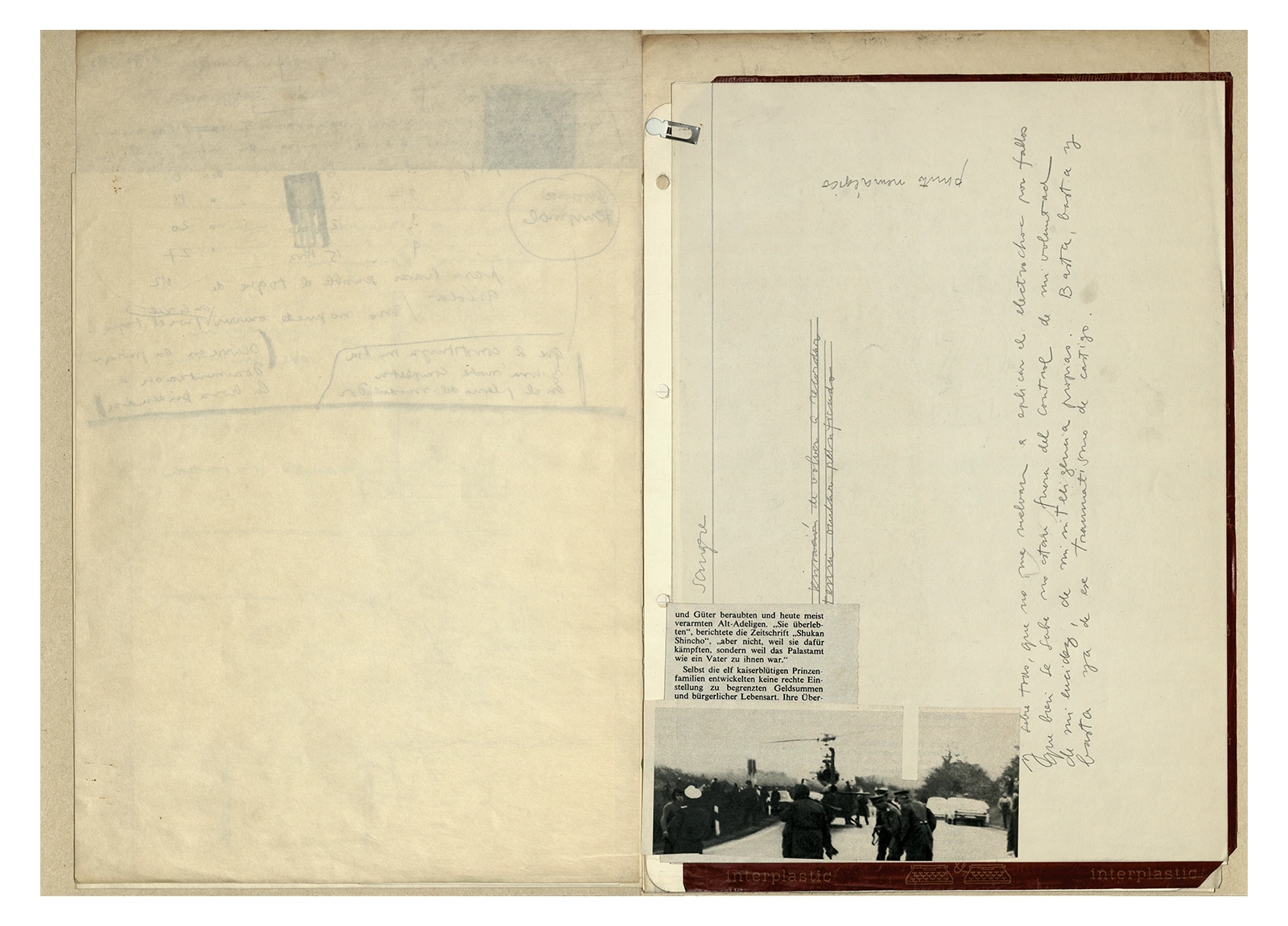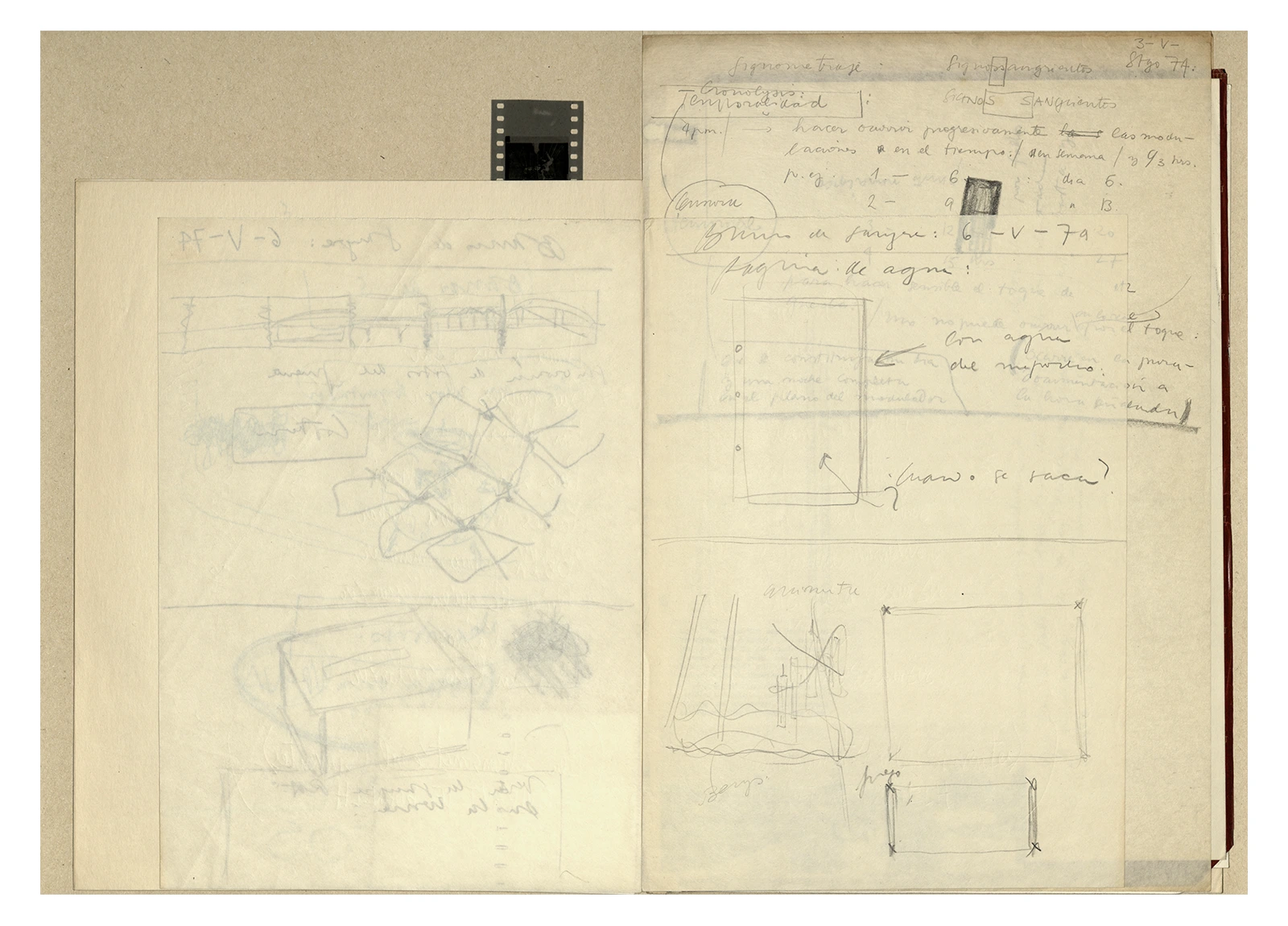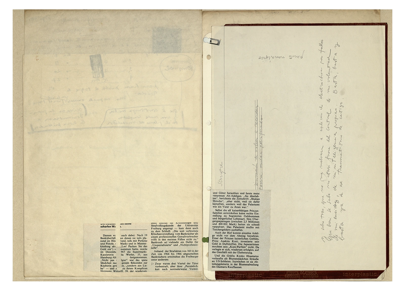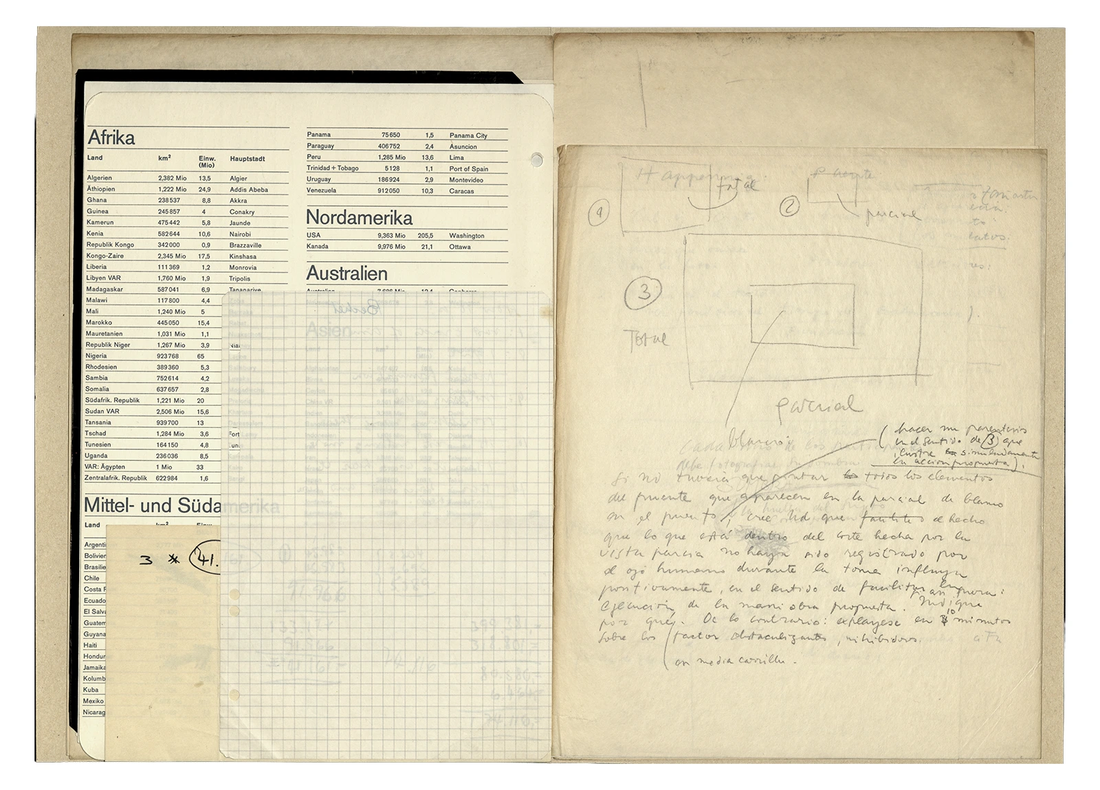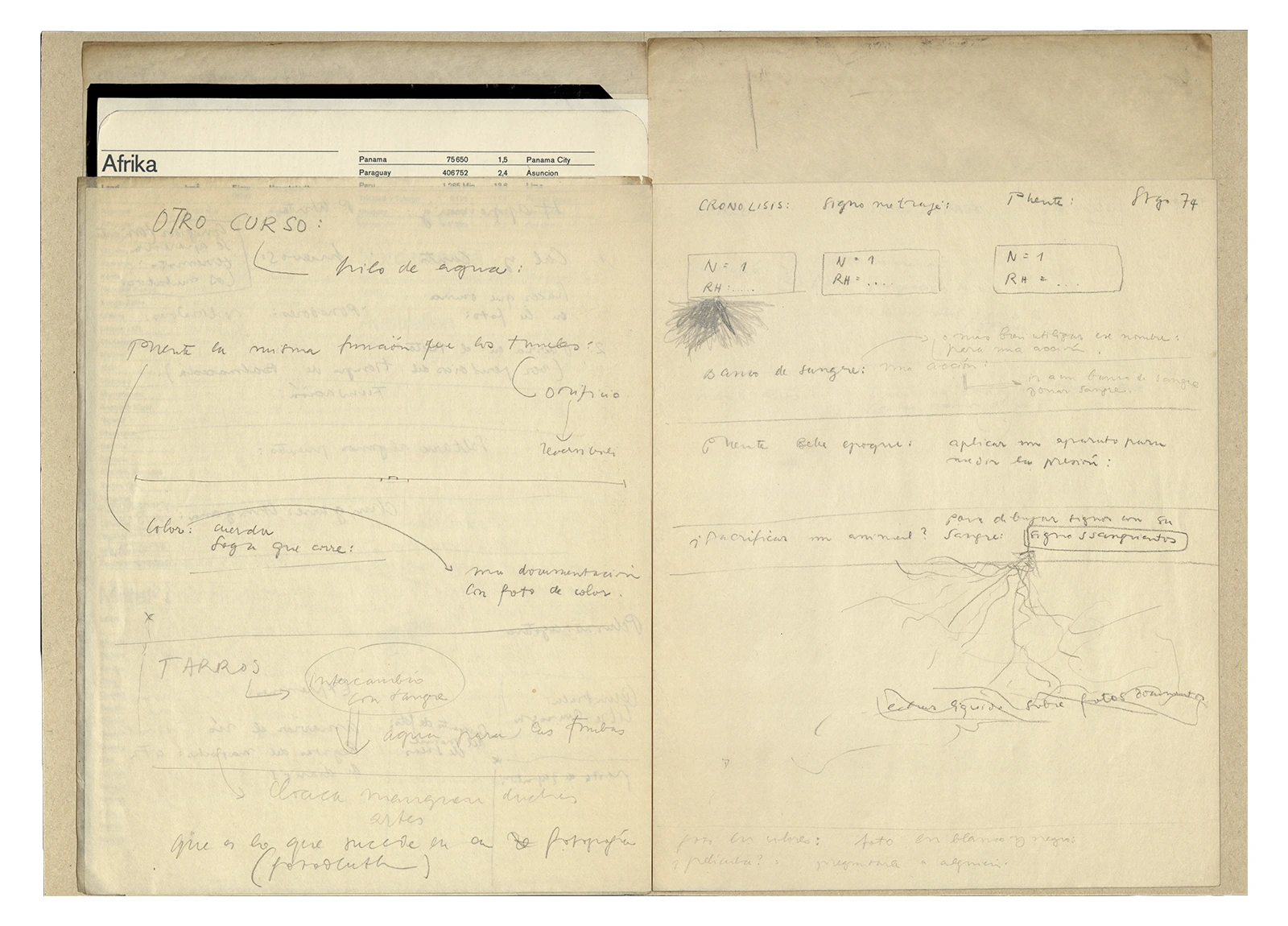 Notas manuscritas sobre papel en grafito, tinta y pasta, tira de negativo, fotografía en color, recortes de diarios y revistas, papel calco, cartón perforado, cinta adhesiva transparente.