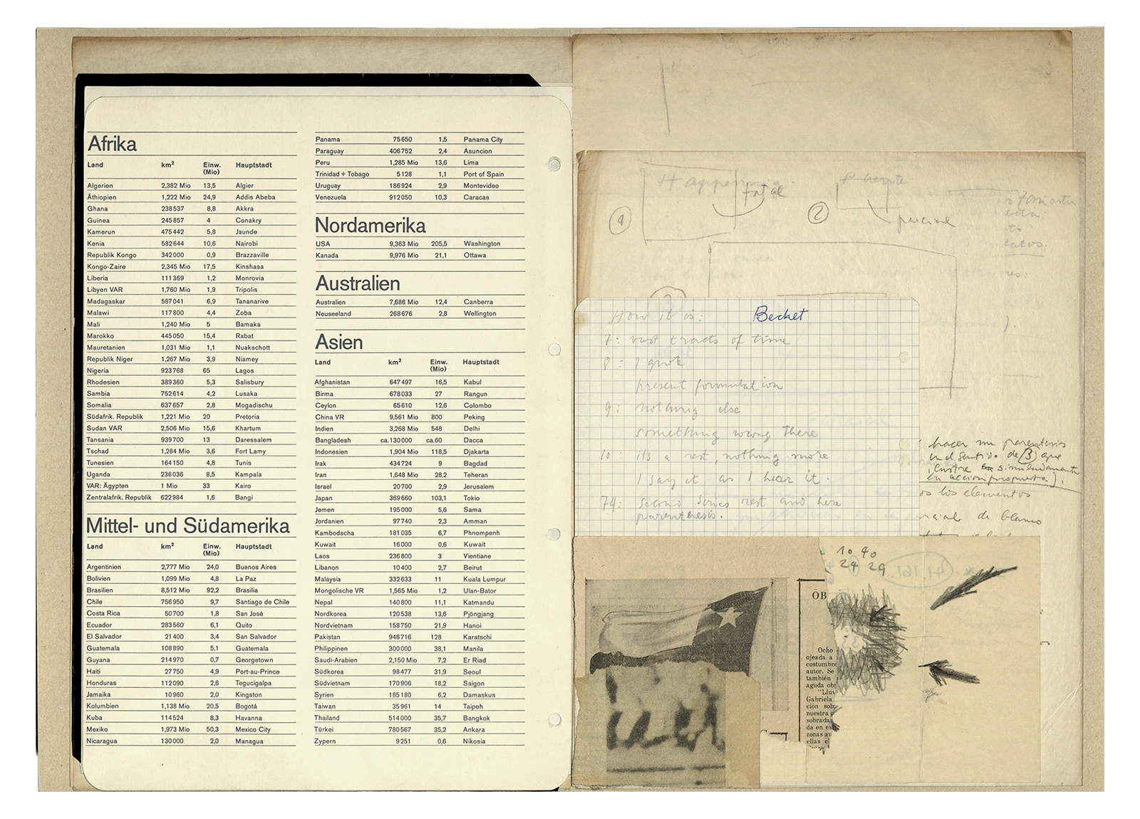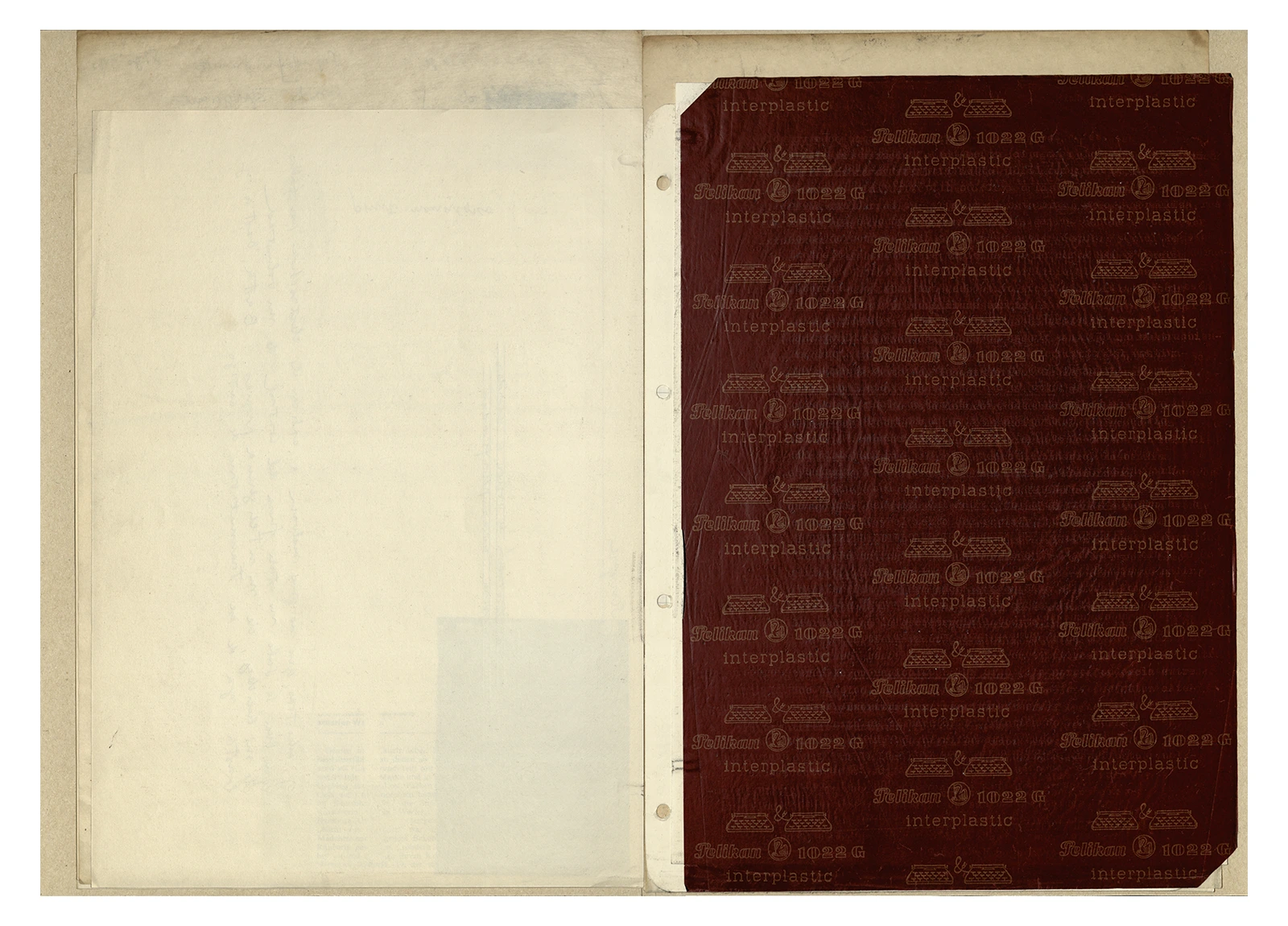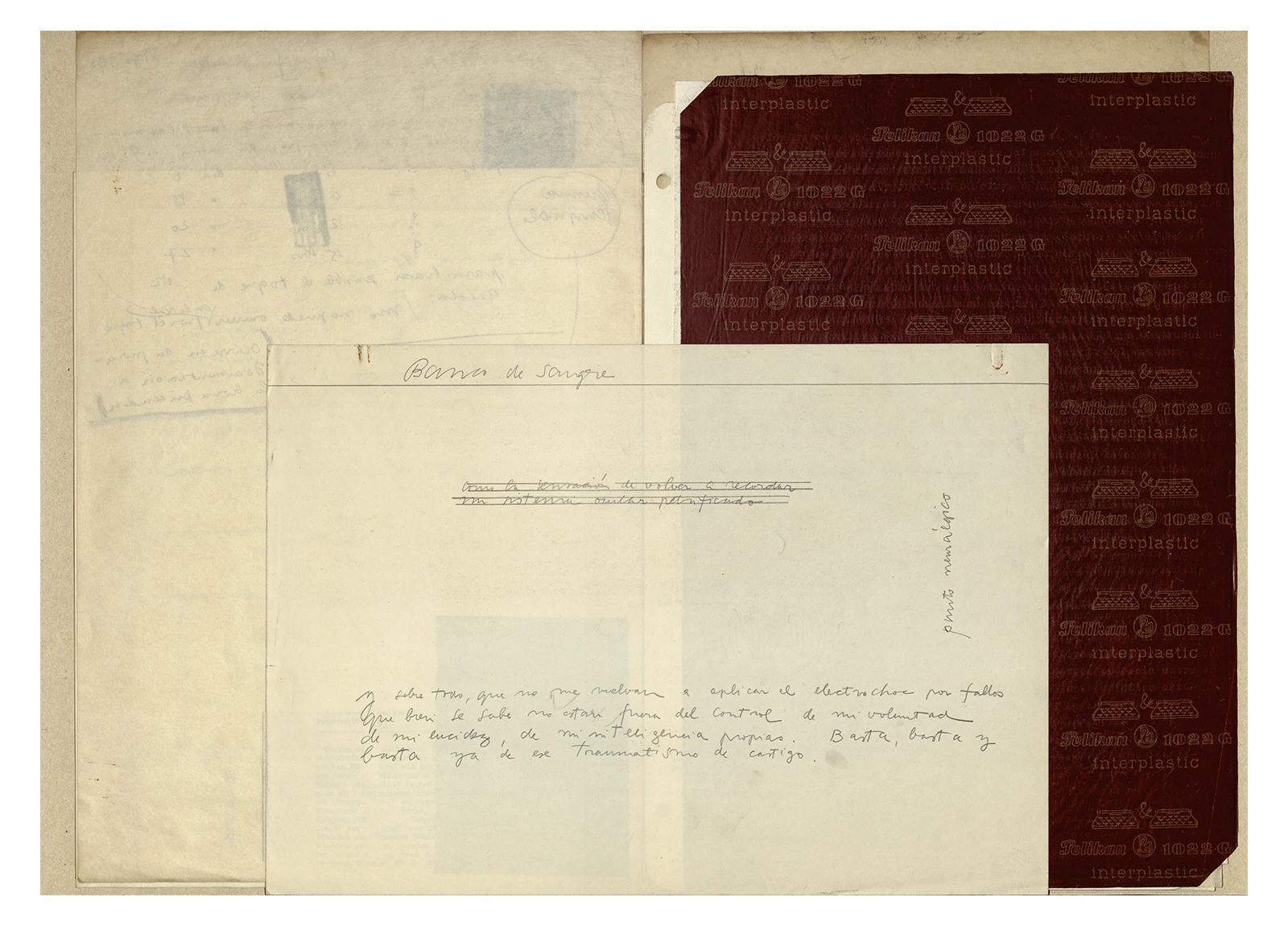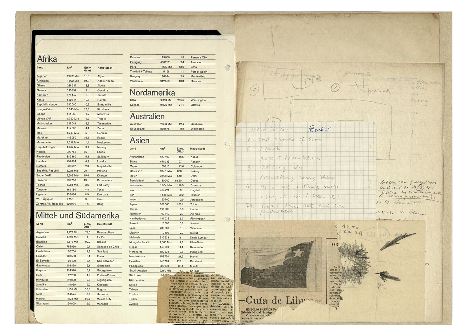 Notas manuscritas sobre papel en grafito, tinta y pasta, tira de negativo, fotografía en color, recortes de diarios y revistas, papel calco, cartón perforado, cinta adhesiva transparente.
