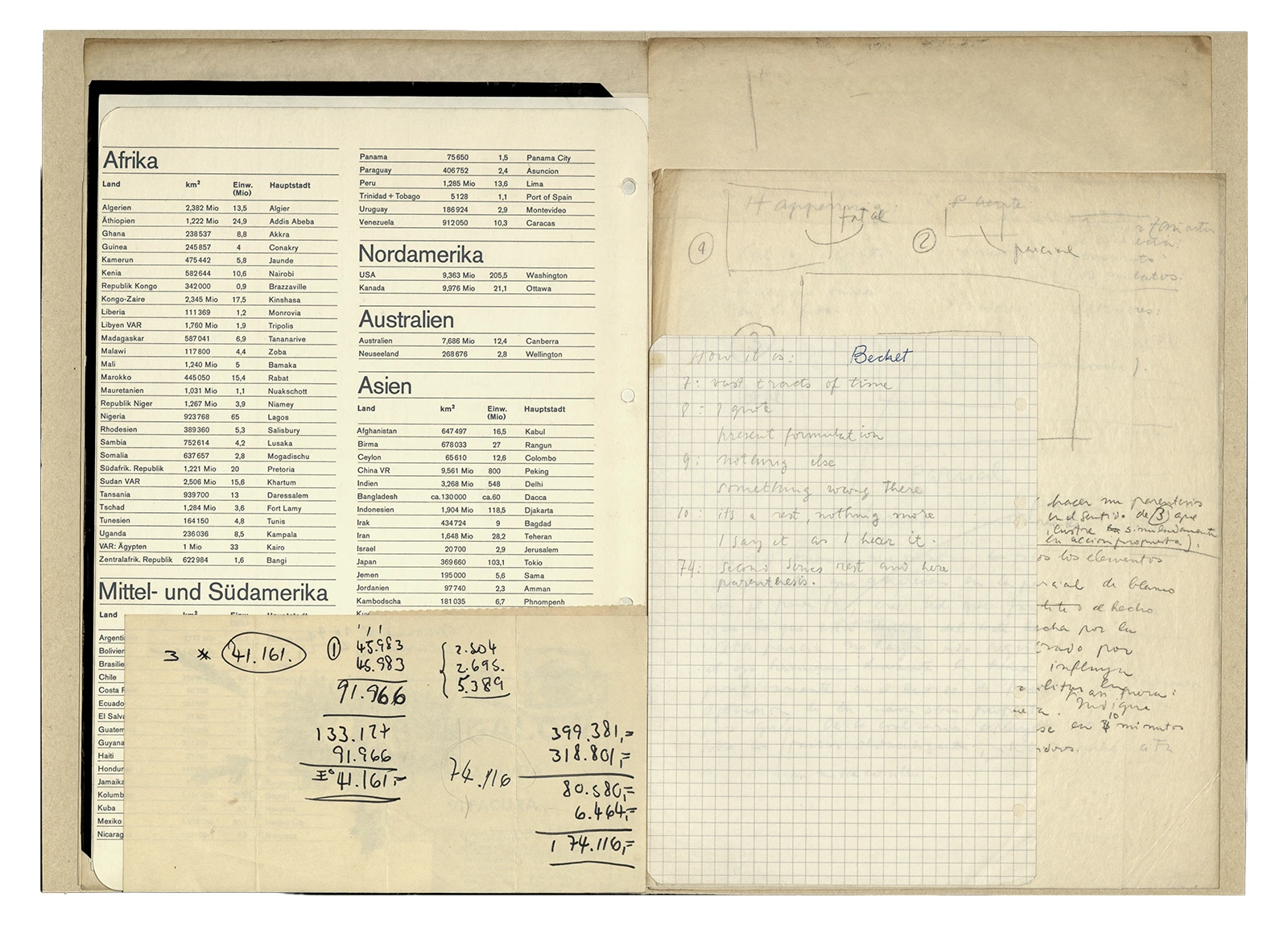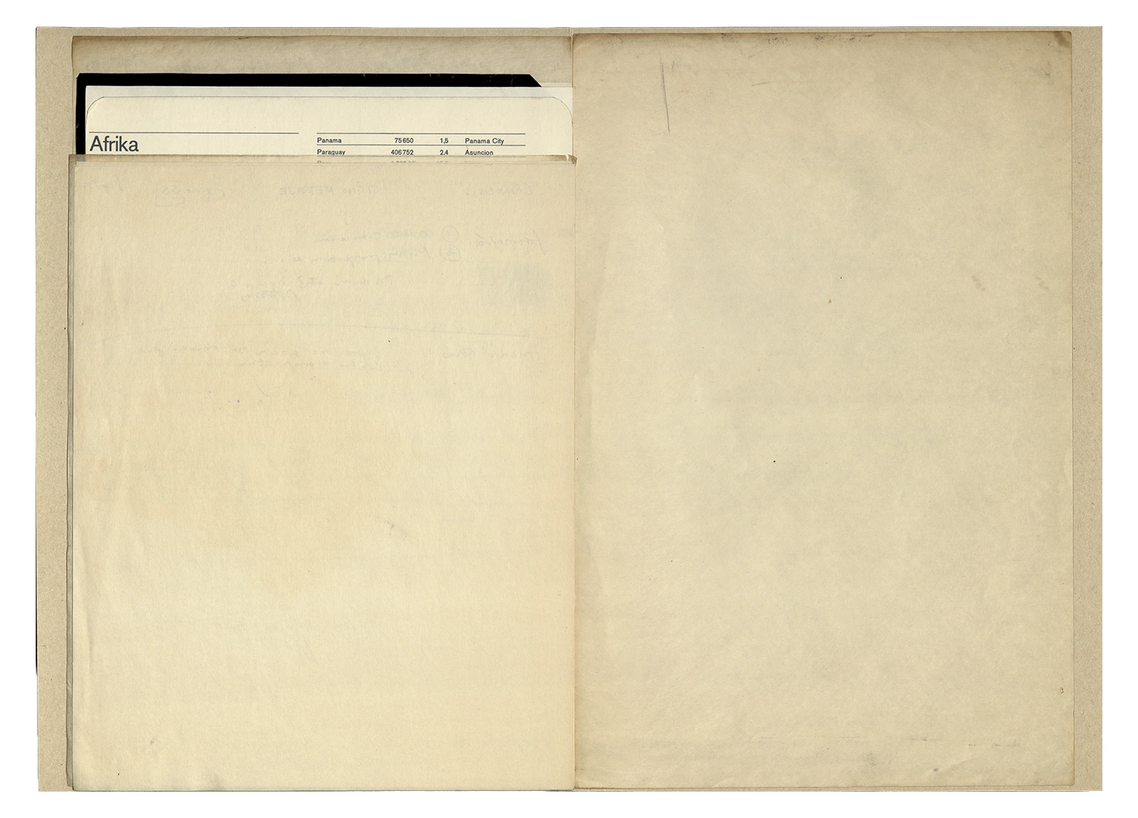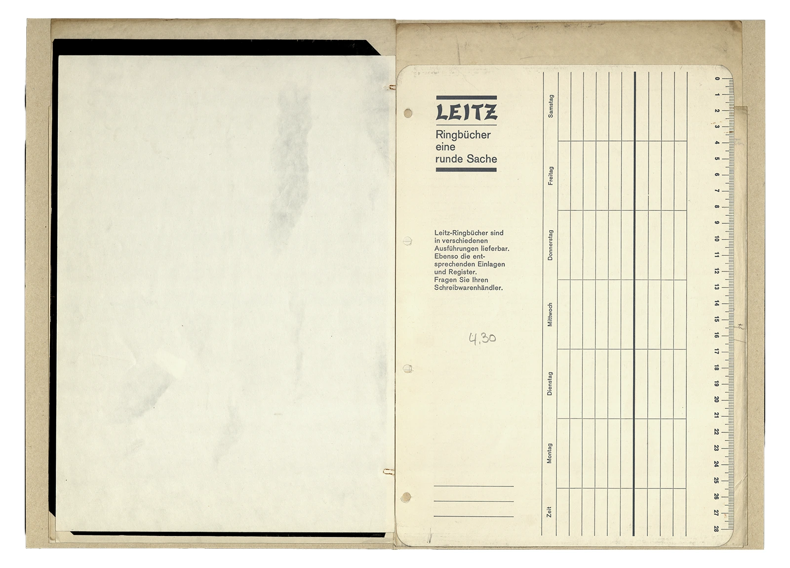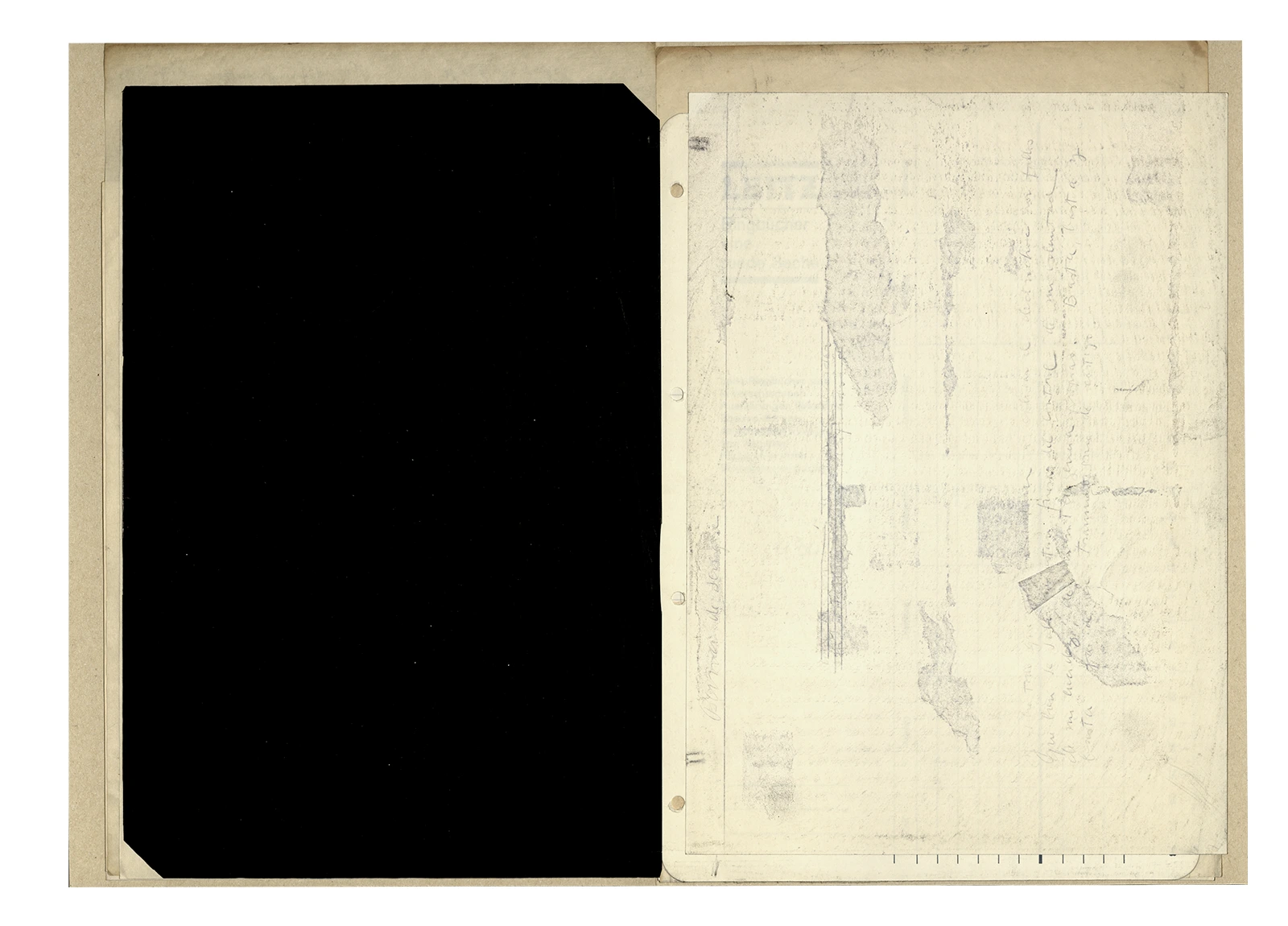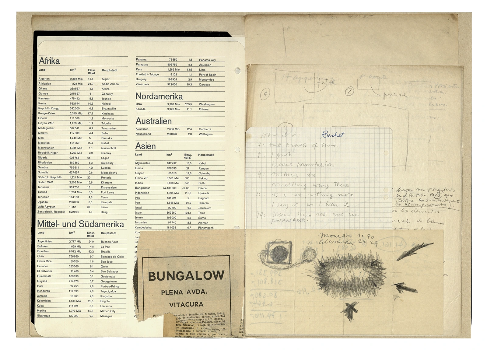 Notas manuscritas sobre papel en grafito, tinta y pasta, tira de negativo, fotografía en color, recortes de diarios y revistas, papel calco, cartón perforado, cinta adhesiva transparente.