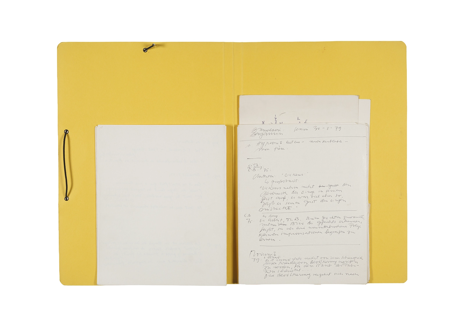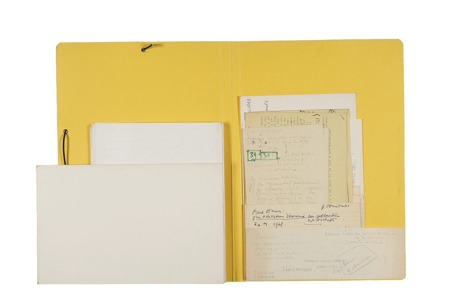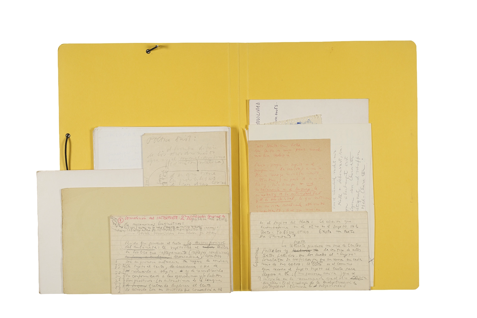 Manuscritos en tinta y grafito sobre papel, fichas bibliográficas, clip metálico, libreta con tapa de cartón unida al lomo por corchetes metálicos.