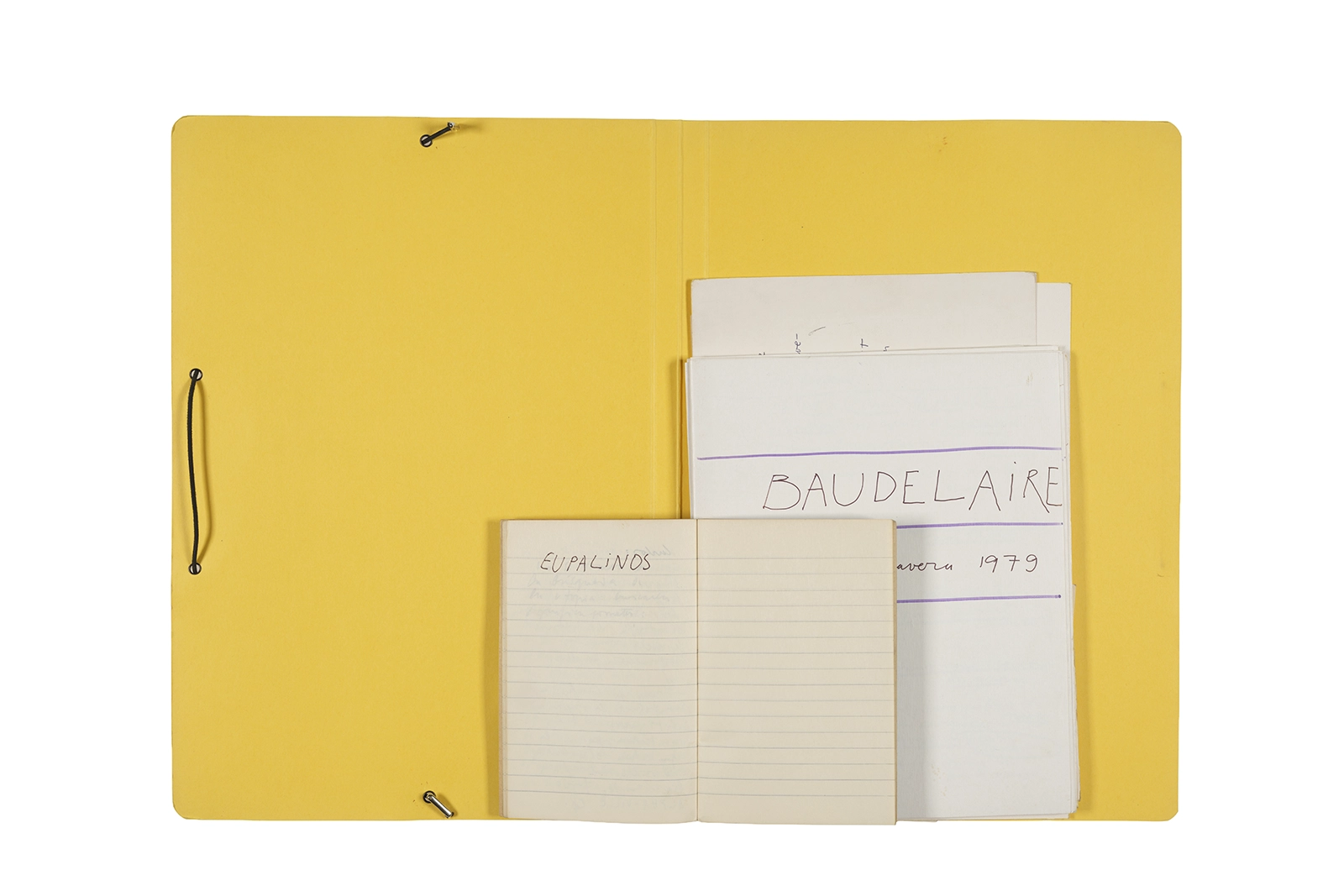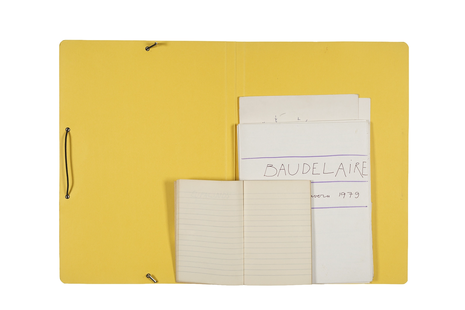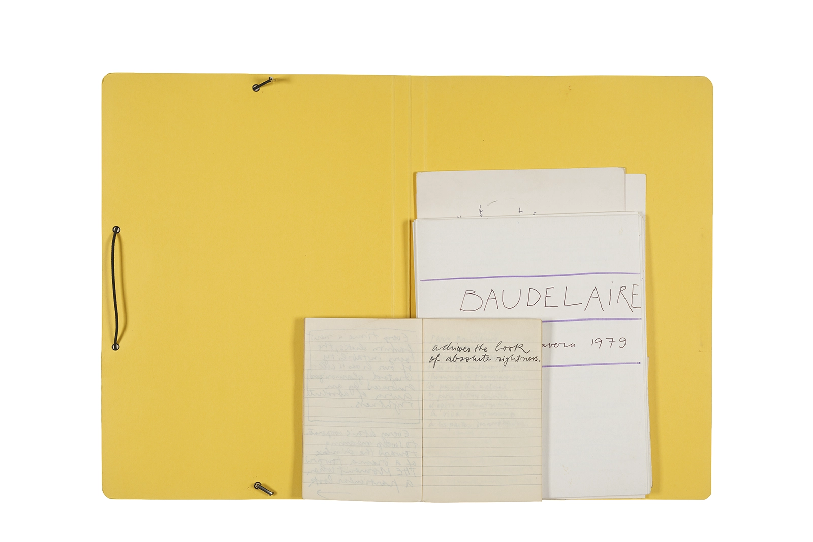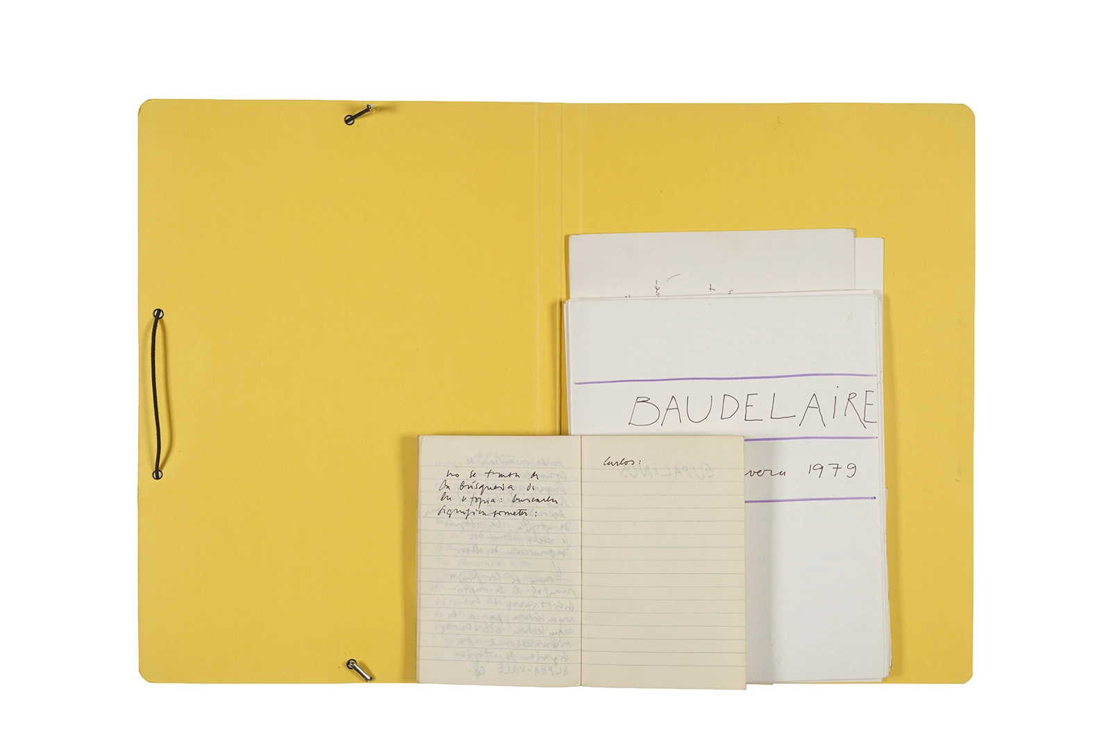 Carpeta que reúne material de trabajo vinculado al seminario “Arqueología poética del siglo XIX. Prospección de los textos de “Les Fleurs du Mal” de Charles Baudelaire en relación al conjunto de textos teóricos de Walter Benjamin reunidos en “Passagen” y a la luz de las condiciones de recepción de la actualidad americana “Las flores del mal”, dictado por Ronald Kay durante el segundo semestre de 1979, en el Departamento de Estudios Humanísticos de la Universidad de Chile. Contiene transcripciones de textos de Baudelaire, desarrollo del concepto de “Sitio eriazo”, planificaciones de clases y evaluaciones, fichas bibliográficas, referencias fotográficas y apuntes donde se menciona a Enrique Lihn, Arthur Rimbaud, Cy Twombly, André Bazin, Yuri Tyniánov y Sigmund Freud, entre otros. En esta carpeta se incluye, además, una libreta con notas vinculadas también al estudio de “Las flores del mal” de Charles Baudelaire.