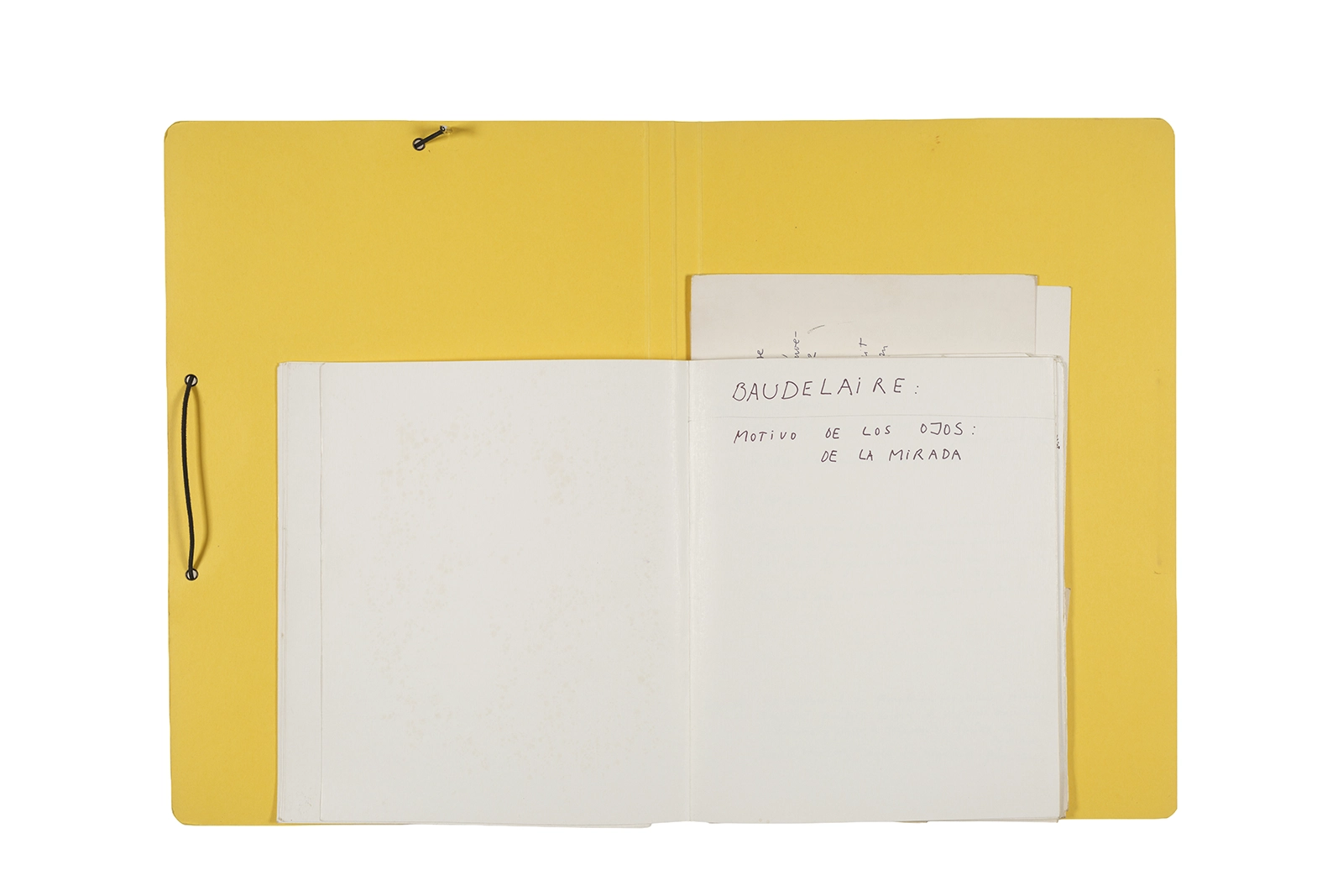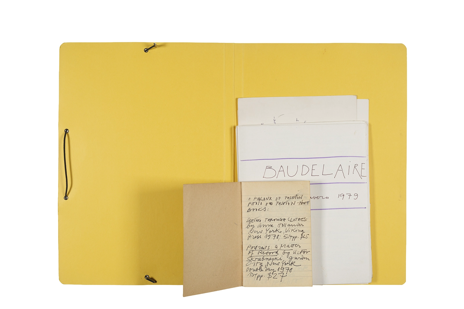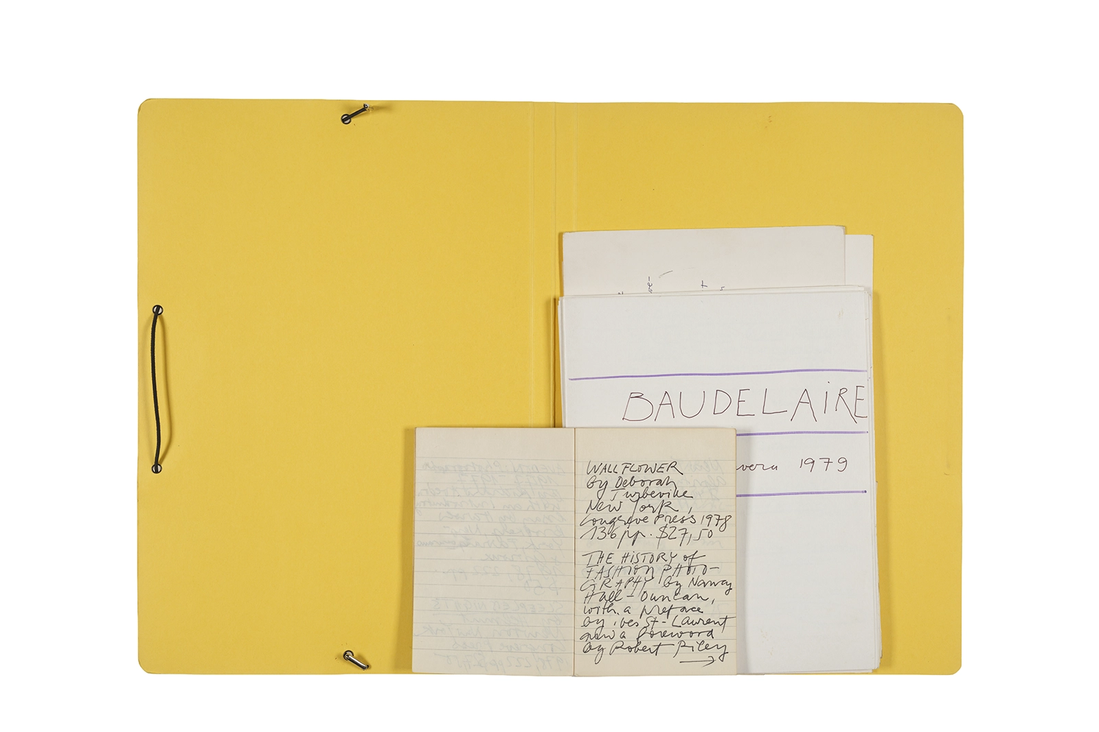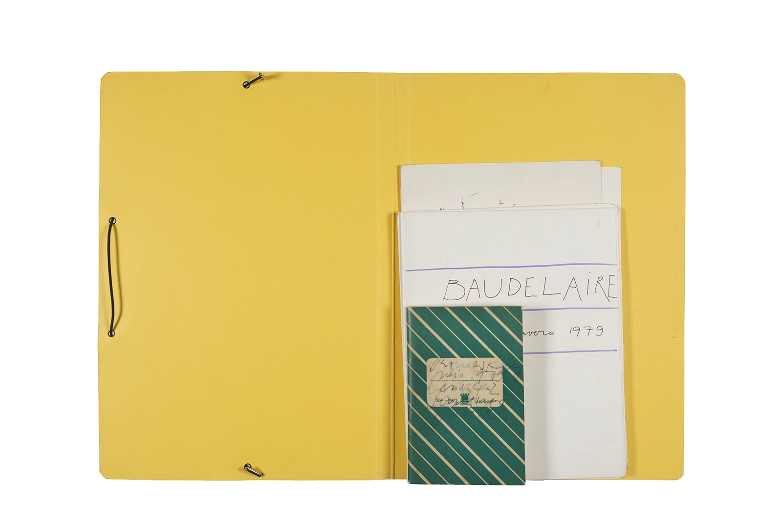 Carpeta que reúne material de trabajo vinculado al seminario “Arqueología poética del siglo XIX. Prospección de los textos de “Les Fleurs du Mal” de Charles Baudelaire en relación al conjunto de textos teóricos de Walter Benjamin reunidos en “Passagen” y a la luz de las condiciones de recepción de la actualidad americana “Las flores del mal”, dictado por Ronald Kay durante el segundo semestre de 1979, en el Departamento de Estudios Humanísticos de la Universidad de Chile. Contiene transcripciones de textos de Baudelaire, desarrollo del concepto de “Sitio eriazo”, planificaciones de clases y evaluaciones, fichas bibliográficas, referencias fotográficas y apuntes donde se menciona a Enrique Lihn, Arthur Rimbaud, Cy Twombly, André Bazin, Yuri Tyniánov y Sigmund Freud, entre otros. En esta carpeta se incluye, además, una libreta con notas vinculadas también al estudio de “Las flores del mal” de Charles Baudelaire.