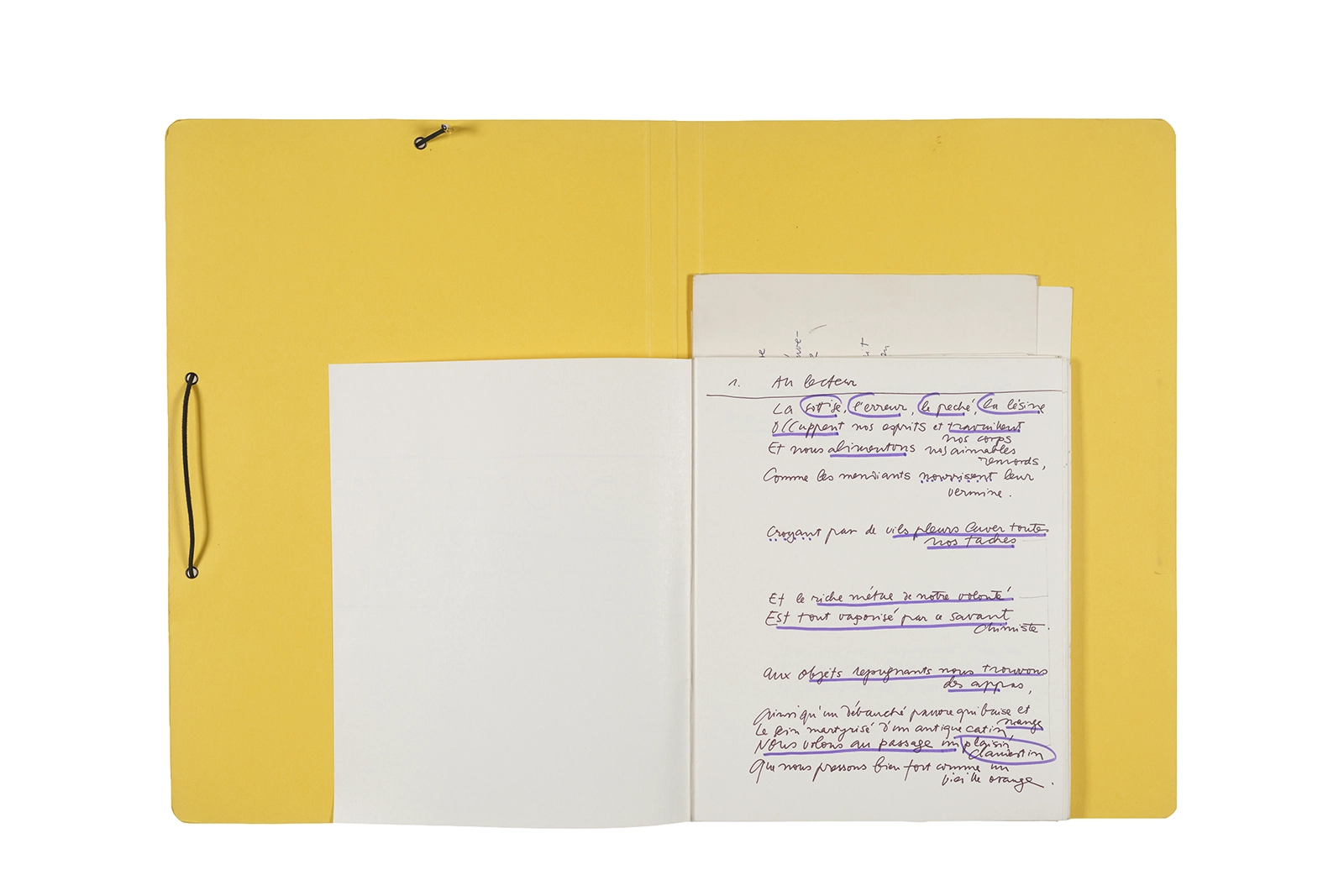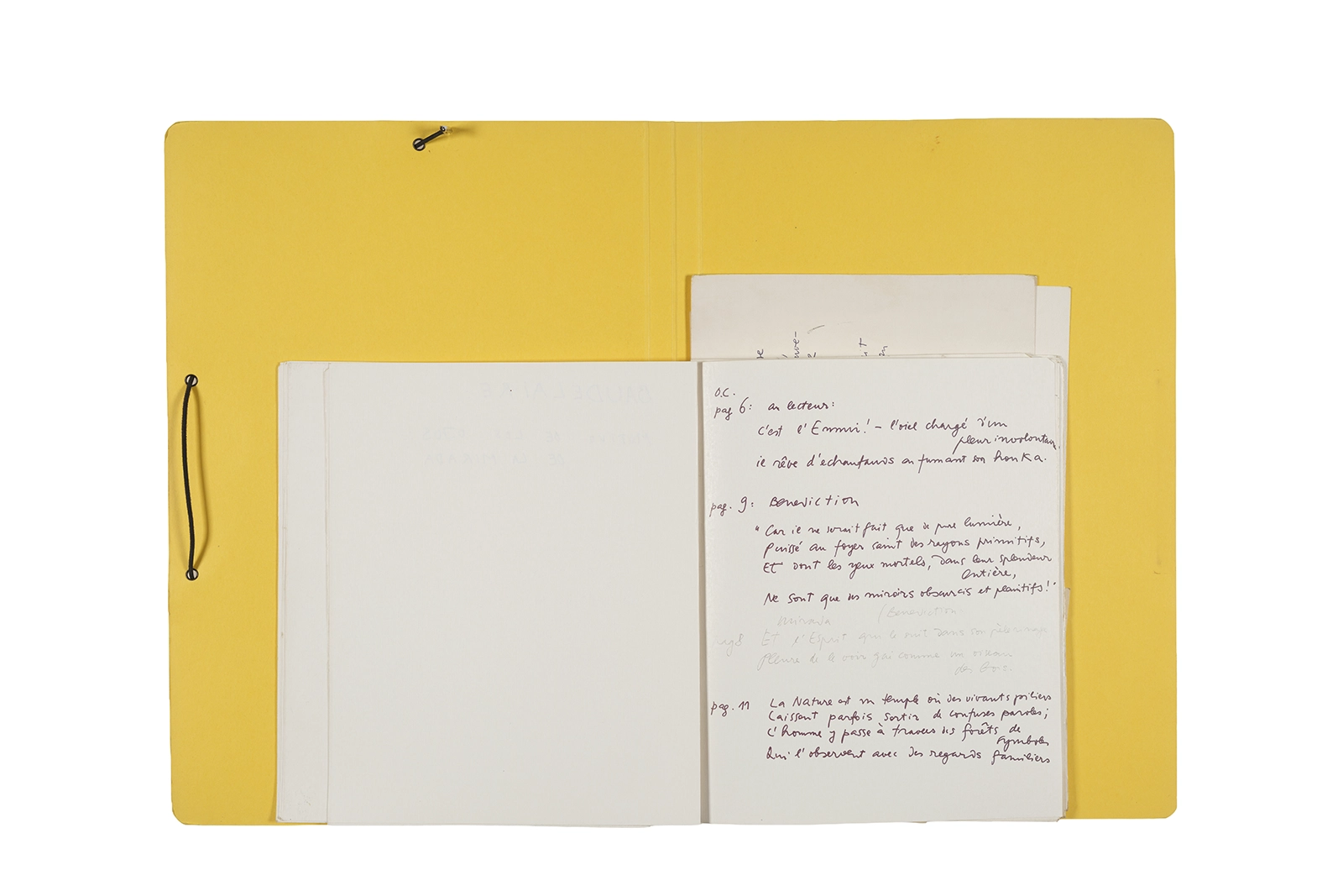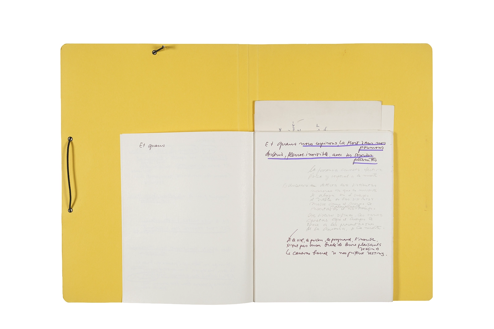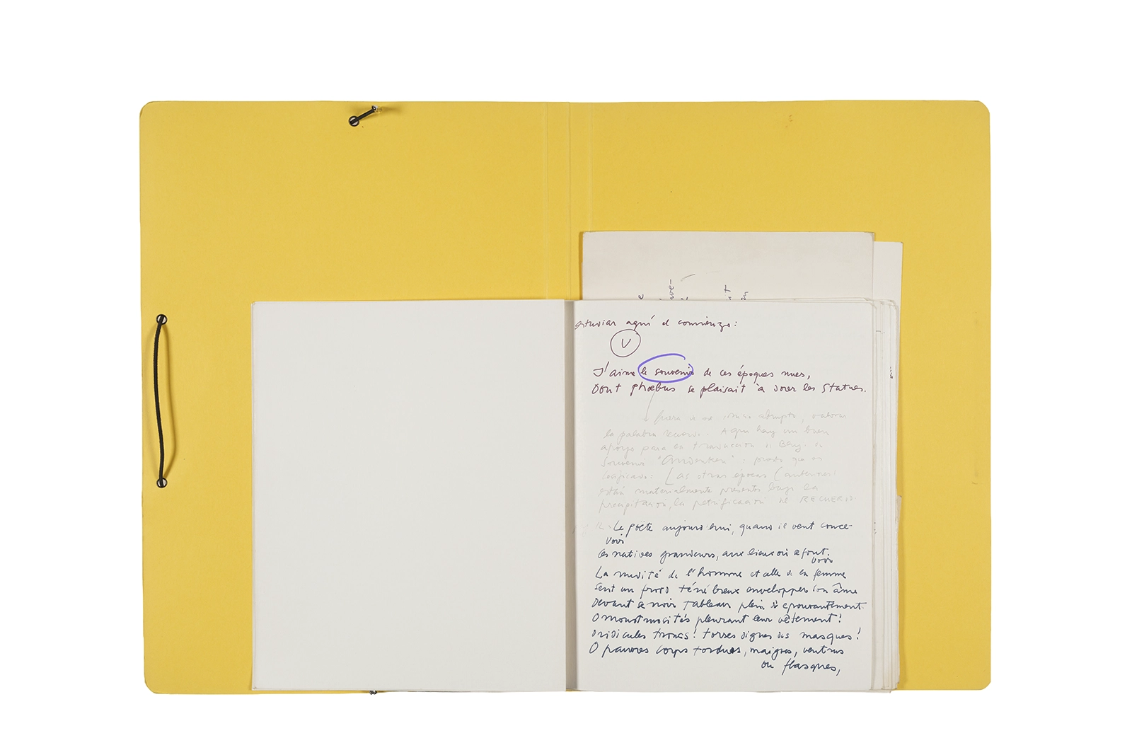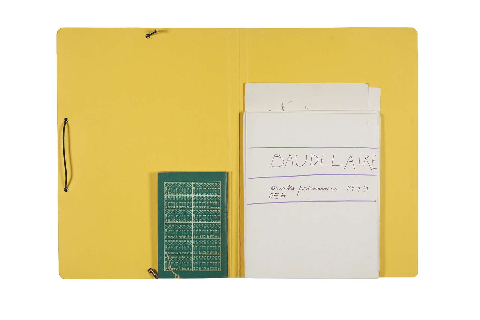 Carpeta que reúne material de trabajo vinculado al seminario “Arqueología poética del siglo XIX. Prospección de los textos de “Les Fleurs du Mal” de Charles Baudelaire en relación al conjunto de textos teóricos de Walter Benjamin reunidos en “Passagen” y a la luz de las condiciones de recepción de la actualidad americana “Las flores del mal”, dictado por Ronald Kay durante el segundo semestre de 1979, en el Departamento de Estudios Humanísticos de la Universidad de Chile. Contiene transcripciones de textos de Baudelaire, desarrollo del concepto de “Sitio eriazo”, planificaciones de clases y evaluaciones, fichas bibliográficas, referencias fotográficas y apuntes donde se menciona a Enrique Lihn, Arthur Rimbaud, Cy Twombly, André Bazin, Yuri Tyniánov y Sigmund Freud, entre otros. En esta carpeta se incluye, además, una libreta con notas vinculadas también al estudio de “Las flores del mal” de Charles Baudelaire.