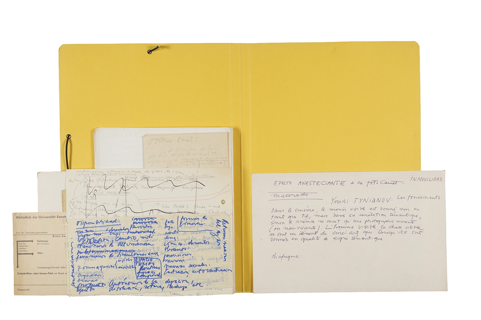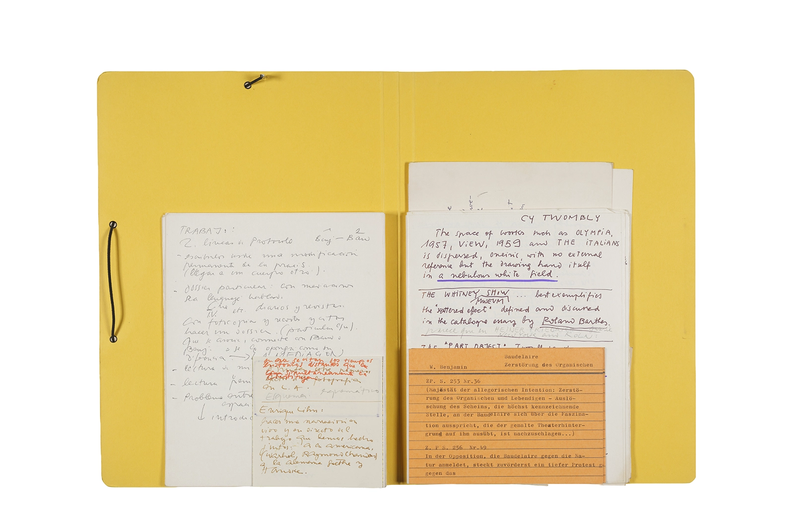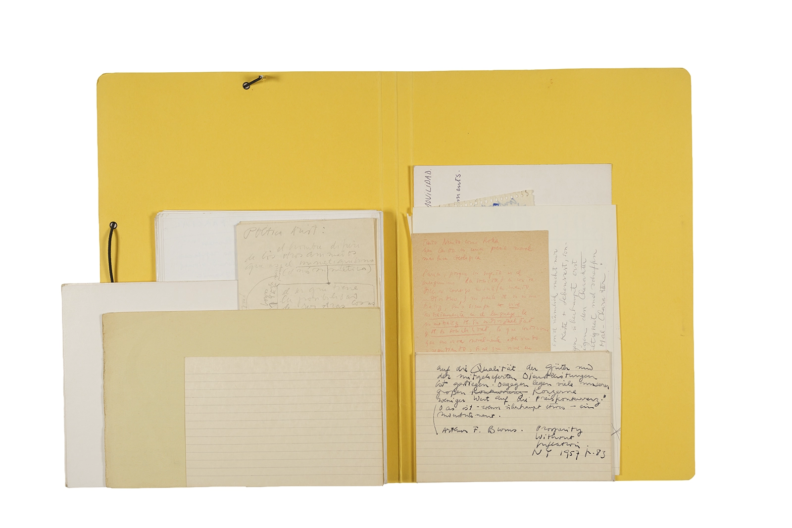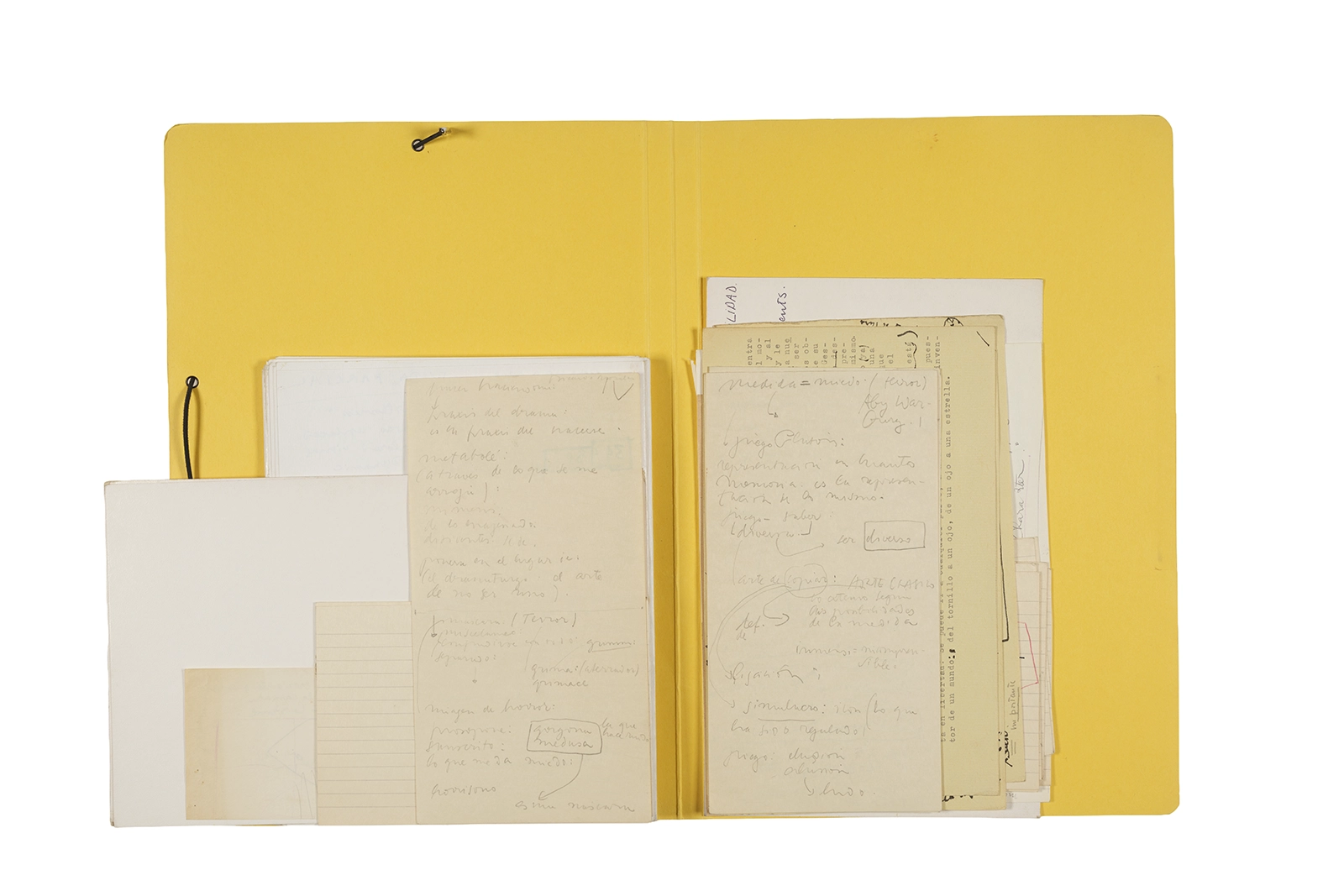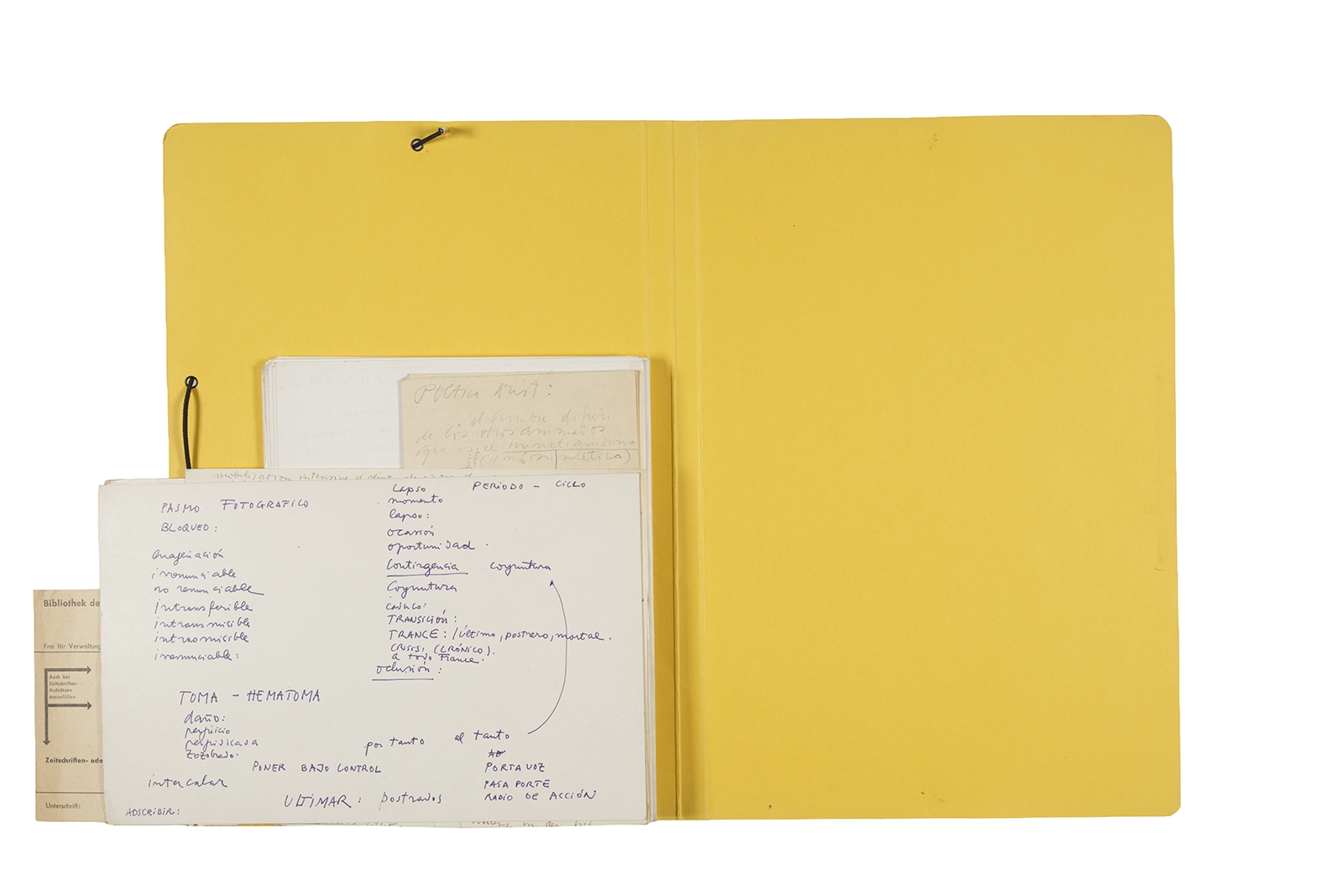 Manuscritos en tinta y grafito sobre papel, fichas bibliográficas, clip metálico, libreta con tapa de cartón unida al lomo por corchetes metálicos.