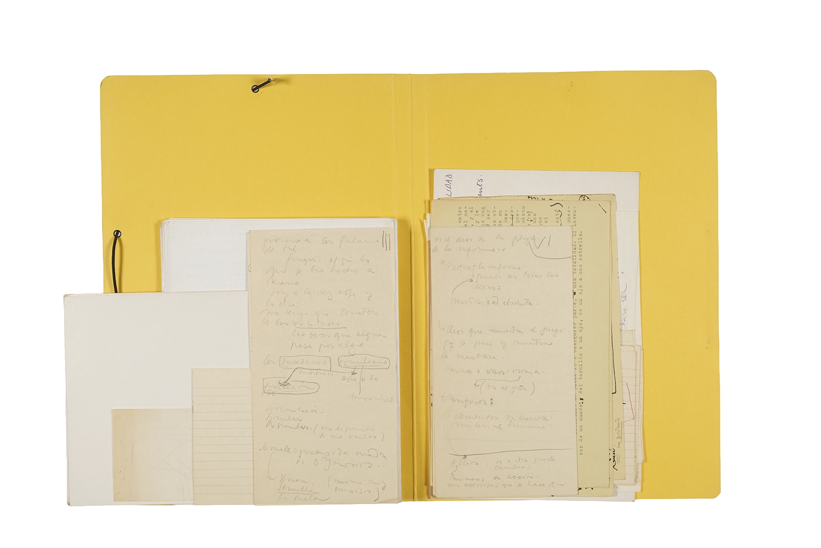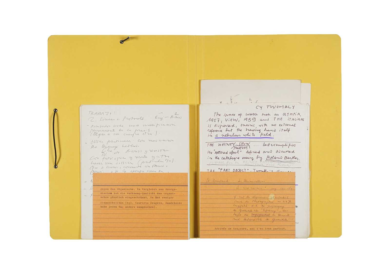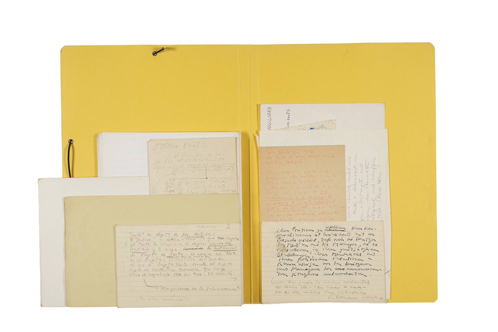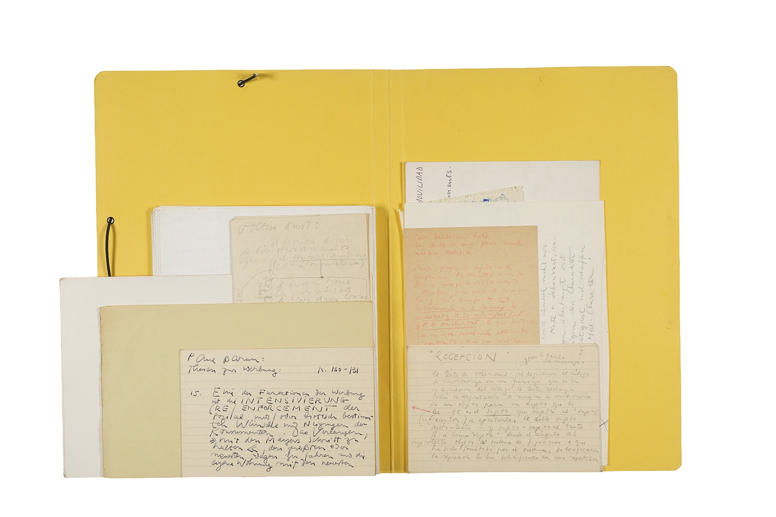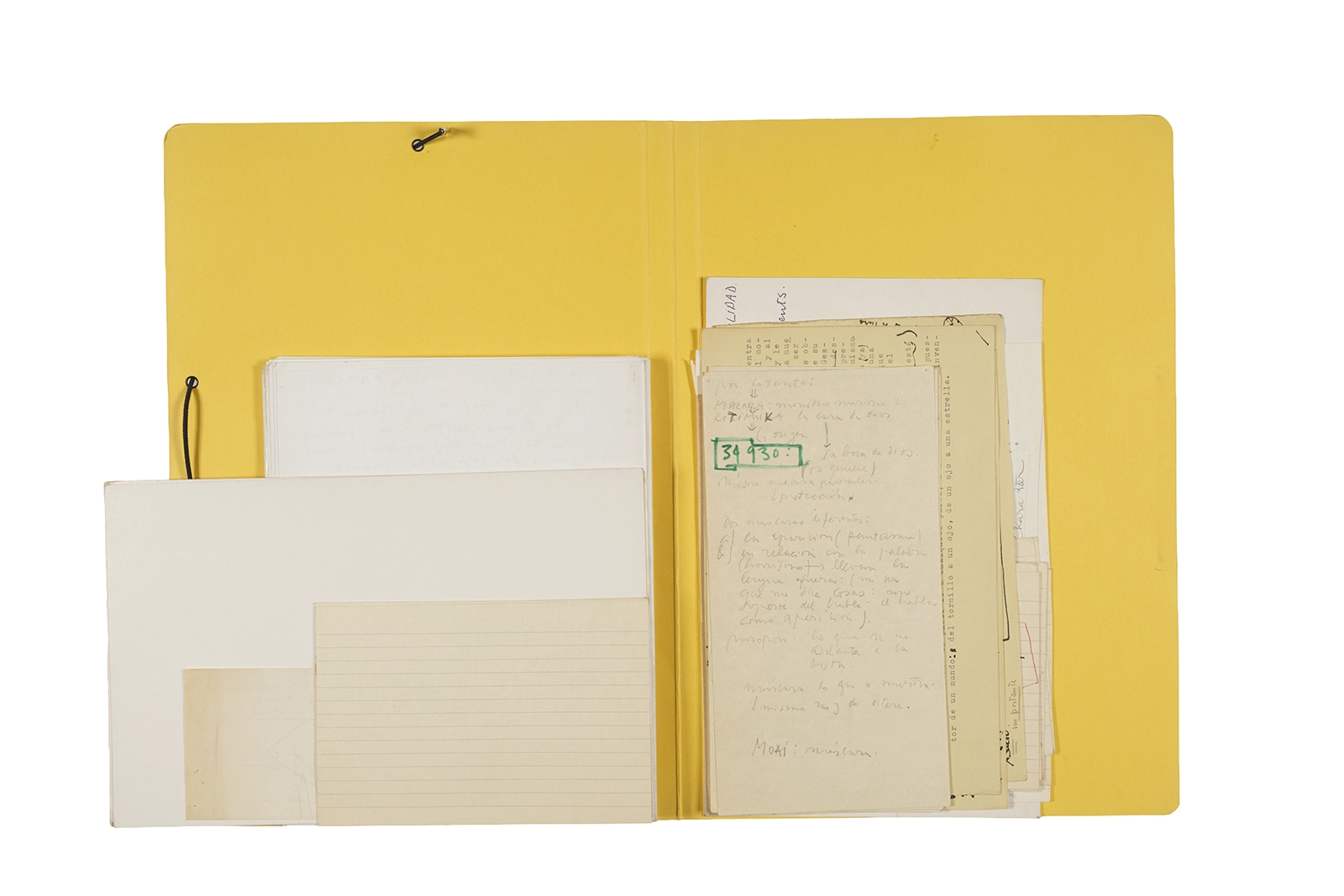 Manuscritos en tinta y grafito sobre papel, fichas bibliográficas, clip metálico, libreta con tapa de cartón unida al lomo por corchetes metálicos.