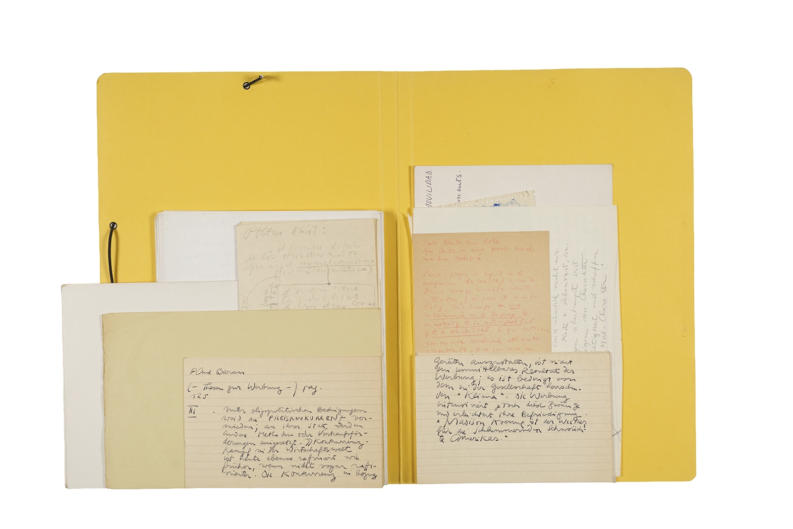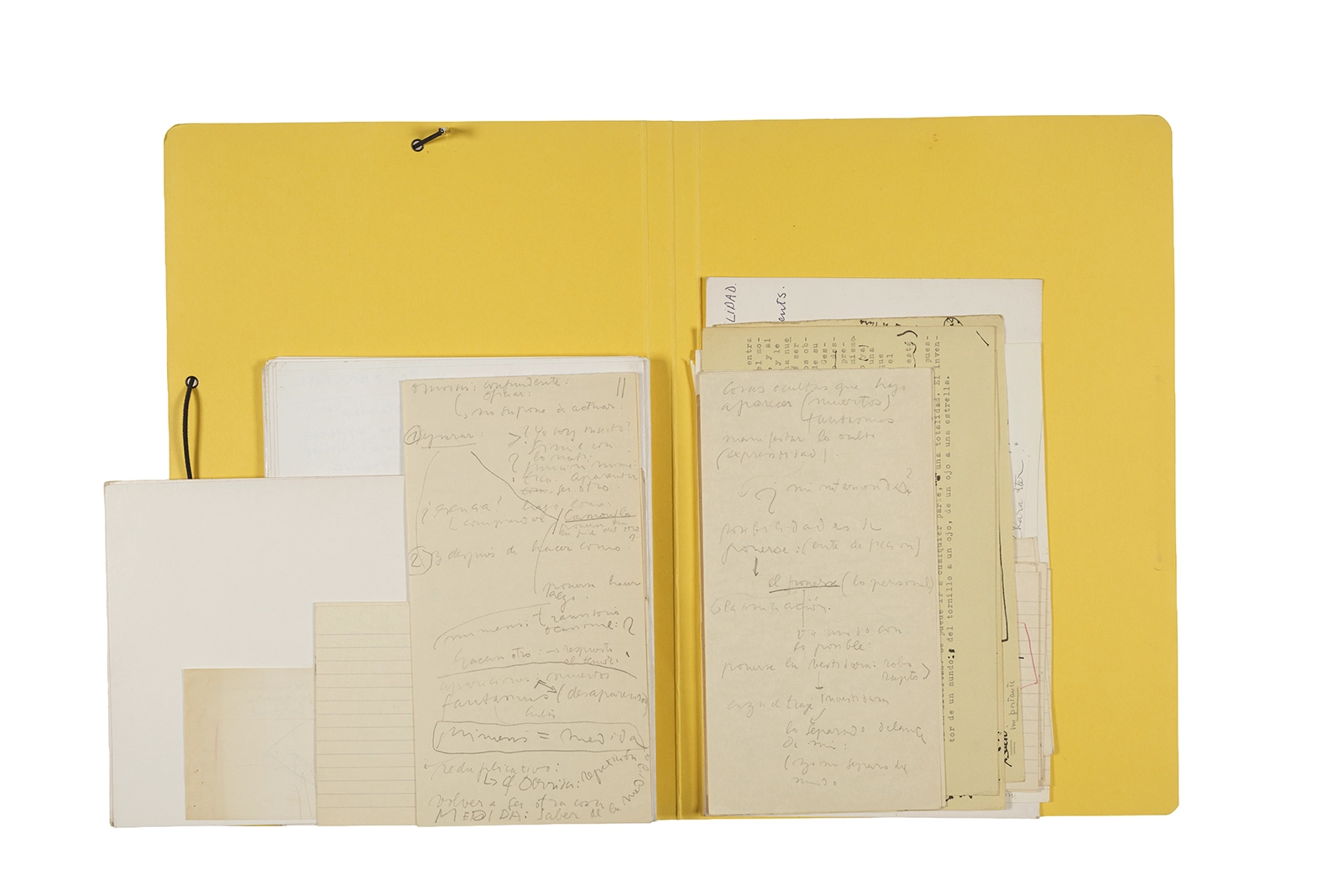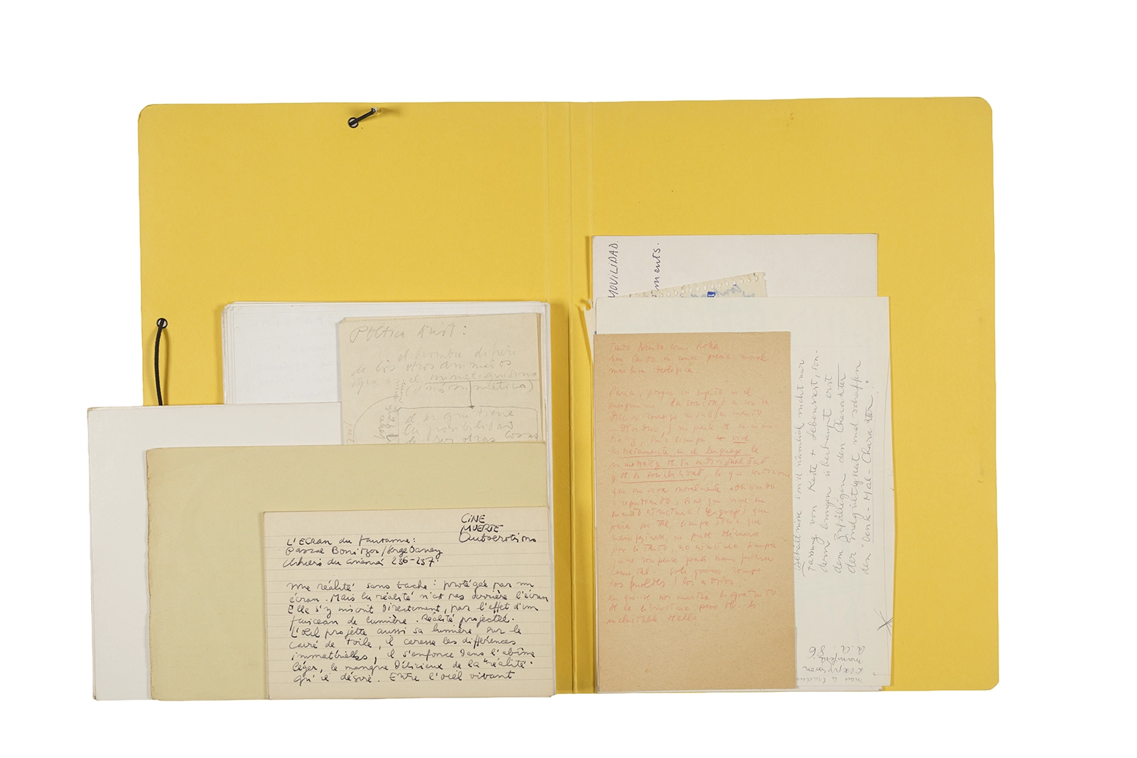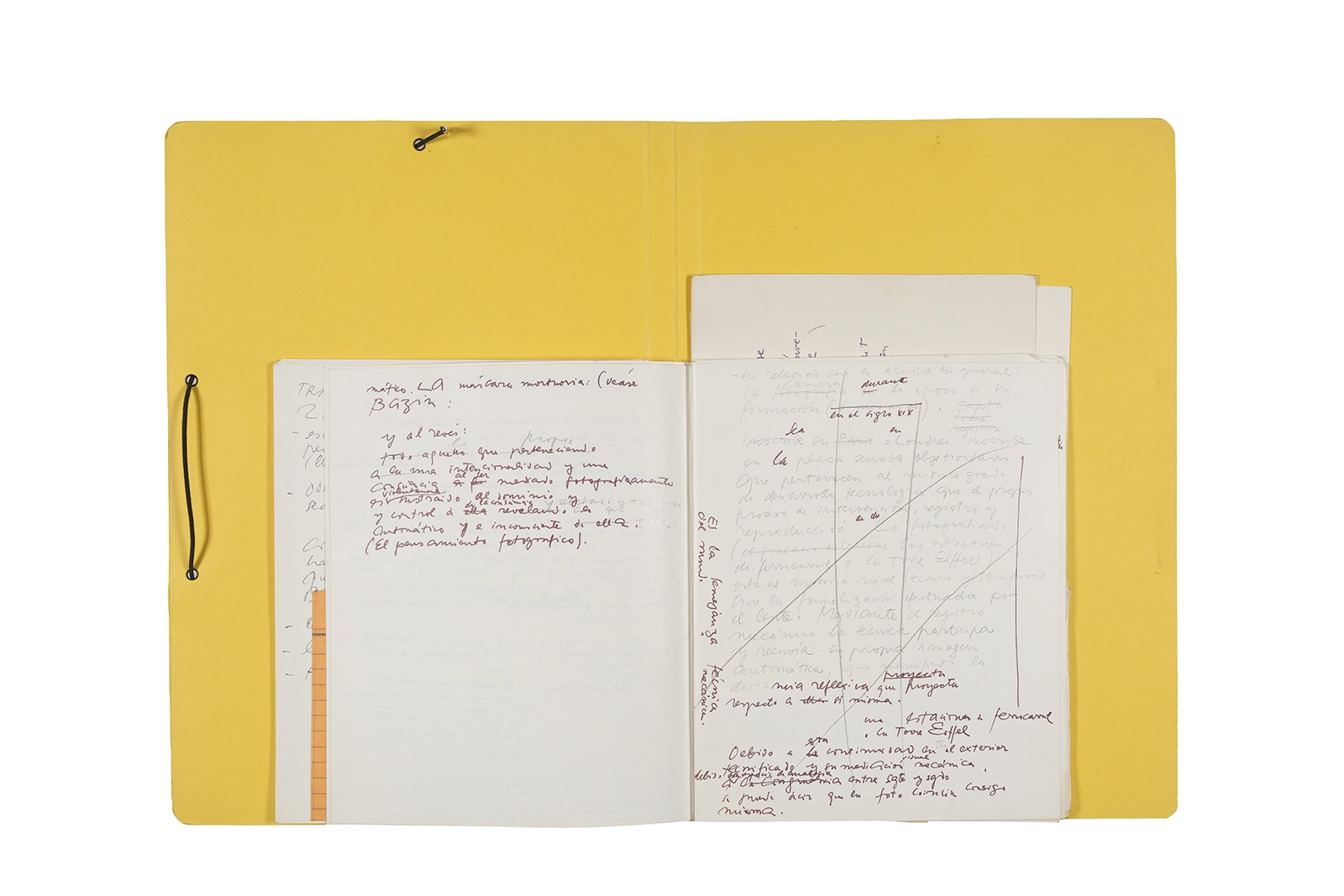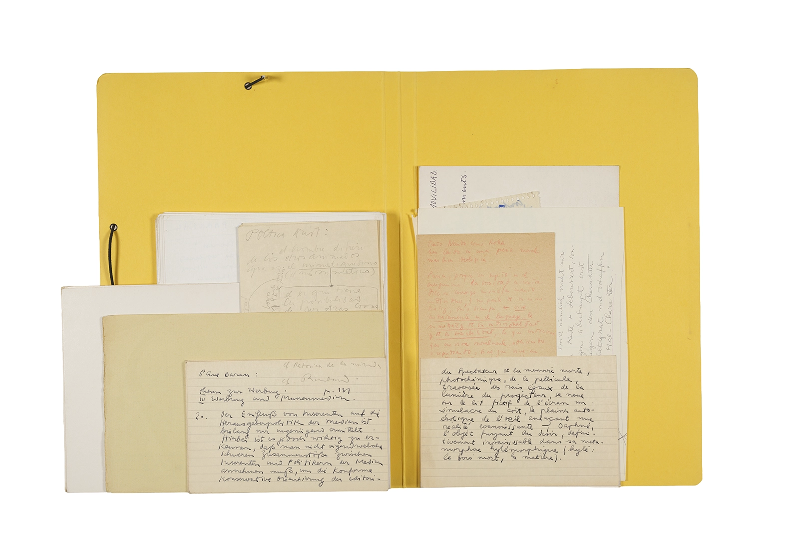 Manuscritos en tinta y grafito sobre papel, fichas bibliográficas, clip metálico, libreta con tapa de cartón unida al lomo por corchetes metálicos.