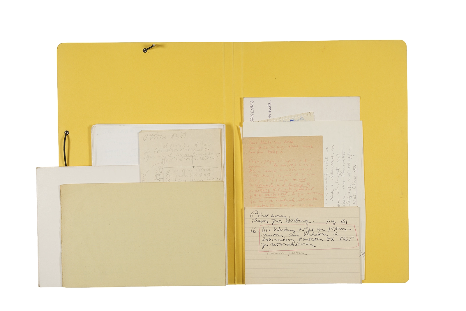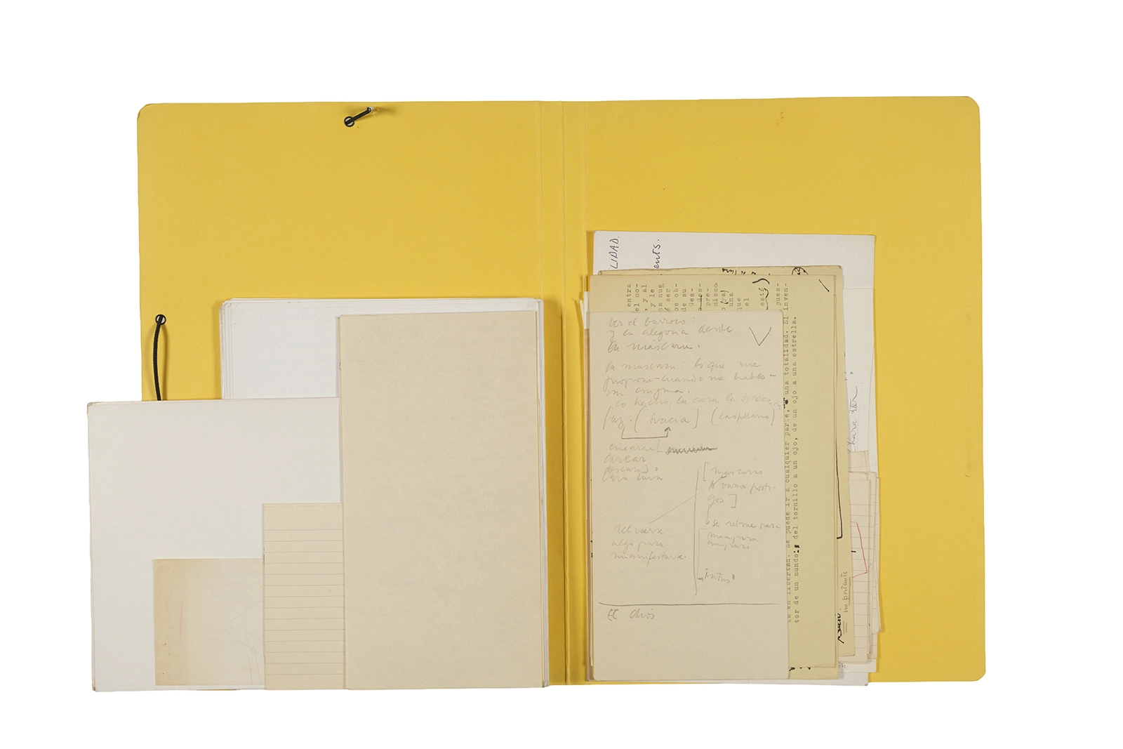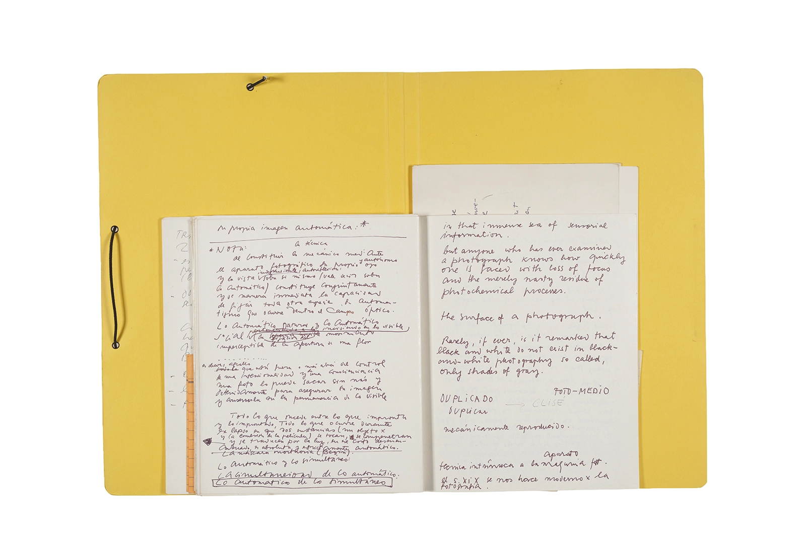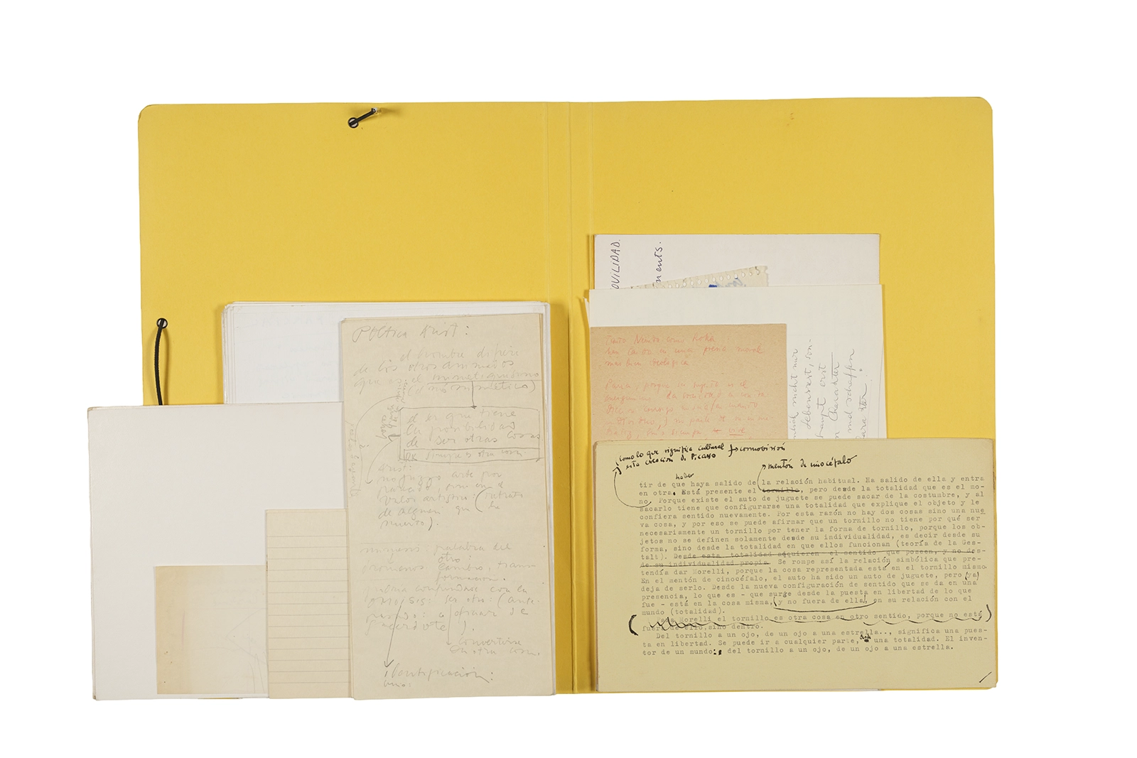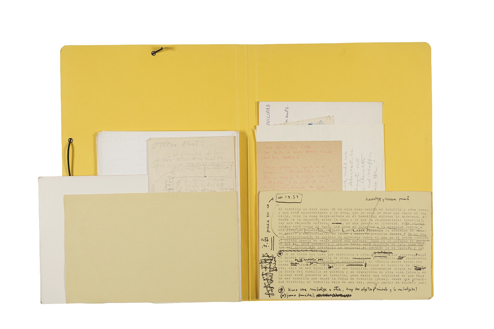 Manuscritos en tinta y grafito sobre papel, fichas bibliográficas, clip metálico, libreta con tapa de cartón unida al lomo por corchetes metálicos.