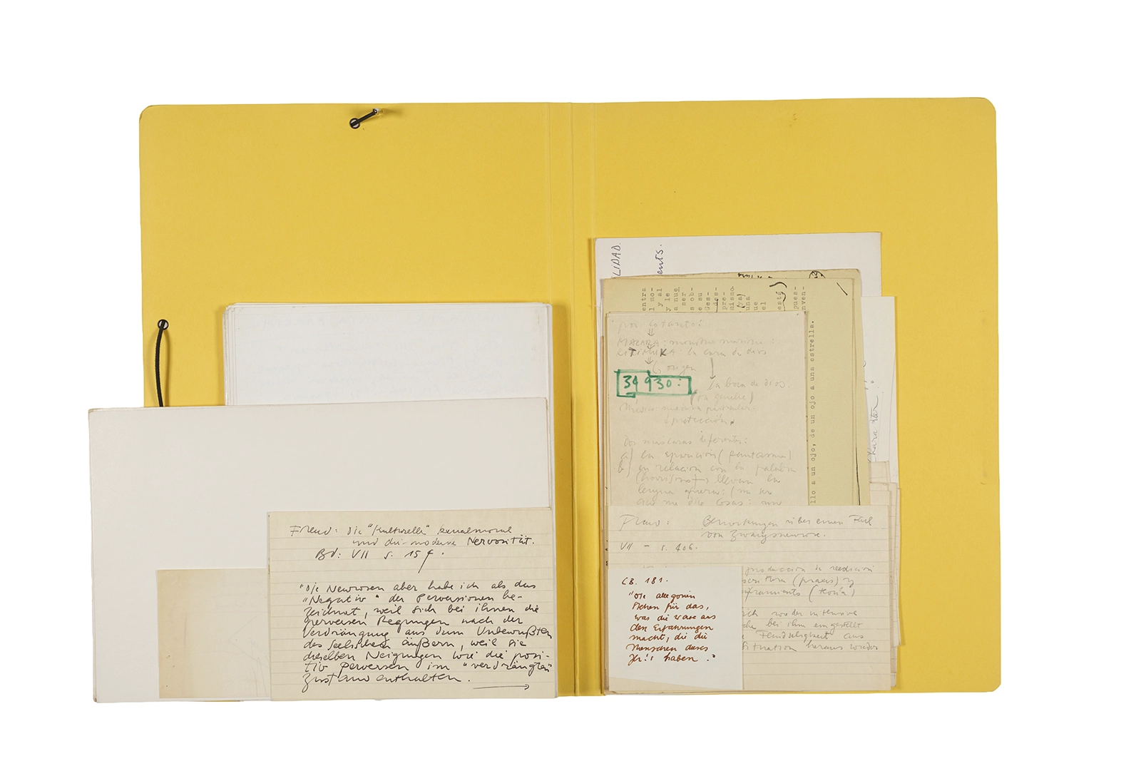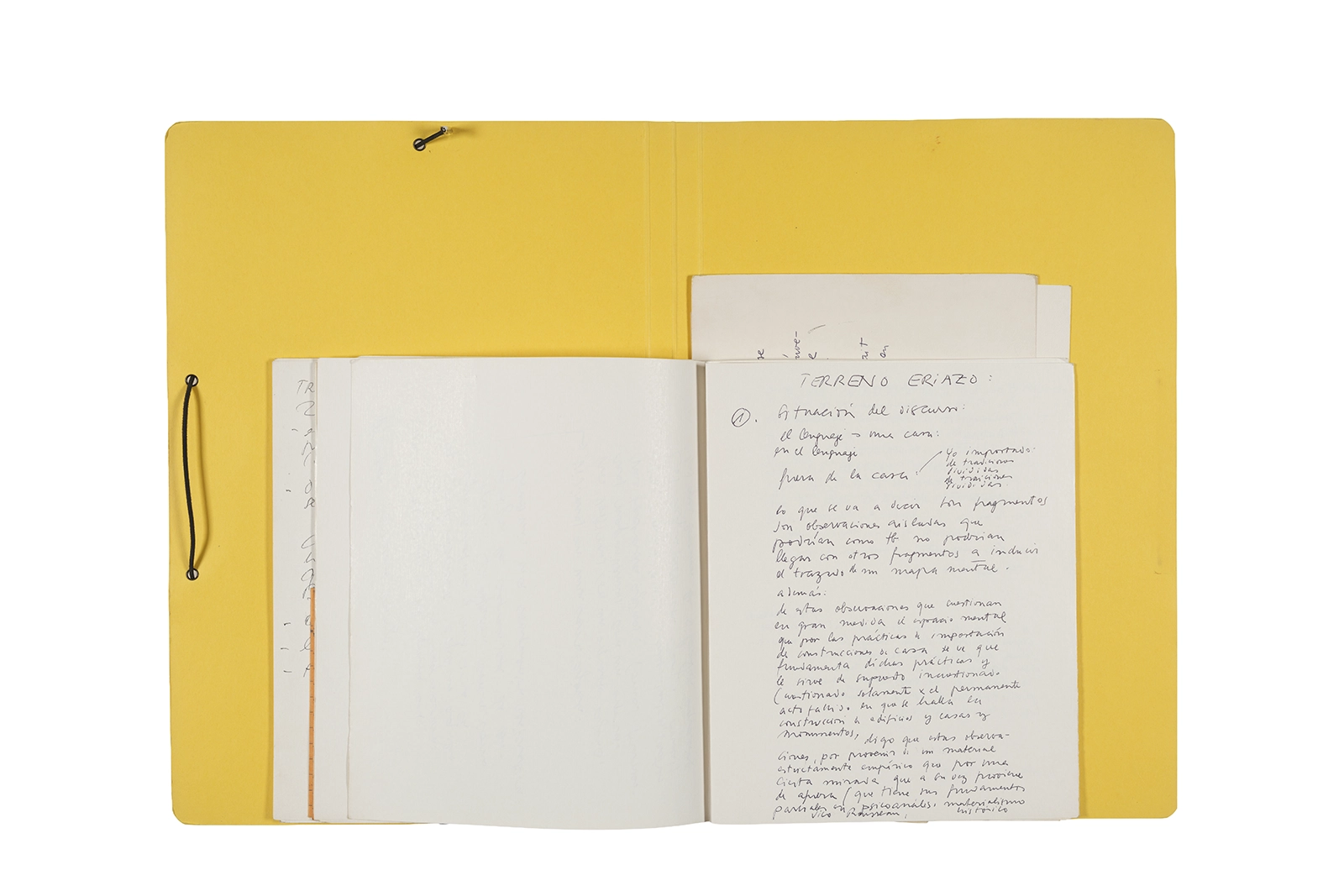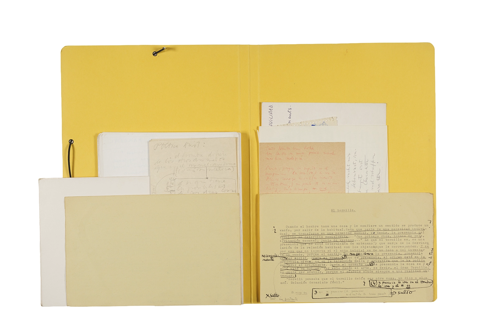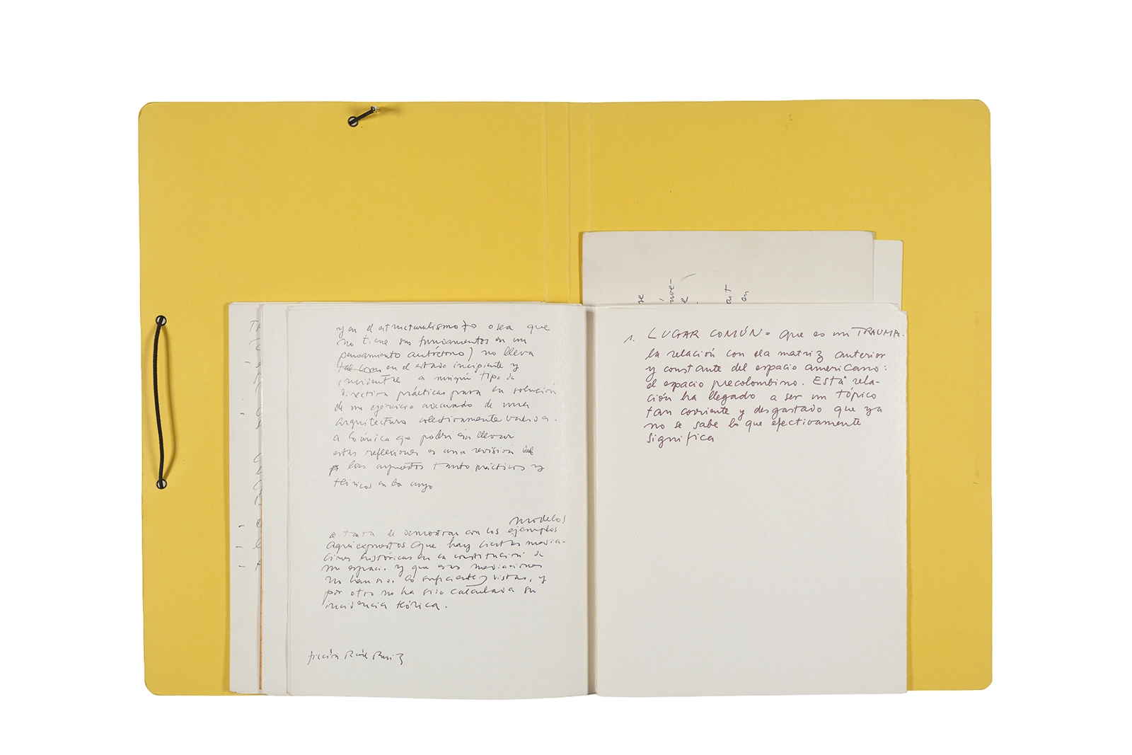 Manuscritos en tinta y grafito sobre papel, fichas bibliográficas, clip metálico, libreta con tapa de cartón unida al lomo por corchetes metálicos.