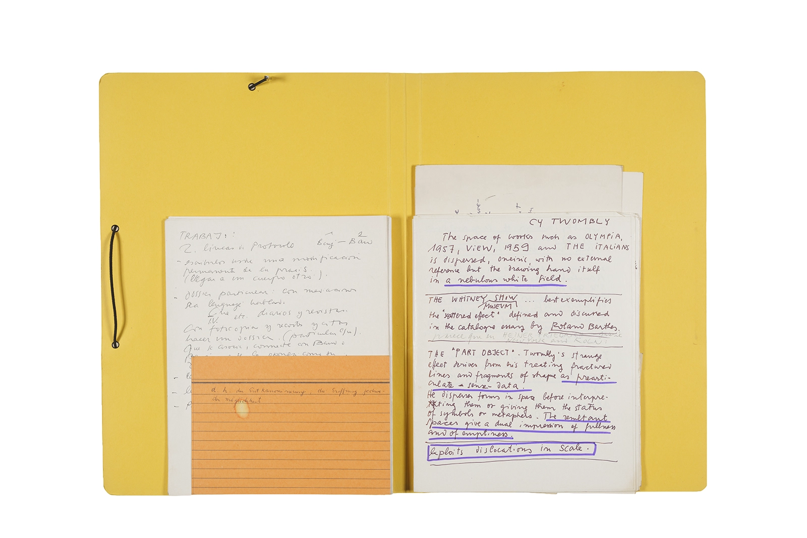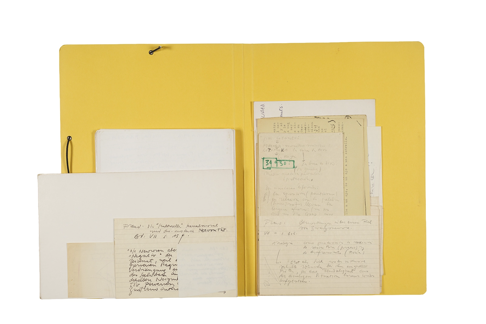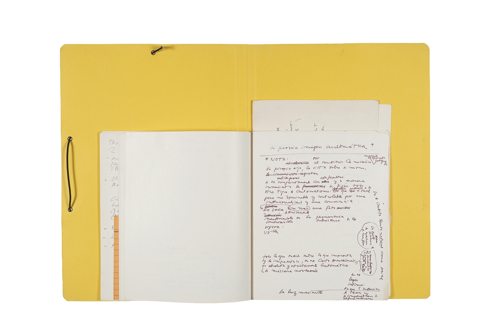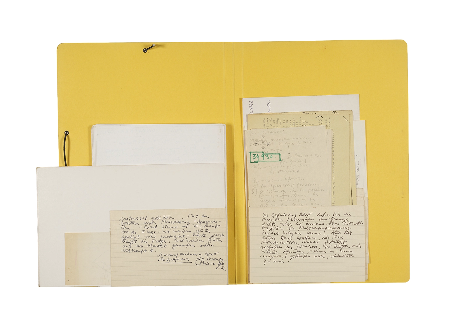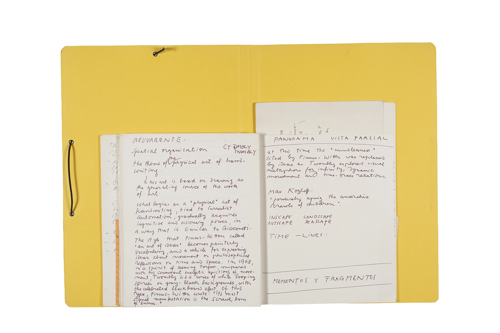 Manuscritos en tinta y grafito sobre papel, fichas bibliográficas, clip metálico, libreta con tapa de cartón unida al lomo por corchetes metálicos.