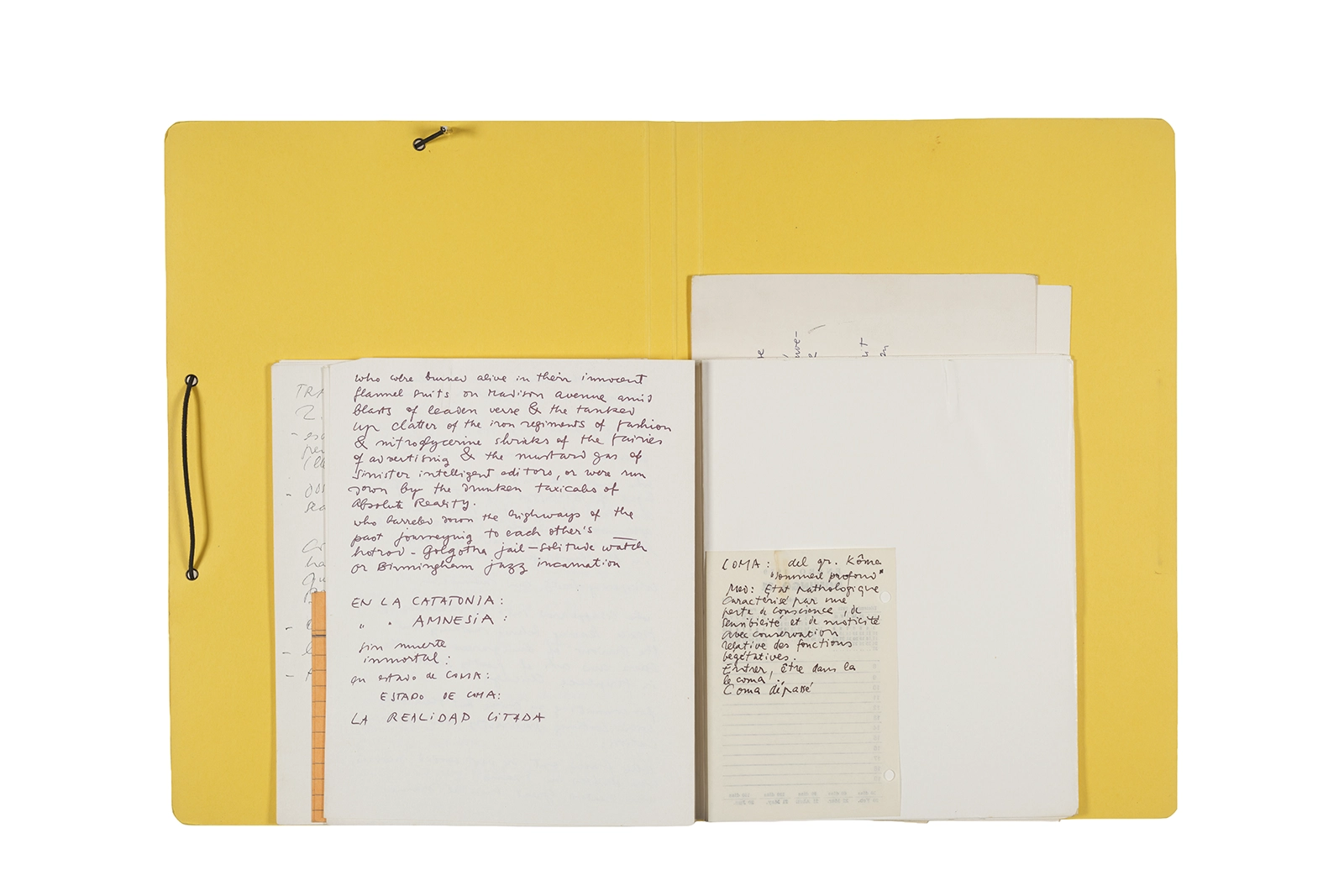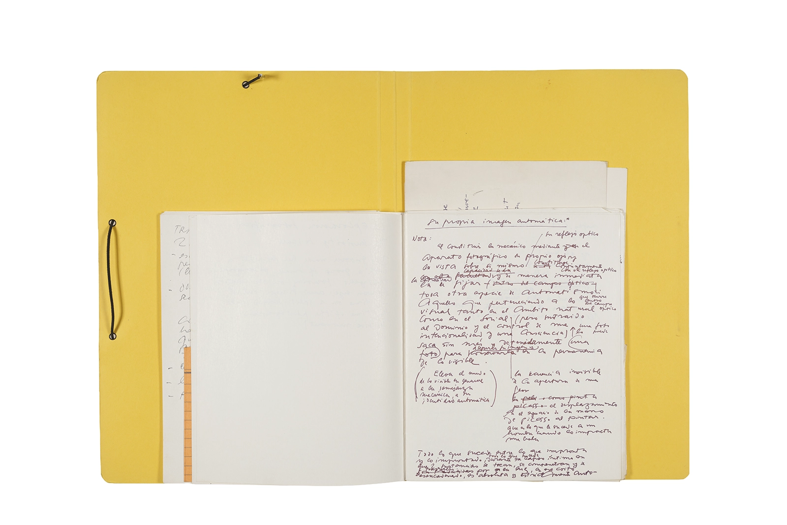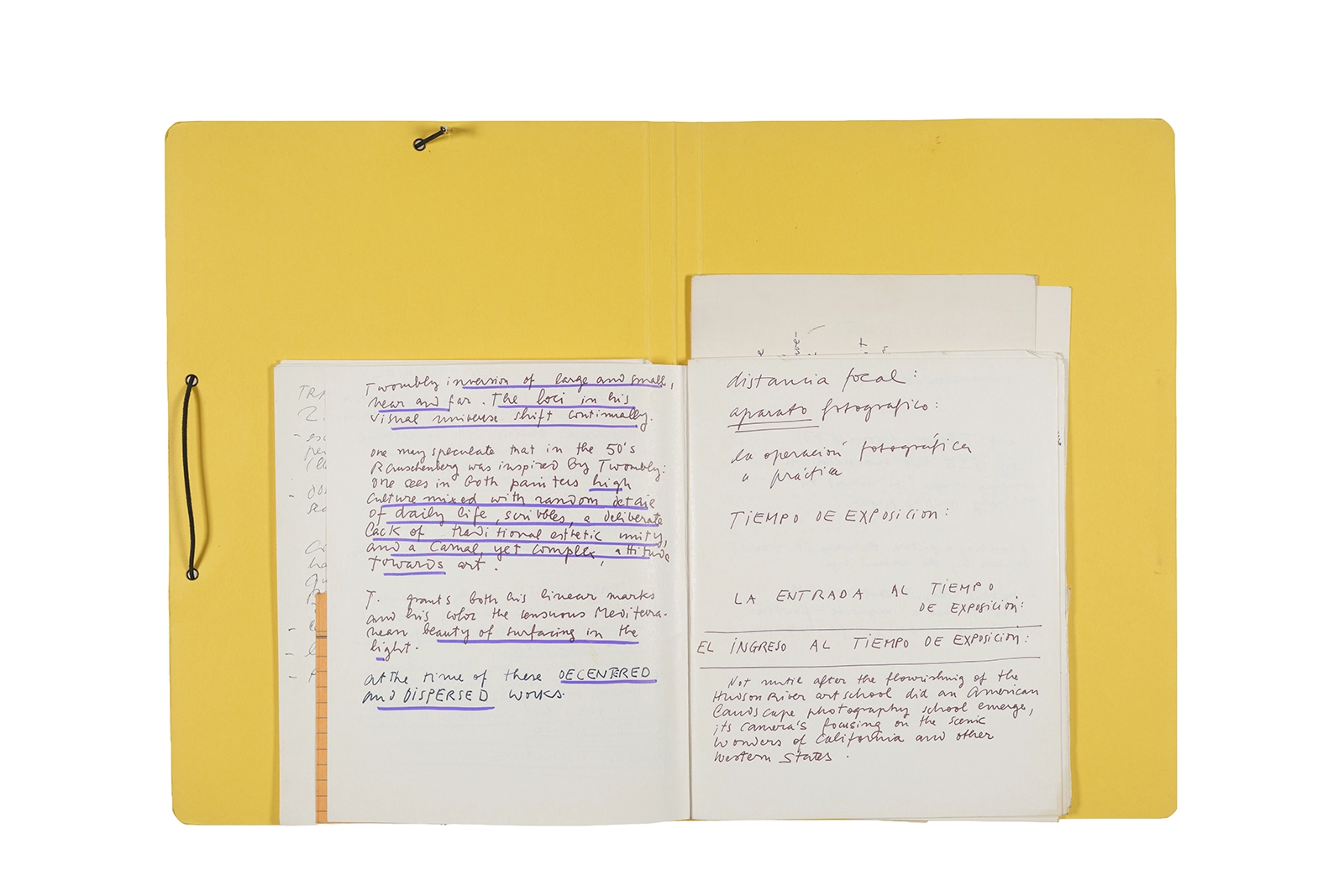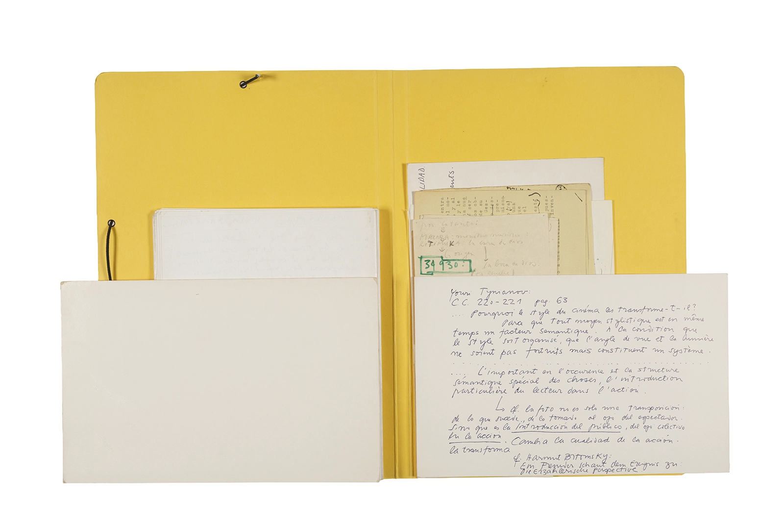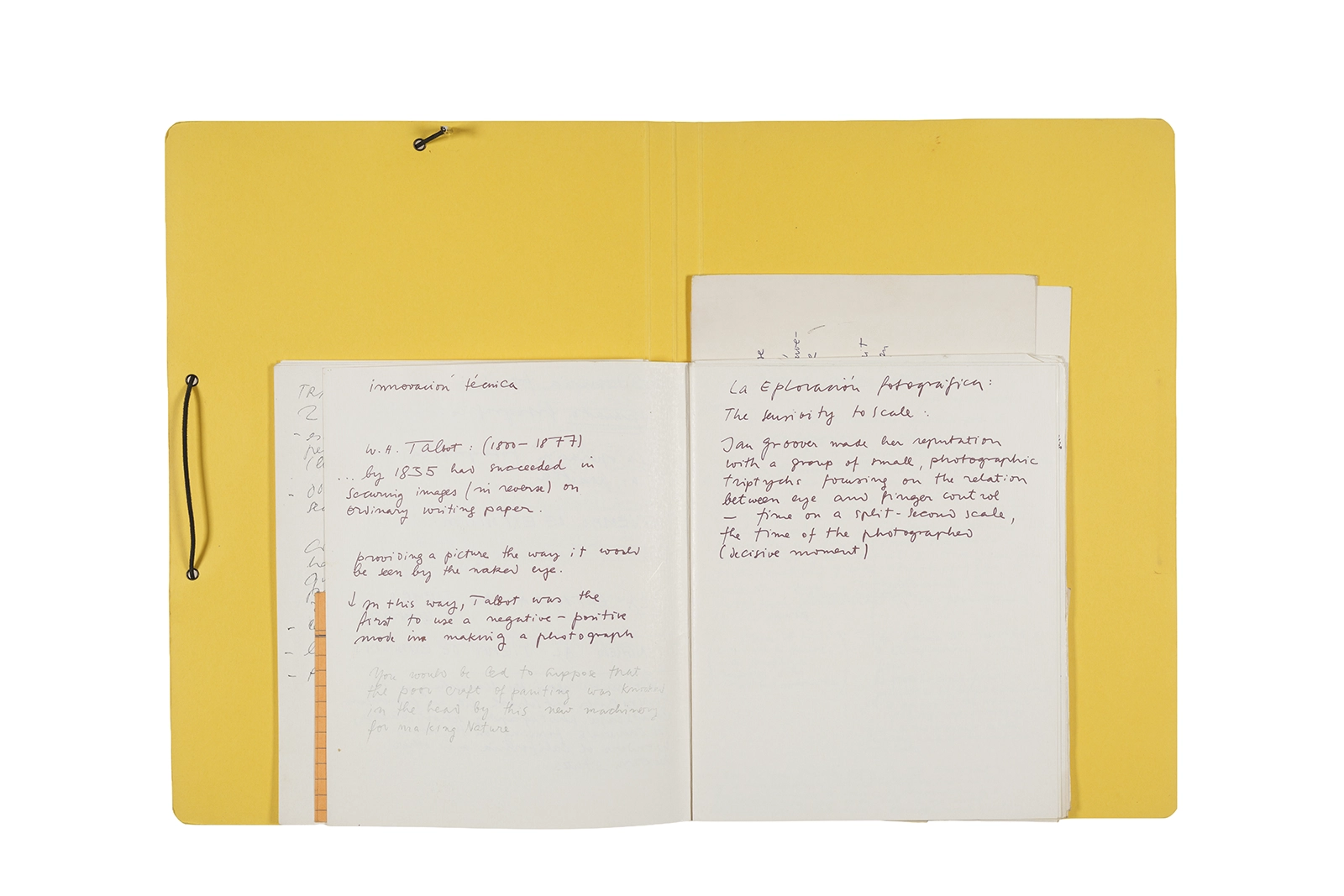 Manuscritos en tinta y grafito sobre papel, fichas bibliográficas, clip metálico, libreta con tapa de cartón unida al lomo por corchetes metálicos.