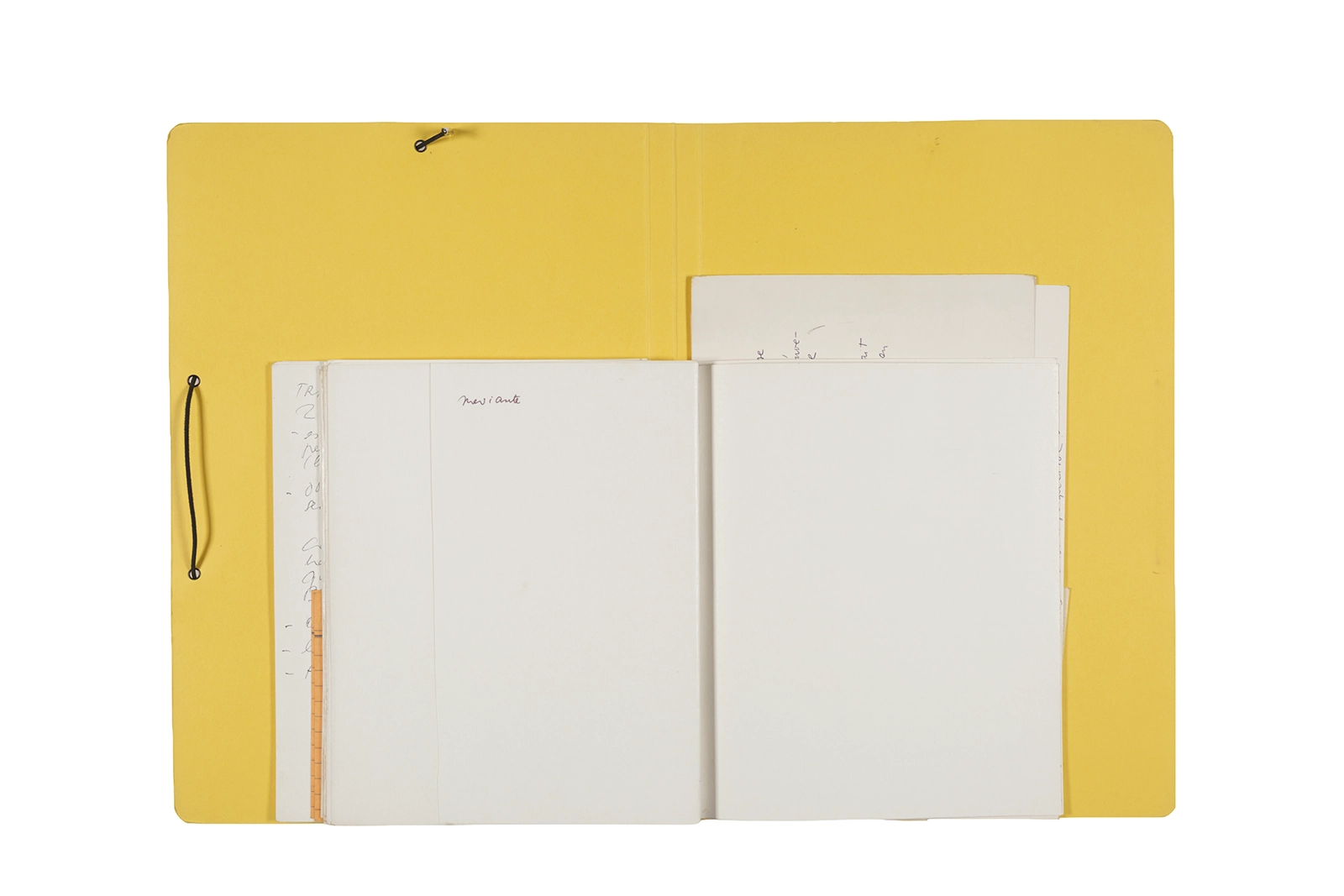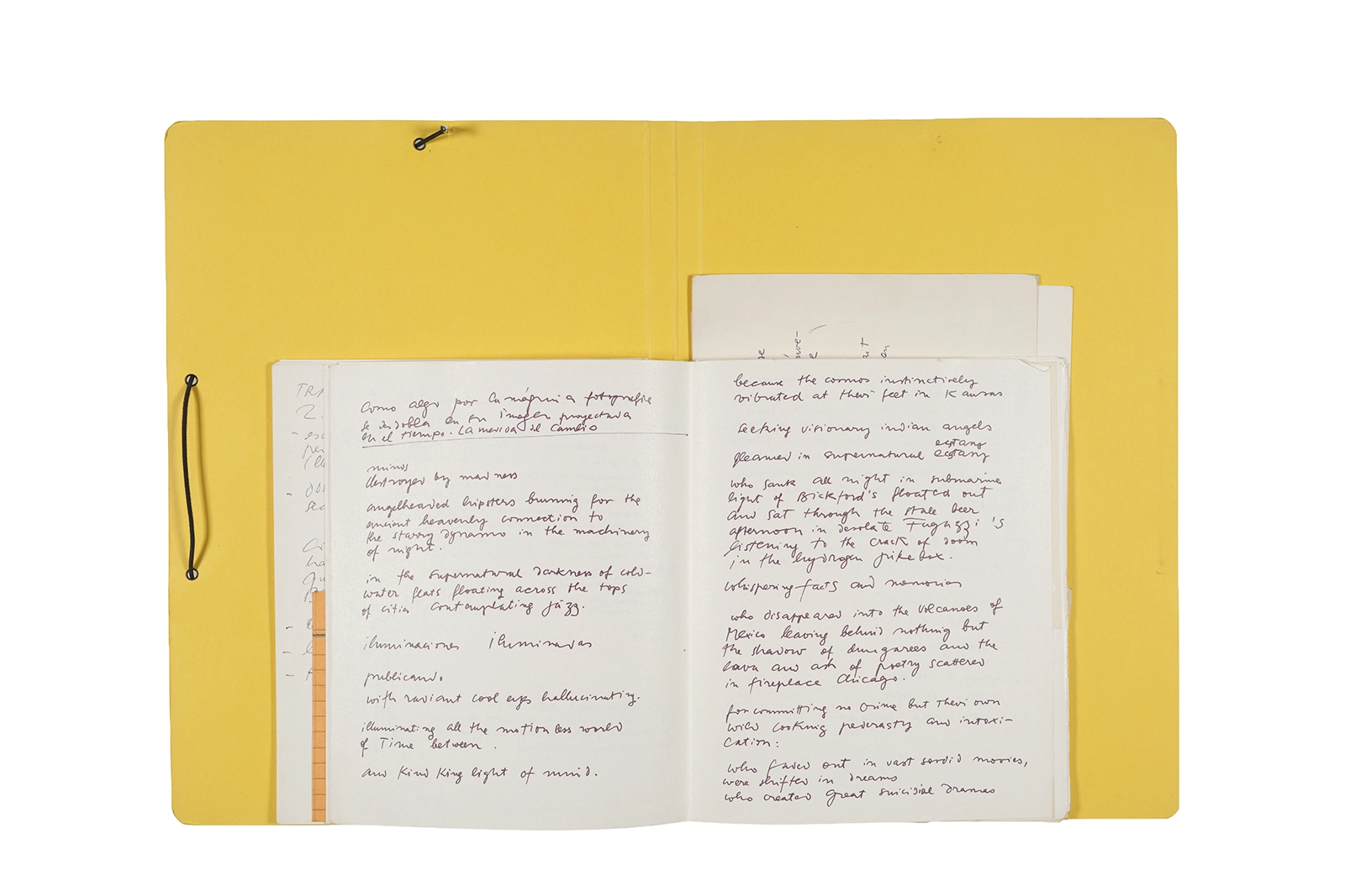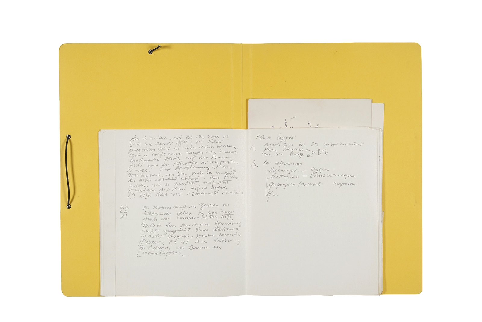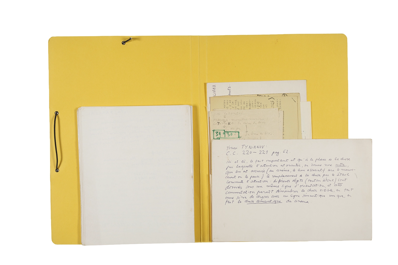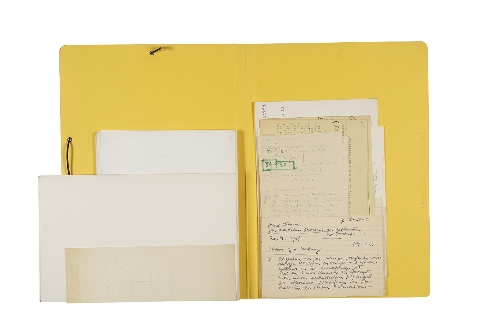 Manuscritos en tinta y grafito sobre papel, fichas bibliográficas, clip metálico, libreta con tapa de cartón unida al lomo por corchetes metálicos.