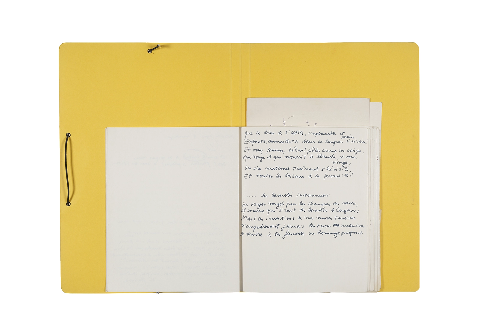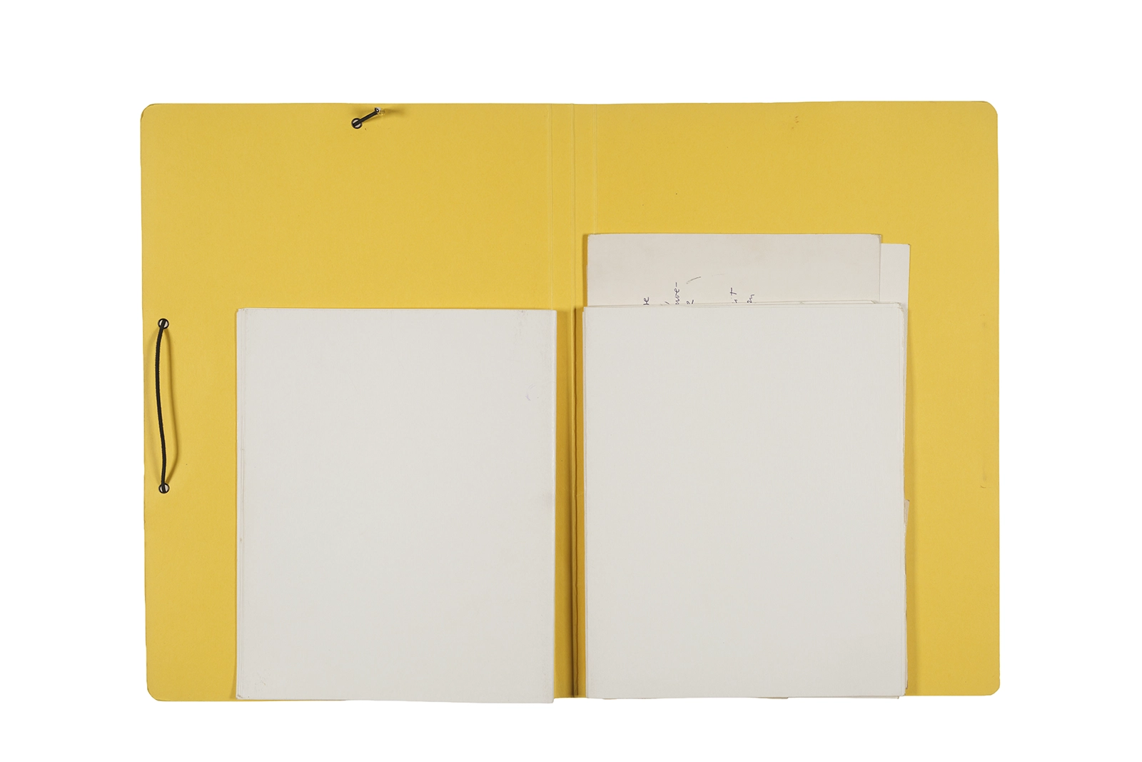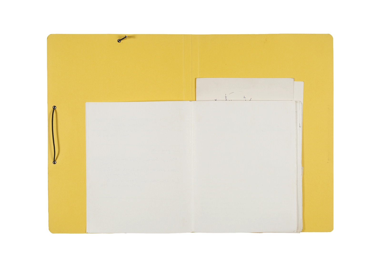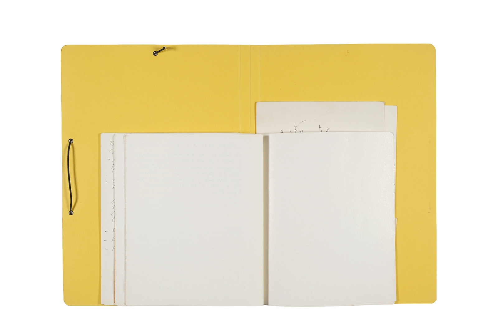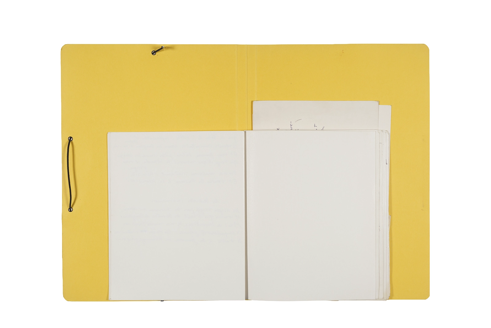 Manuscritos en tinta y grafito sobre papel, fichas bibliográficas, clip metálico, libreta con tapa de cartón unida al lomo por corchetes metálicos.