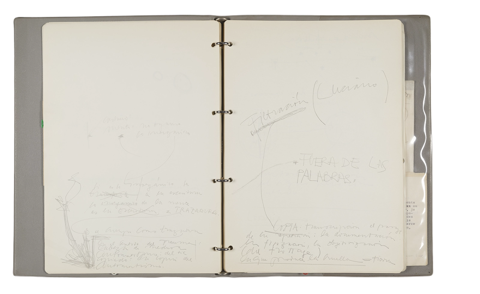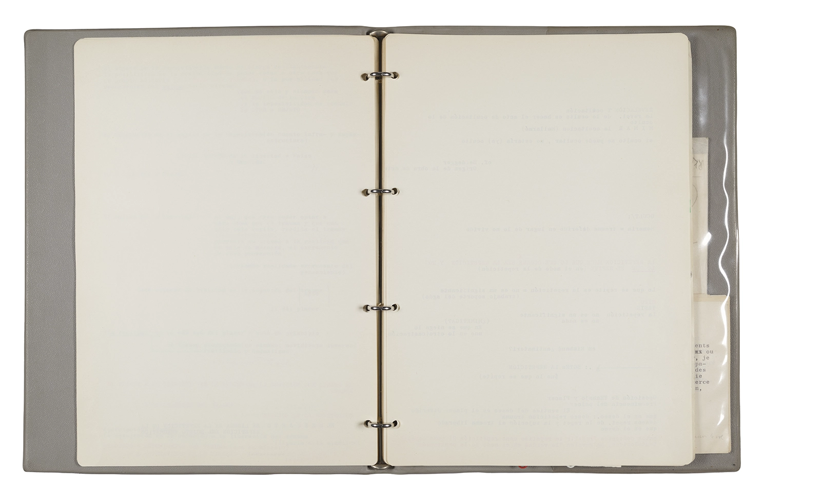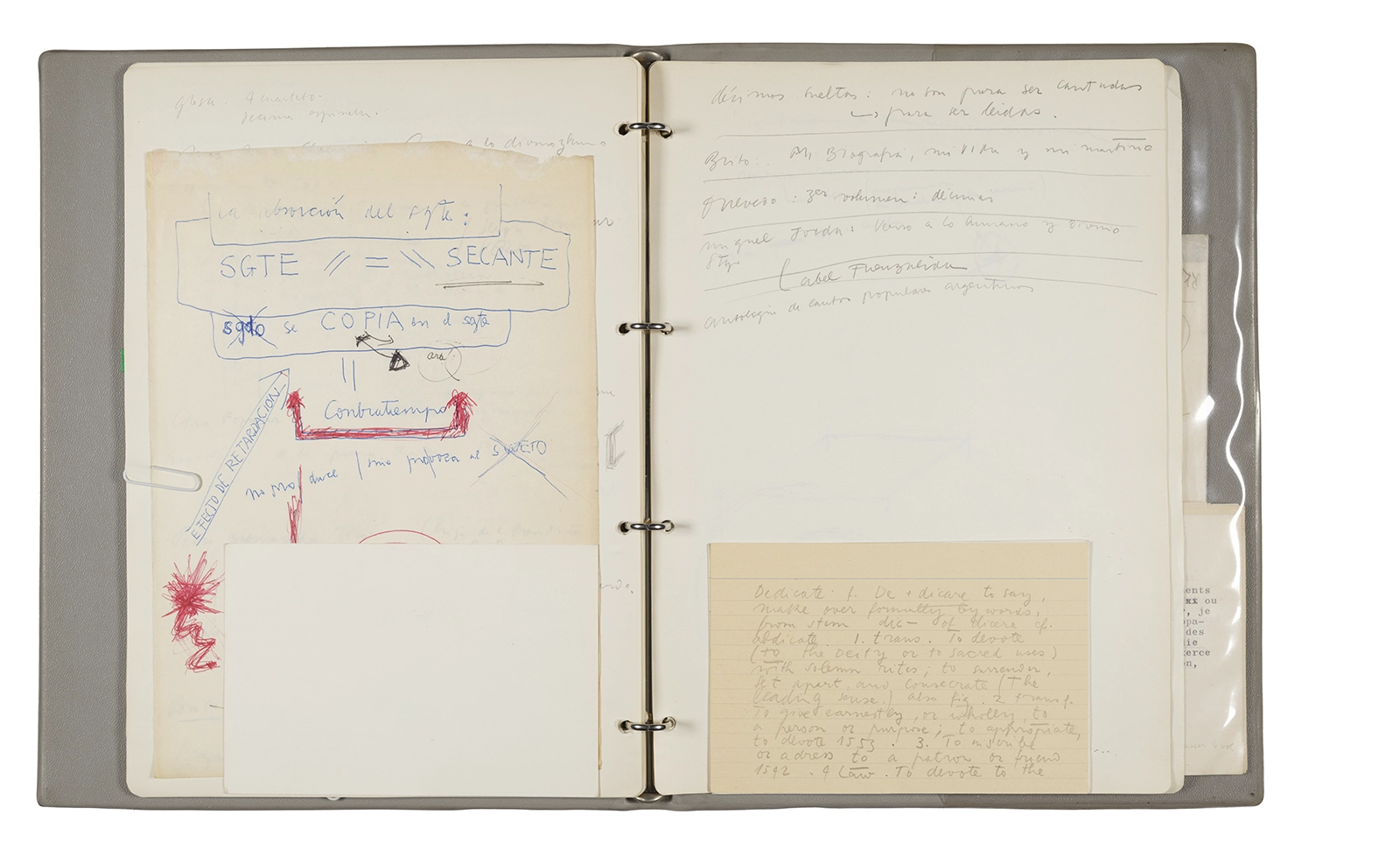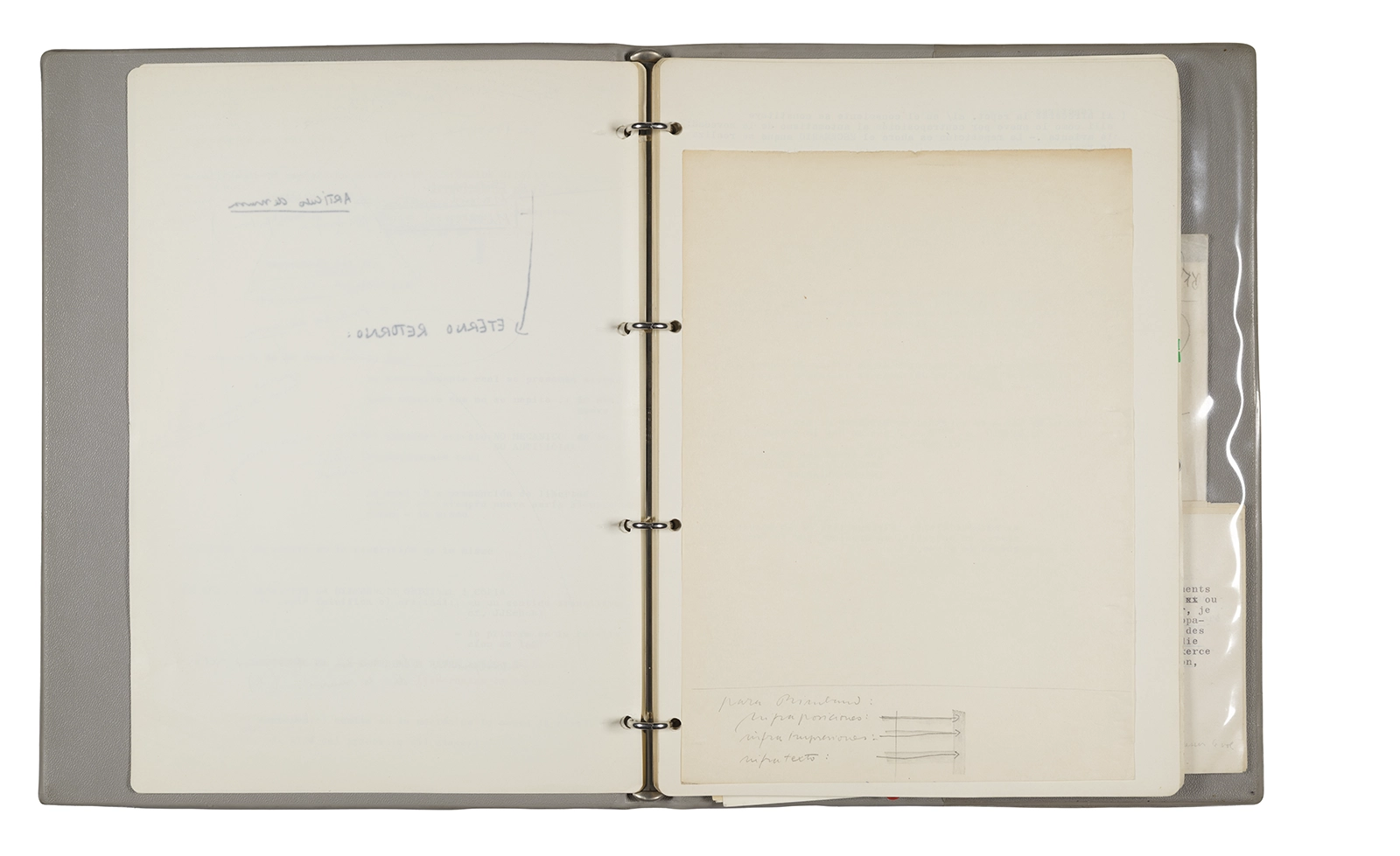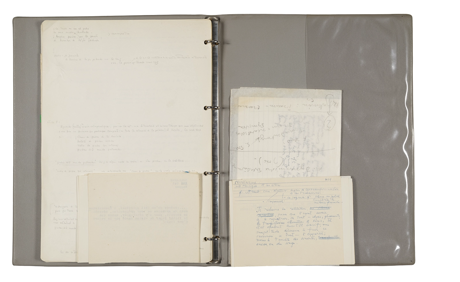 Papel mecanografiado, apuntes manuscritos en grafito sobre papel, recortes de prensa, páginas de revista con imágenes en blanco y negro, cinta adhesiva.