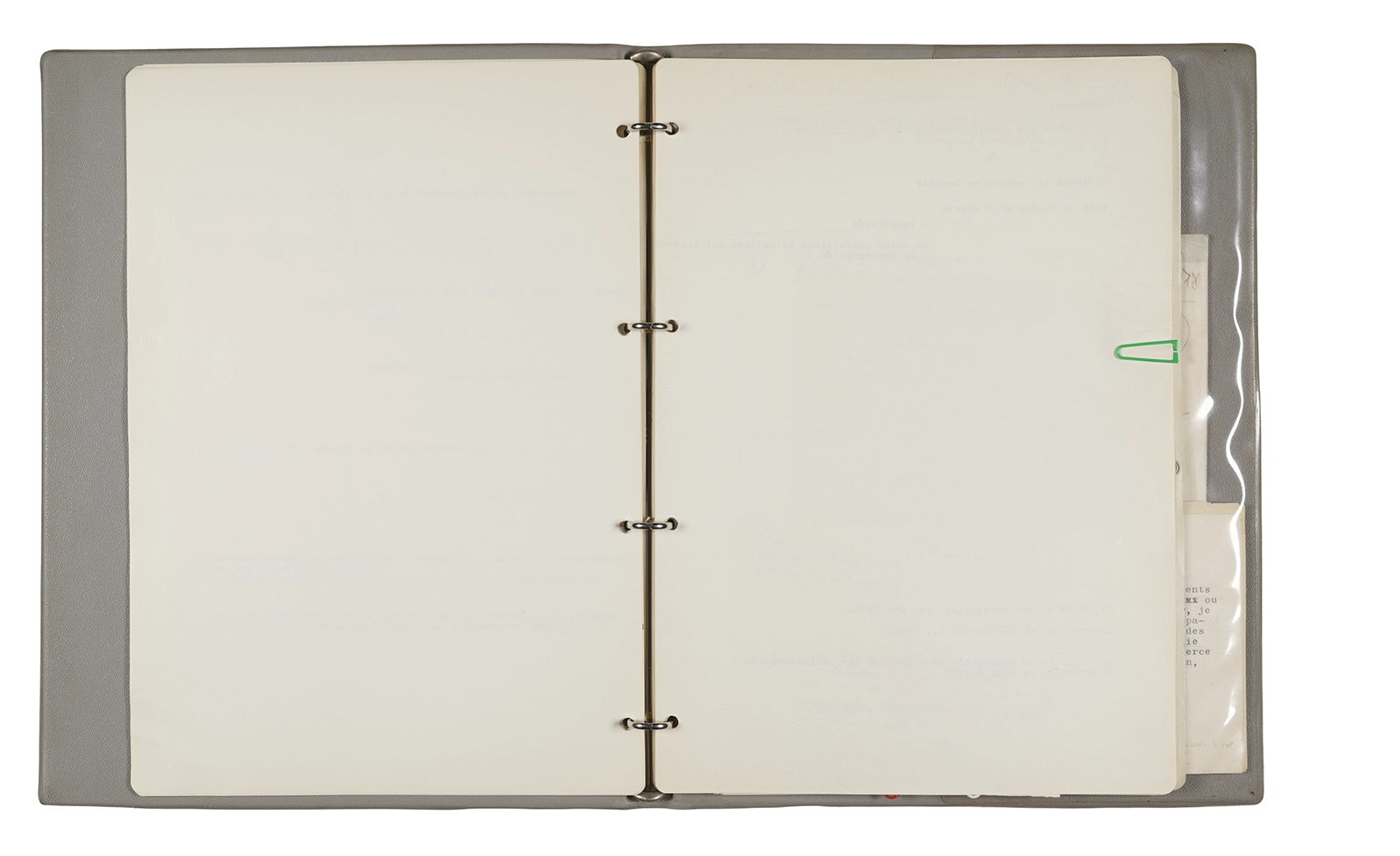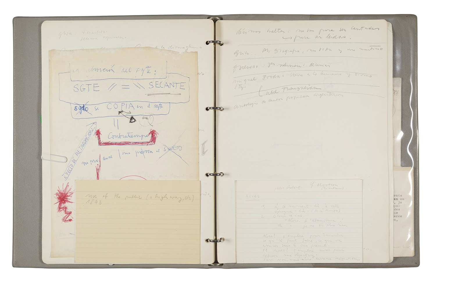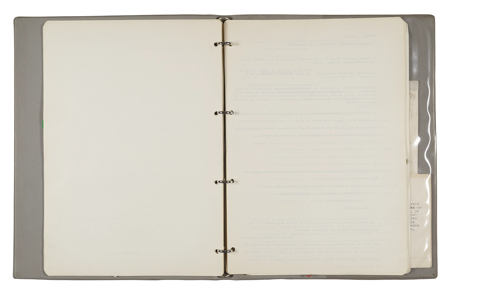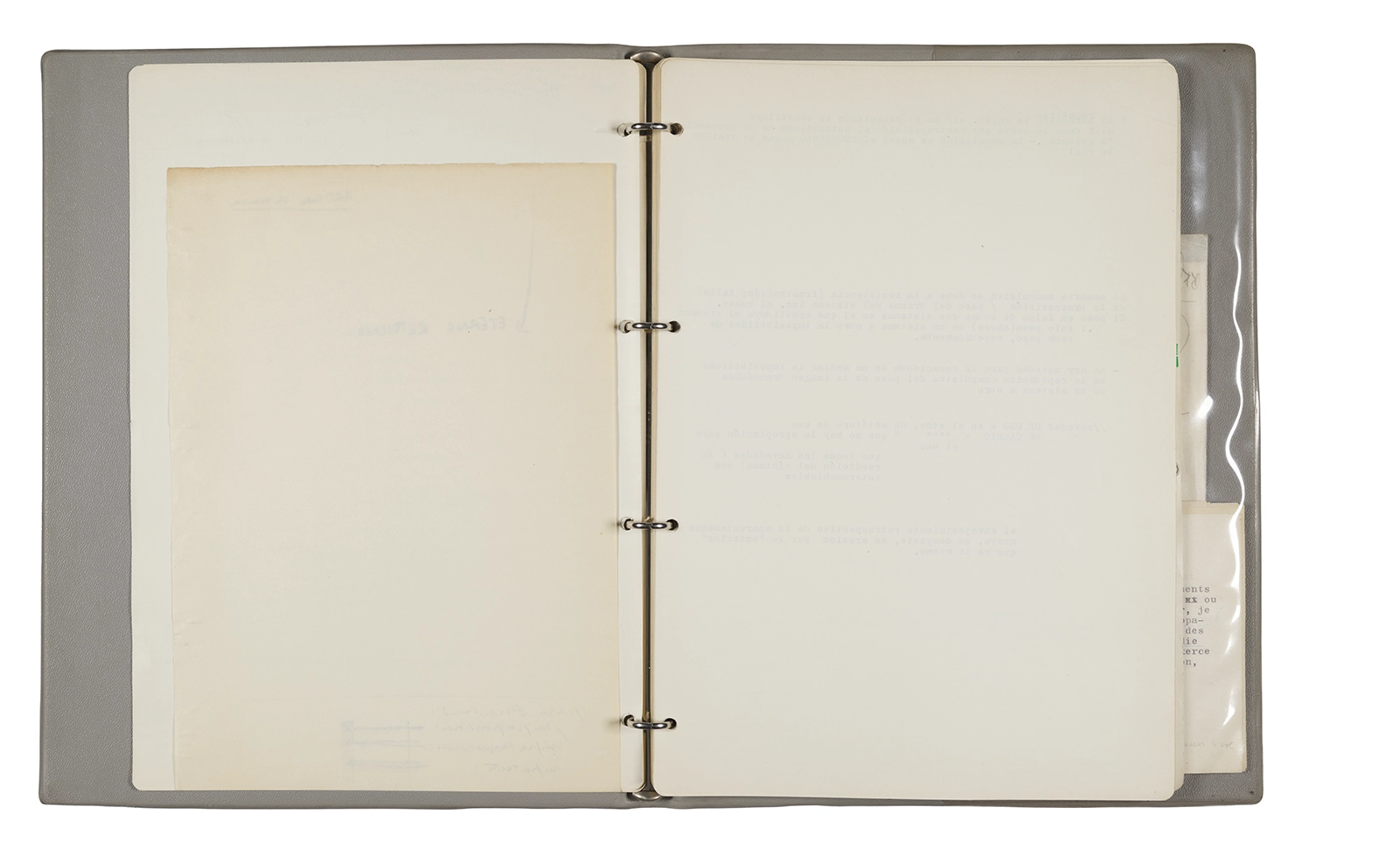Papel mecanografiado, apuntes manuscritos en grafito sobre papel, recortes de prensa, páginas de revista con imágenes en blanco y negro, cinta adhesiva.