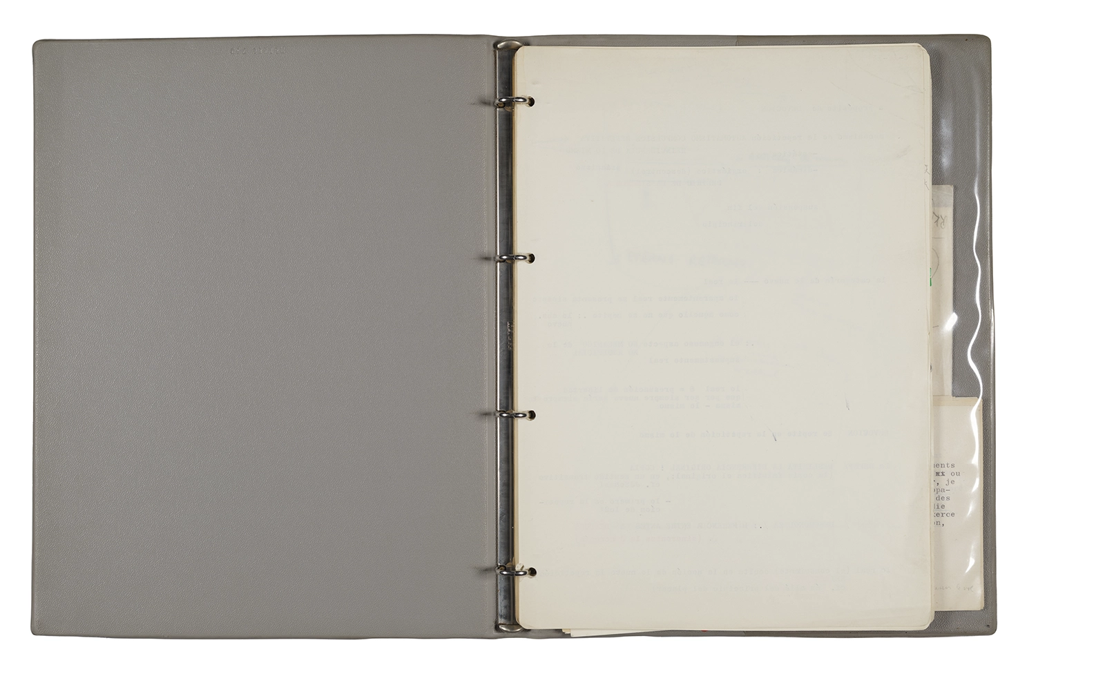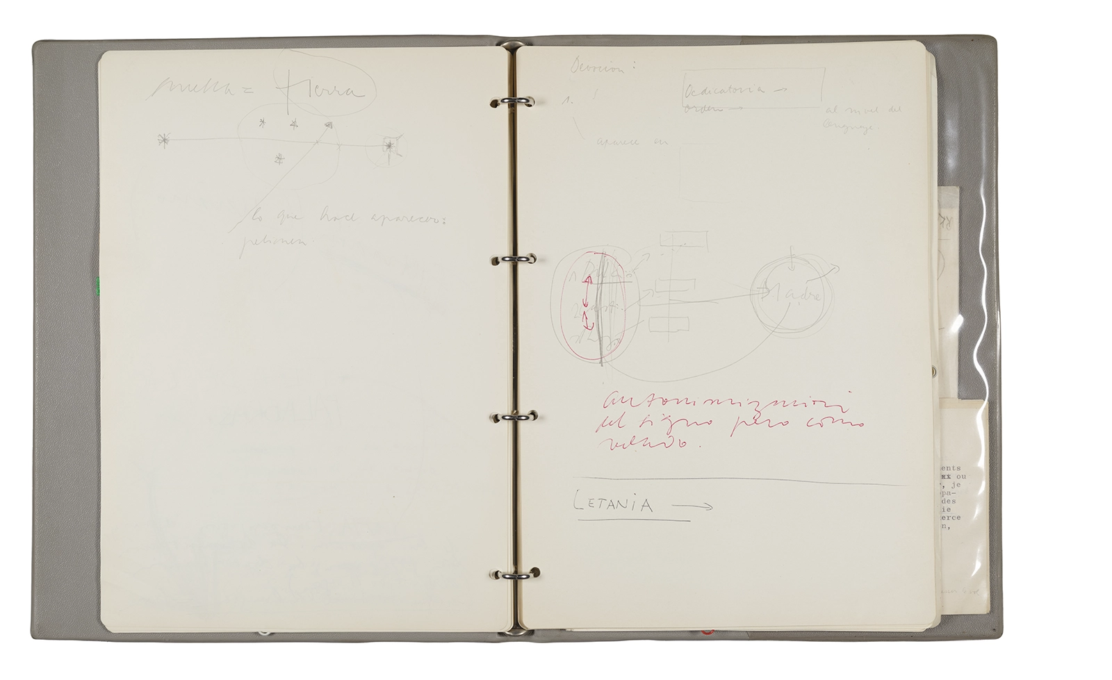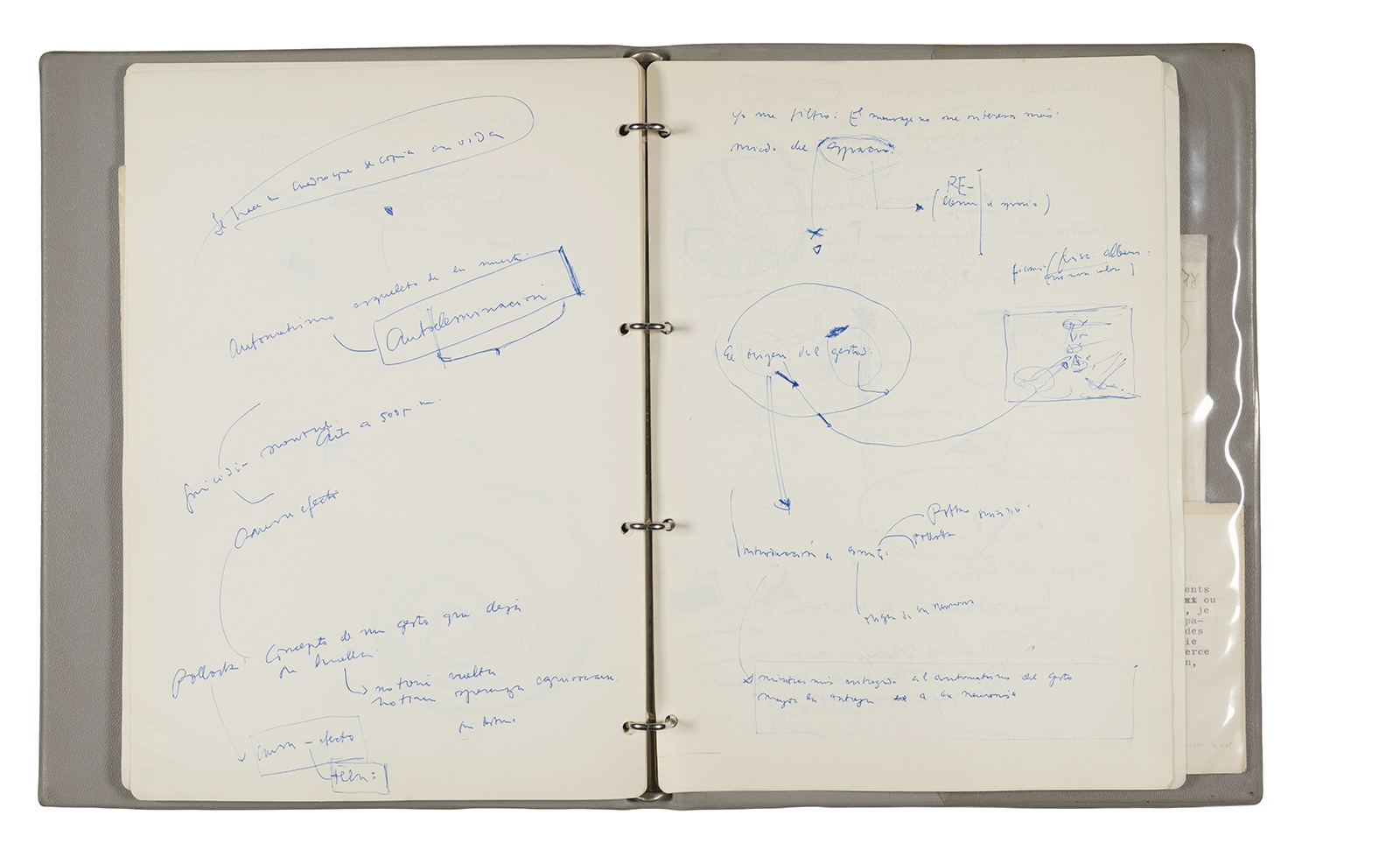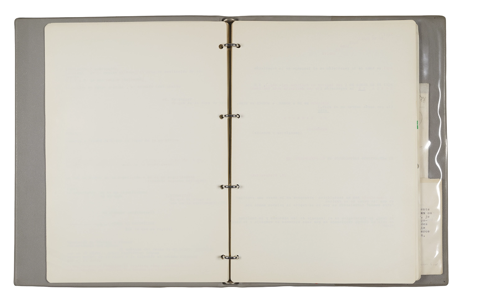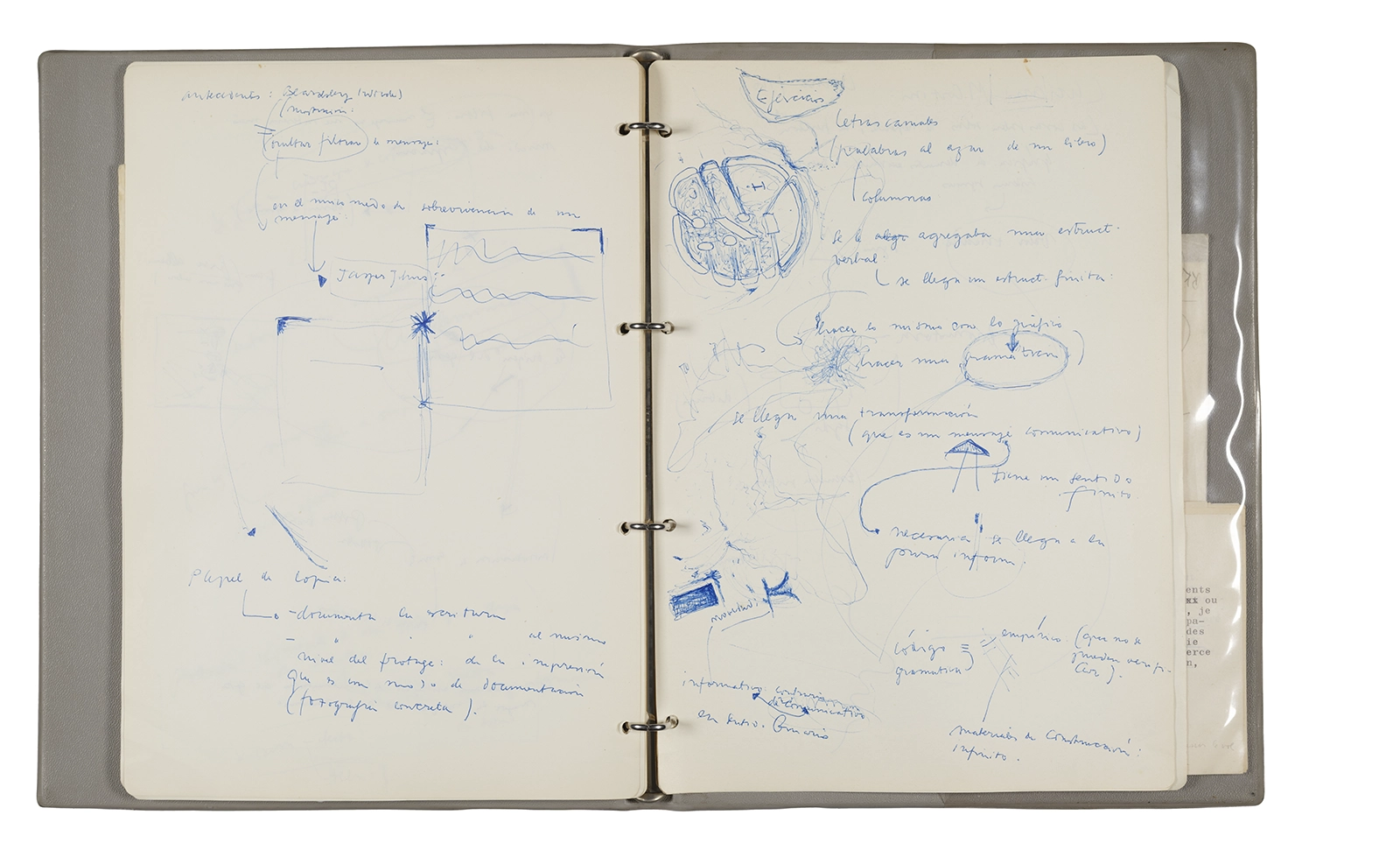 Papel mecanografiado, apuntes manuscritos en grafito sobre papel, recortes de prensa, páginas de revista con imágenes en blanco y negro, cinta adhesiva.