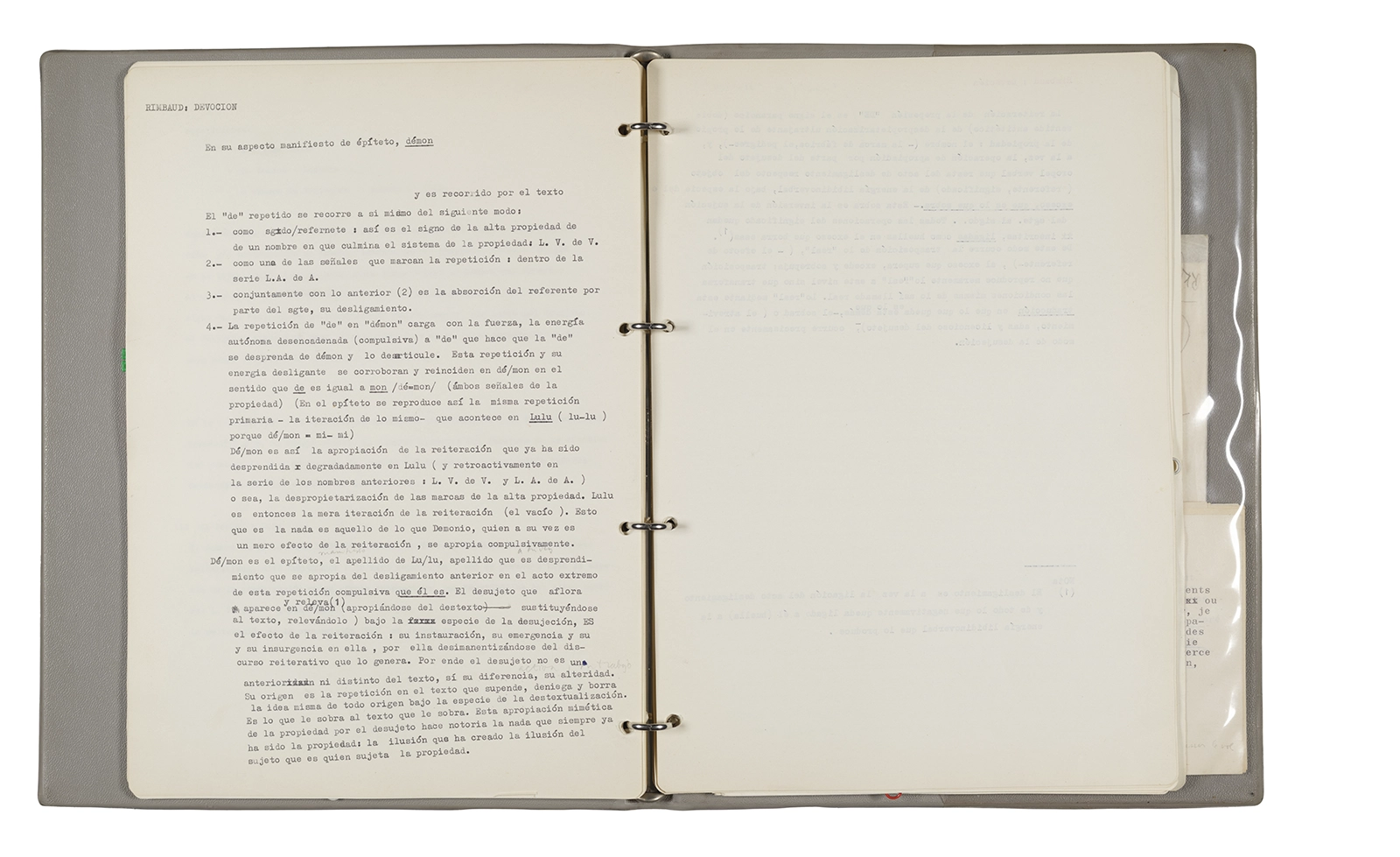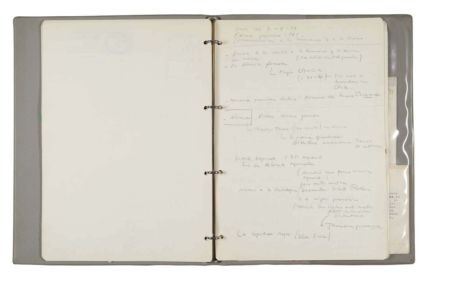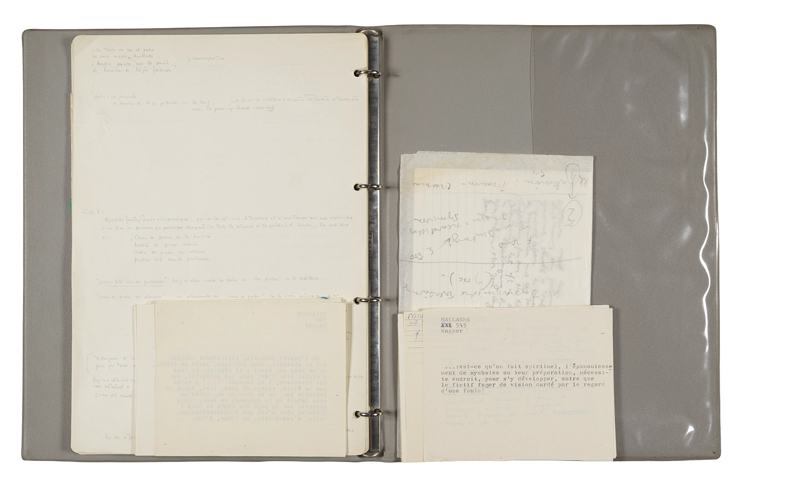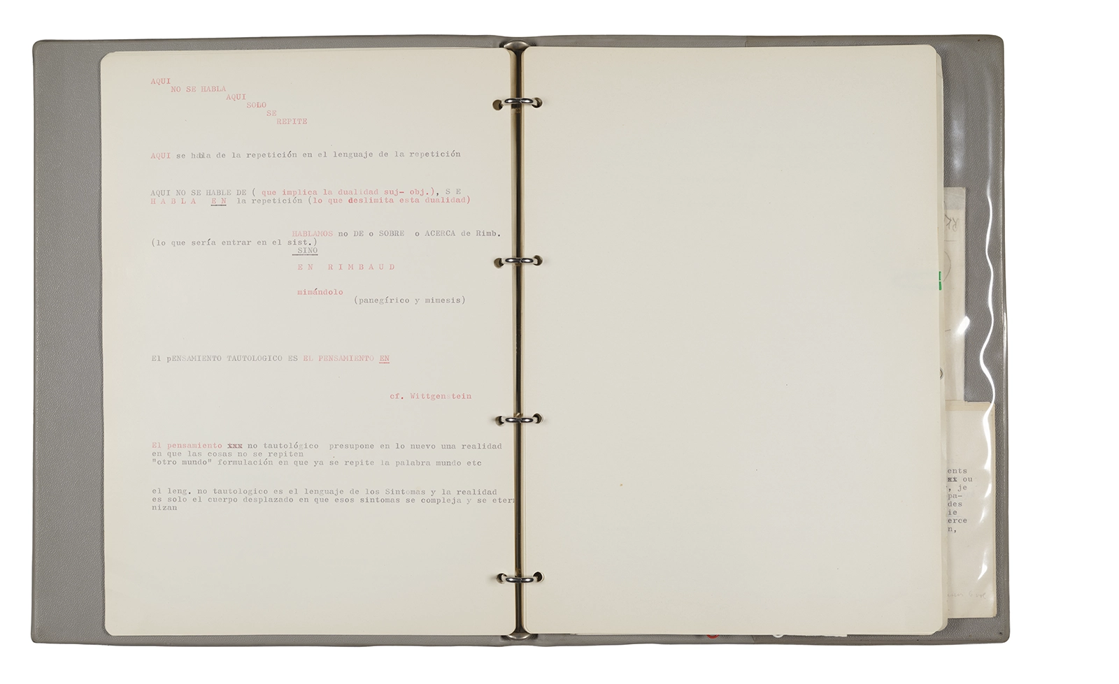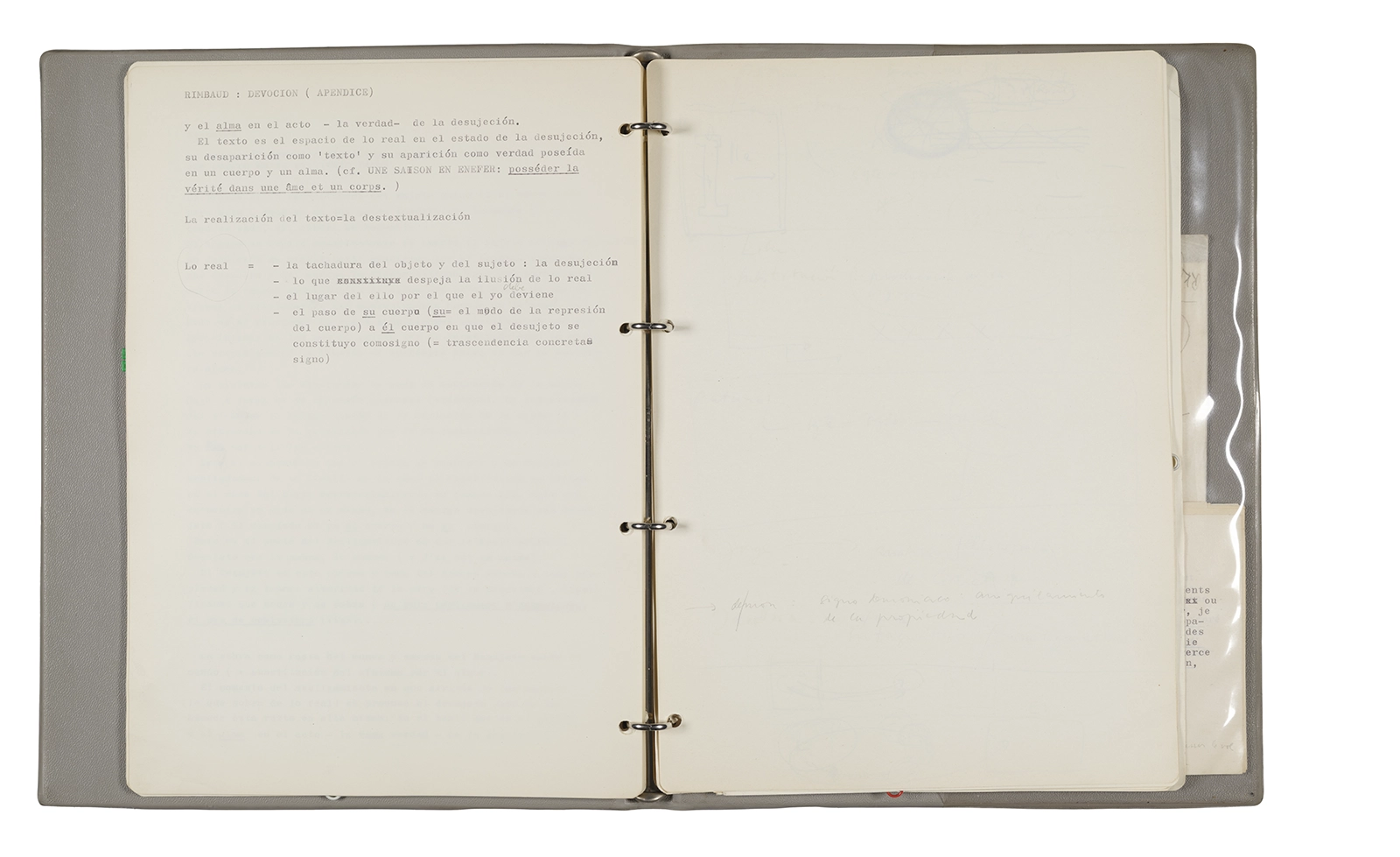 Esta carpeta reúne distintos materiales vinculados al seminario centrado en los textos de Stéphane Mallarmé y en “Iluminaciones” de Arthur Rimbaud que dirigió Ronald Kay junto a Enrique Lihn durante un año y medio, entre 1973 y 1974, en el Departamento de Estudios Humanísticos de la Universidad de Chile. Se incluyen aquí apuntes sobre “Iluminaciones” de Rimbaud, fichas de lectura sobre Mallarmé con el título “Propuesta de un modelo de interlección de la sintaxis en la prosa -práctica teorica- mallarmeana”, y una lista con grupos de trabajo en los que se dividirían los participantes del seminario, entre ellos, Dimela Eltit, María Eugenia Brito, Juan Balbontín, Rodrigo Cánovas y Carlos Flores. Así mismo, esta carpeta contiene recortes de prensa de la revista “Time”, entre ellos uno que contiene la nota “Allende’s Last Day”, publicada en febrero del año 1974, y dos páginas de una revista sin identificar: una con la reproducción de la obra “Hervas” de Wolf Vostell, y otra con una foto del desierto peruano, ambas fechadas en 1975.