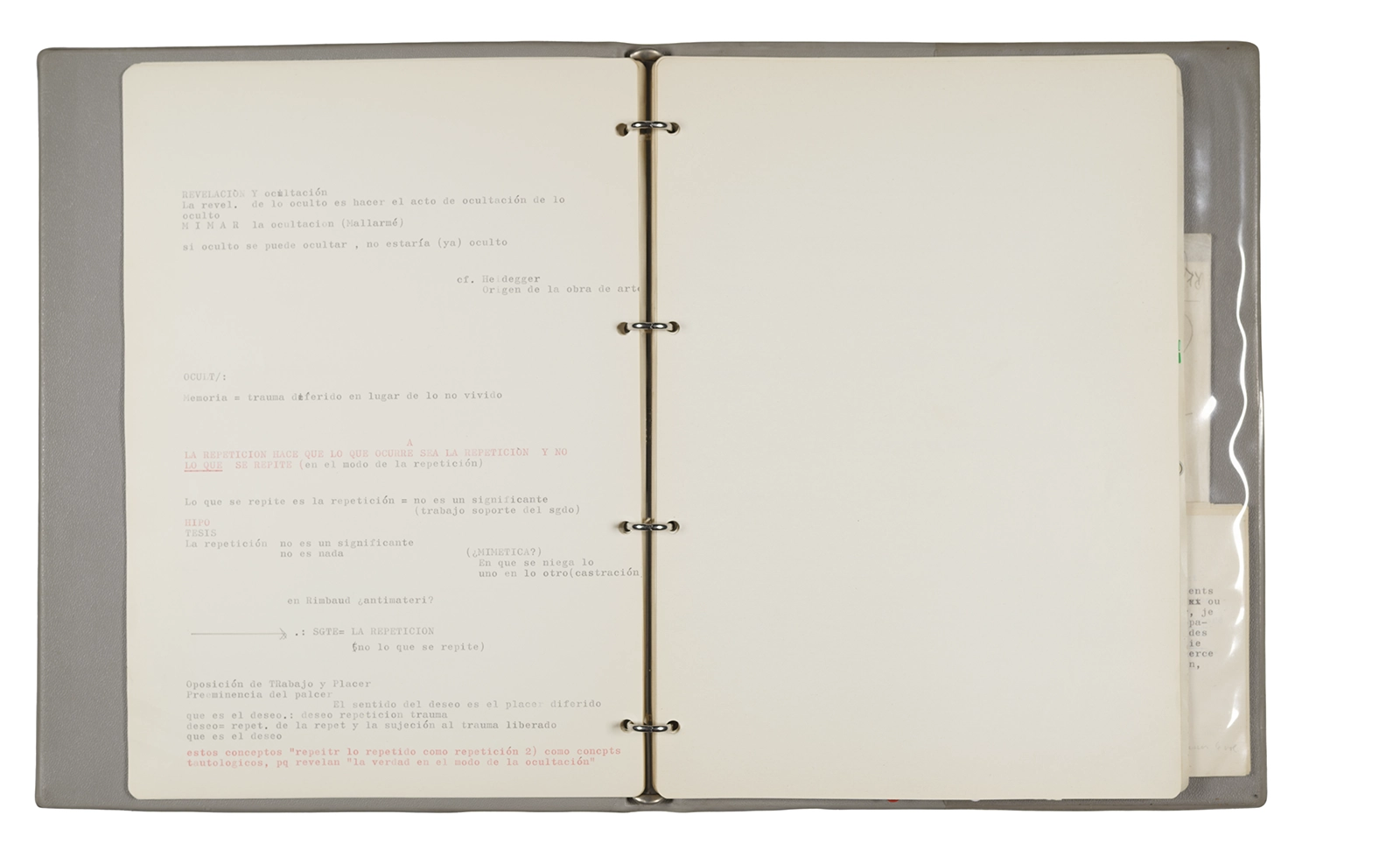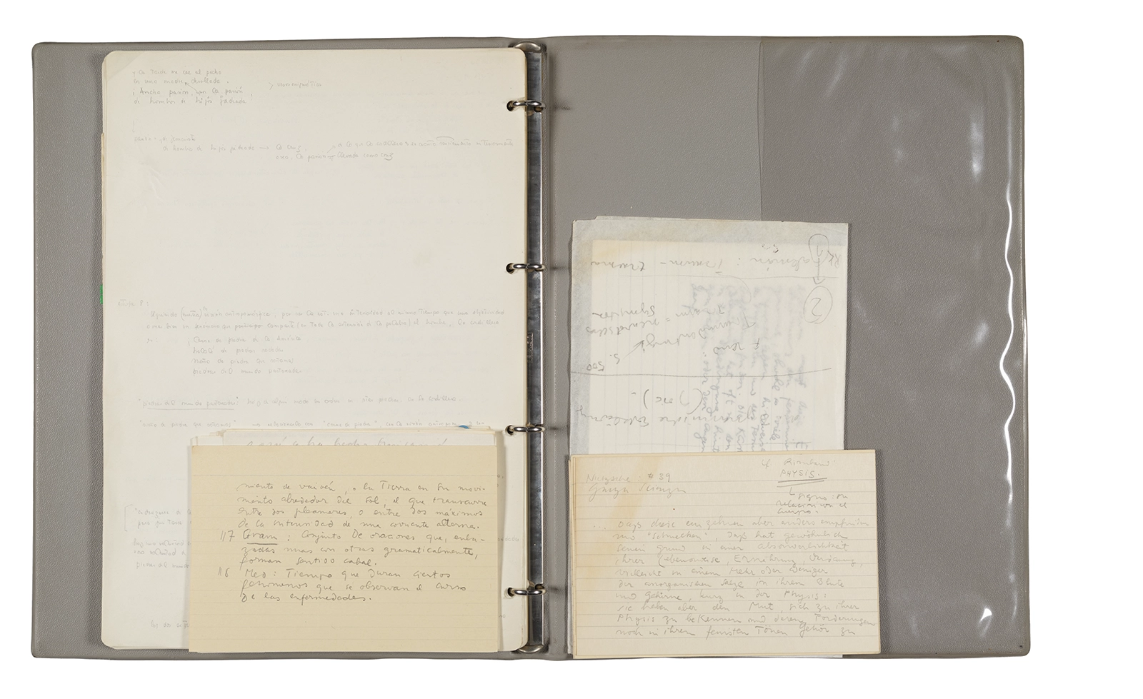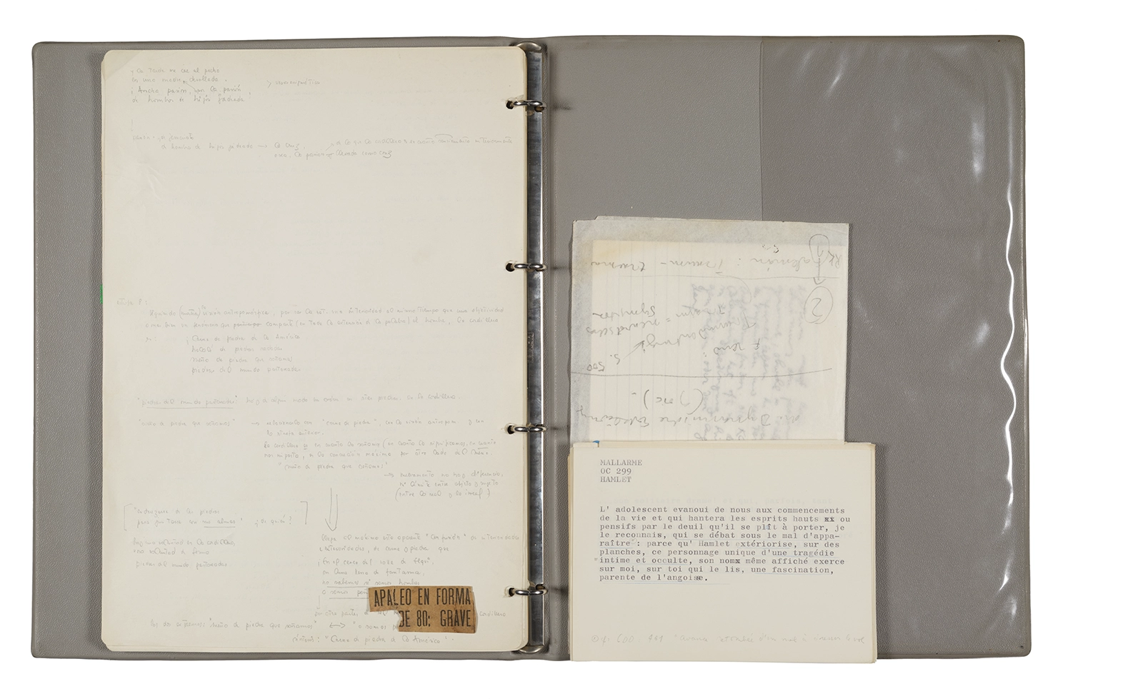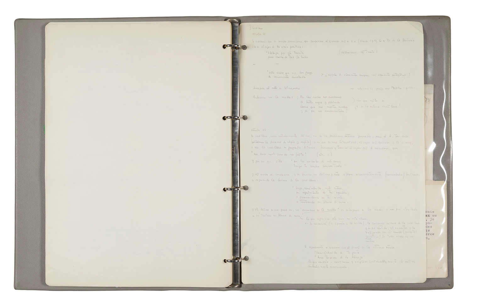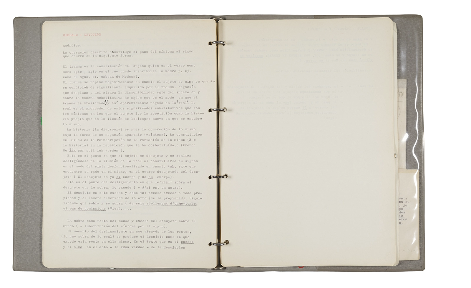 Esta carpeta reúne distintos materiales vinculados al seminario centrado en los textos de Stéphane Mallarmé y en “Iluminaciones” de Arthur Rimbaud que dirigió Ronald Kay junto a Enrique Lihn durante un año y medio, entre 1973 y 1974, en el Departamento de Estudios Humanísticos de la Universidad de Chile. Se incluyen aquí apuntes sobre “Iluminaciones” de Rimbaud, fichas de lectura sobre Mallarmé con el título “Propuesta de un modelo de interlección de la sintaxis en la prosa -práctica teorica- mallarmeana”, y una lista con grupos de trabajo en los que se dividirían los participantes del seminario, entre ellos, Dimela Eltit, María Eugenia Brito, Juan Balbontín, Rodrigo Cánovas y Carlos Flores. Así mismo, esta carpeta contiene recortes de prensa de la revista “Time”, entre ellos uno que contiene la nota “Allende’s Last Day”, publicada en febrero del año 1974, y dos páginas de una revista sin identificar: una con la reproducción de la obra “Hervas” de Wolf Vostell, y otra con una foto del desierto peruano, ambas fechadas en 1975.