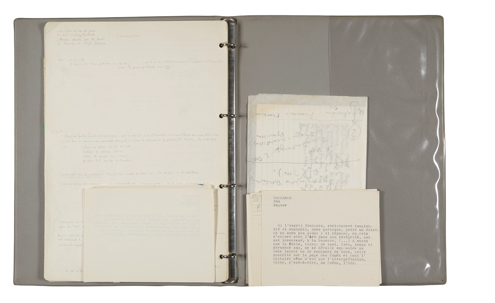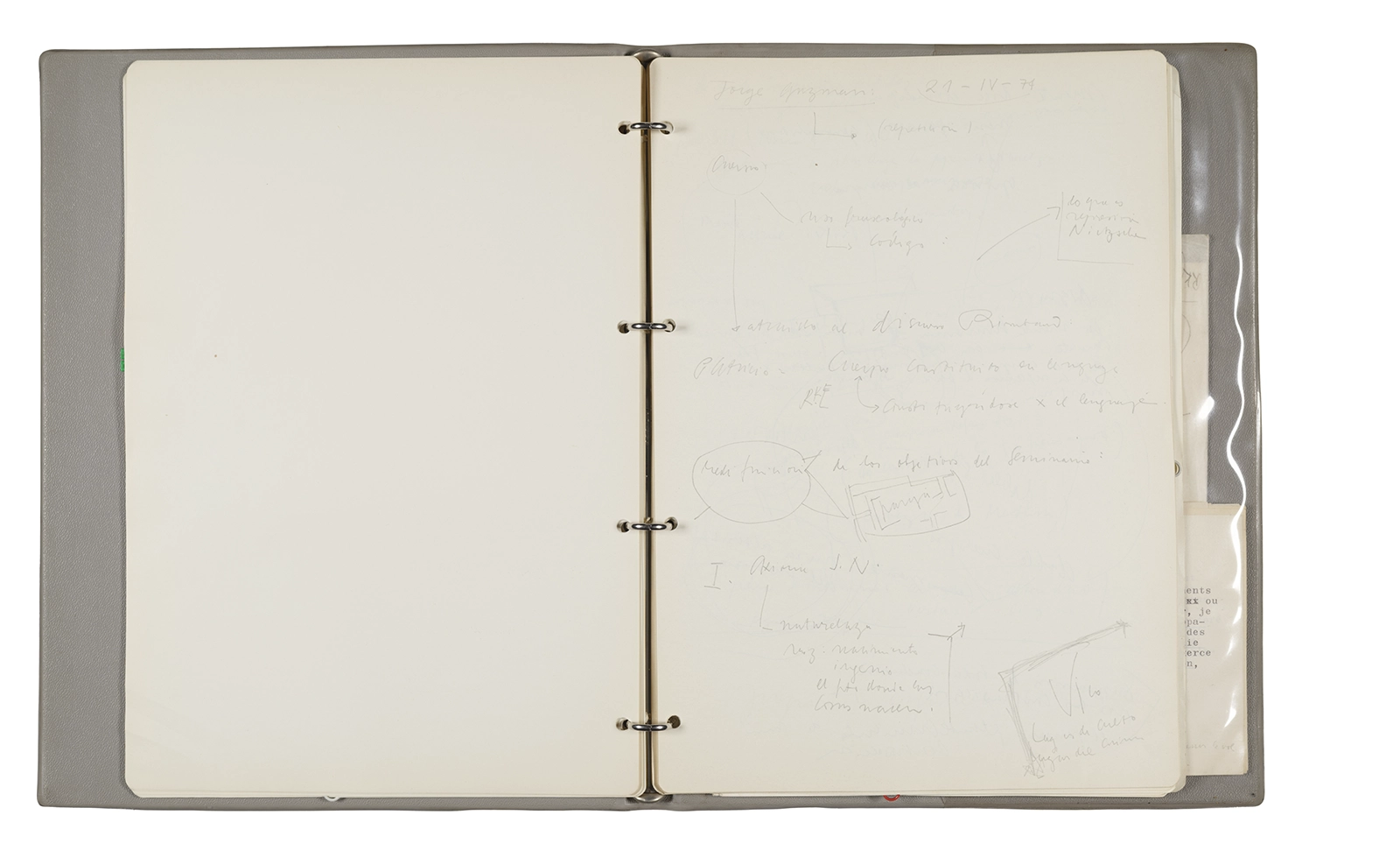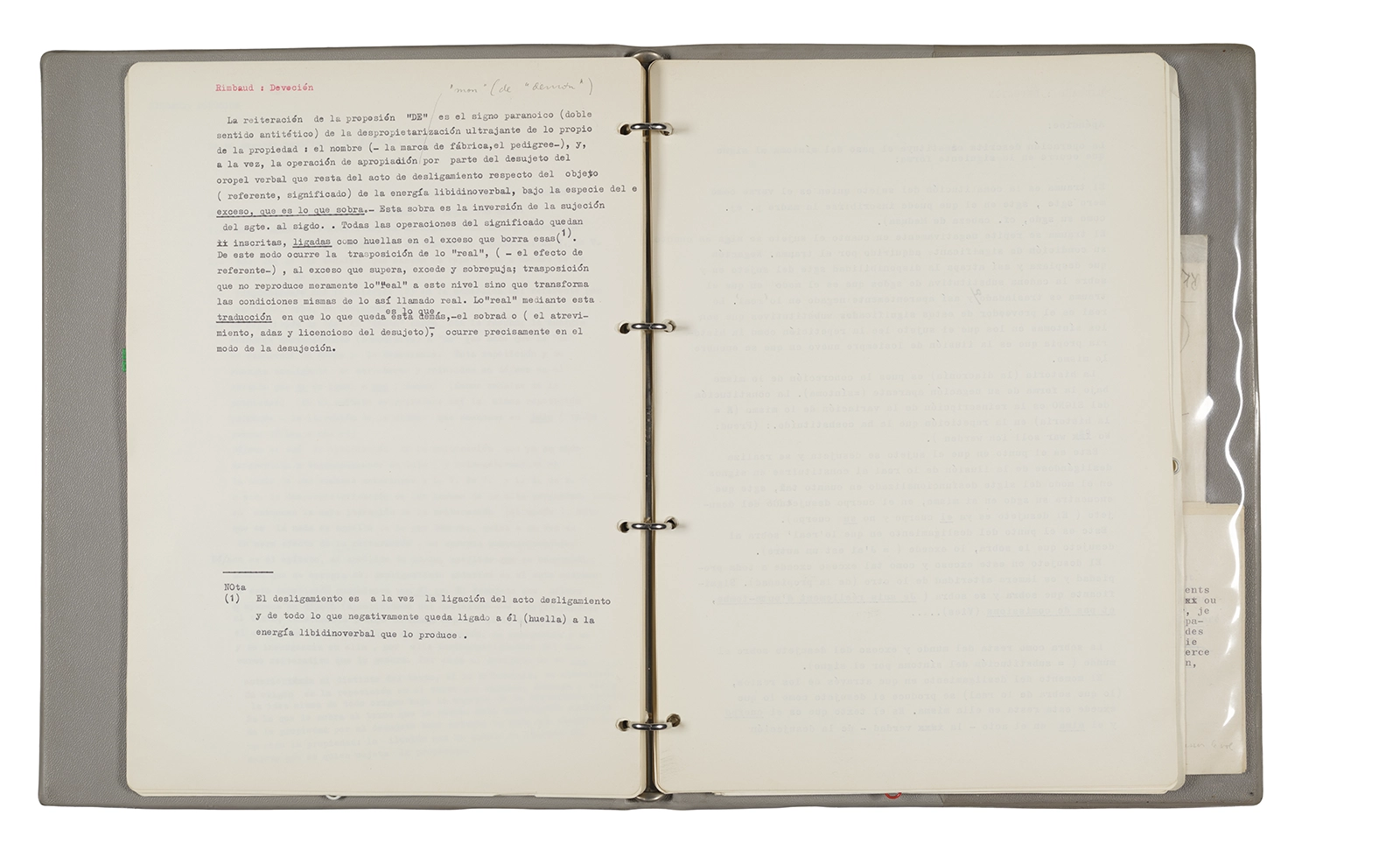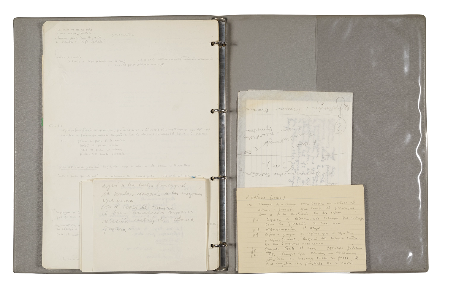 Esta carpeta reúne distintos materiales vinculados al seminario centrado en los textos de Stéphane Mallarmé y en “Iluminaciones” de Arthur Rimbaud que dirigió Ronald Kay junto a Enrique Lihn durante un año y medio, entre 1973 y 1974, en el Departamento de Estudios Humanísticos de la Universidad de Chile. Se incluyen aquí apuntes sobre “Iluminaciones” de Rimbaud, fichas de lectura sobre Mallarmé con el título “Propuesta de un modelo de interlección de la sintaxis en la prosa -práctica teorica- mallarmeana”, y una lista con grupos de trabajo en los que se dividirían los participantes del seminario, entre ellos, Dimela Eltit, María Eugenia Brito, Juan Balbontín, Rodrigo Cánovas y Carlos Flores. Así mismo, esta carpeta contiene recortes de prensa de la revista “Time”, entre ellos uno que contiene la nota “Allende’s Last Day”, publicada en febrero del año 1974, y dos páginas de una revista sin identificar: una con la reproducción de la obra “Hervas” de Wolf Vostell, y otra con una foto del desierto peruano, ambas fechadas en 1975.