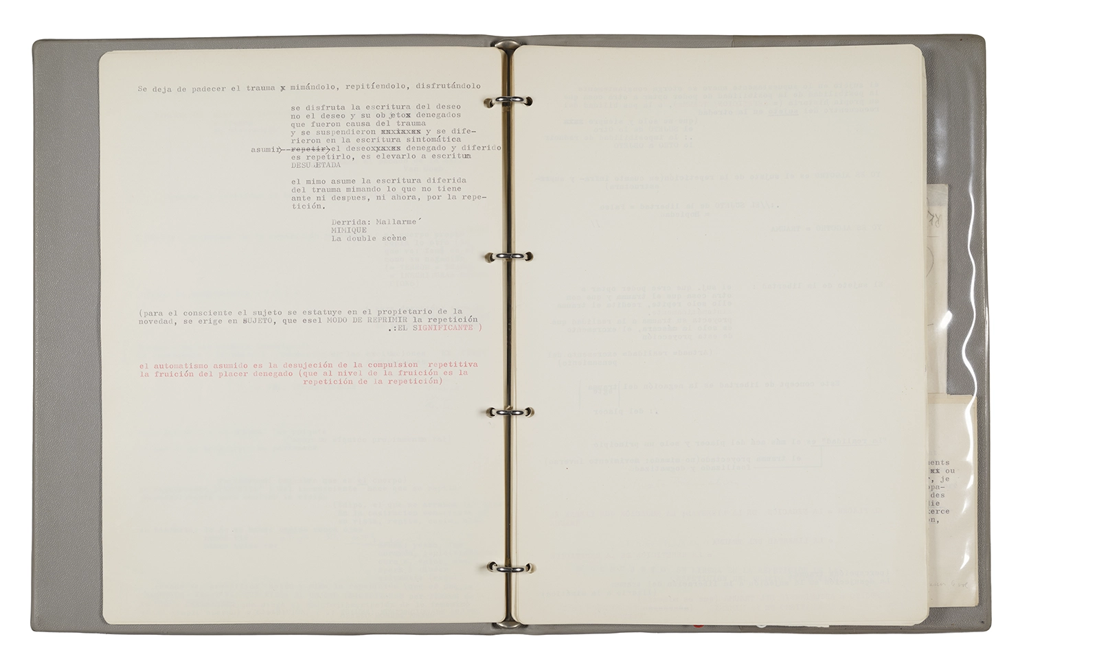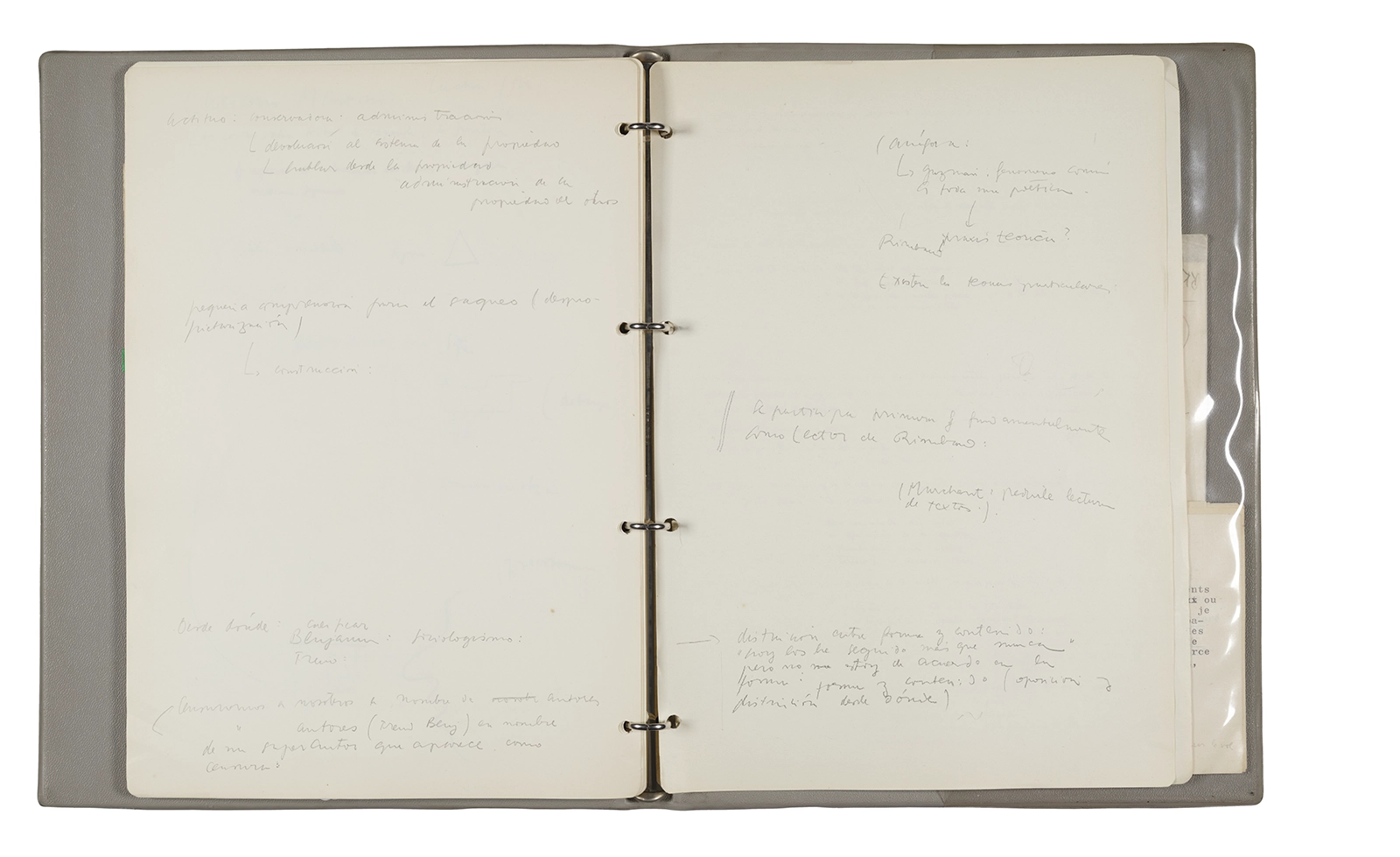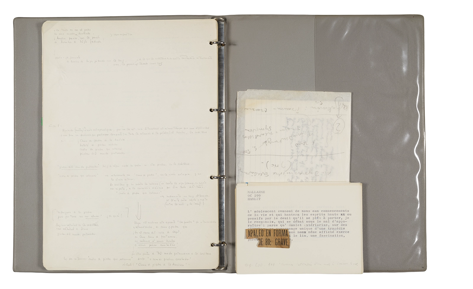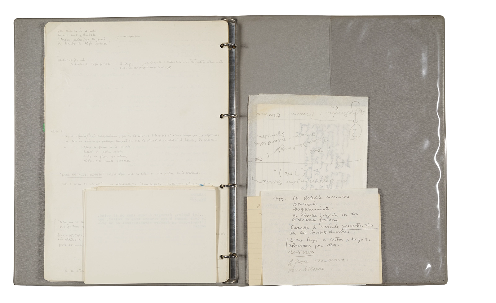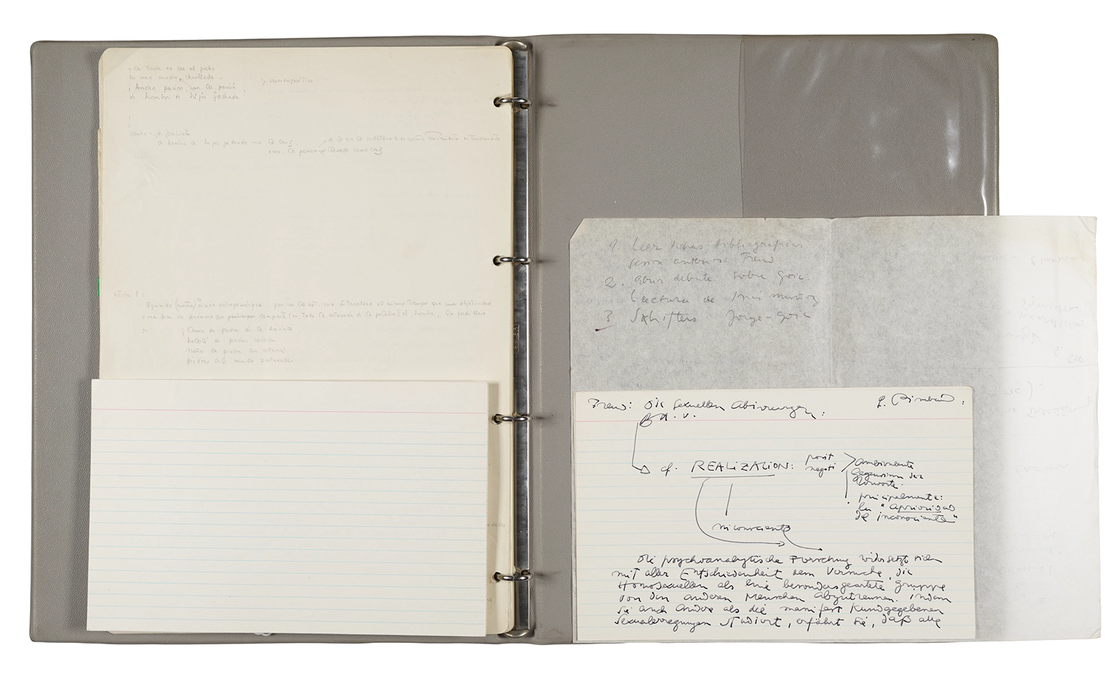 Esta carpeta reúne distintos materiales vinculados al seminario centrado en los textos de Stéphane Mallarmé y en “Iluminaciones” de Arthur Rimbaud que dirigió Ronald Kay junto a Enrique Lihn durante un año y medio, entre 1973 y 1974, en el Departamento de Estudios Humanísticos de la Universidad de Chile. Se incluyen aquí apuntes sobre “Iluminaciones” de Rimbaud, fichas de lectura sobre Mallarmé con el título “Propuesta de un modelo de interlección de la sintaxis en la prosa -práctica teorica- mallarmeana”, y una lista con grupos de trabajo en los que se dividirían los participantes del seminario, entre ellos, Dimela Eltit, María Eugenia Brito, Juan Balbontín, Rodrigo Cánovas y Carlos Flores. Así mismo, esta carpeta contiene recortes de prensa de la revista “Time”, entre ellos uno que contiene la nota “Allende’s Last Day”, publicada en febrero del año 1974, y dos páginas de una revista sin identificar: una con la reproducción de la obra “Hervas” de Wolf Vostell, y otra con una foto del desierto peruano, ambas fechadas en 1975.