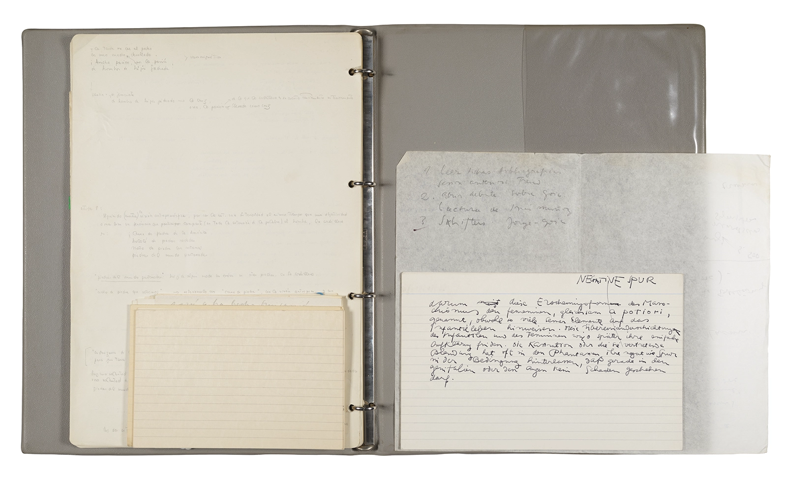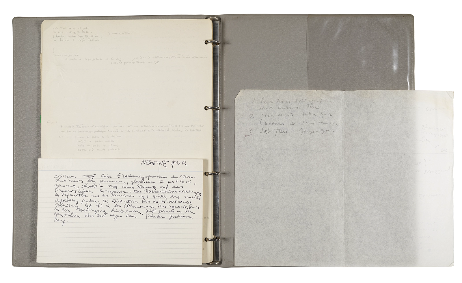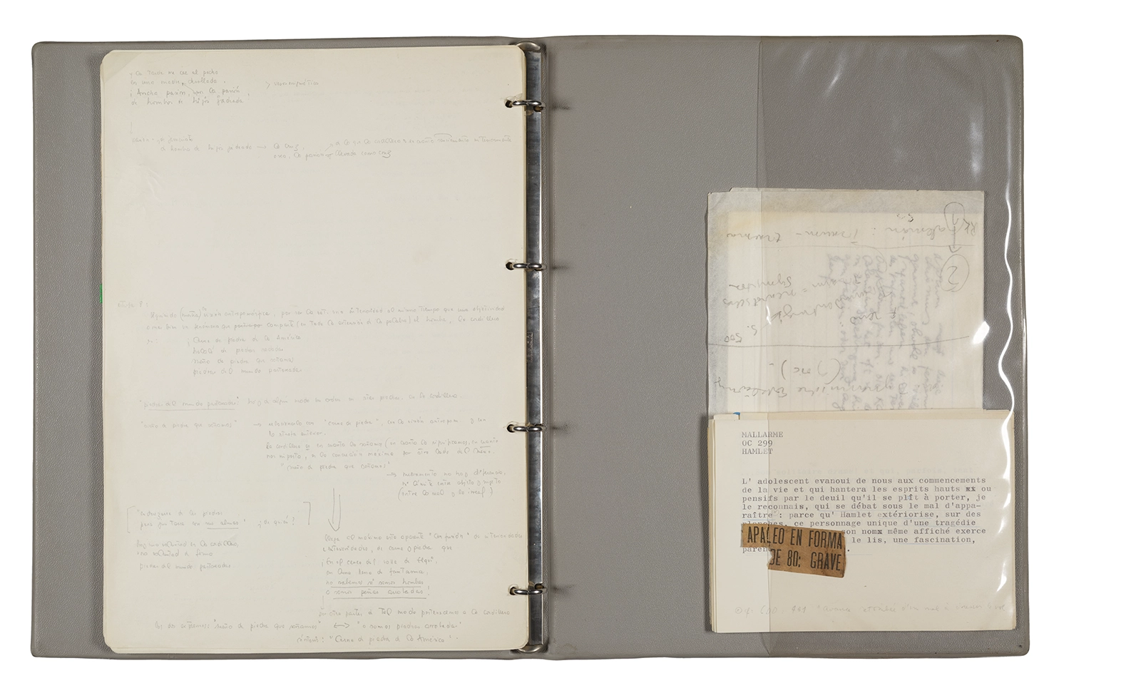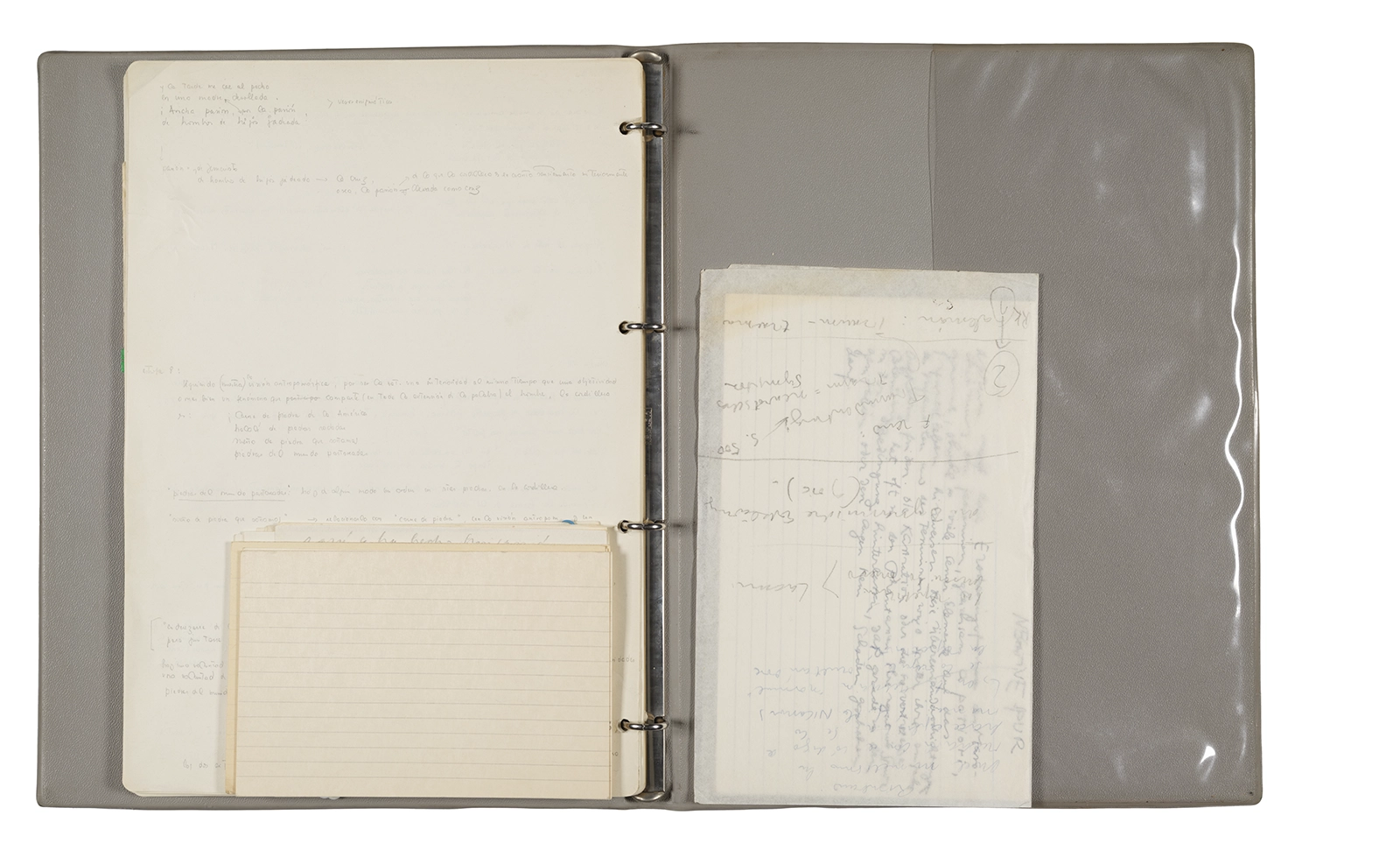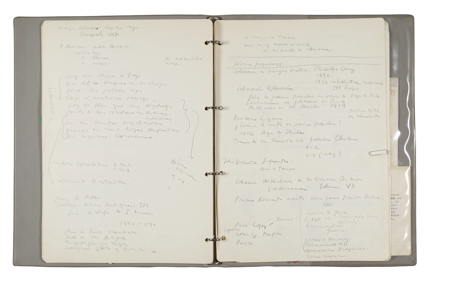 Esta carpeta reúne distintos materiales vinculados al seminario centrado en los textos de Stéphane Mallarmé y en “Iluminaciones” de Arthur Rimbaud que dirigió Ronald Kay junto a Enrique Lihn durante un año y medio, entre 1973 y 1974, en el Departamento de Estudios Humanísticos de la Universidad de Chile. Se incluyen aquí apuntes sobre “Iluminaciones” de Rimbaud, fichas de lectura sobre Mallarmé con el título “Propuesta de un modelo de interlección de la sintaxis en la prosa -práctica teorica- mallarmeana”, y una lista con grupos de trabajo en los que se dividirían los participantes del seminario, entre ellos, Dimela Eltit, María Eugenia Brito, Juan Balbontín, Rodrigo Cánovas y Carlos Flores. Así mismo, esta carpeta contiene recortes de prensa de la revista “Time”, entre ellos uno que contiene la nota “Allende’s Last Day”, publicada en febrero del año 1974, y dos páginas de una revista sin identificar: una con la reproducción de la obra “Hervas” de Wolf Vostell, y otra con una foto del desierto peruano, ambas fechadas en 1975.