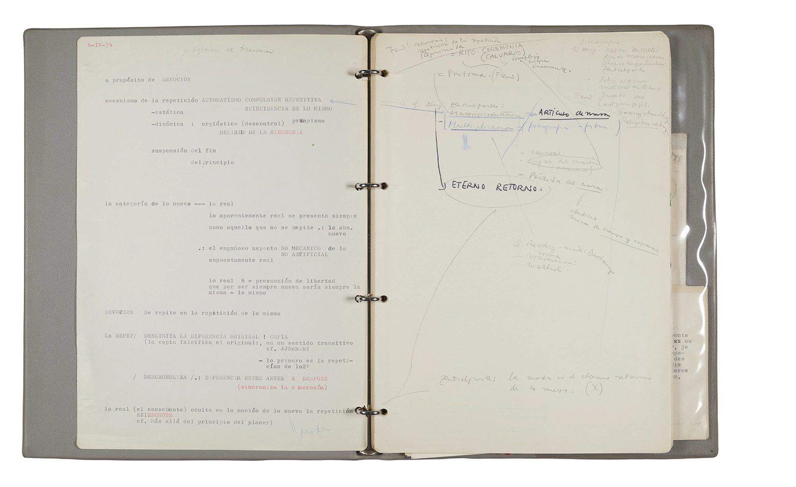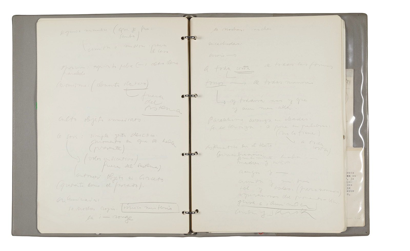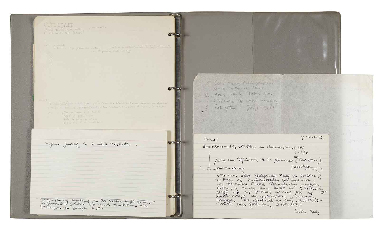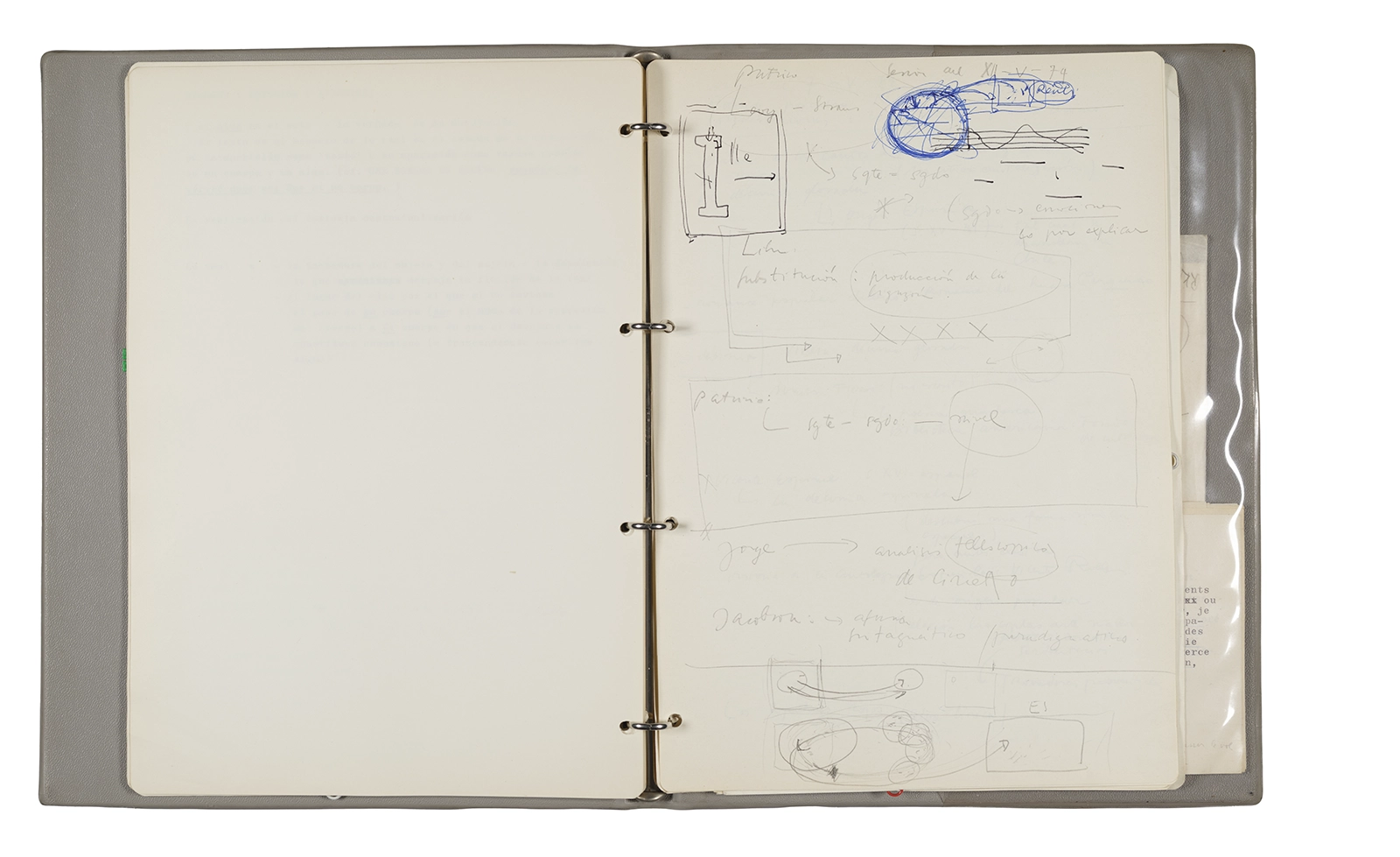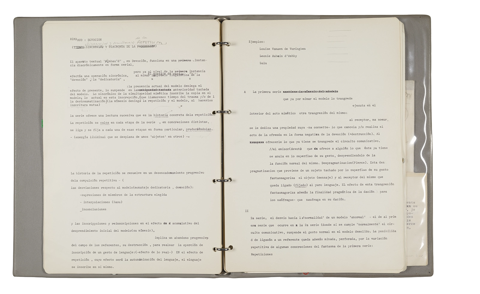 Esta carpeta reúne distintos materiales vinculados al seminario centrado en los textos de Stéphane Mallarmé y en “Iluminaciones” de Arthur Rimbaud que dirigió Ronald Kay junto a Enrique Lihn durante un año y medio, entre 1973 y 1974, en el Departamento de Estudios Humanísticos de la Universidad de Chile. Se incluyen aquí apuntes sobre “Iluminaciones” de Rimbaud, fichas de lectura sobre Mallarmé con el título “Propuesta de un modelo de interlección de la sintaxis en la prosa -práctica teorica- mallarmeana”, y una lista con grupos de trabajo en los que se dividirían los participantes del seminario, entre ellos, Dimela Eltit, María Eugenia Brito, Juan Balbontín, Rodrigo Cánovas y Carlos Flores. Así mismo, esta carpeta contiene recortes de prensa de la revista “Time”, entre ellos uno que contiene la nota “Allende’s Last Day”, publicada en febrero del año 1974, y dos páginas de una revista sin identificar: una con la reproducción de la obra “Hervas” de Wolf Vostell, y otra con una foto del desierto peruano, ambas fechadas en 1975.