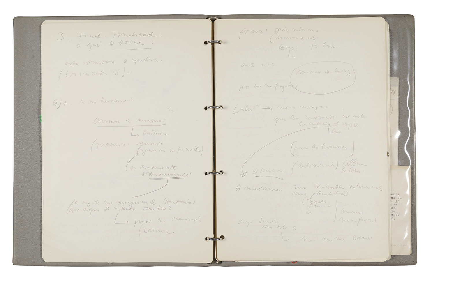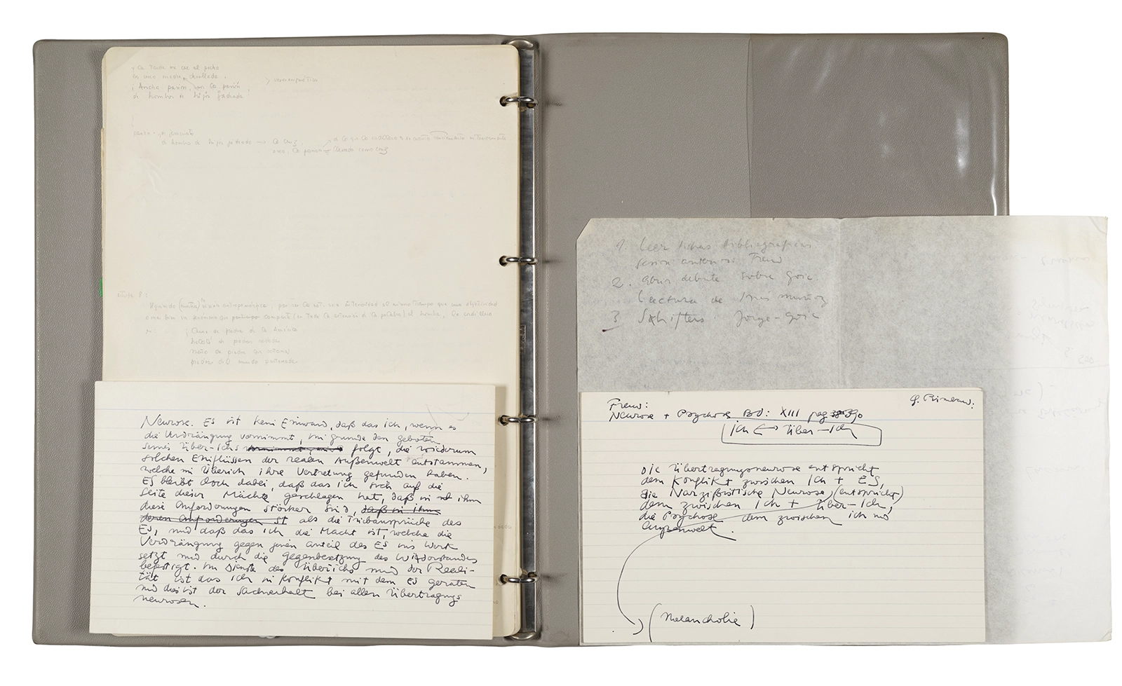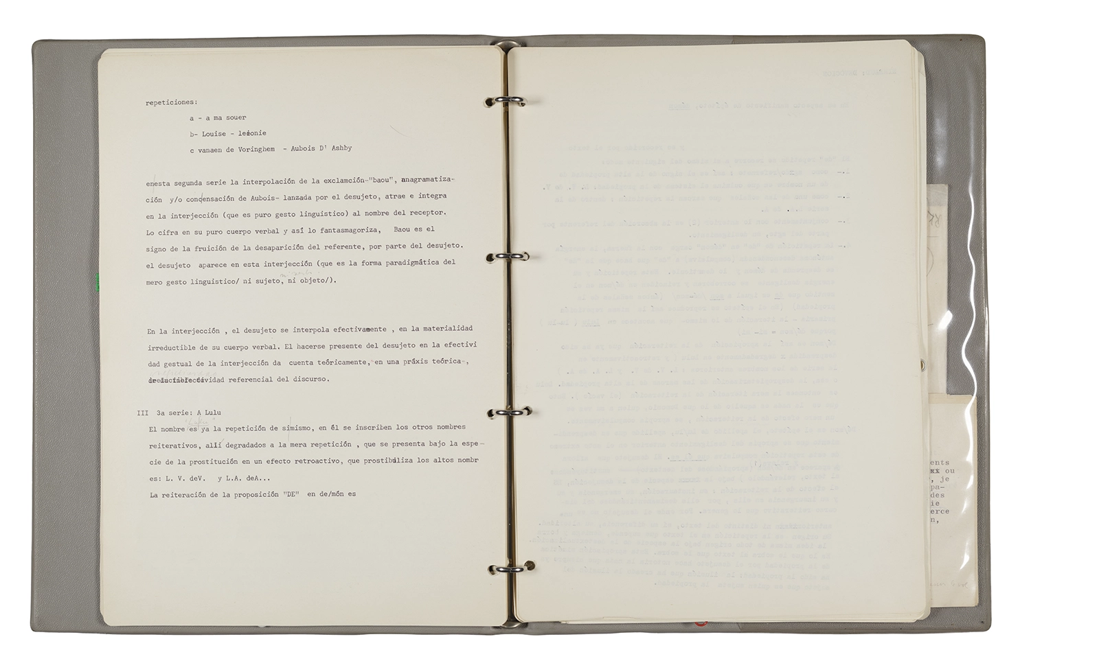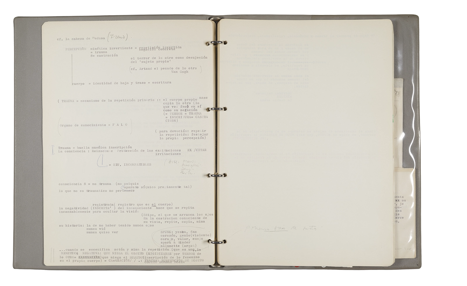 Esta carpeta reúne distintos materiales vinculados al seminario centrado en los textos de Stéphane Mallarmé y en “Iluminaciones” de Arthur Rimbaud que dirigió Ronald Kay junto a Enrique Lihn durante un año y medio, entre 1973 y 1974, en el Departamento de Estudios Humanísticos de la Universidad de Chile. Se incluyen aquí apuntes sobre “Iluminaciones” de Rimbaud, fichas de lectura sobre Mallarmé con el título “Propuesta de un modelo de interlección de la sintaxis en la prosa -práctica teorica- mallarmeana”, y una lista con grupos de trabajo en los que se dividirían los participantes del seminario, entre ellos, Dimela Eltit, María Eugenia Brito, Juan Balbontín, Rodrigo Cánovas y Carlos Flores. Así mismo, esta carpeta contiene recortes de prensa de la revista “Time”, entre ellos uno que contiene la nota “Allende’s Last Day”, publicada en febrero del año 1974, y dos páginas de una revista sin identificar: una con la reproducción de la obra “Hervas” de Wolf Vostell, y otra con una foto del desierto peruano, ambas fechadas en 1975.