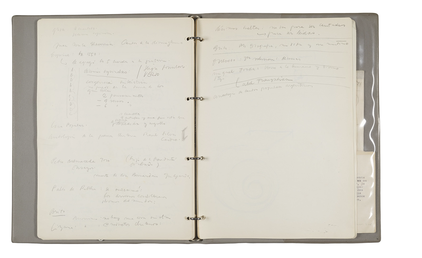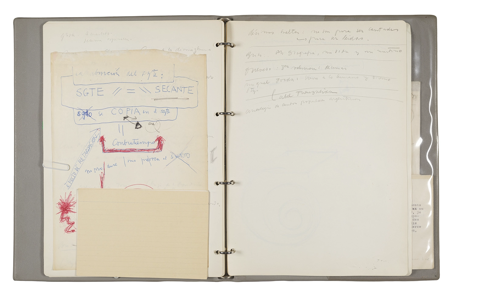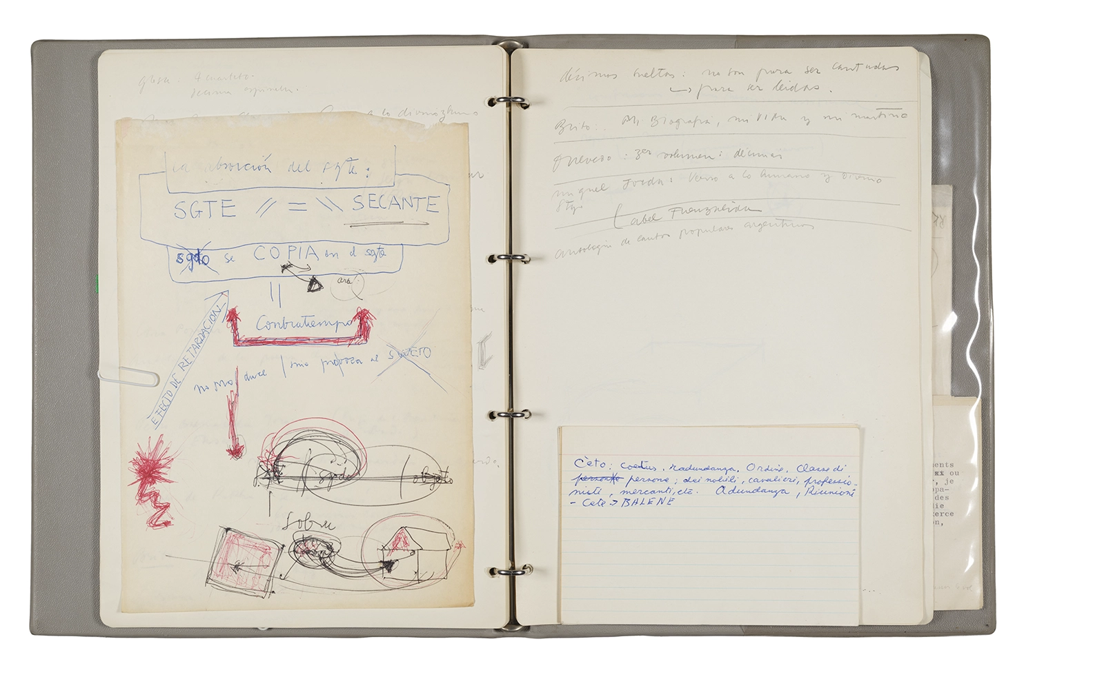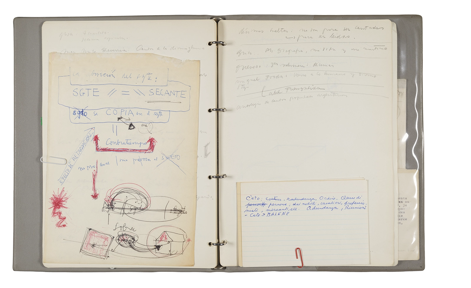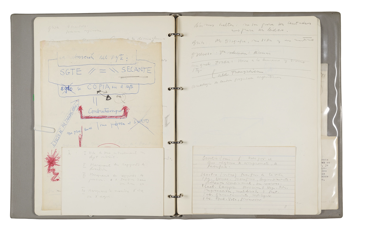 Carpeta material Seminario Rimbaud: apuntes, lista grupos de trabajo y recortes de revista.