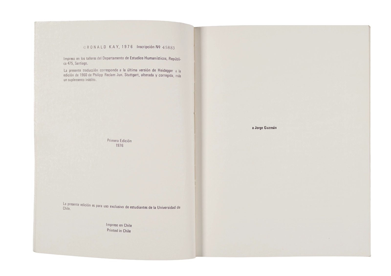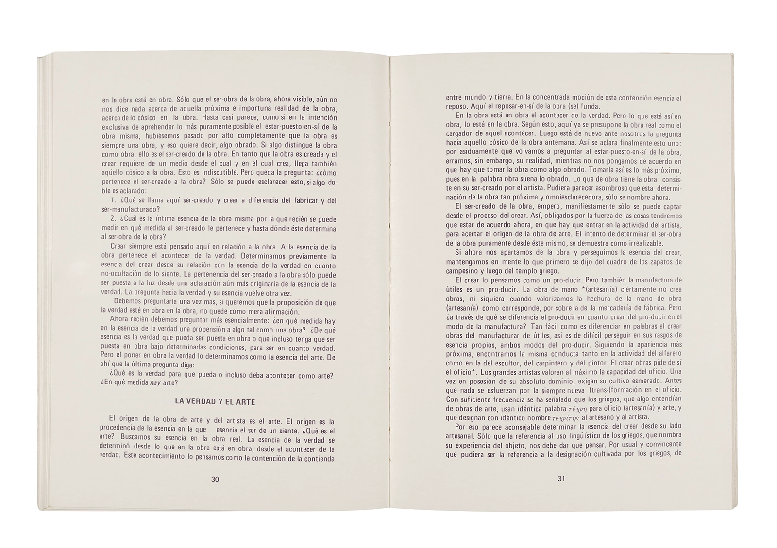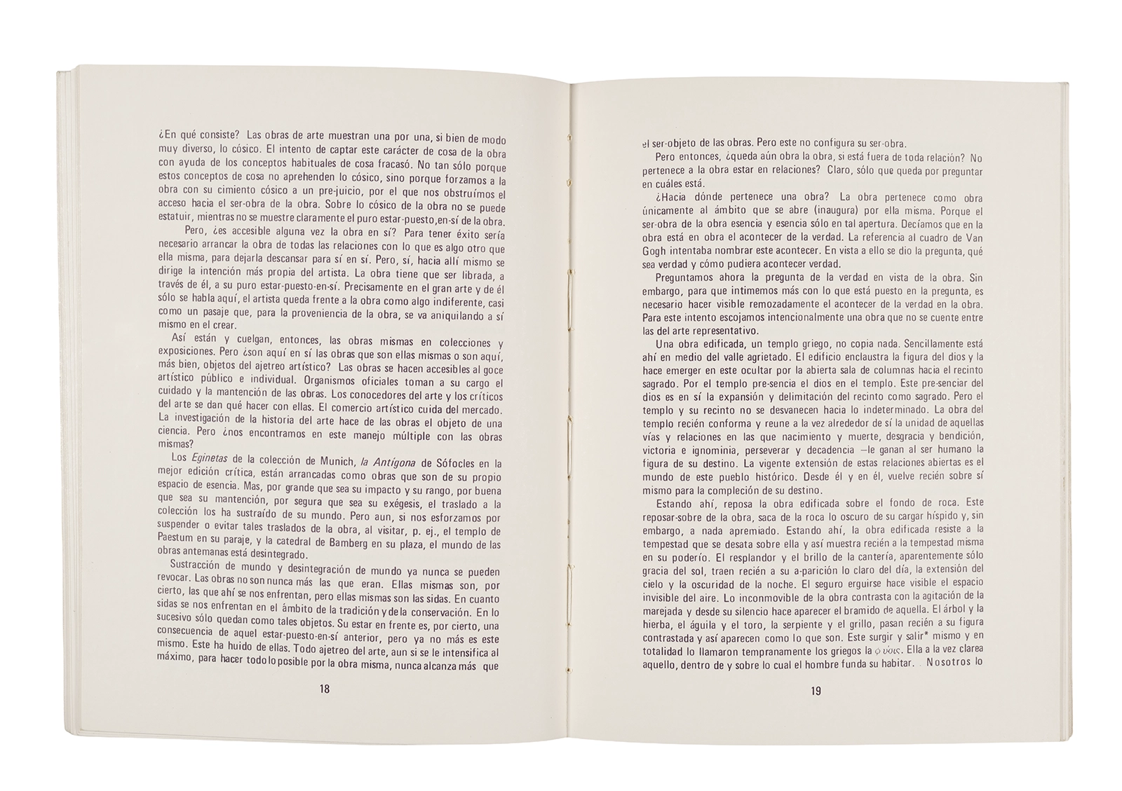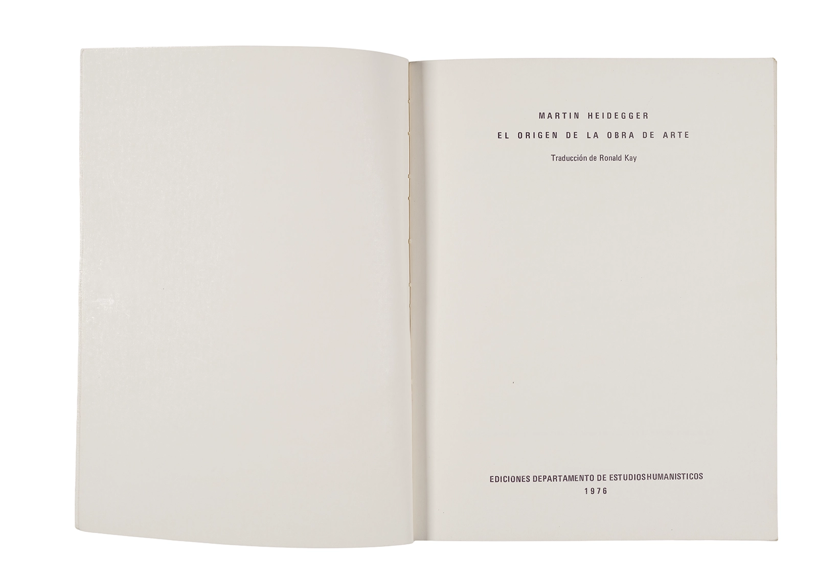 Traducción al español realizada por Ronald Kay del ensayo “El Origen de la Obra de Arte” de Martin Heidegger. Esta fue publicada en 1976 como libro por el Departamento de Estudios Humanísticos, en una edición de uso exclusivo para estudiantes de la Universidad de Chile. Incluye una nota del traductor.