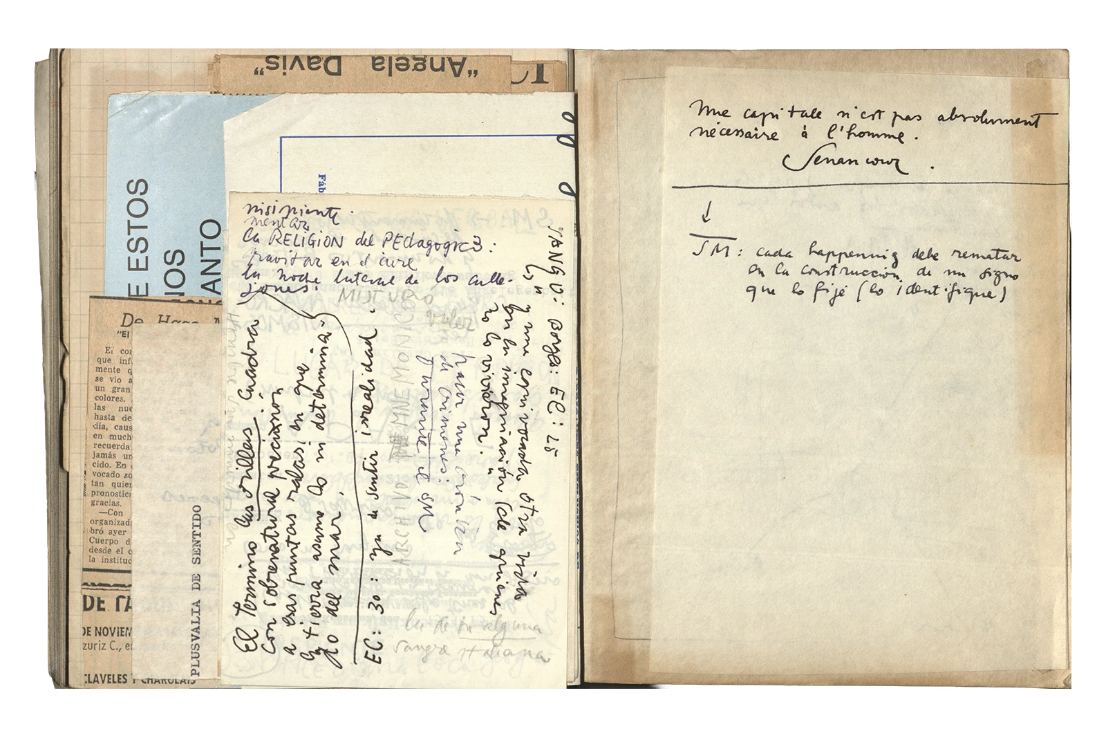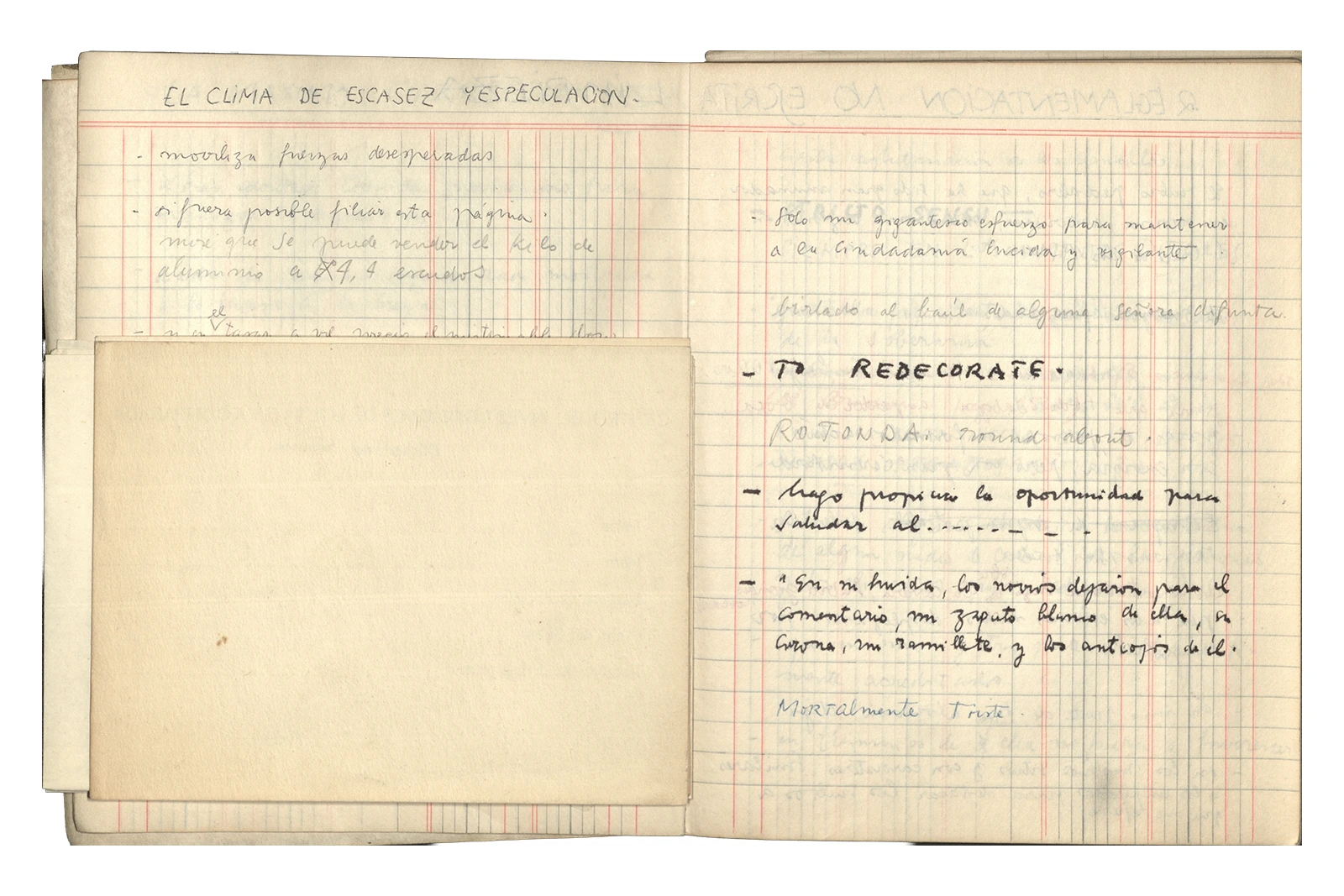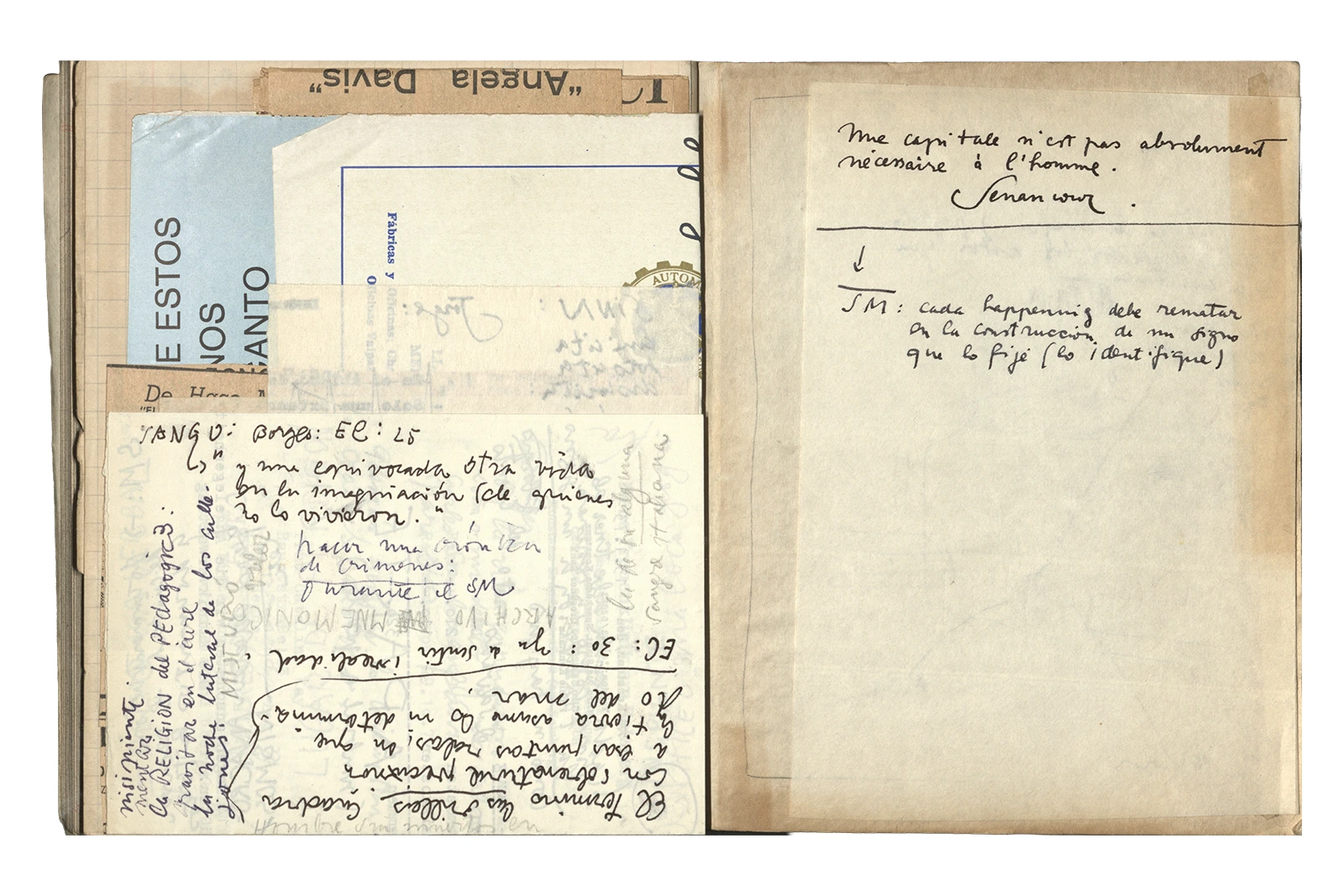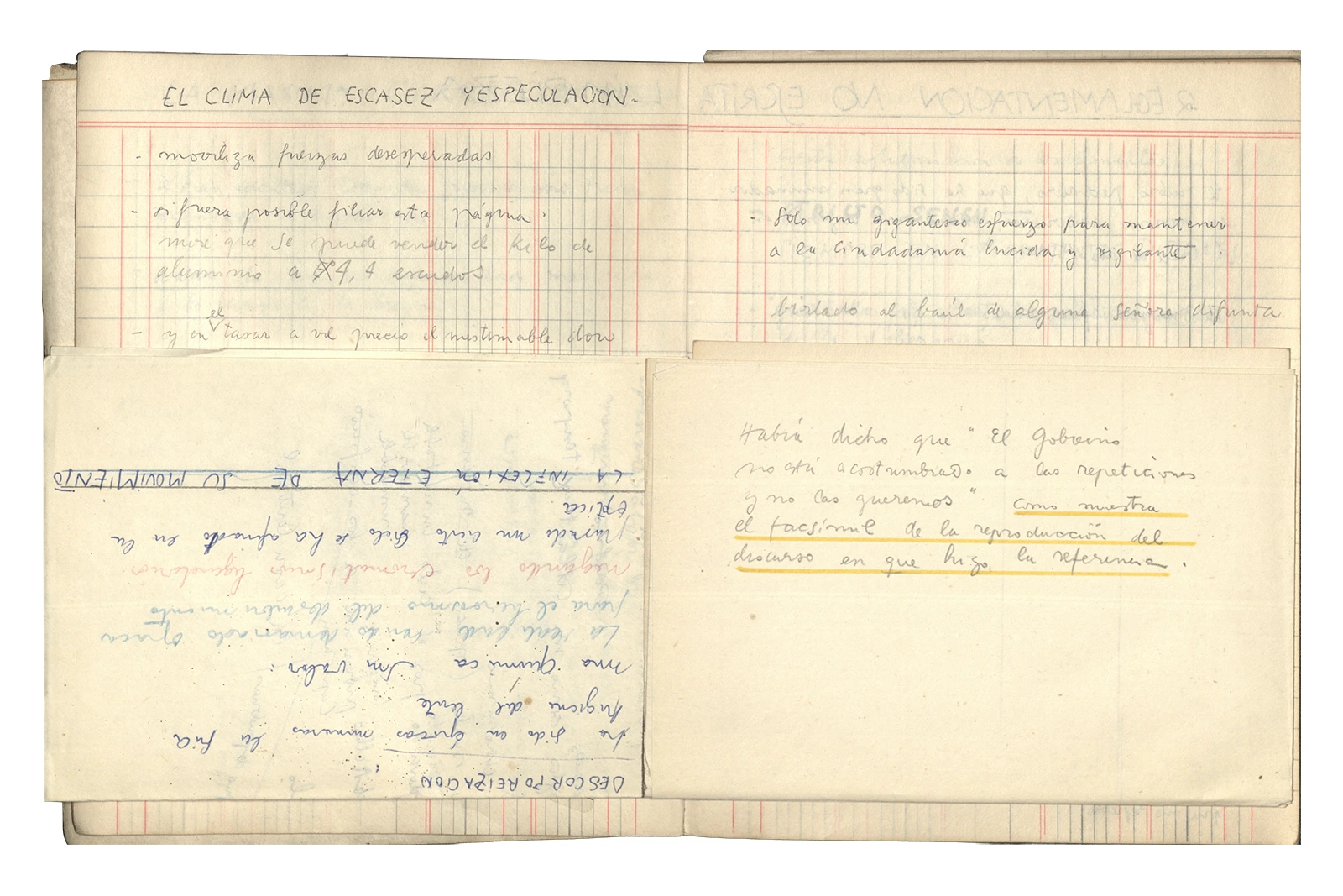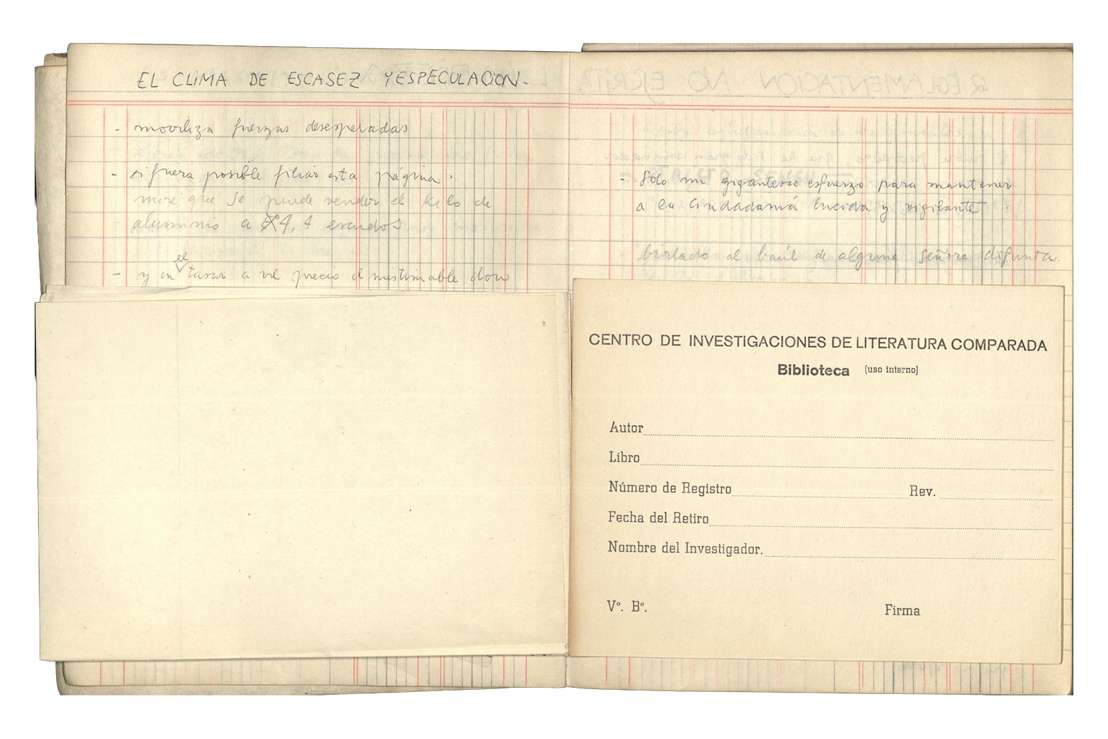 Cuaderno empastado tapa dura, papel mantequilla mecanografiado, notas manuscritas sobre papel en grafito, tinta y pasta, recortes de diarios y revista, venda adhesiva, fichas de biblioteca.