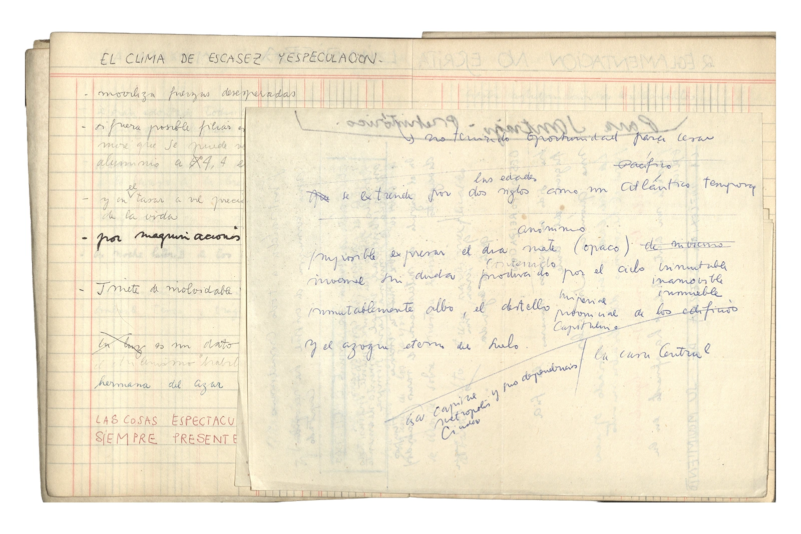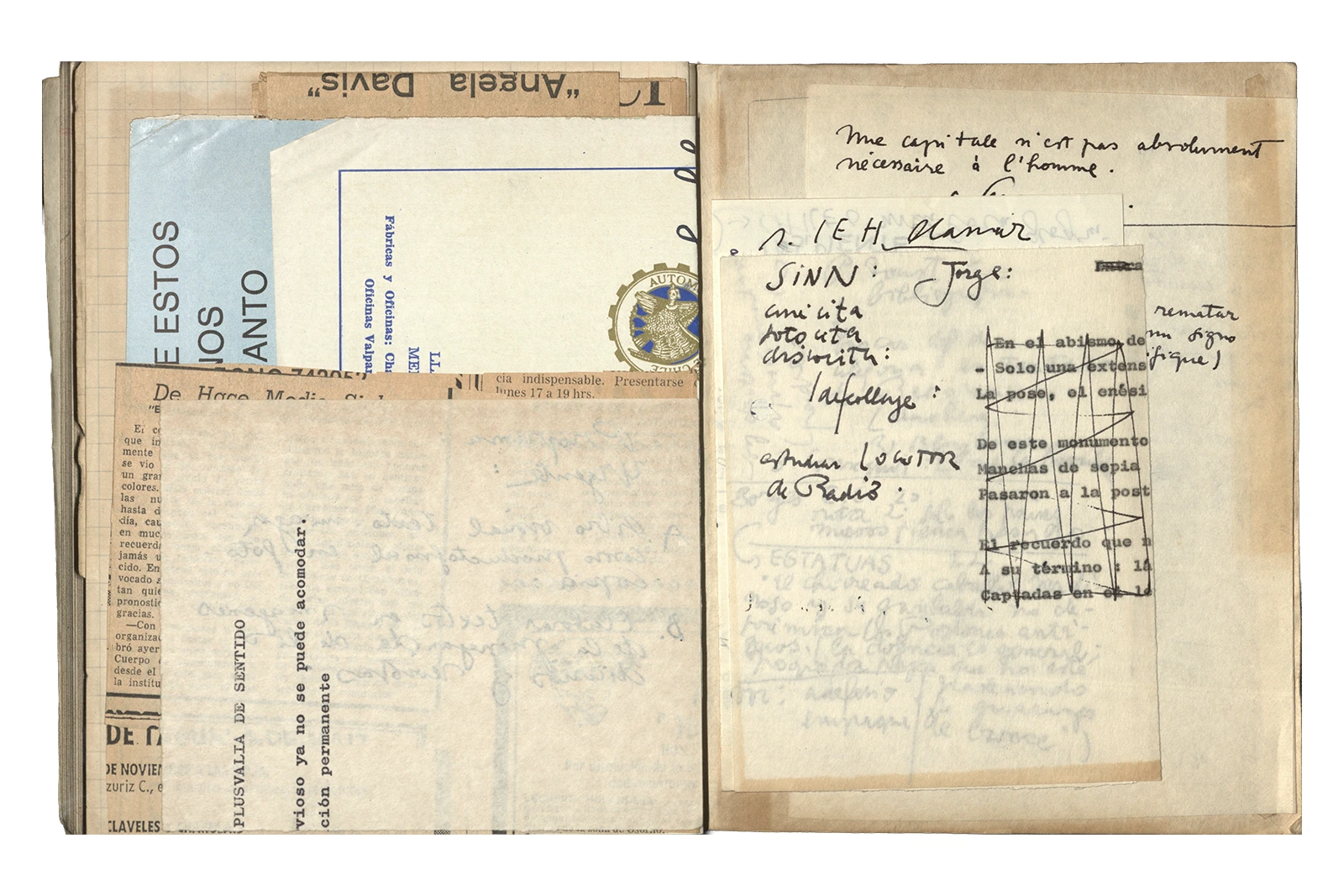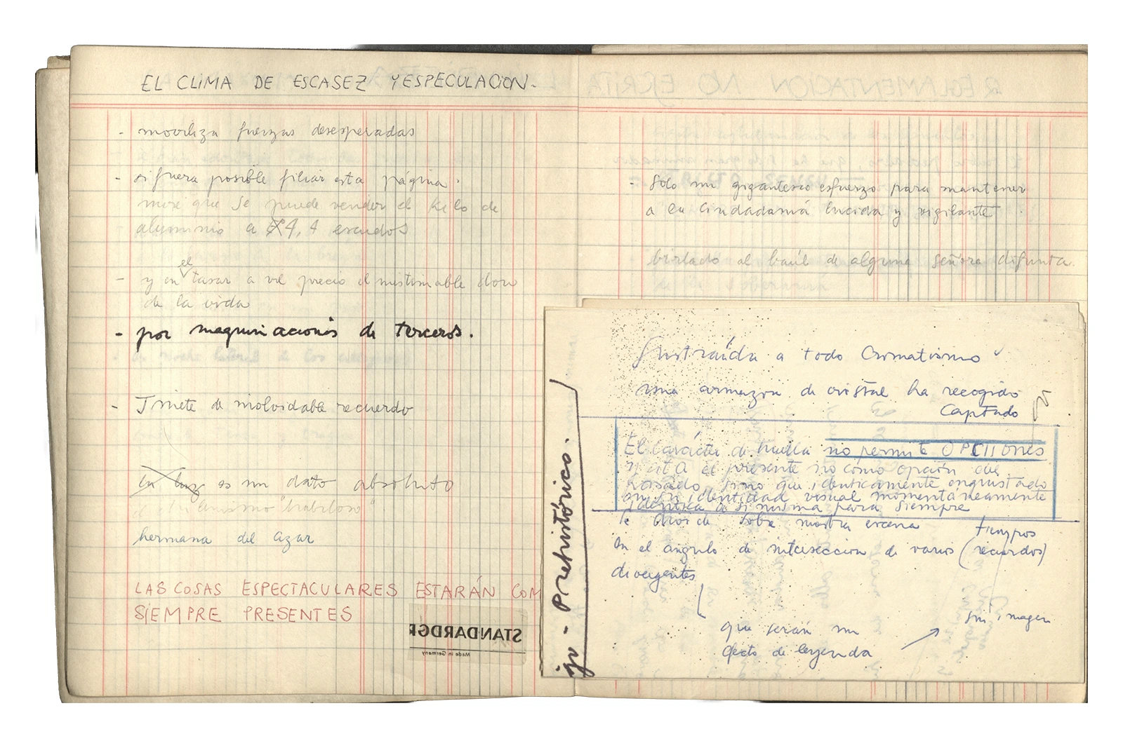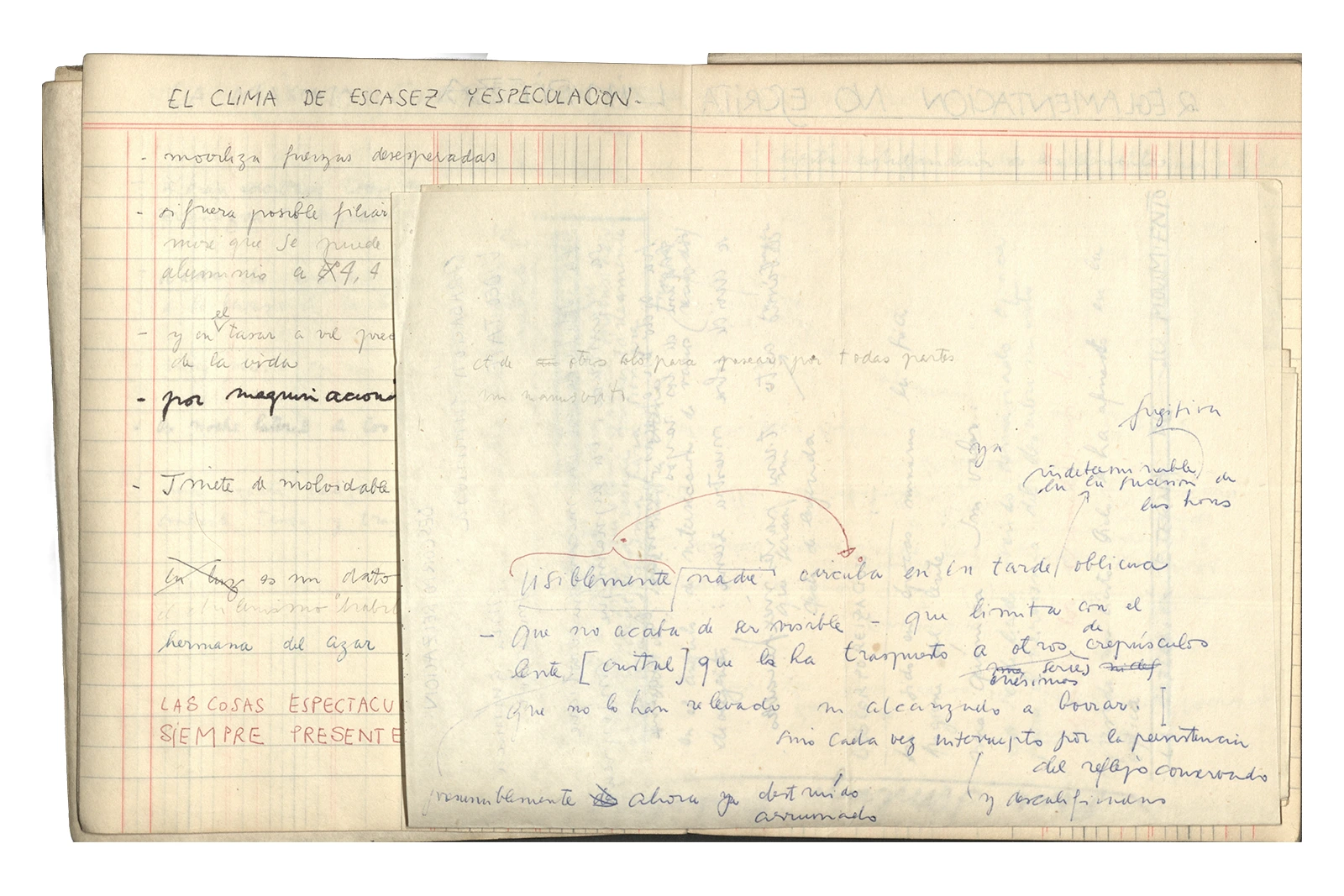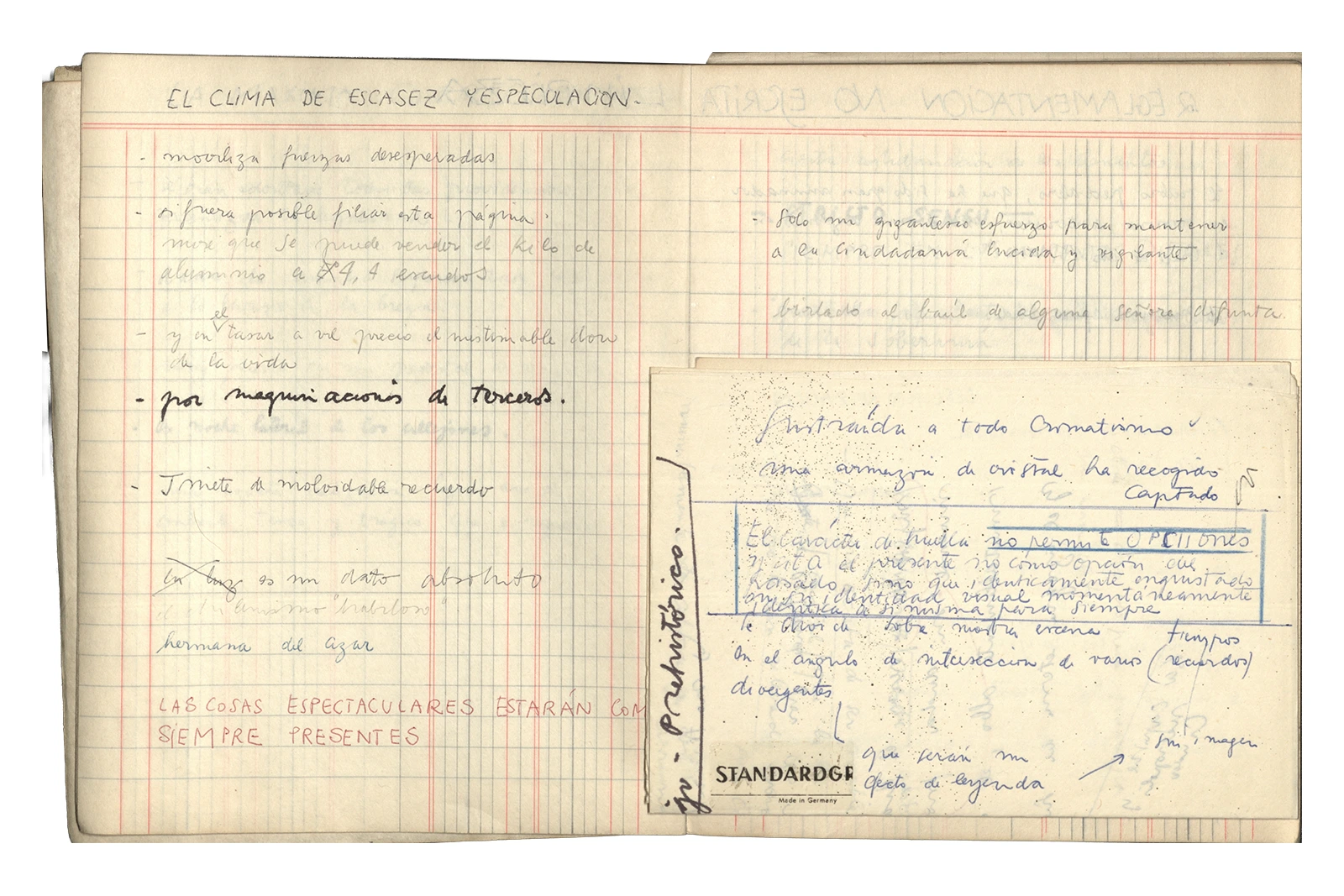 Cuaderno empastado tapa dura, papel mantequilla mecanografiado, notas manuscritas sobre papel en grafito, tinta y pasta, recortes de diarios y revista, venda adhesiva, fichas de biblioteca.
