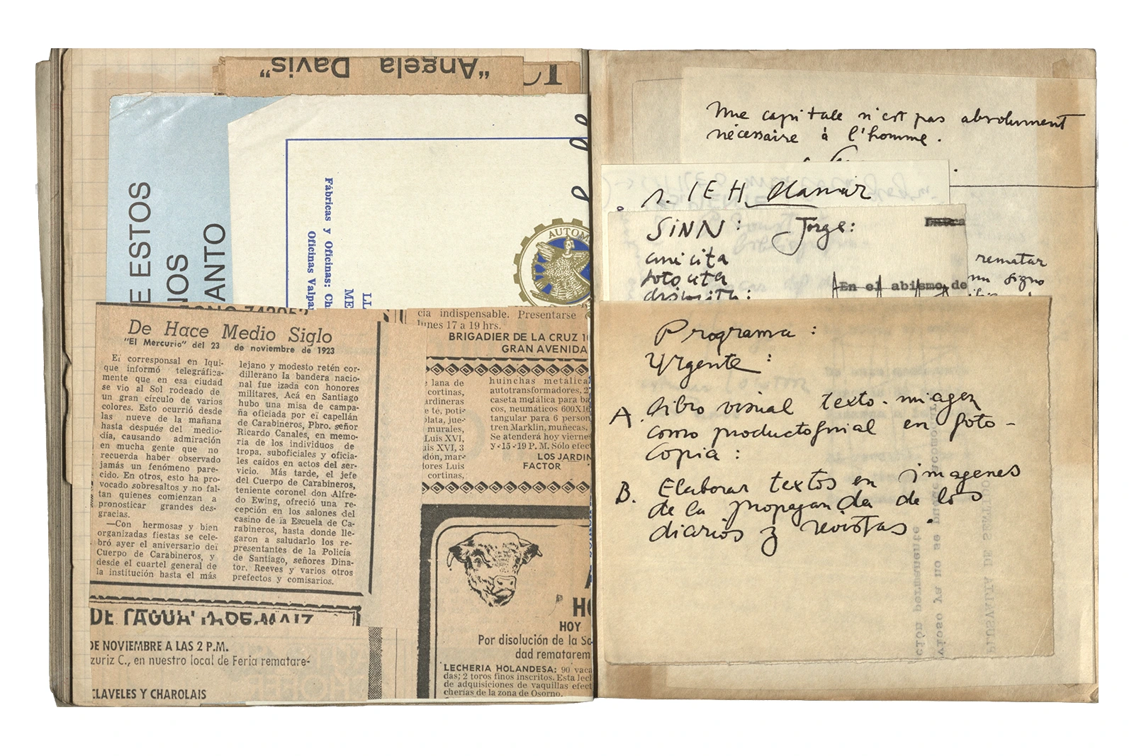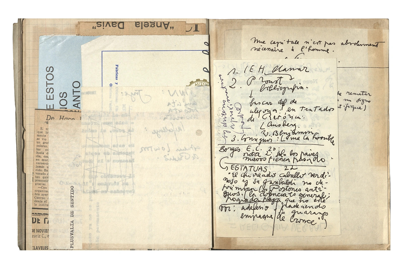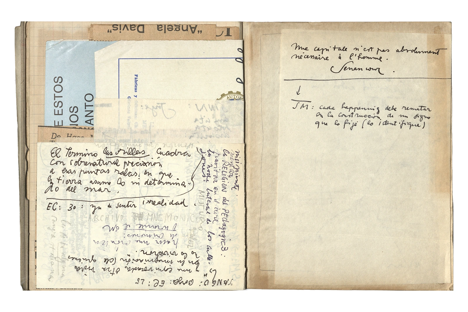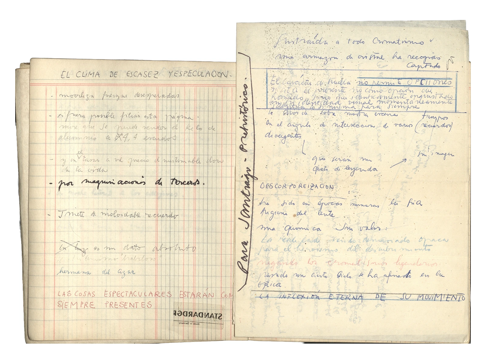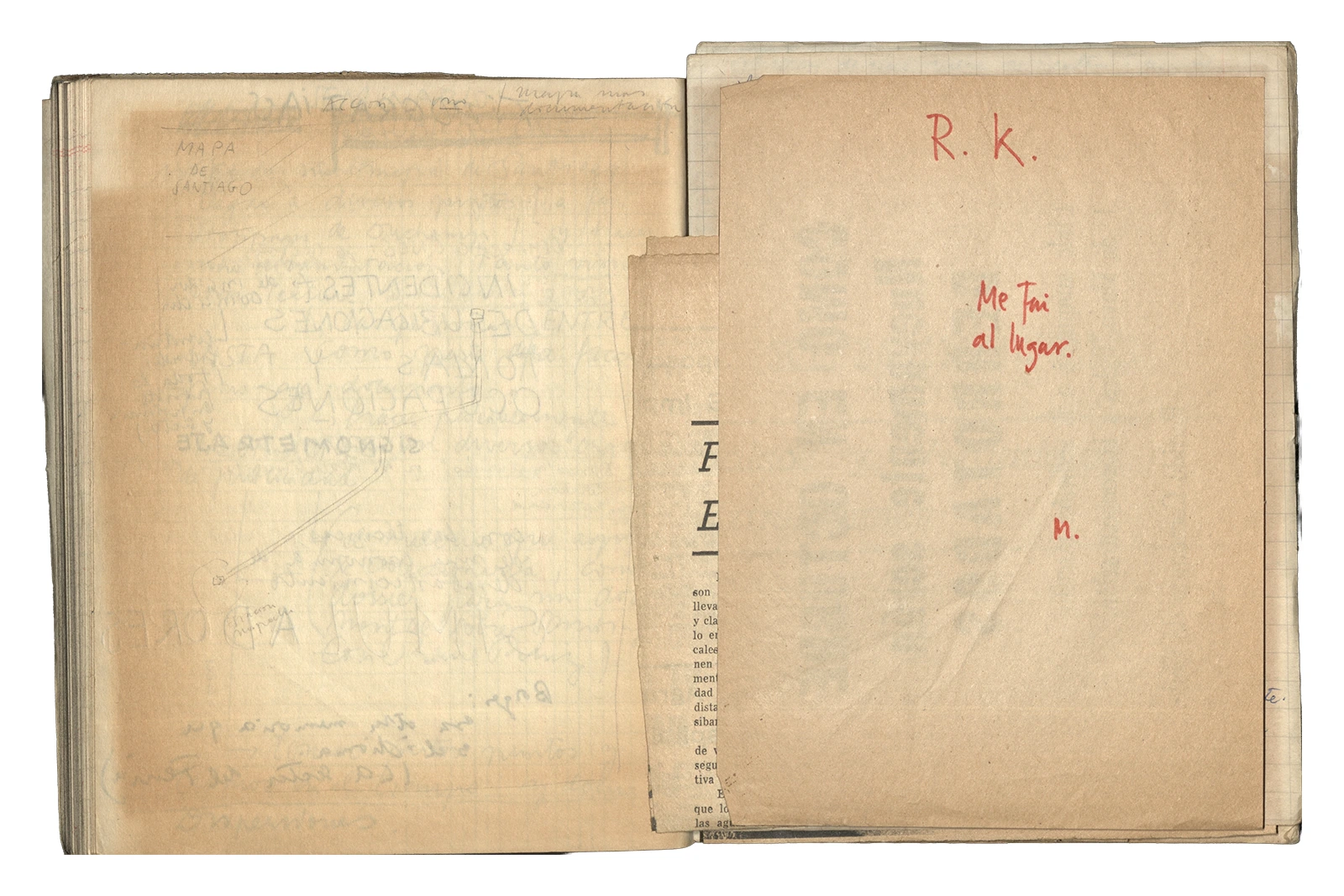 Cuaderno empastado tapa dura, papel mantequilla mecanografiado, notas manuscritas sobre papel en grafito, tinta y pasta, recortes de diarios y revista, venda adhesiva, fichas de biblioteca.