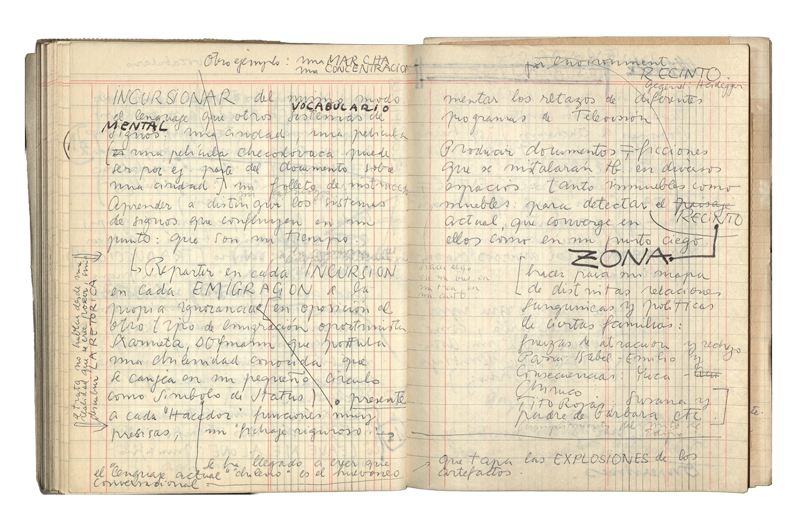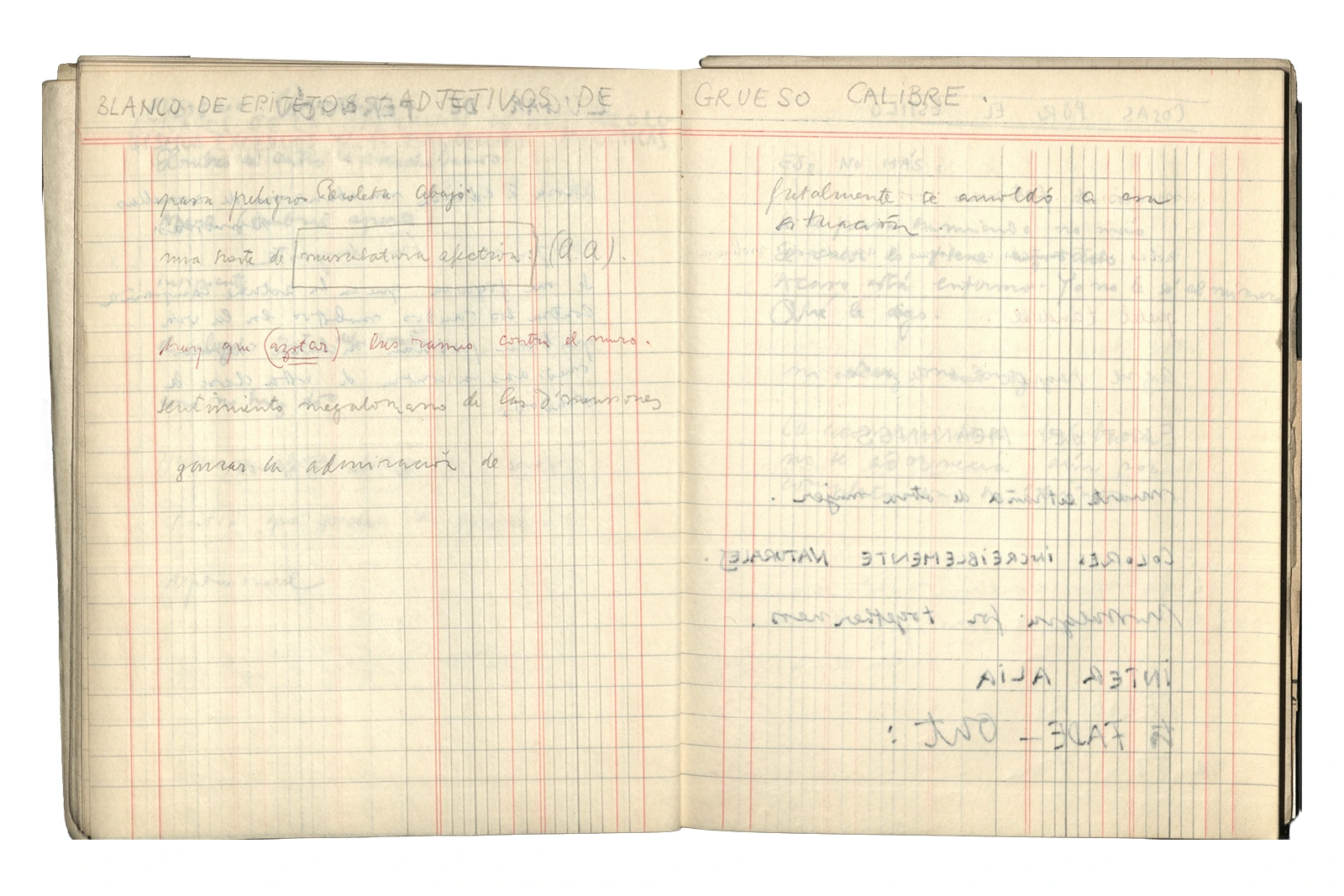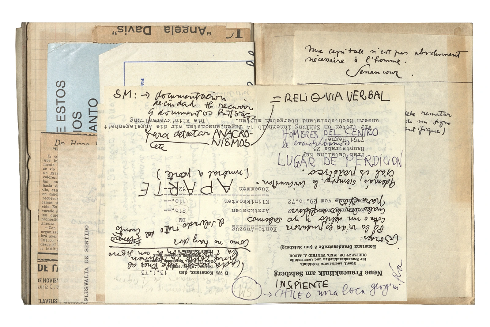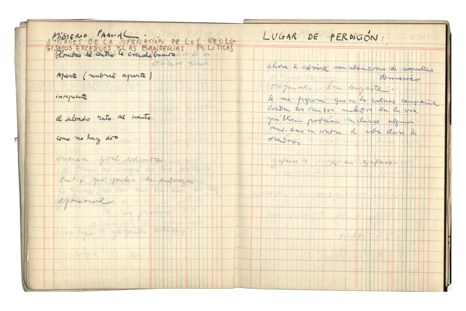 Cuaderno empastado tapa dura, papel mantequilla mecanografiado, notas manuscritas sobre papel en grafito, tinta y pasta, recortes de diarios y revista, venda adhesiva, fichas de biblioteca.