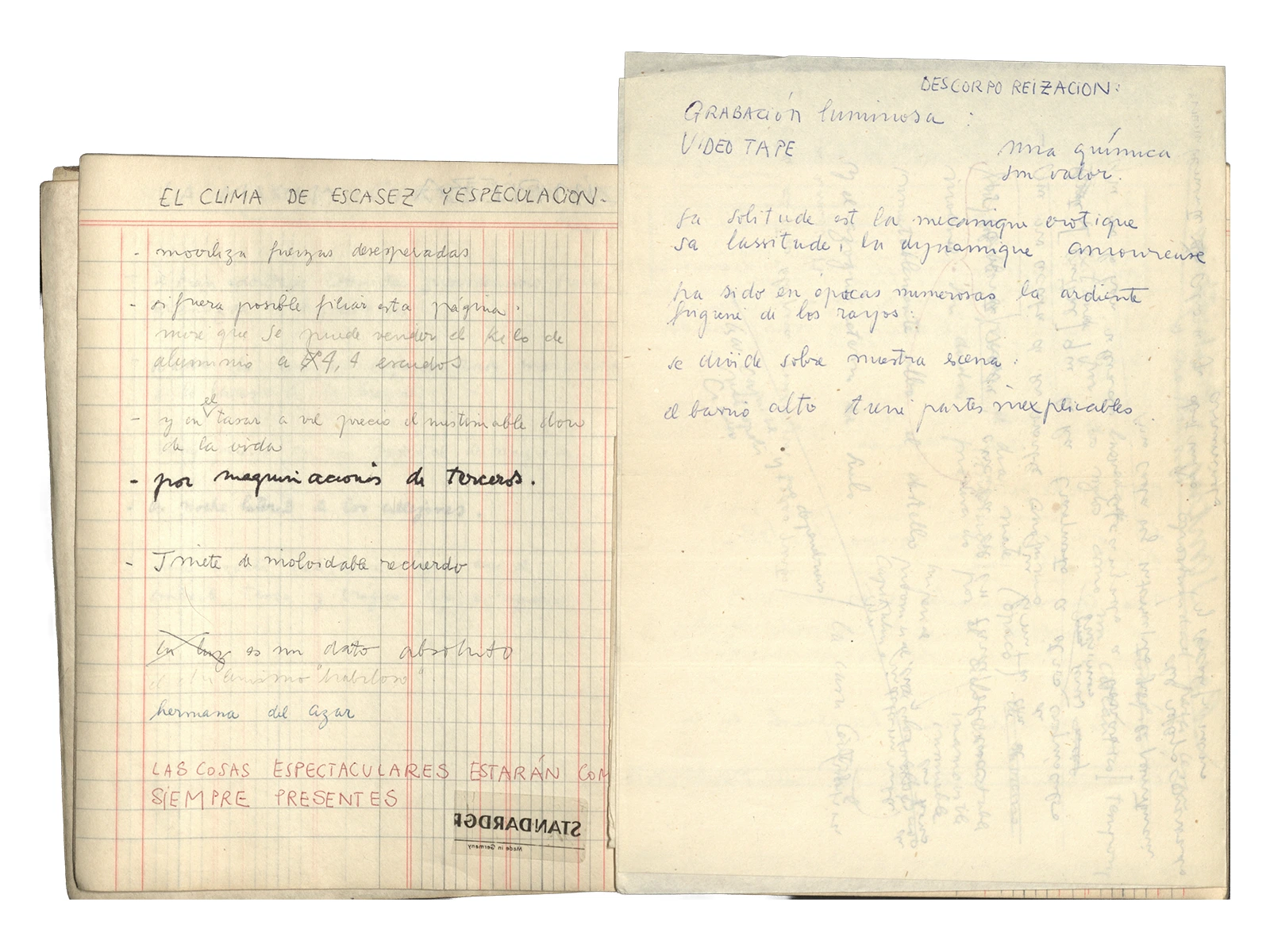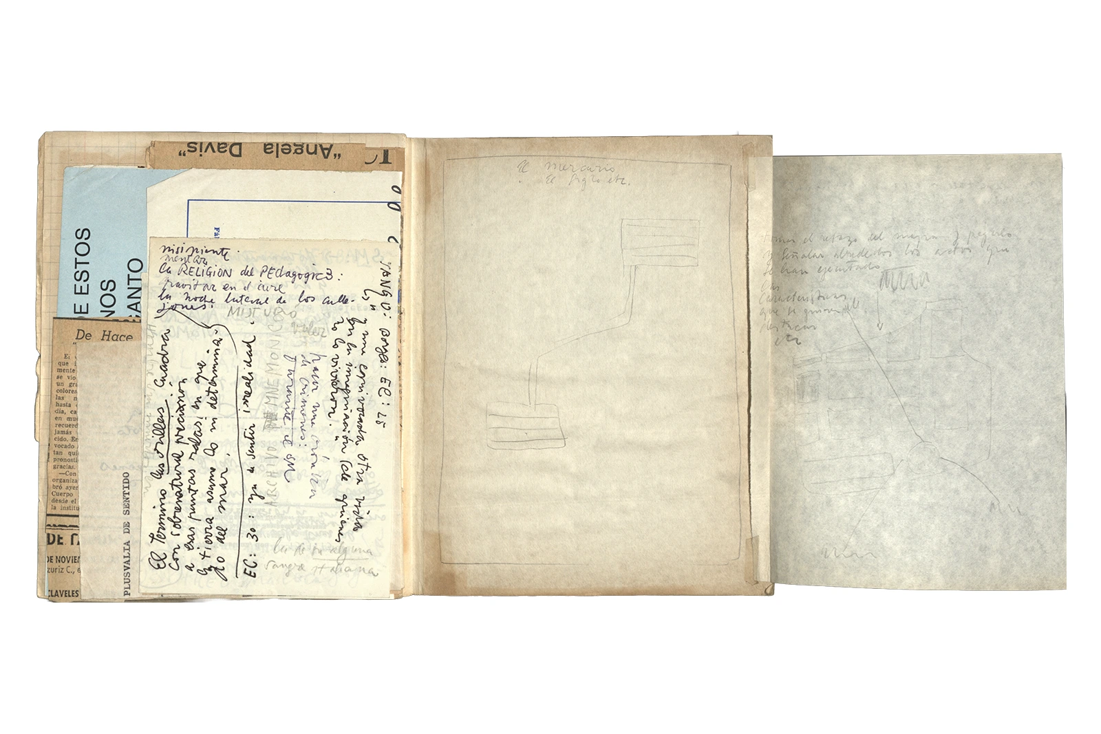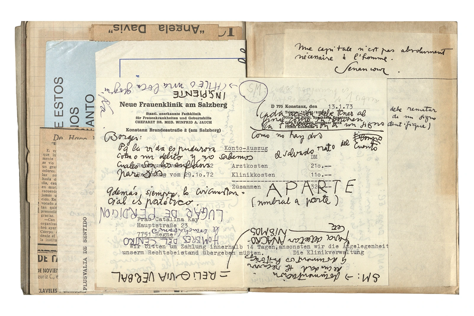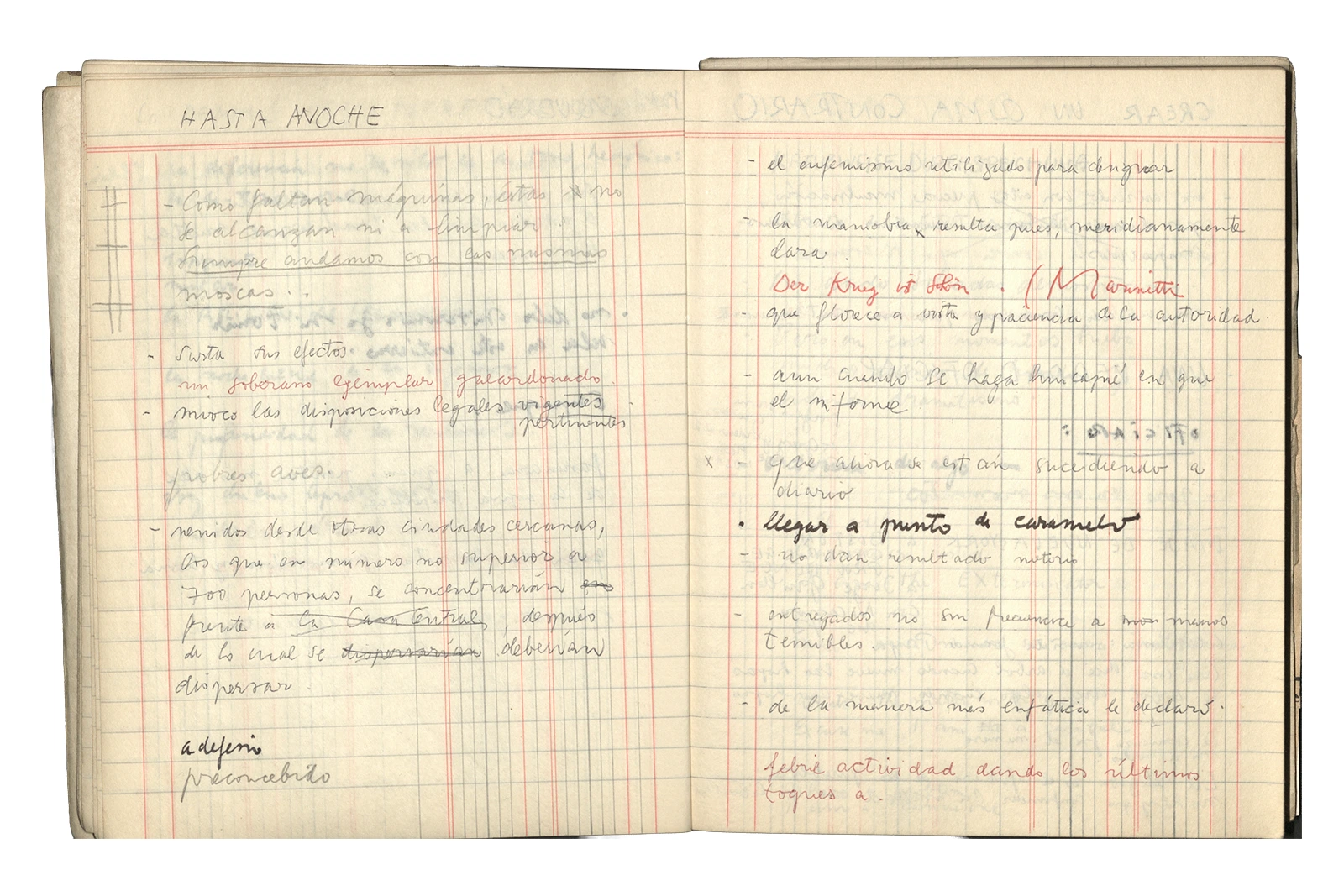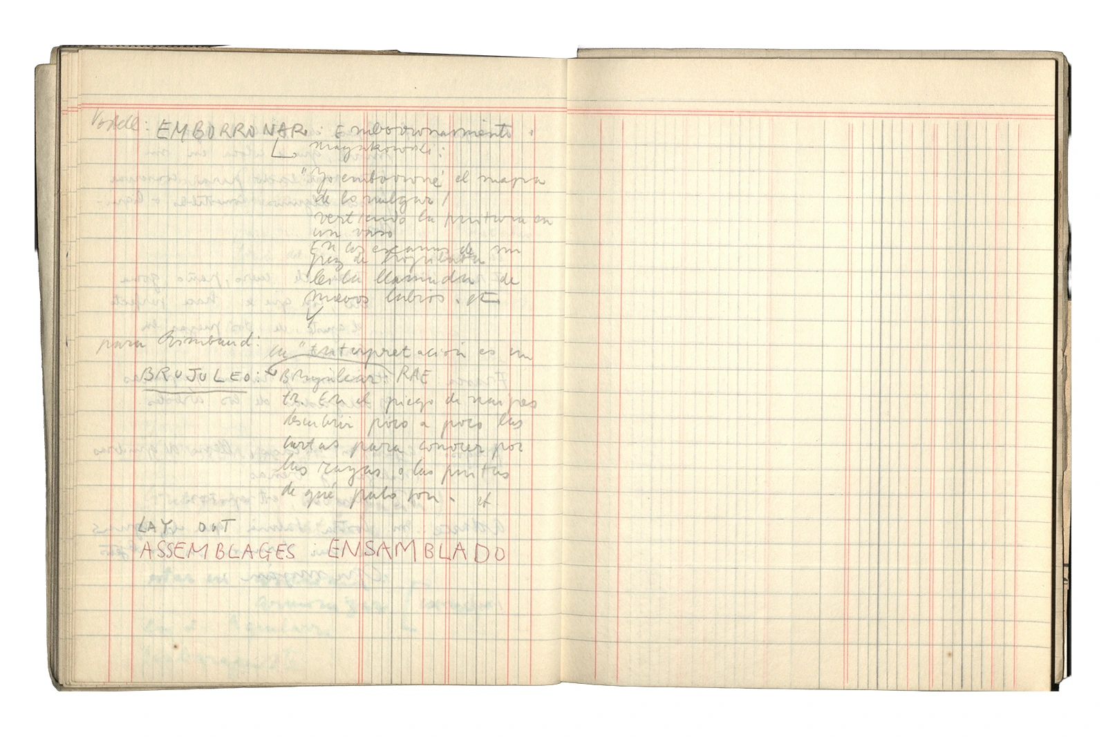 Cuaderno empastado tapa dura, papel mantequilla mecanografiado, notas manuscritas sobre papel en grafito, tinta y pasta, recortes de diarios y revista, venda adhesiva, fichas de biblioteca.