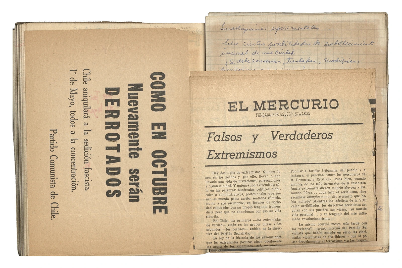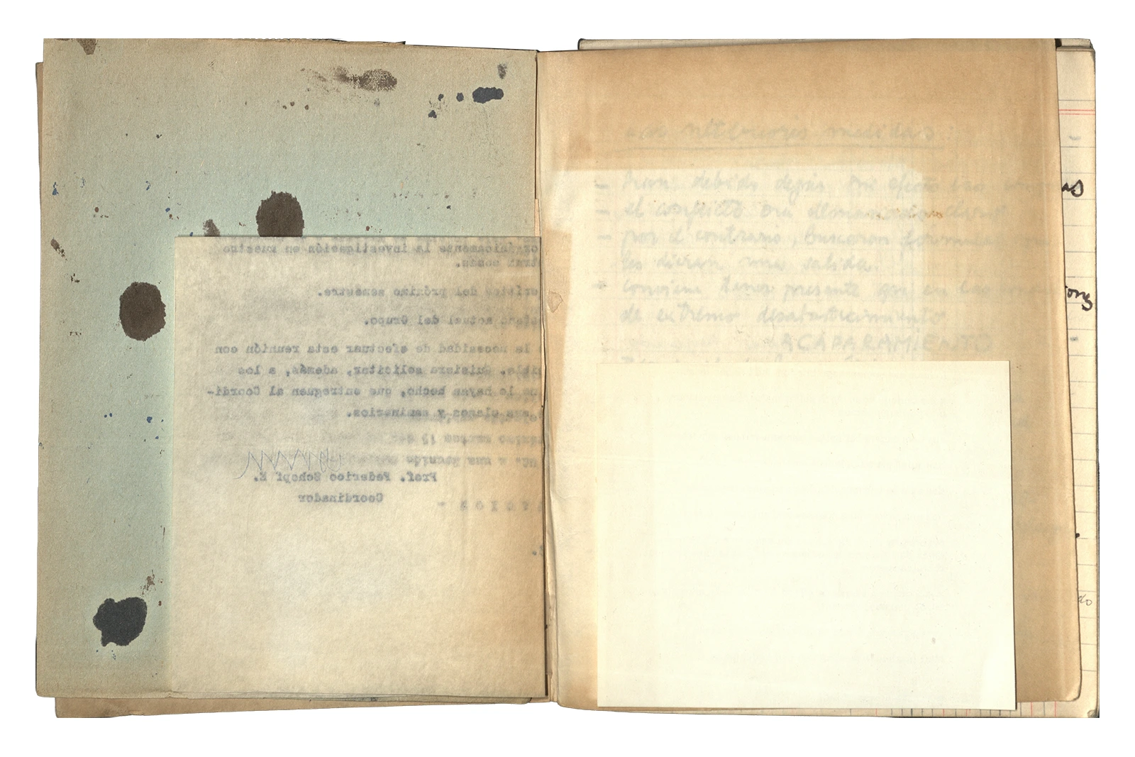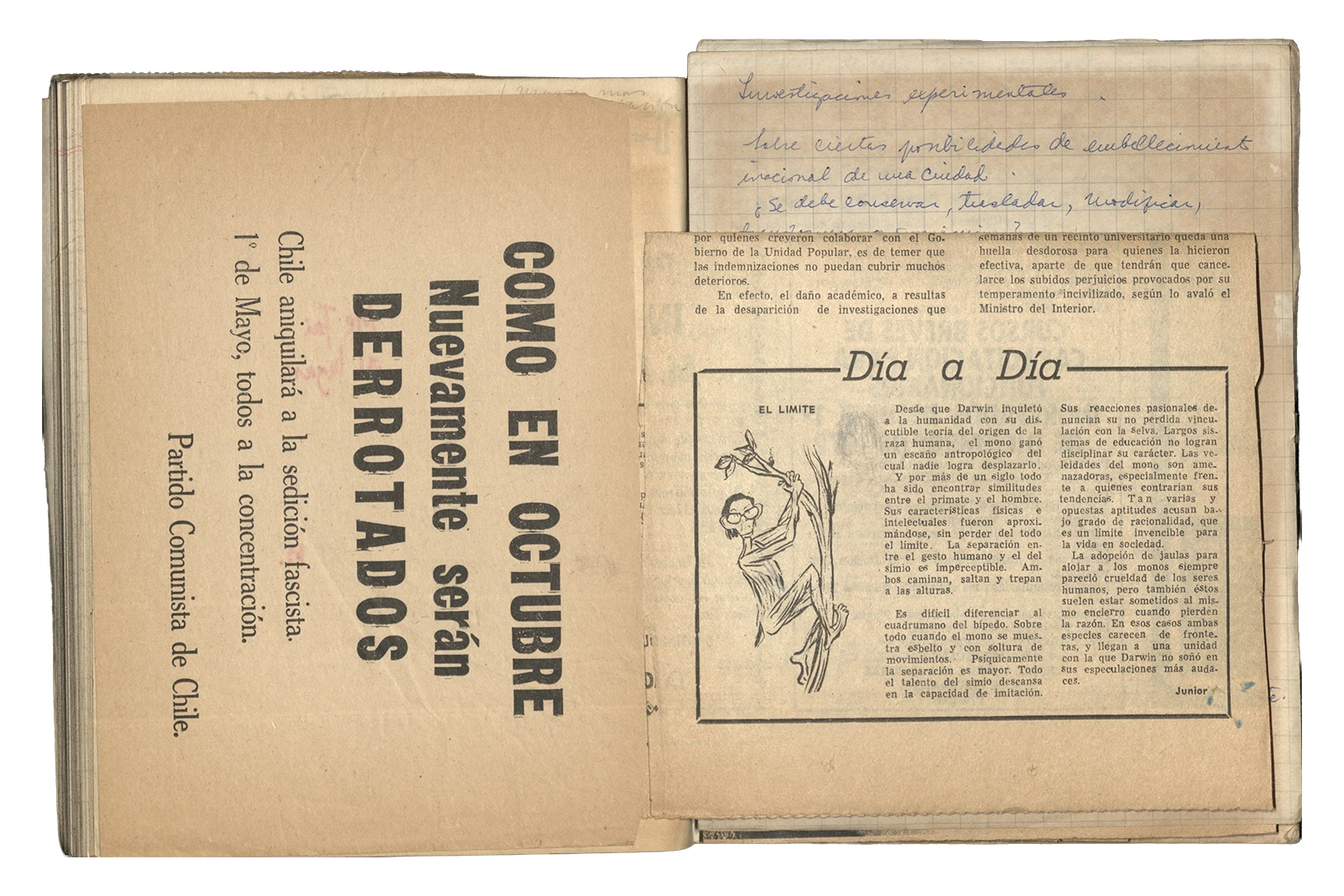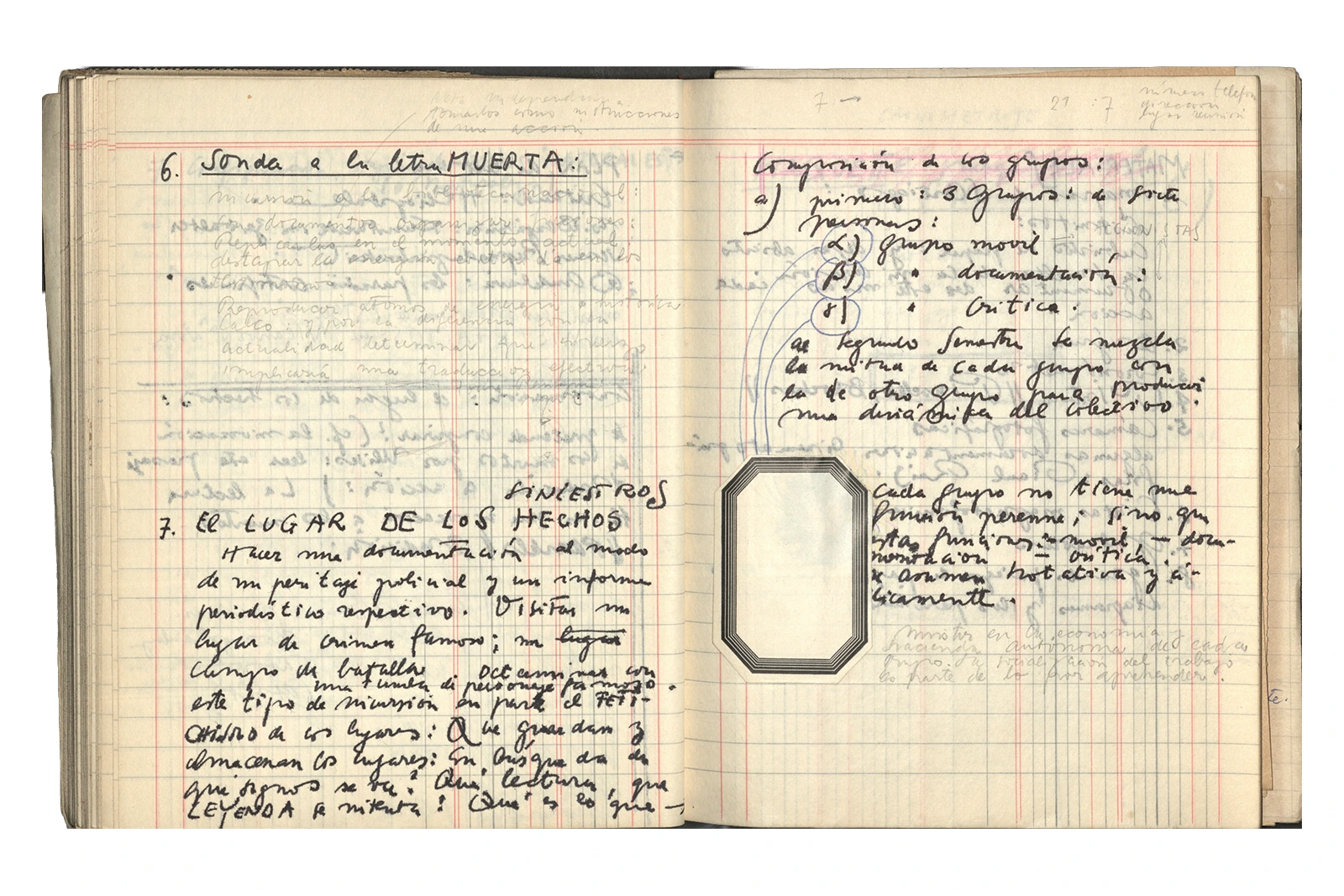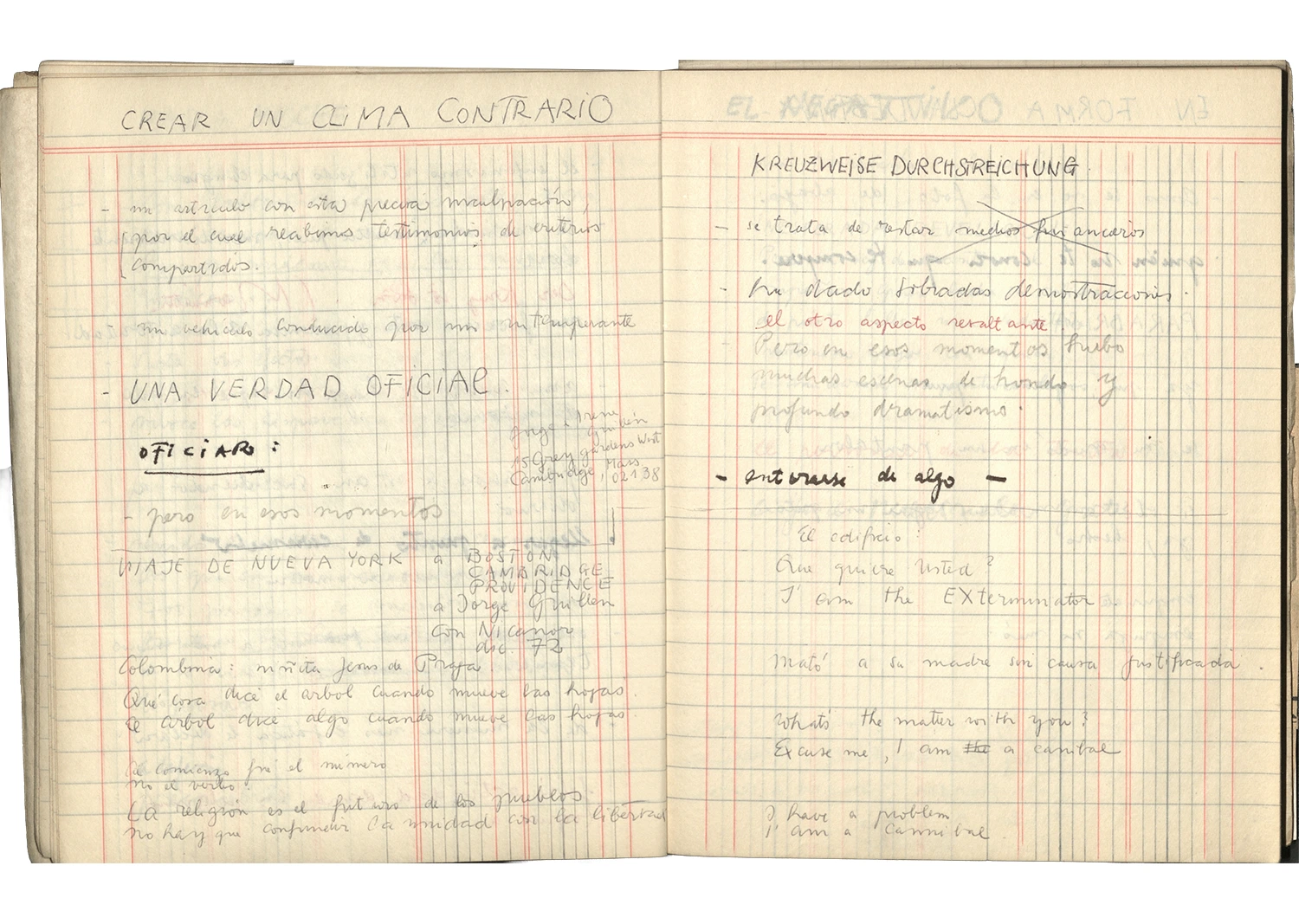 Cuaderno empastado tapa dura, papel mantequilla mecanografiado, notas manuscritas sobre papel en grafito, tinta y pasta, recortes de diarios y revista, venda adhesiva, fichas de biblioteca.