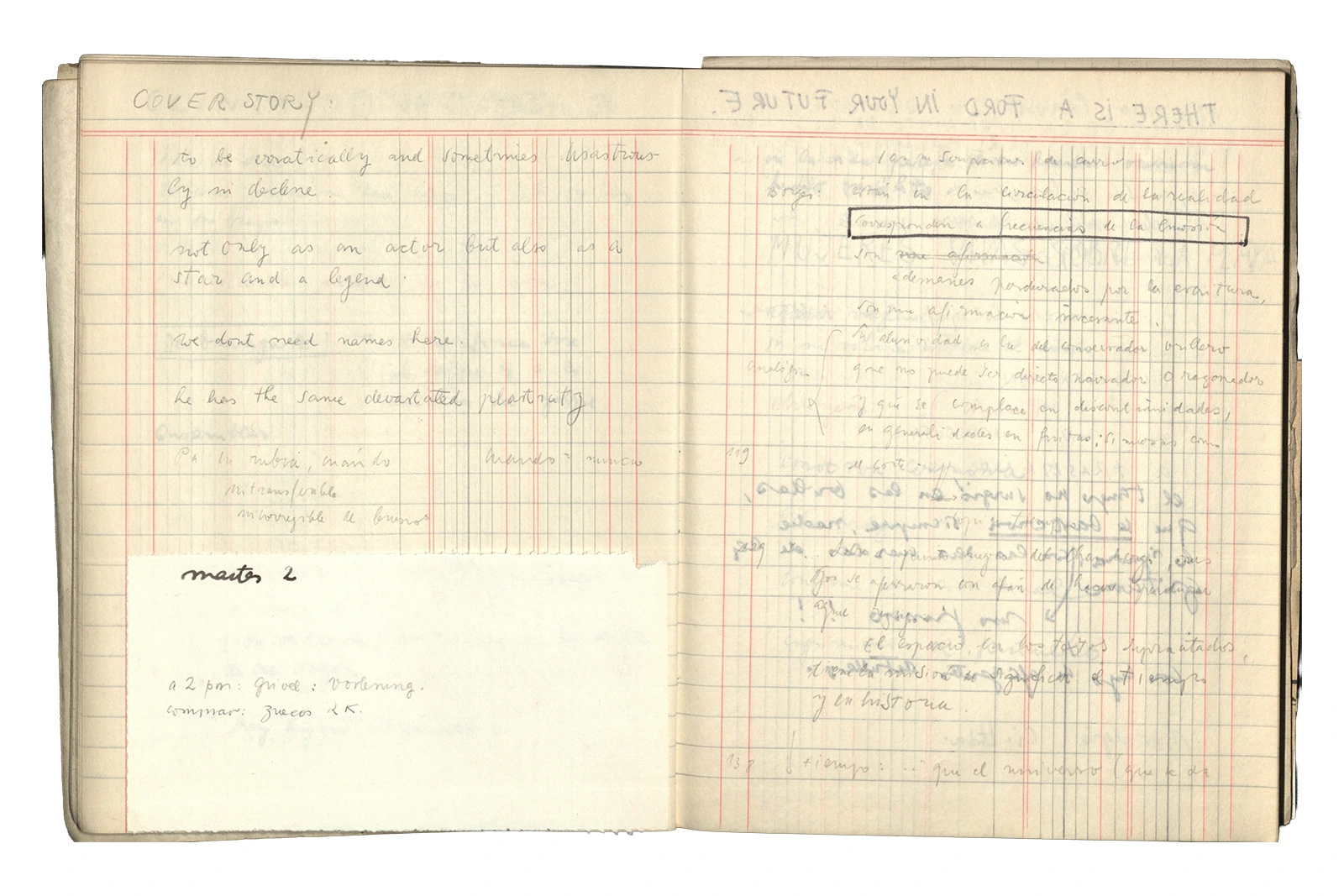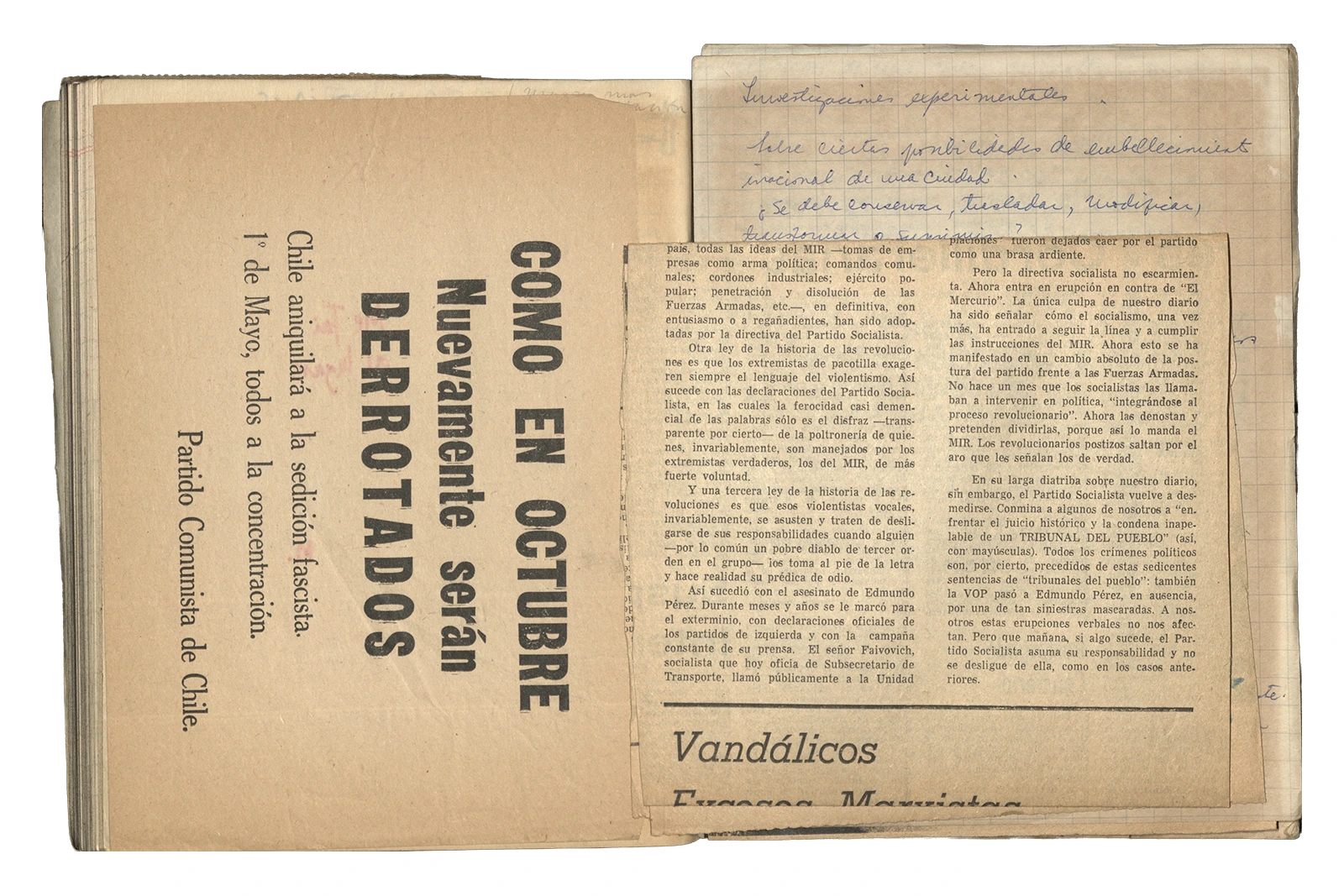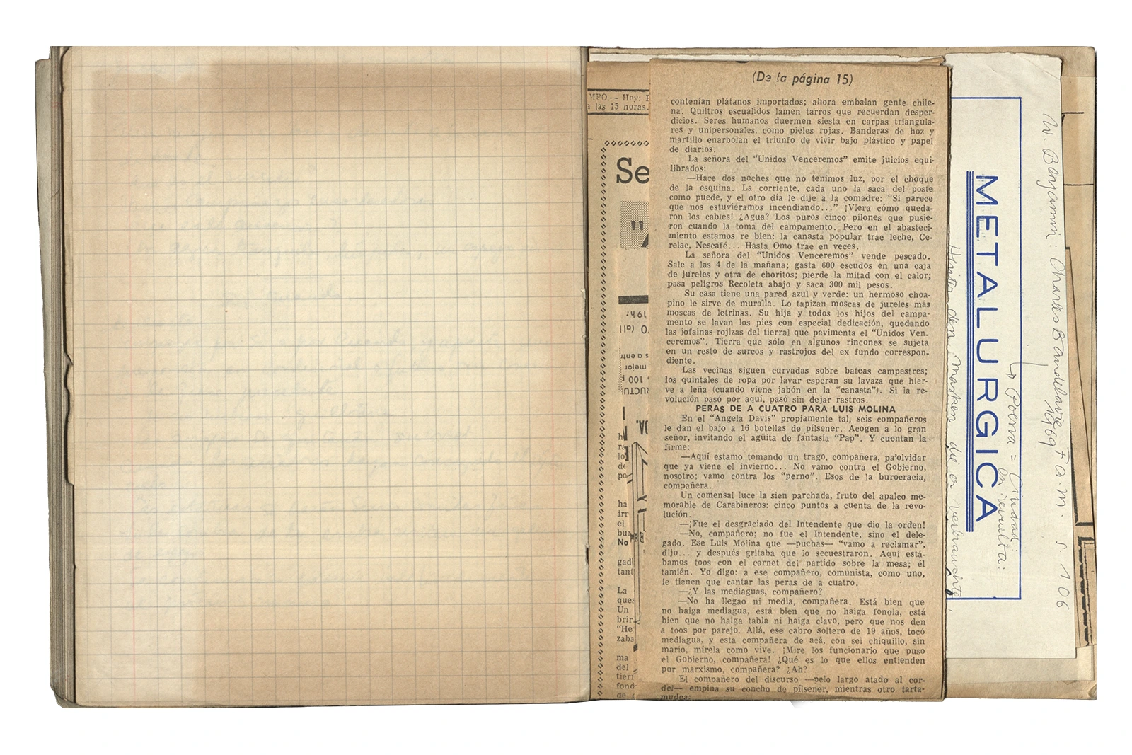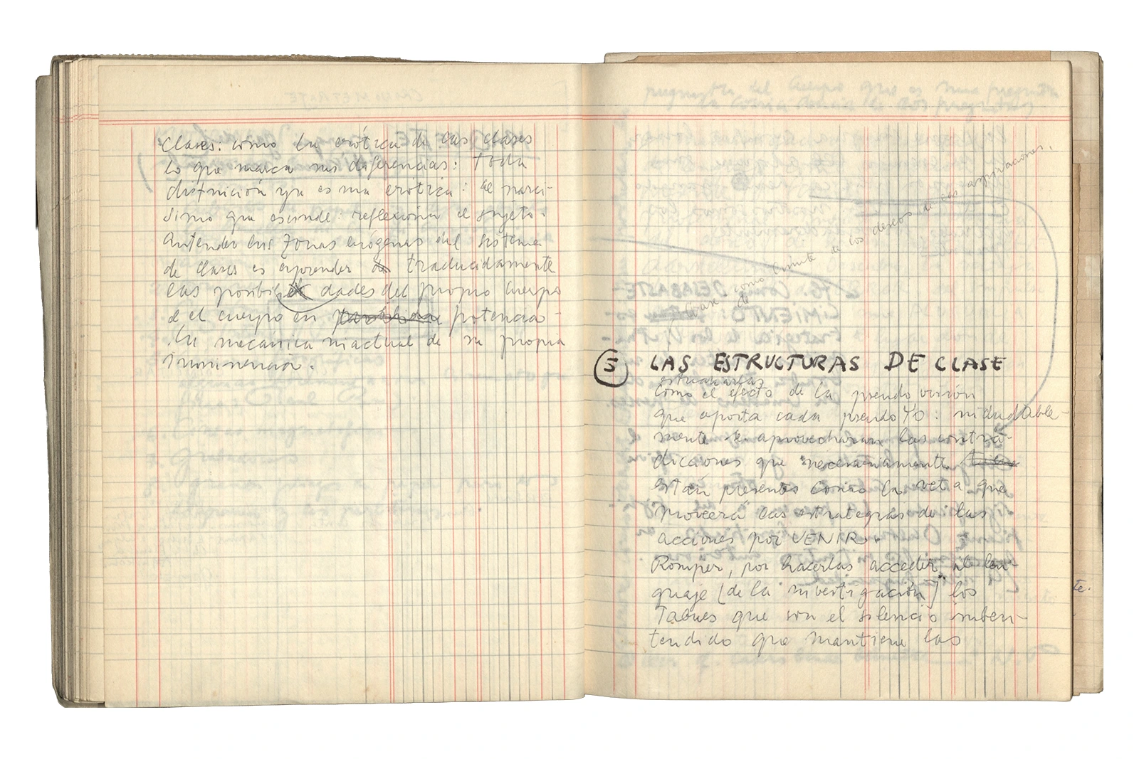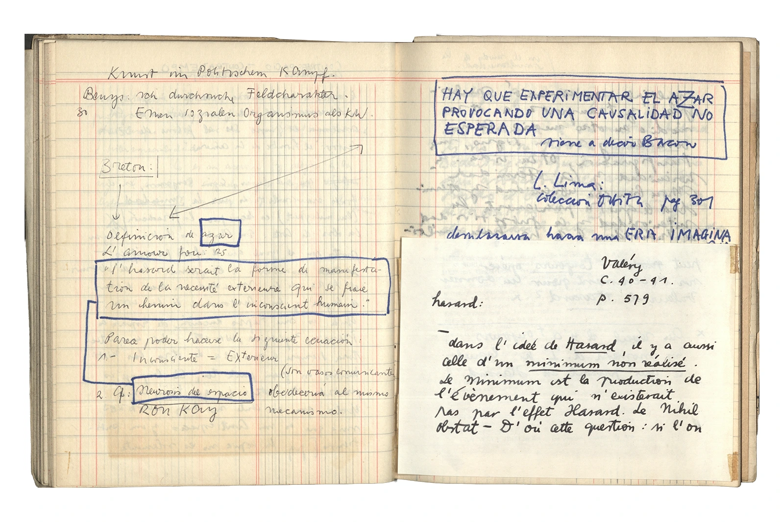 Cuaderno empastado tapa dura, papel mantequilla mecanografiado, notas manuscritas sobre papel en grafito, tinta y pasta, recortes de diarios y revista, venda adhesiva, fichas de biblioteca.
