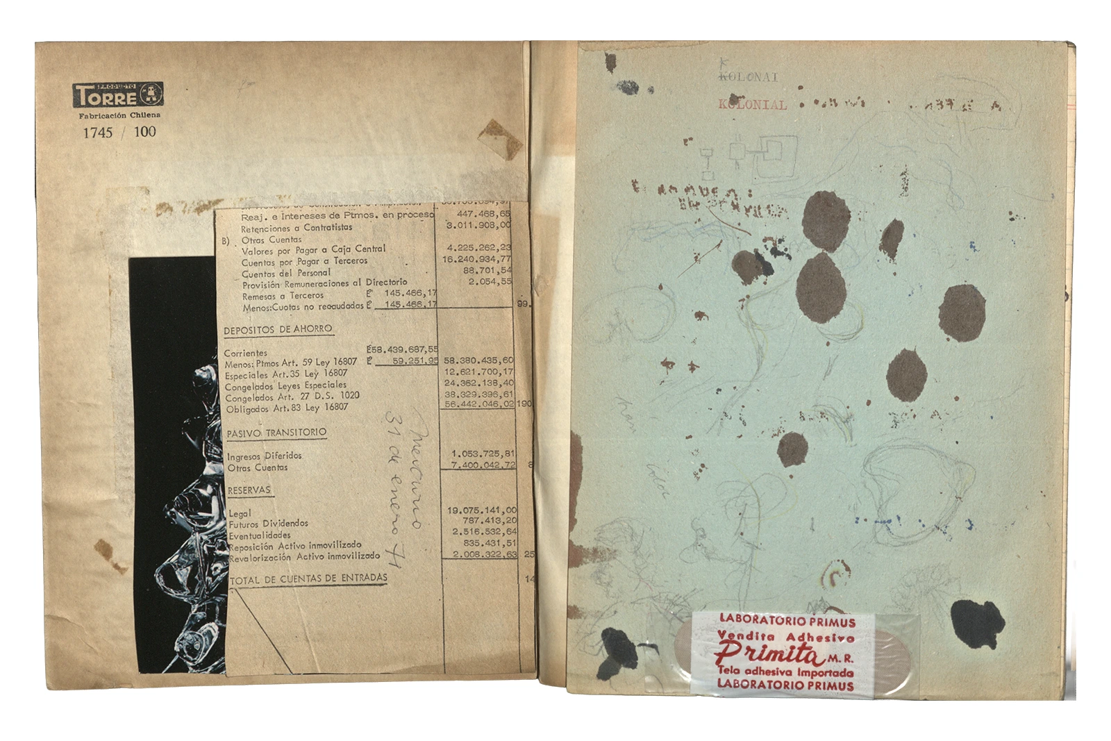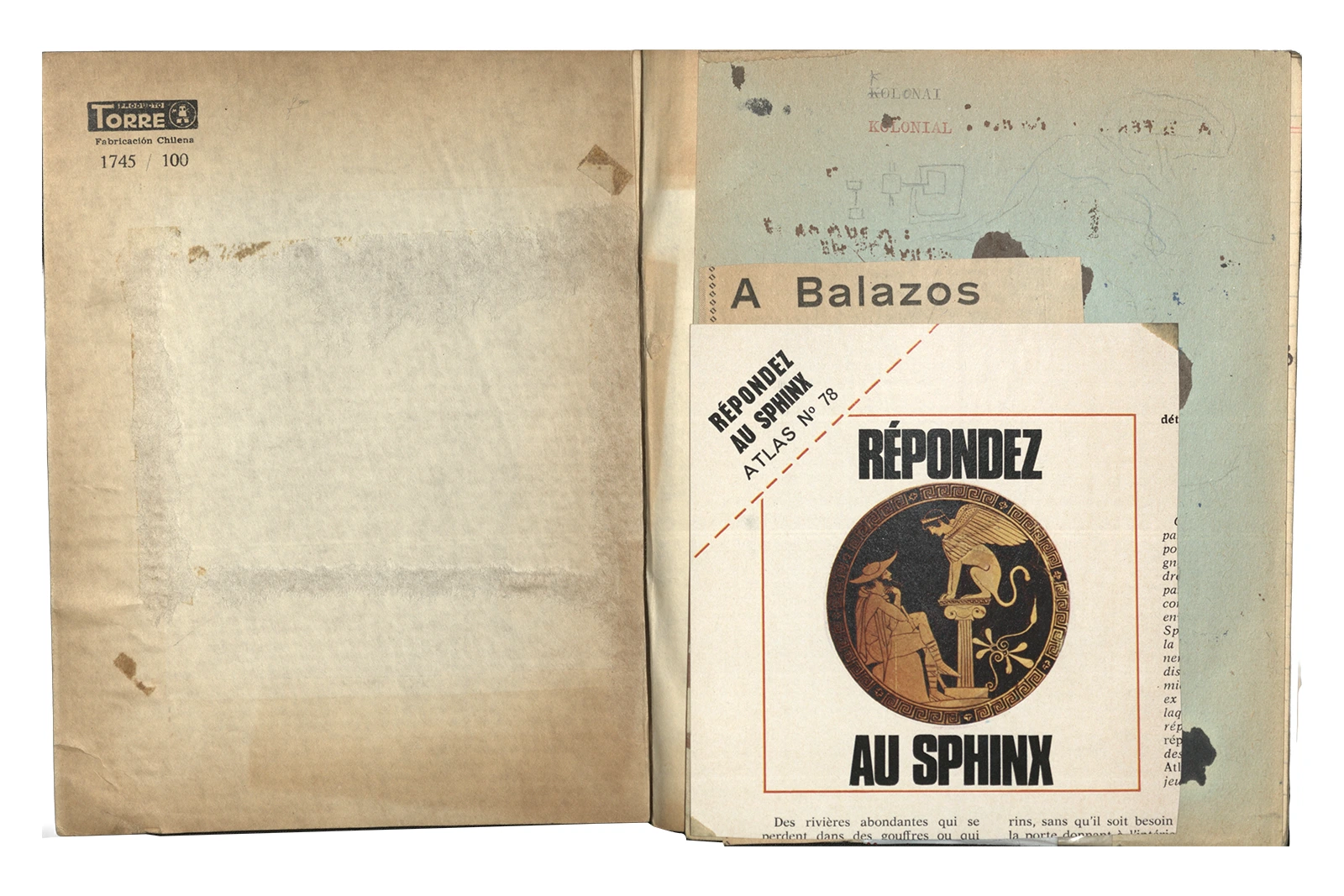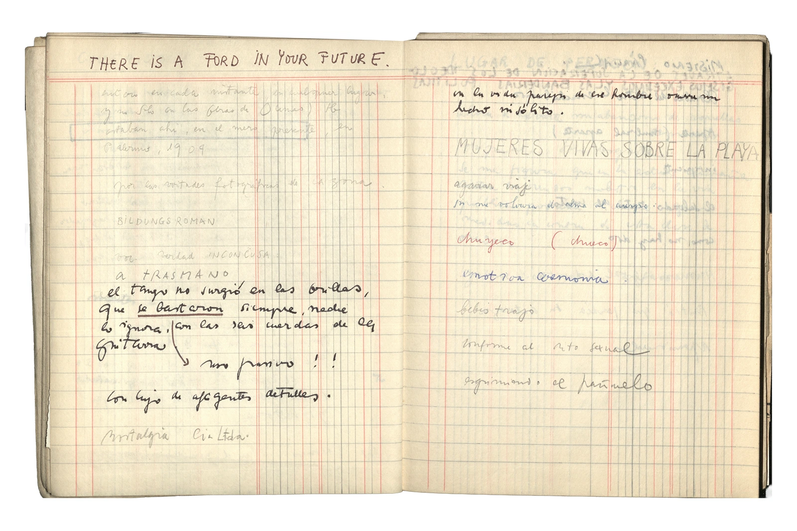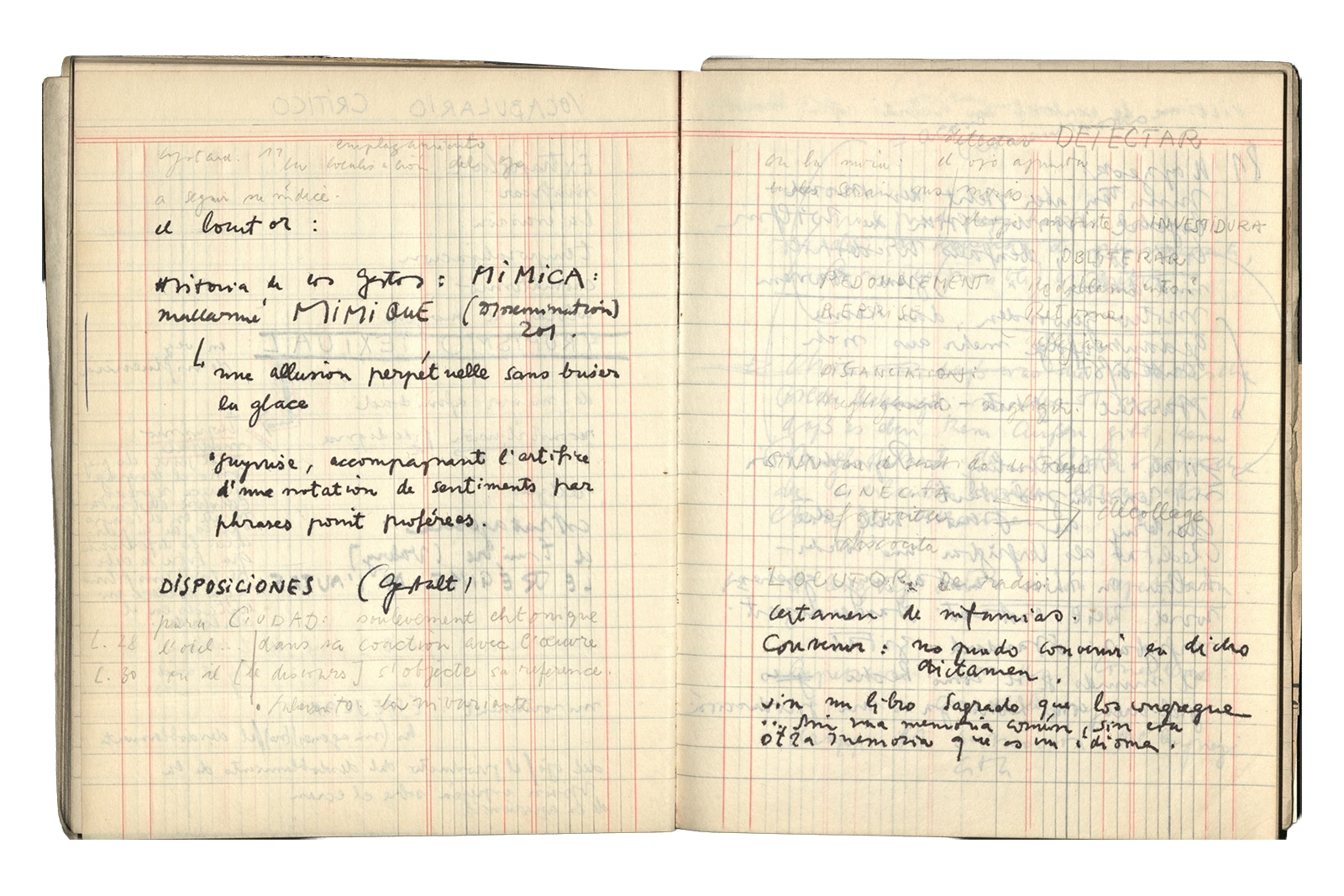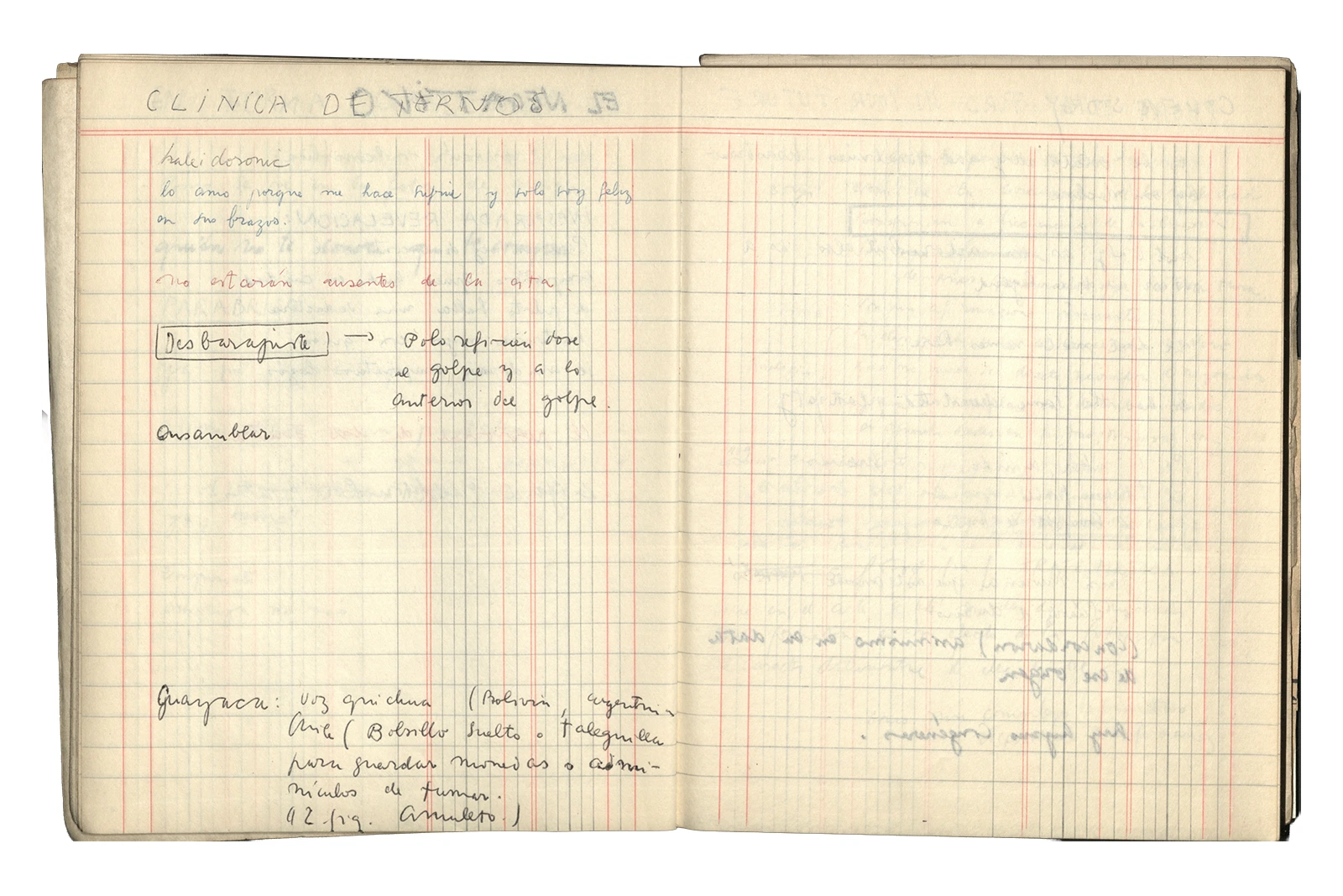 Cuaderno empastado tapa dura, papel mantequilla mecanografiado, notas manuscritas sobre papel en grafito, tinta y pasta, recortes de diarios y revista, venda adhesiva, fichas de biblioteca.