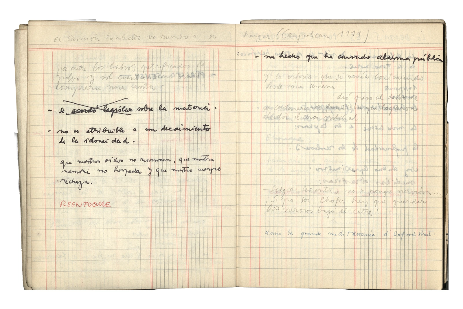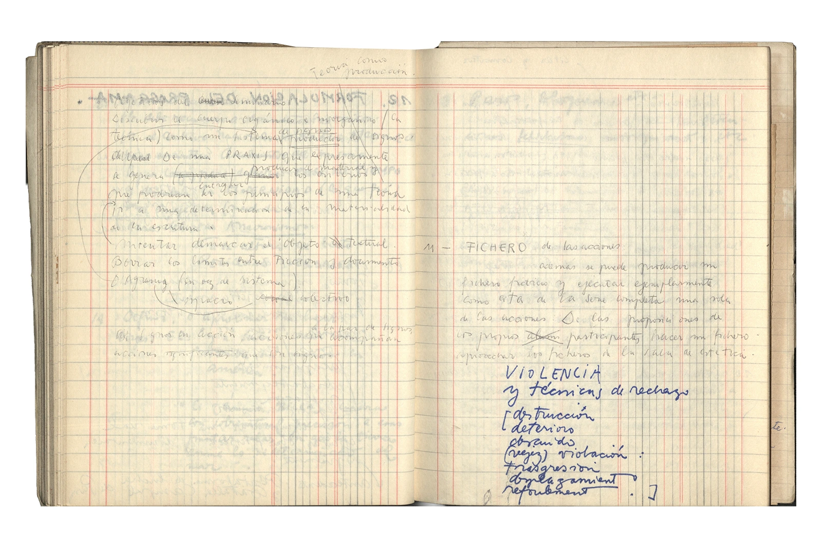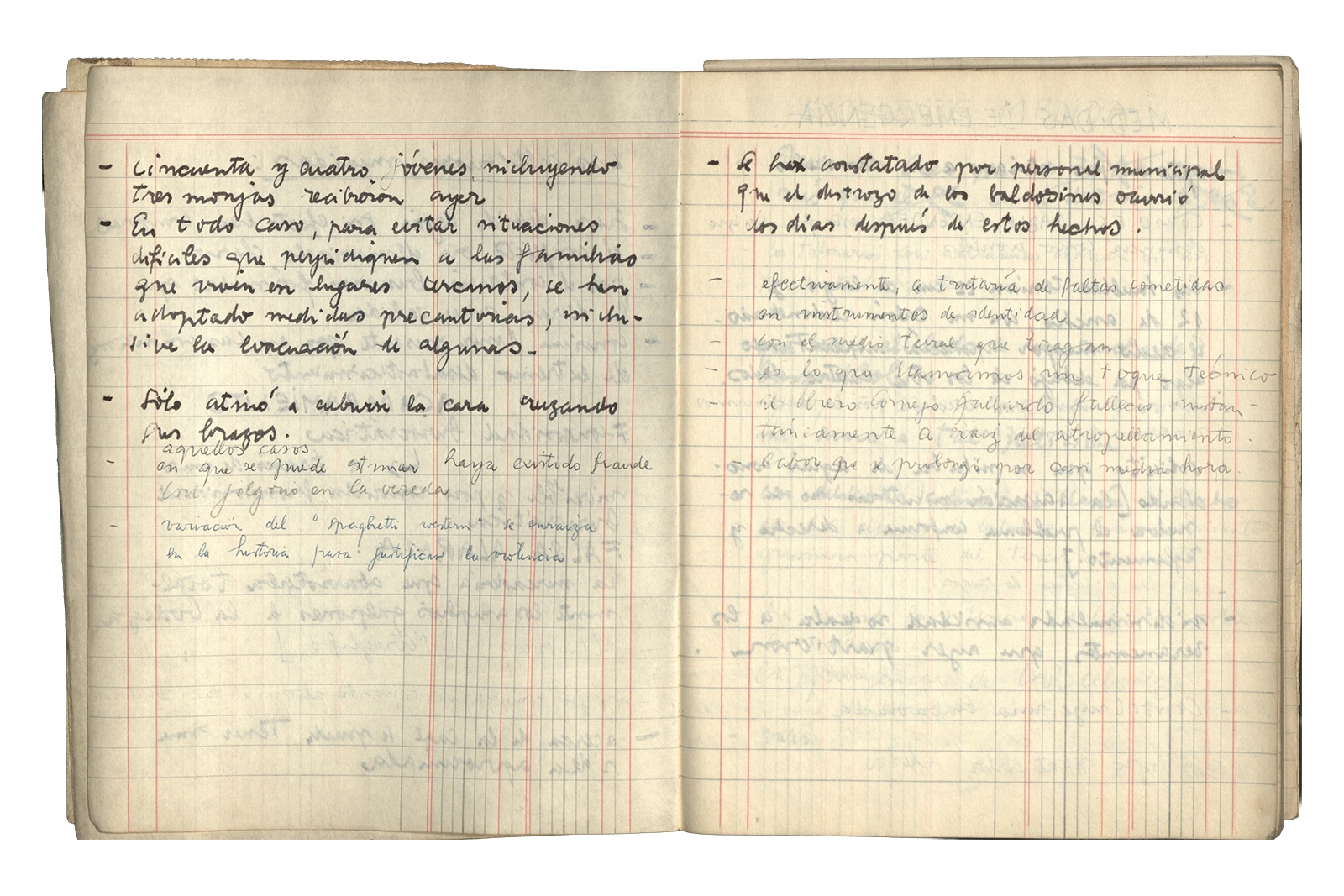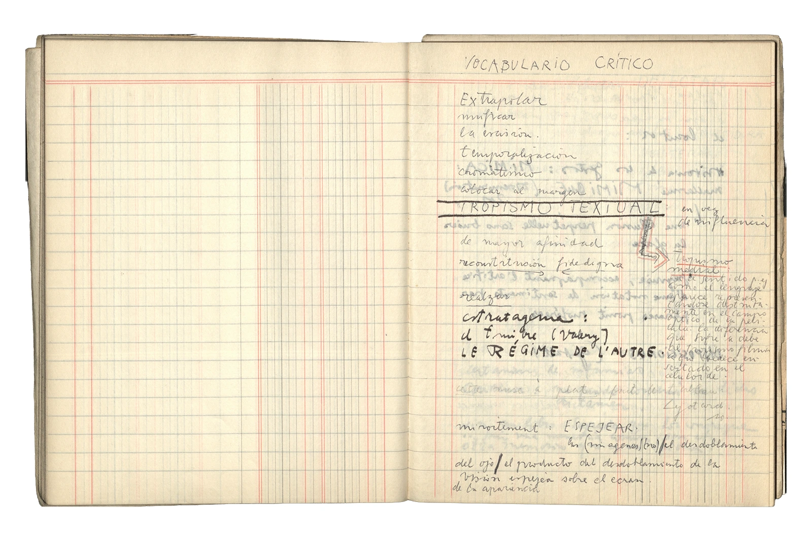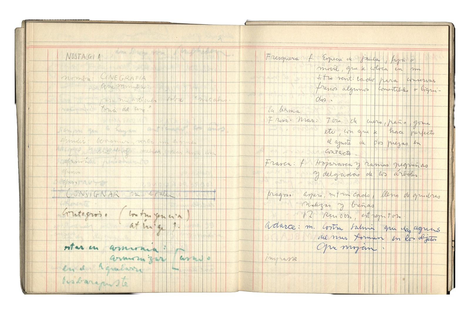Cuaderno empastado tapa dura, papel mantequilla mecanografiado, notas manuscritas sobre papel en grafito, tinta y pasta, recortes de diarios y revista, venda adhesiva, fichas de biblioteca.
