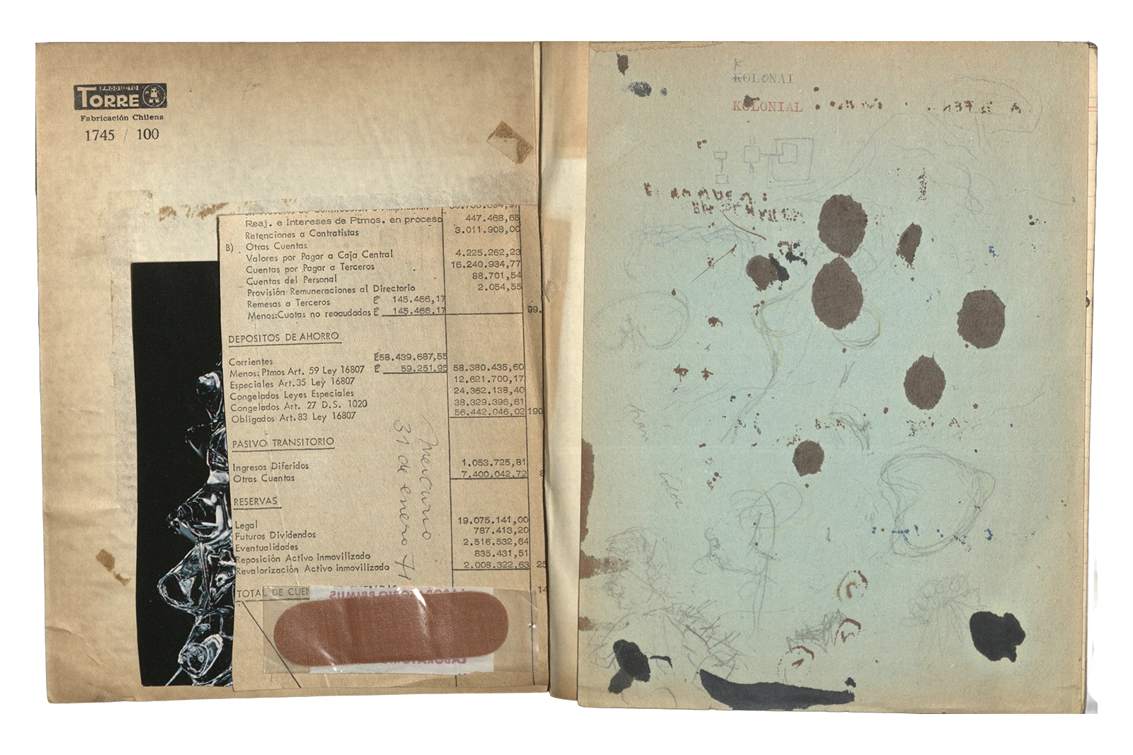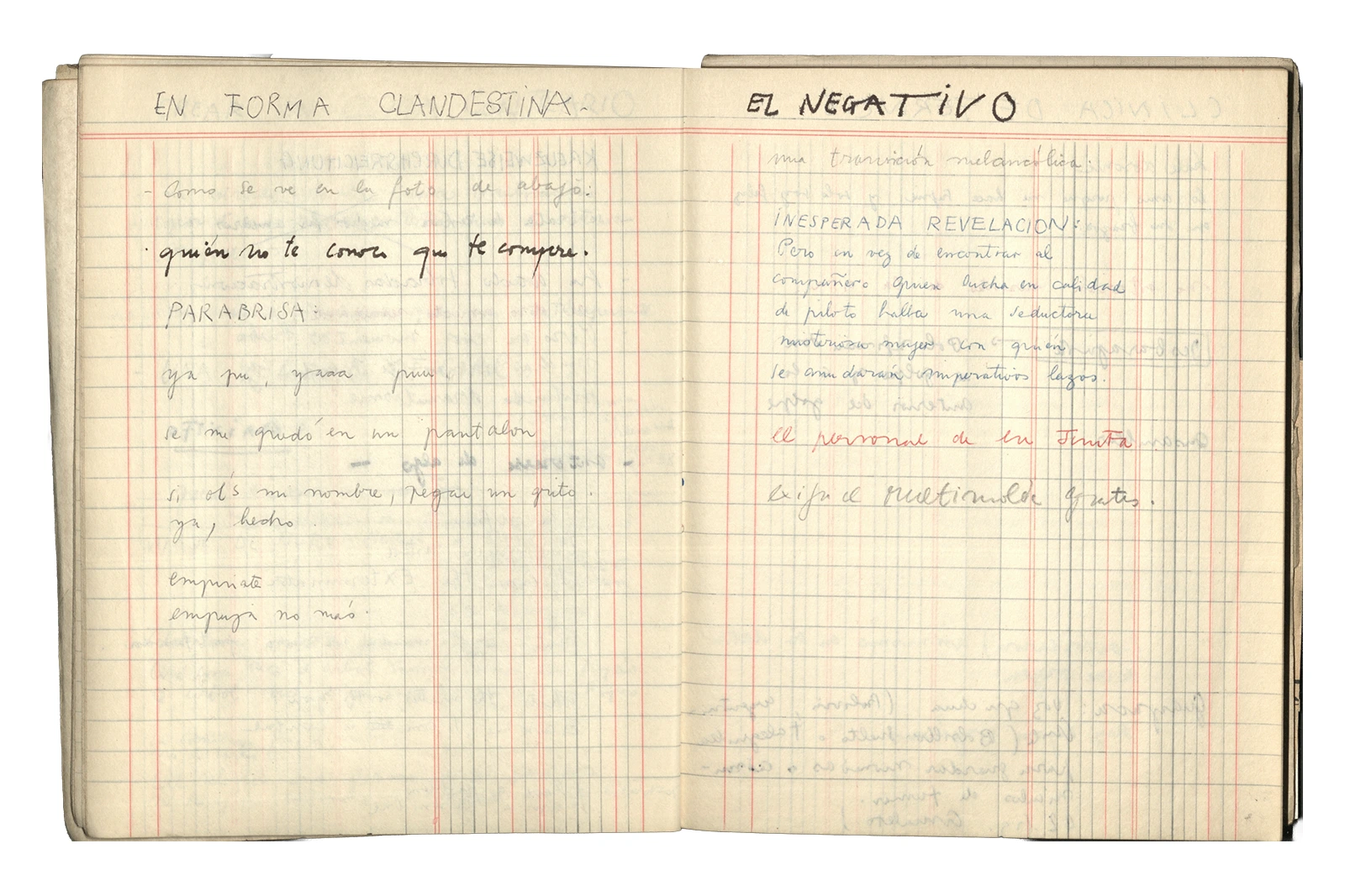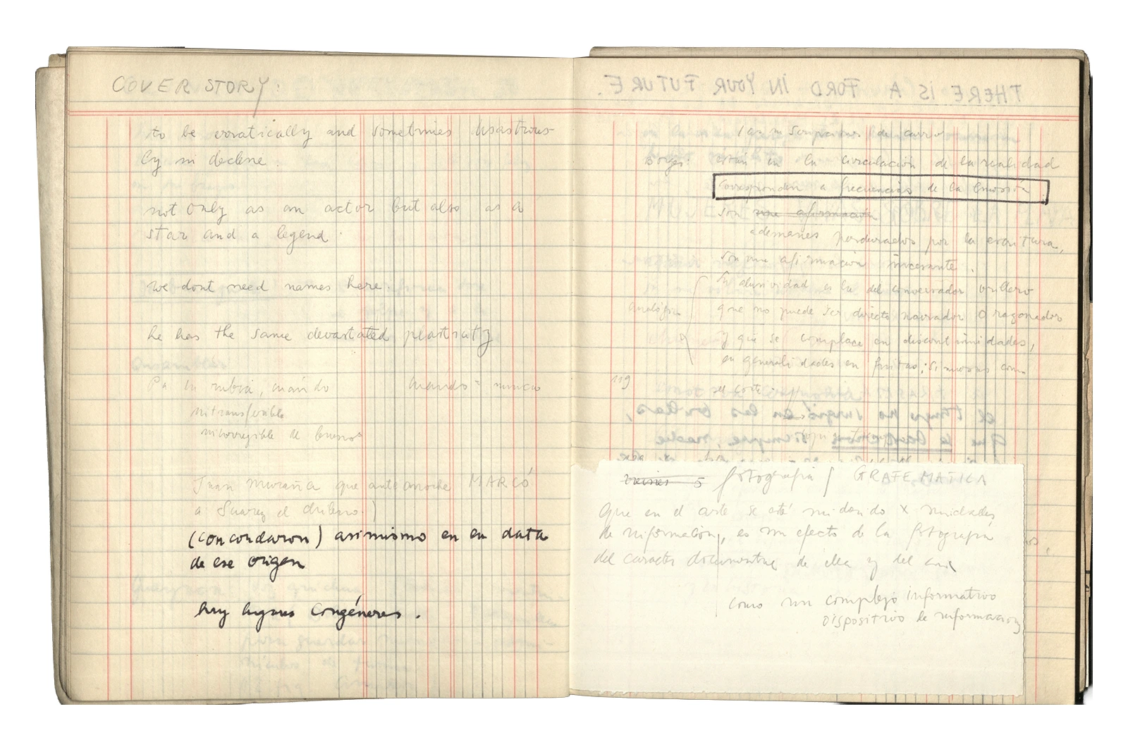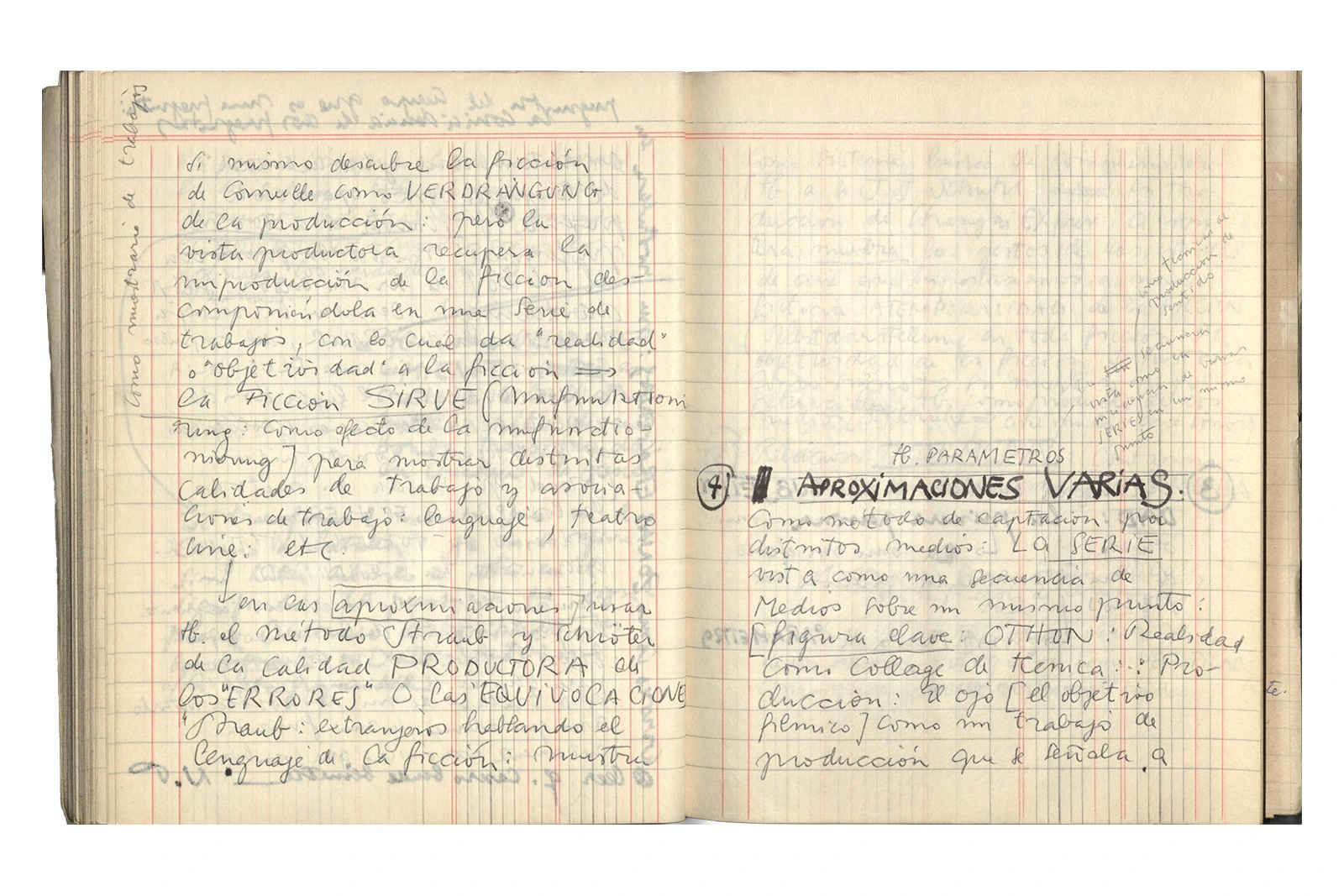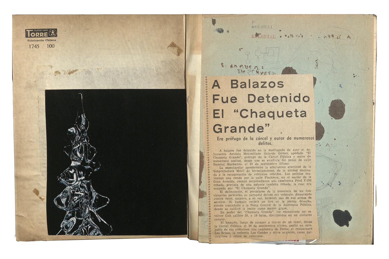 Cuaderno empastado tapa dura, papel mantequilla mecanografiado, notas manuscritas sobre papel en grafito, tinta y pasta, recortes de diarios y revista, venda adhesiva, fichas de biblioteca.
