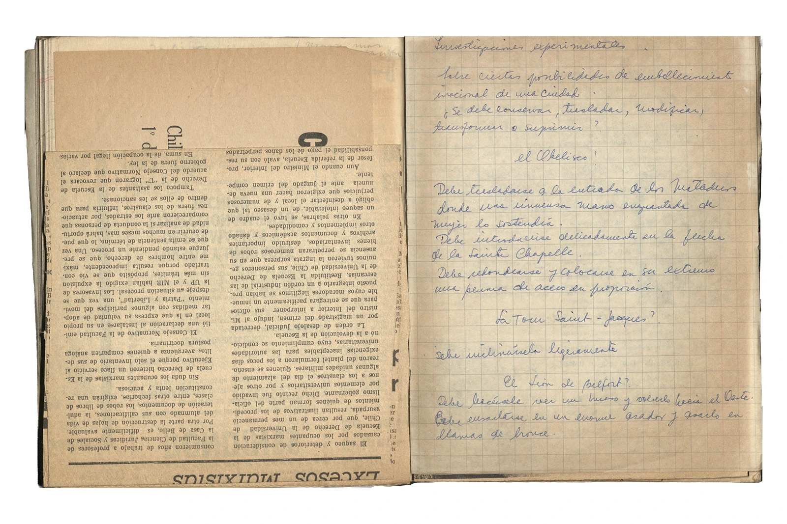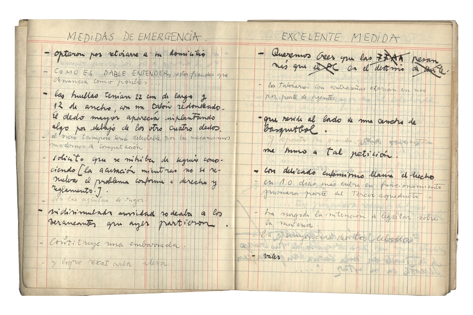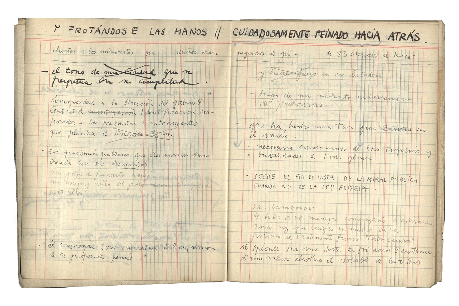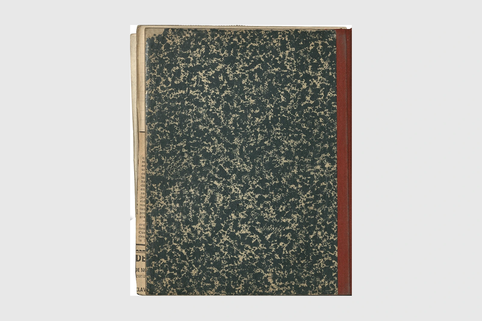 Cuaderno empastado tapa dura, papel mantequilla mecanografiado, notas manuscritas sobre papel en grafito, tinta y pasta, recortes de diarios y revista, venda adhesiva, fichas de biblioteca.