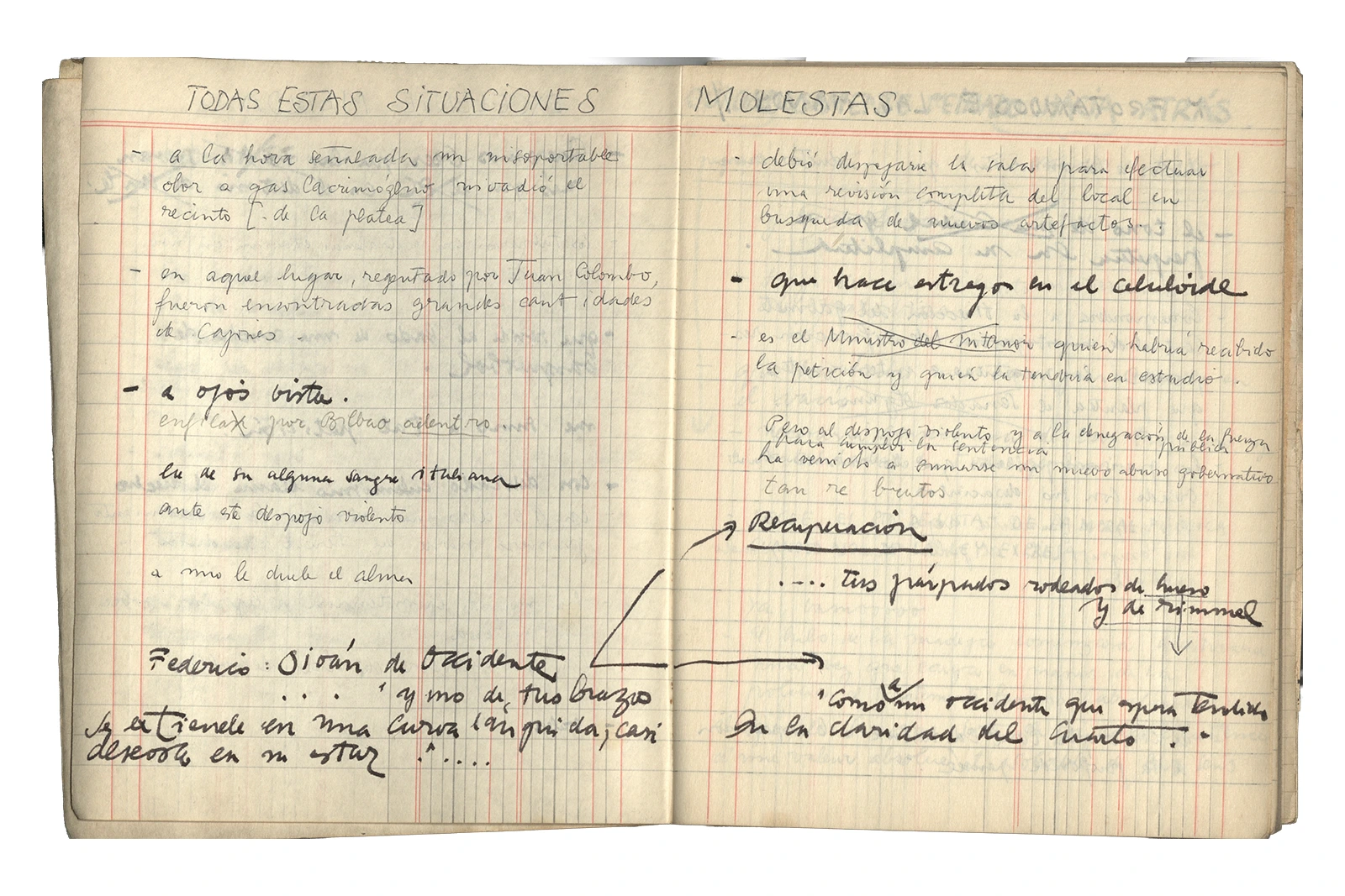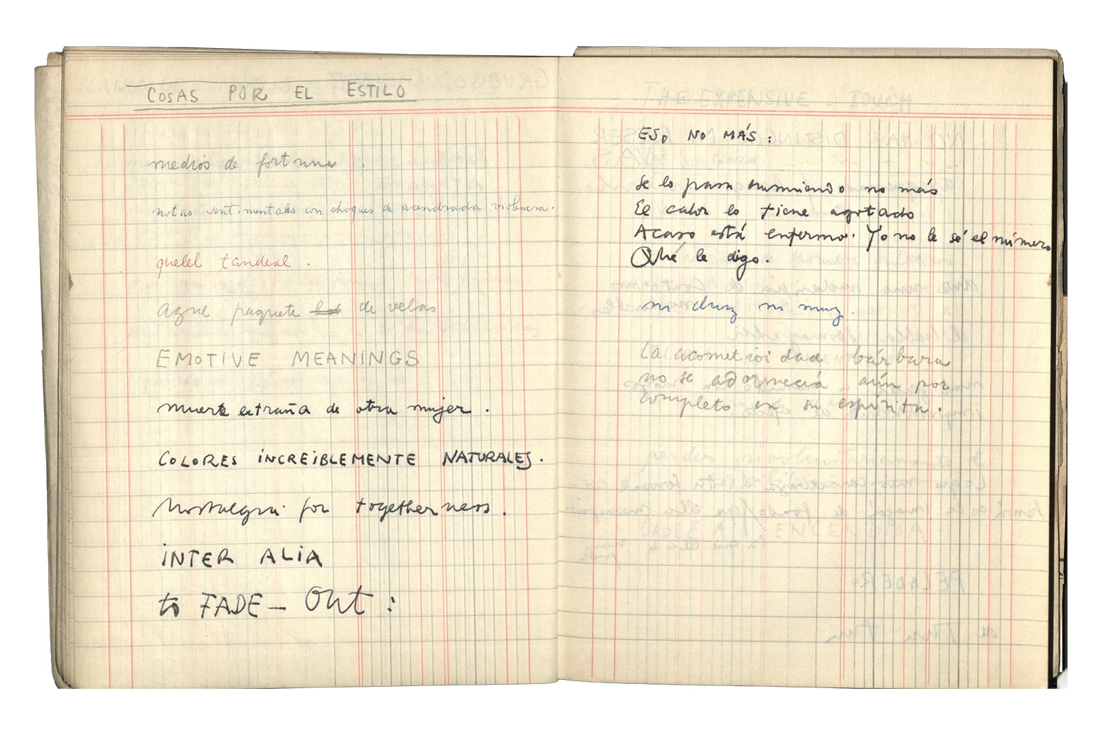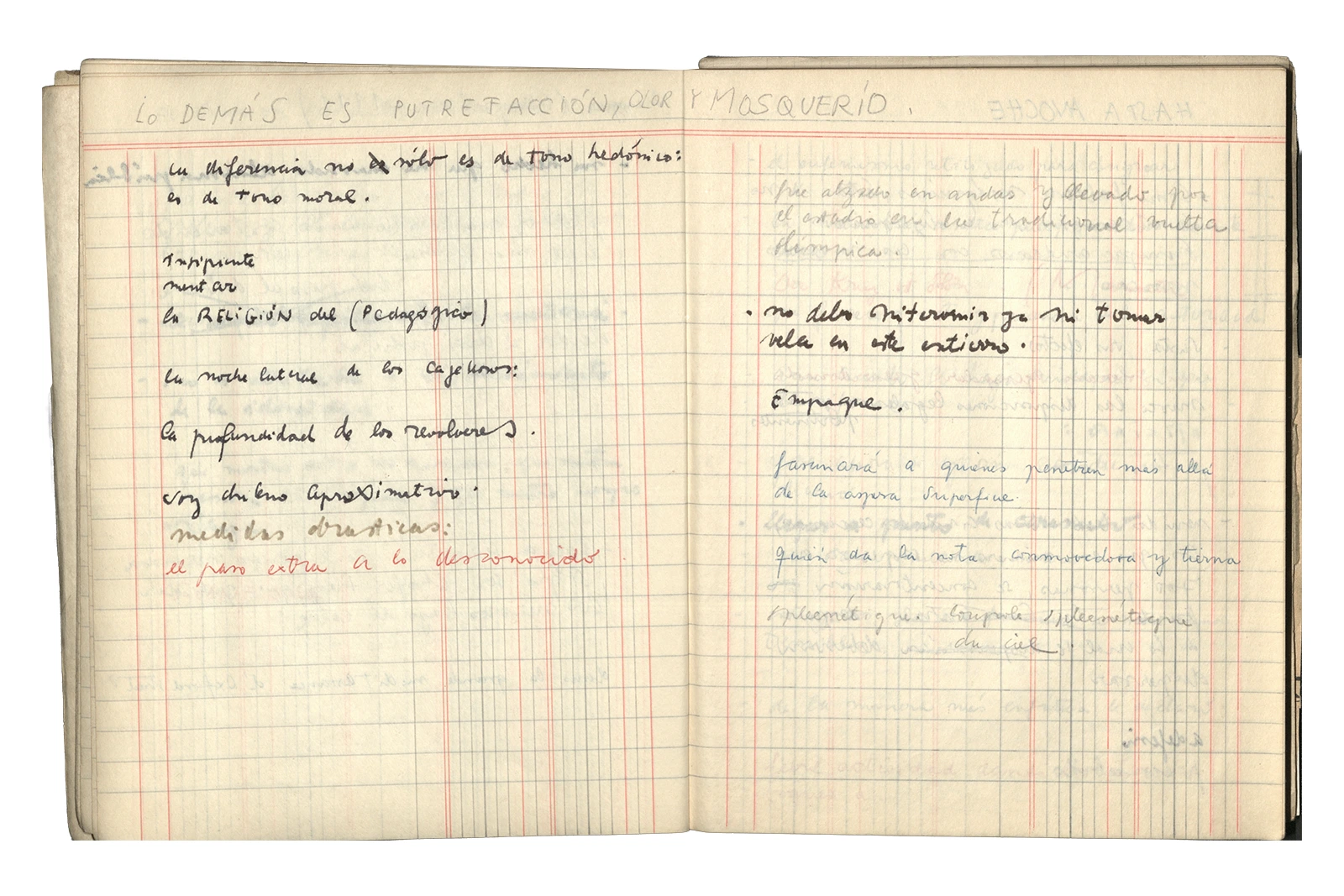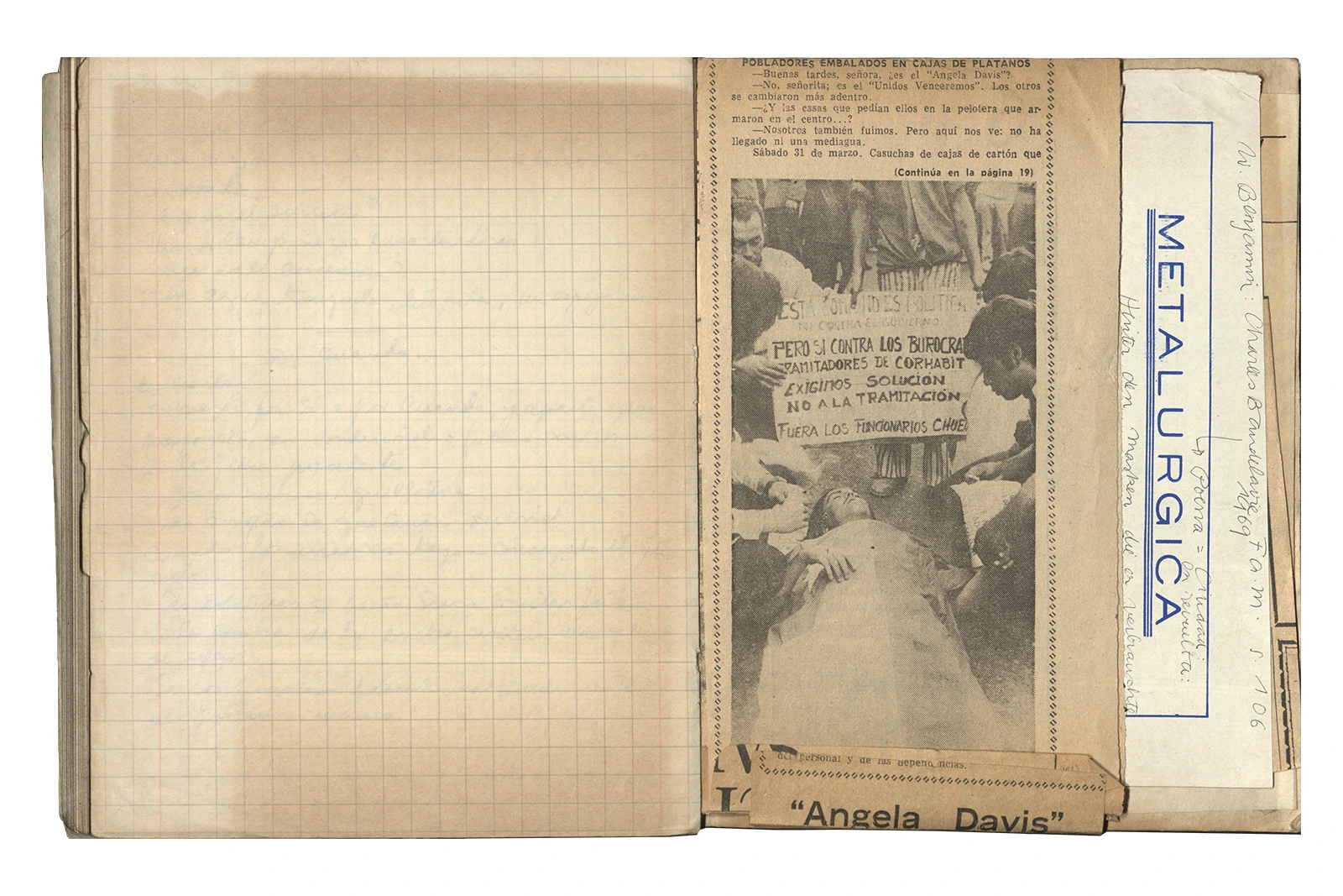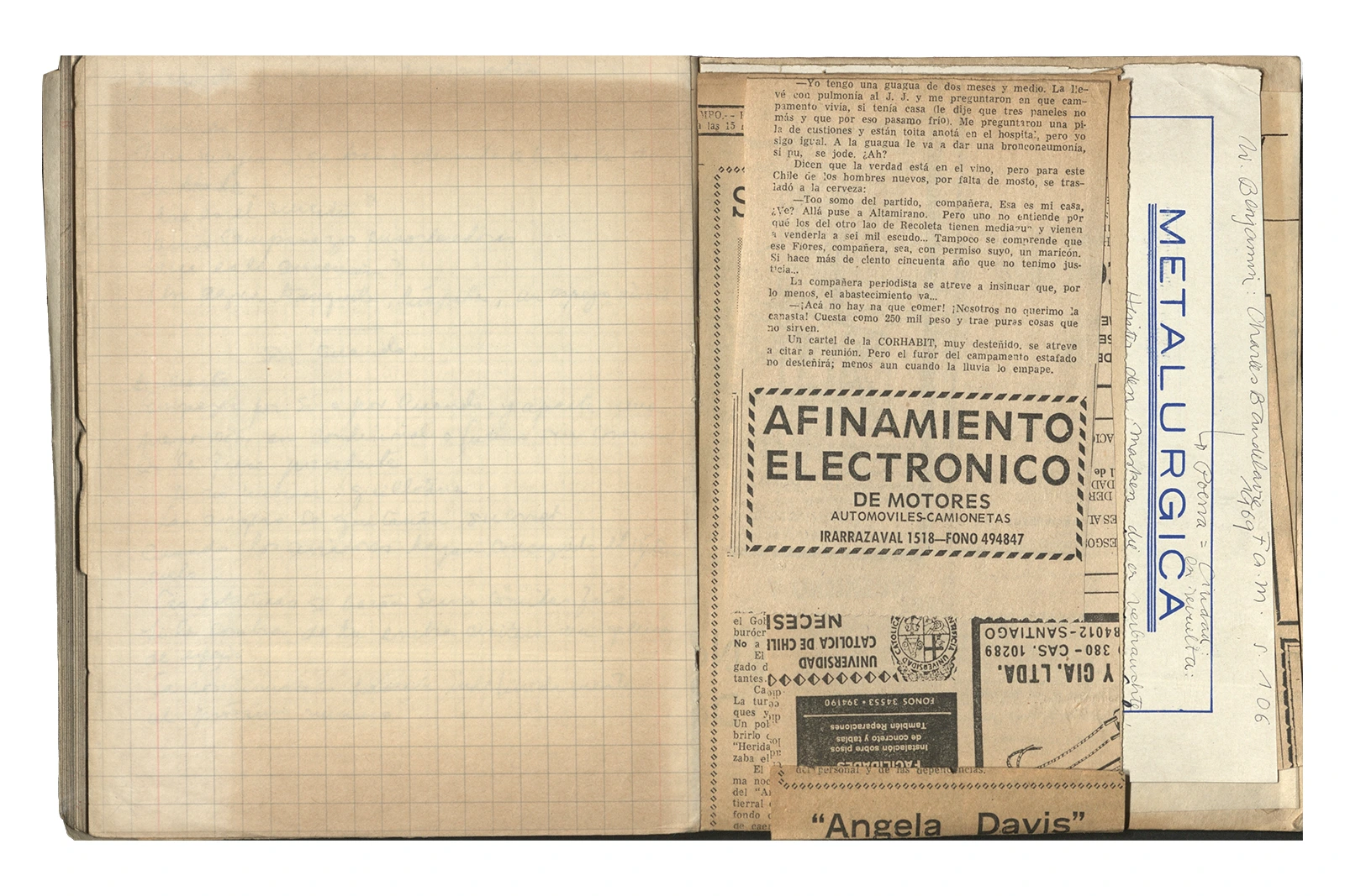 Cuaderno empastado tapa dura, papel mantequilla mecanografiado, notas manuscritas sobre papel en grafito, tinta y pasta, recortes de diarios y revista, venda adhesiva, fichas de biblioteca.