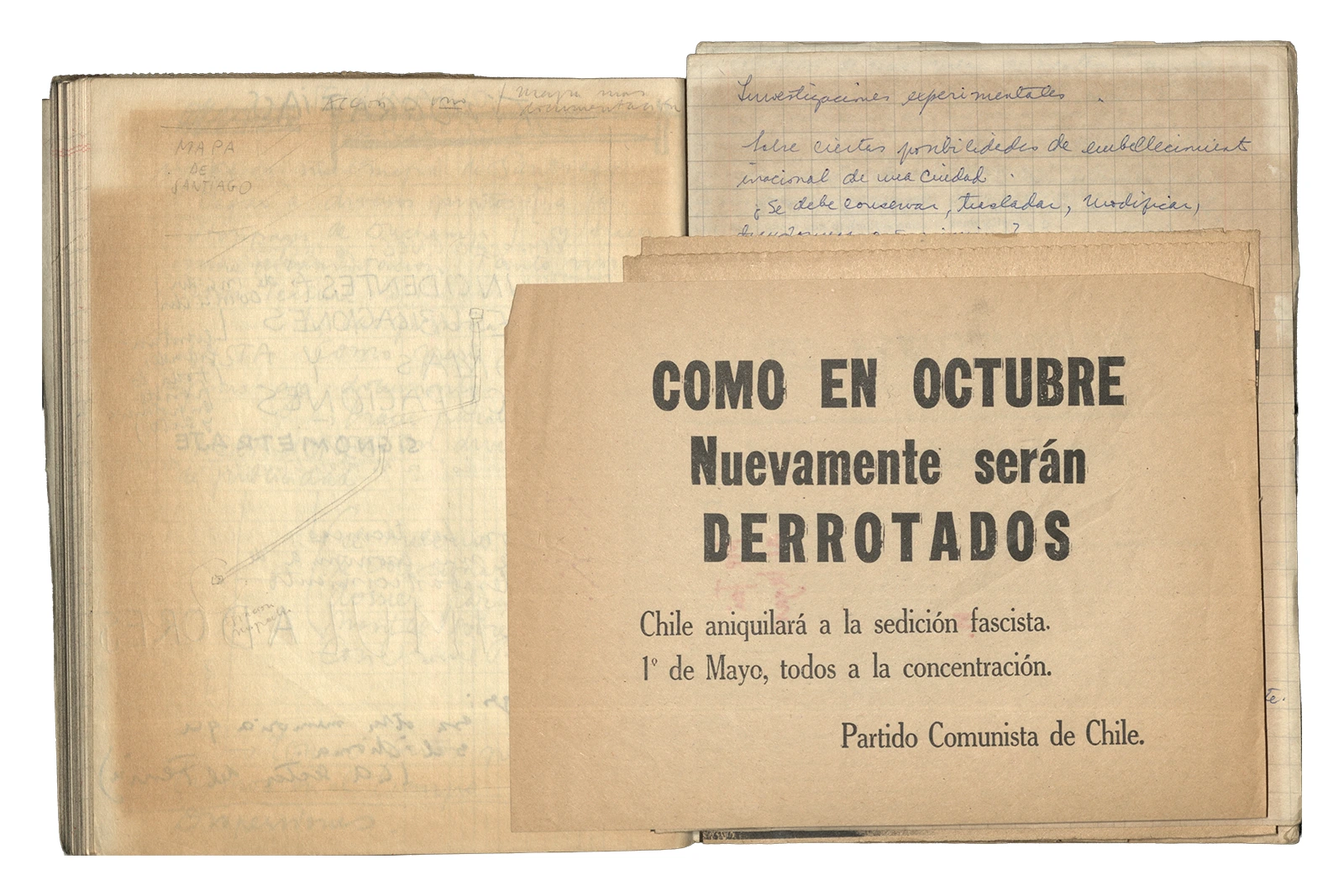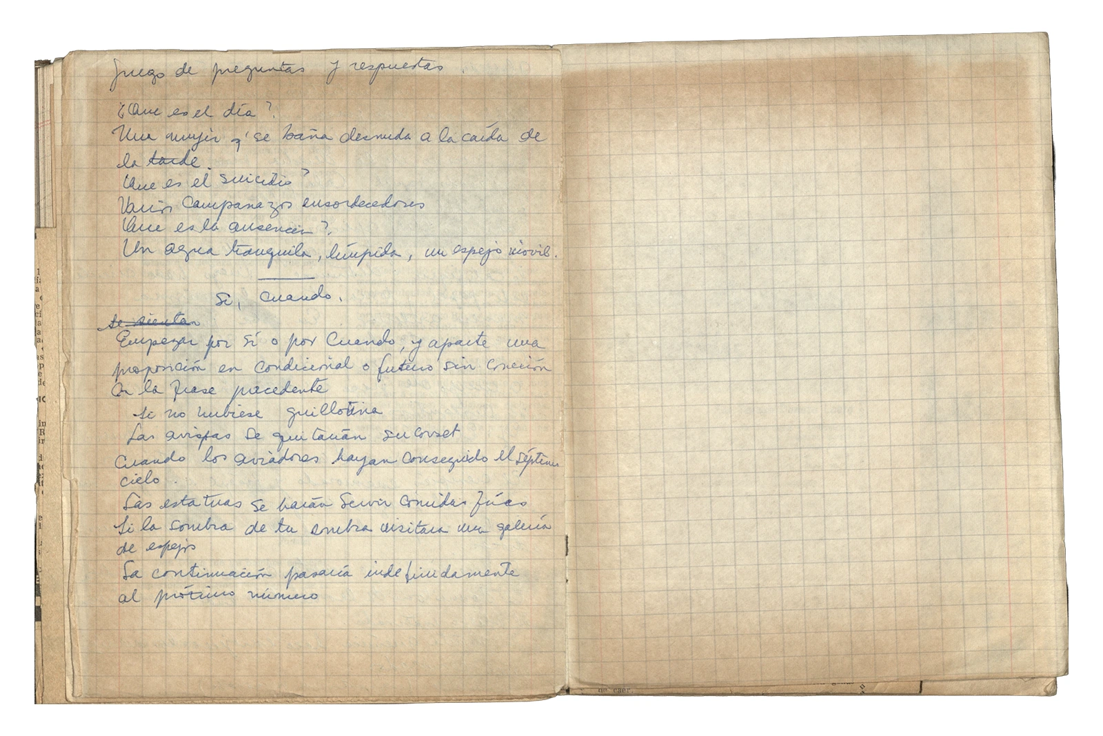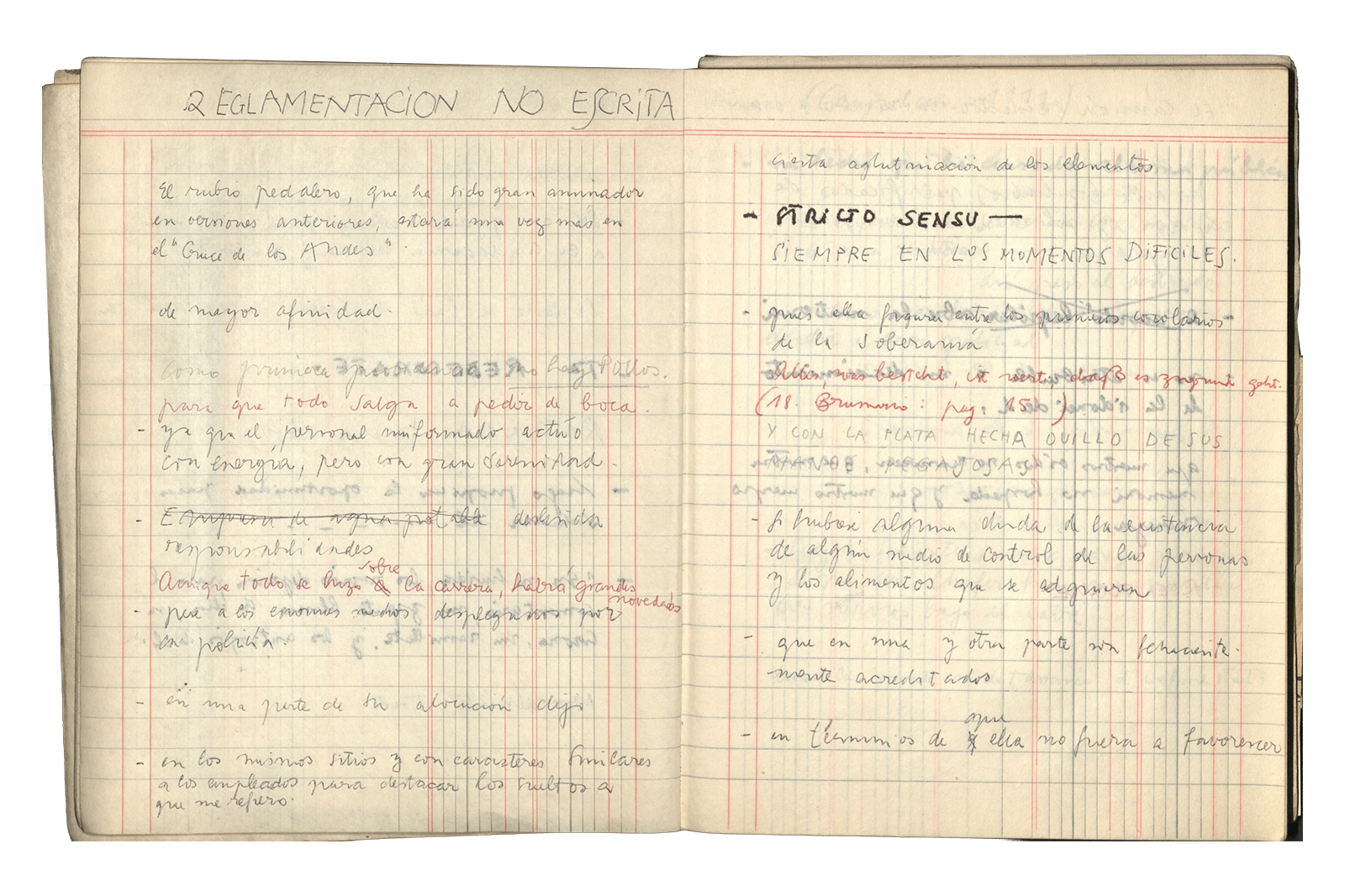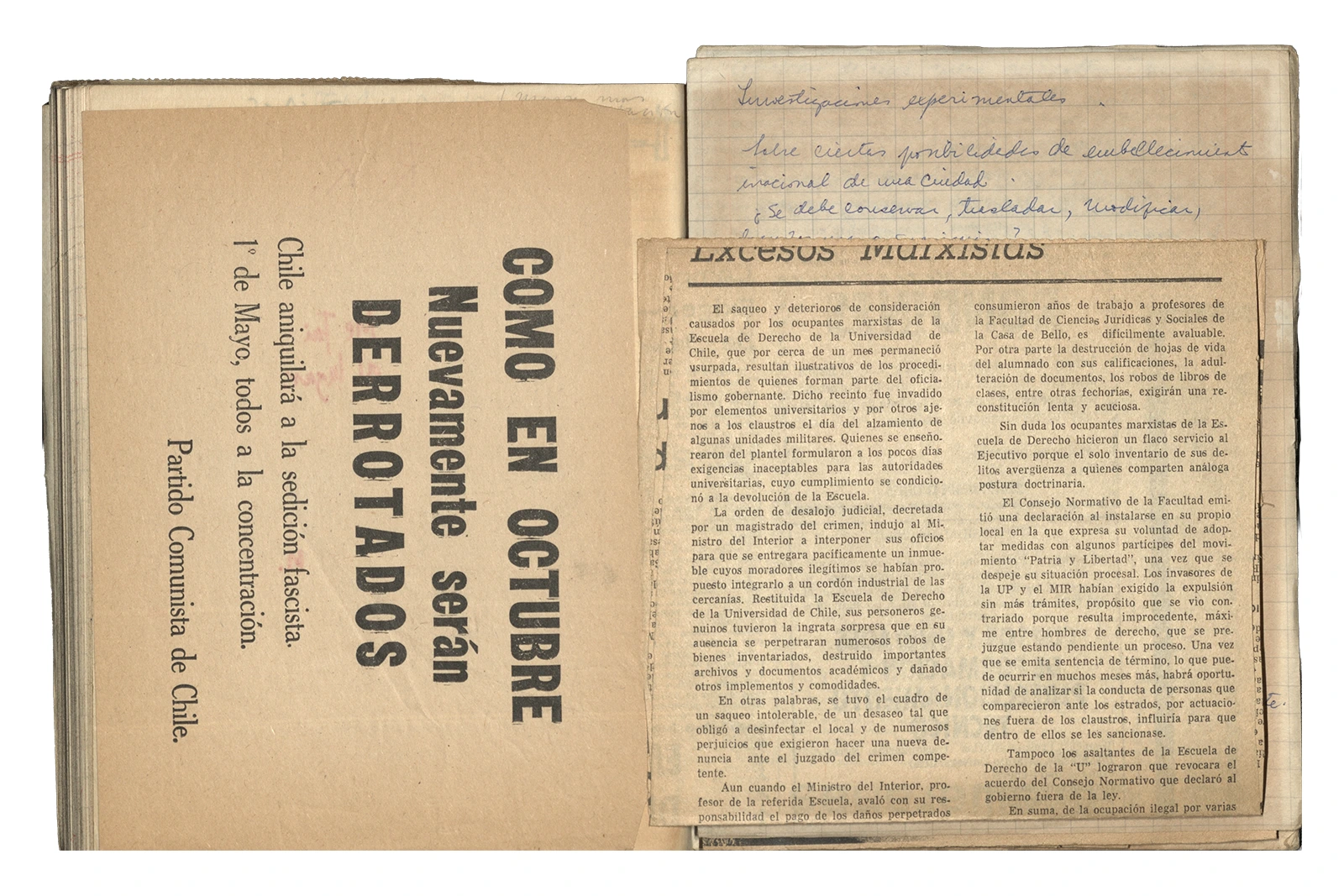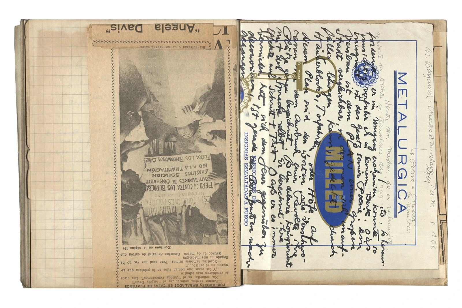 Cuaderno empastado tapa dura, papel mantequilla mecanografiado, notas manuscritas sobre papel en grafito, tinta y pasta, recortes de diarios y revista, venda adhesiva, fichas de biblioteca.