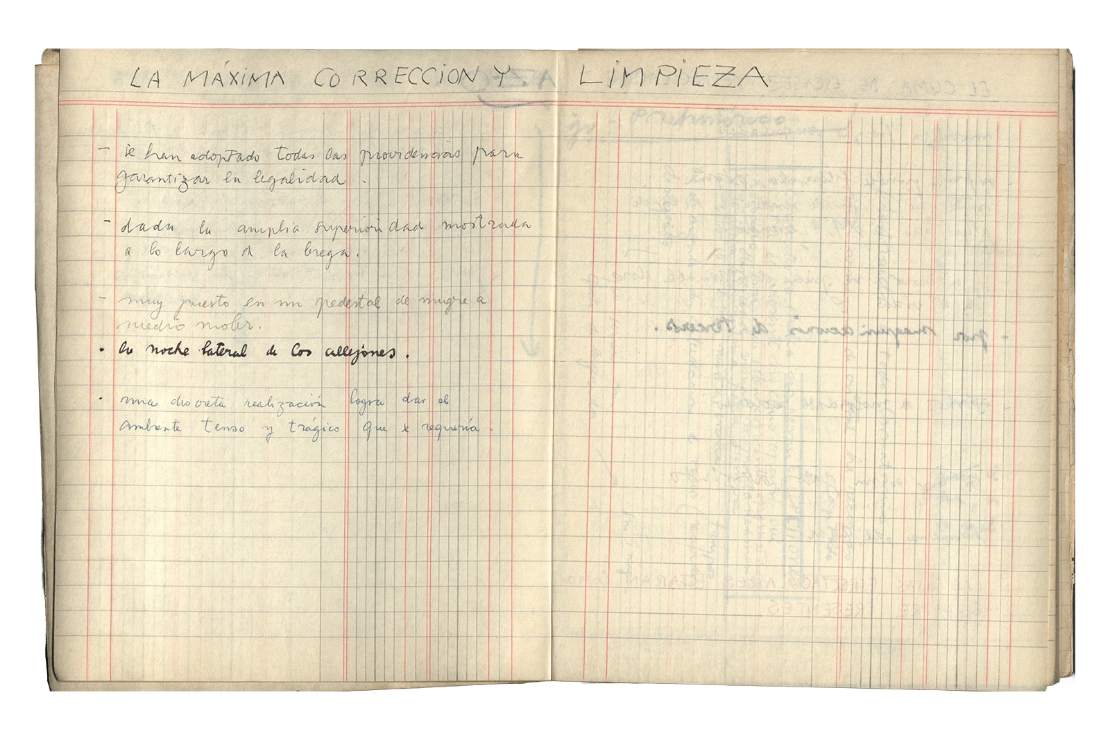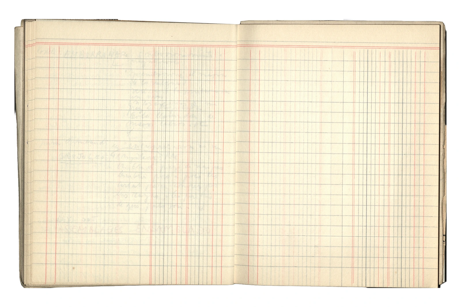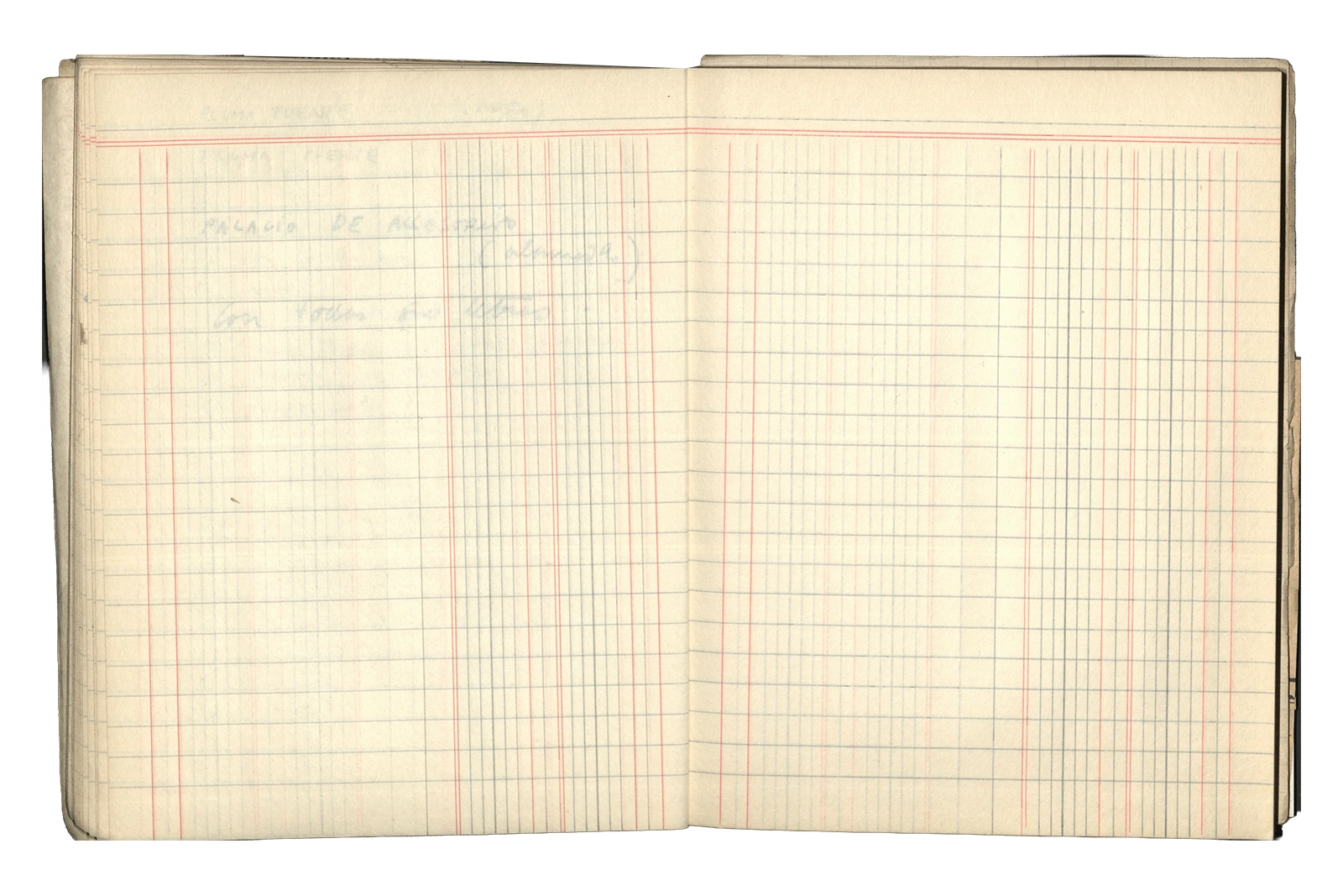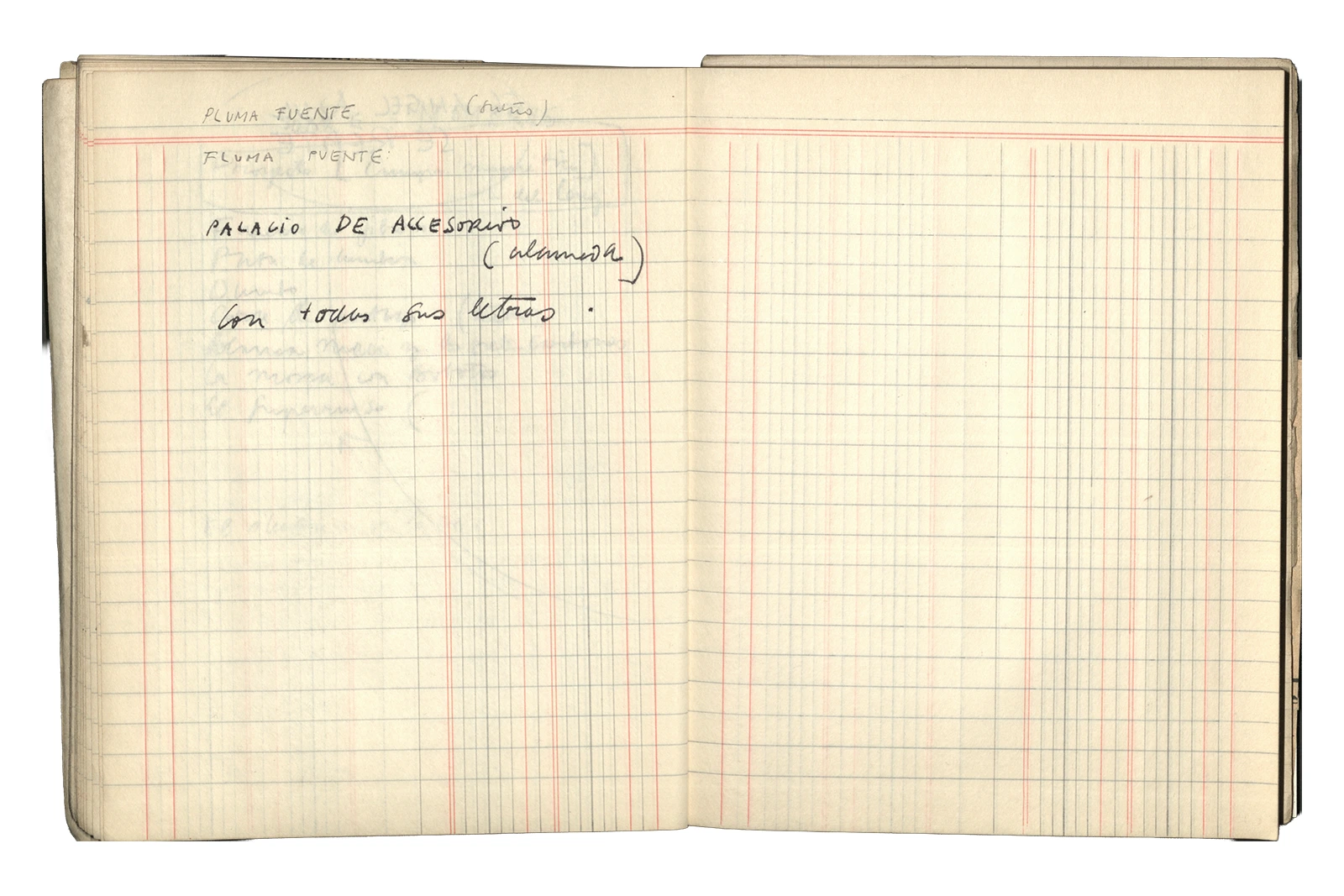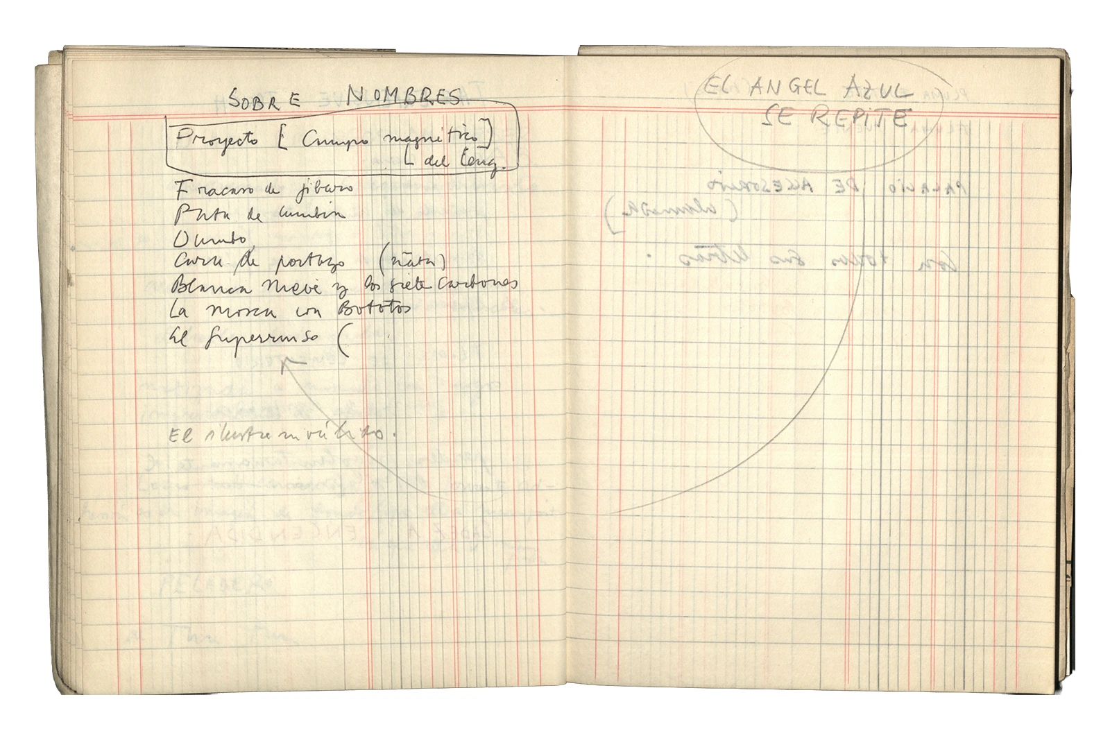 Cuaderno empastado tapa dura, papel mantequilla mecanografiado, notas manuscritas sobre papel en grafito, tinta y pasta, recortes de diarios y revista, venda adhesiva, fichas de biblioteca.