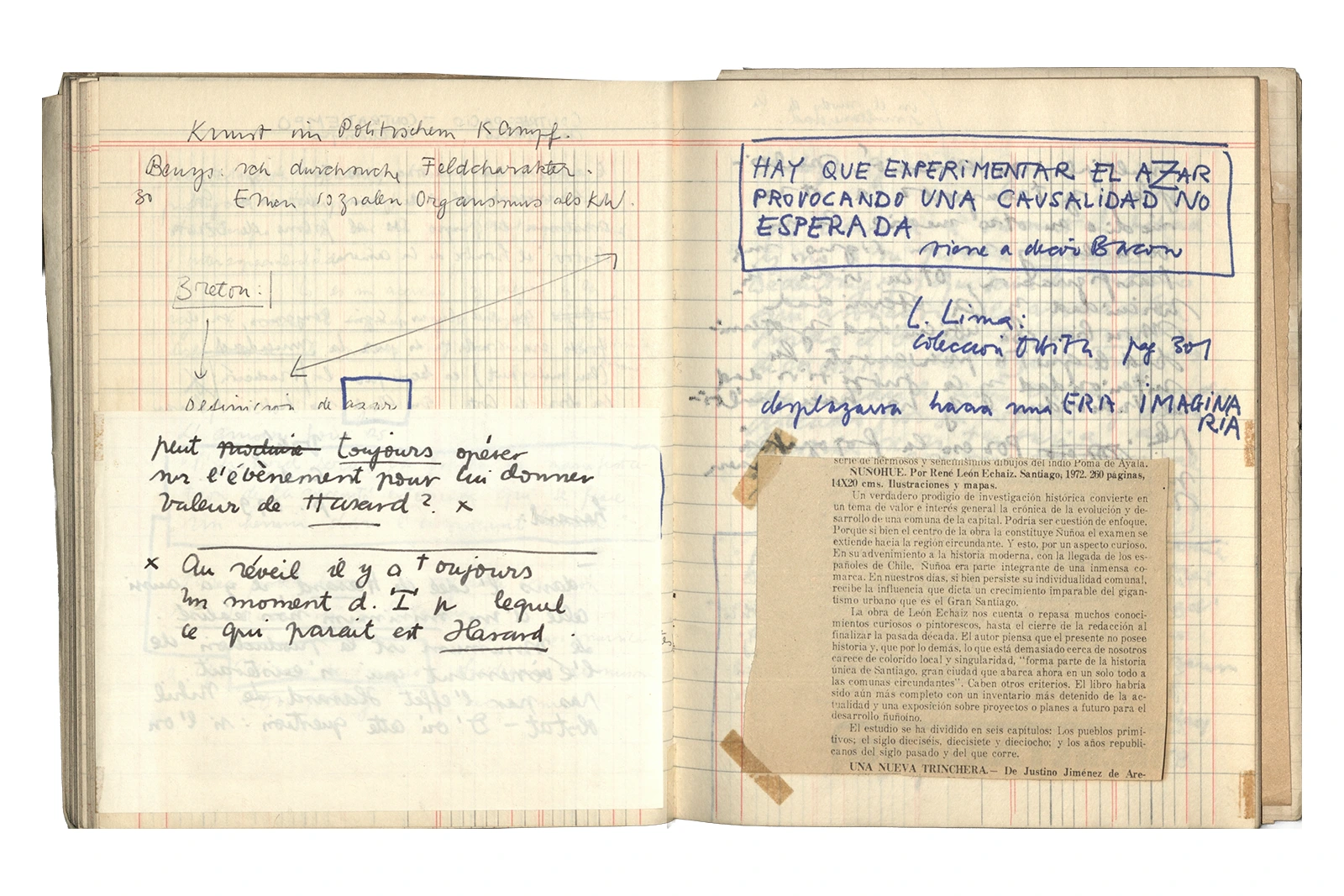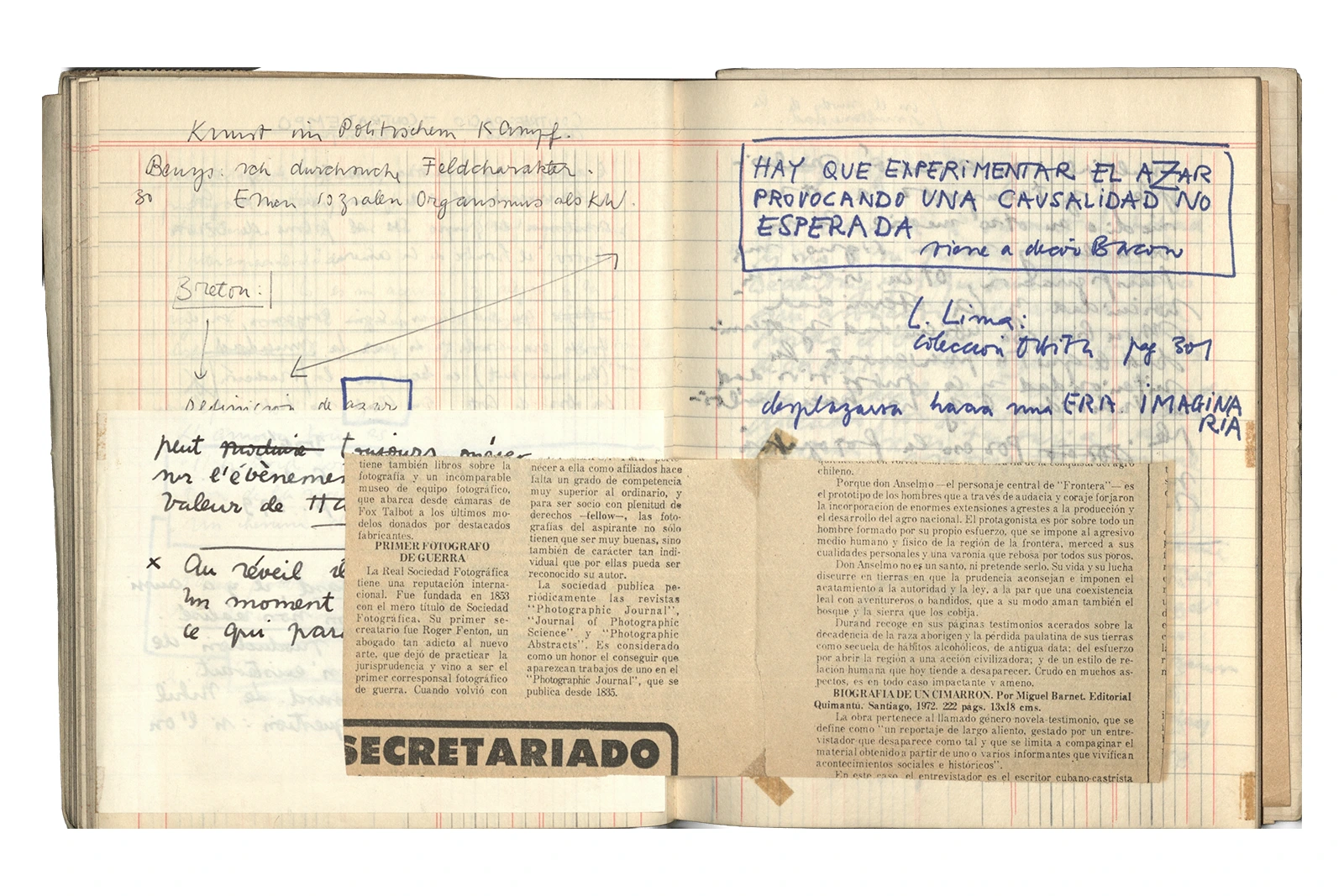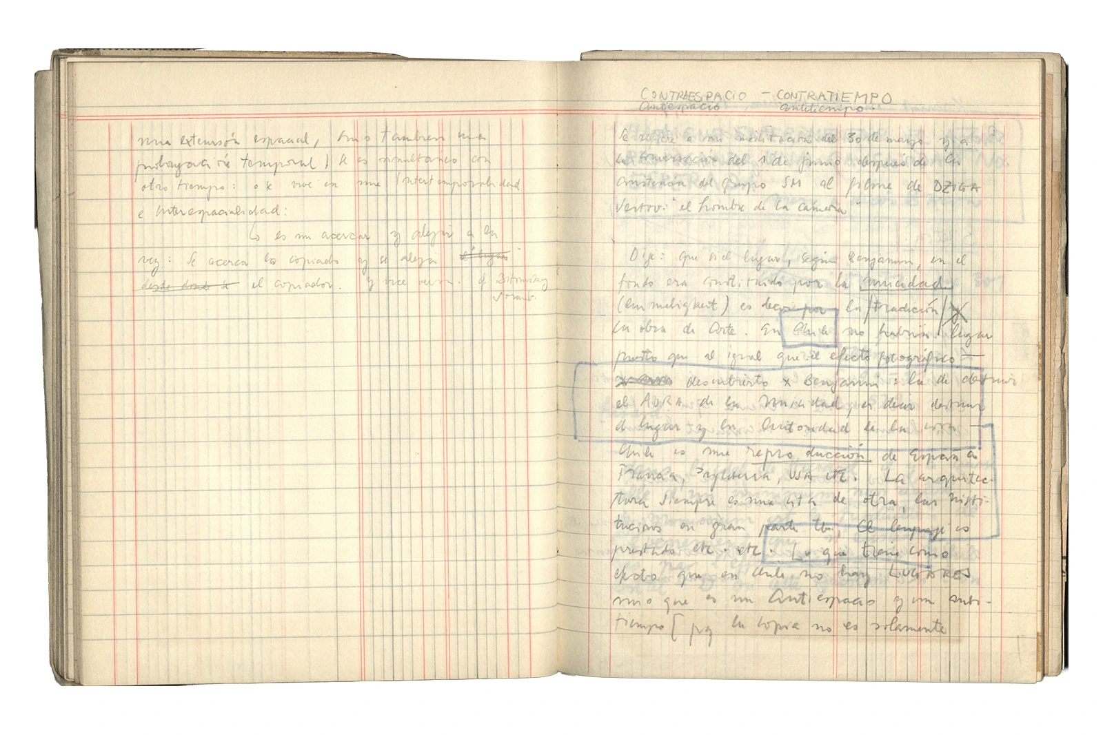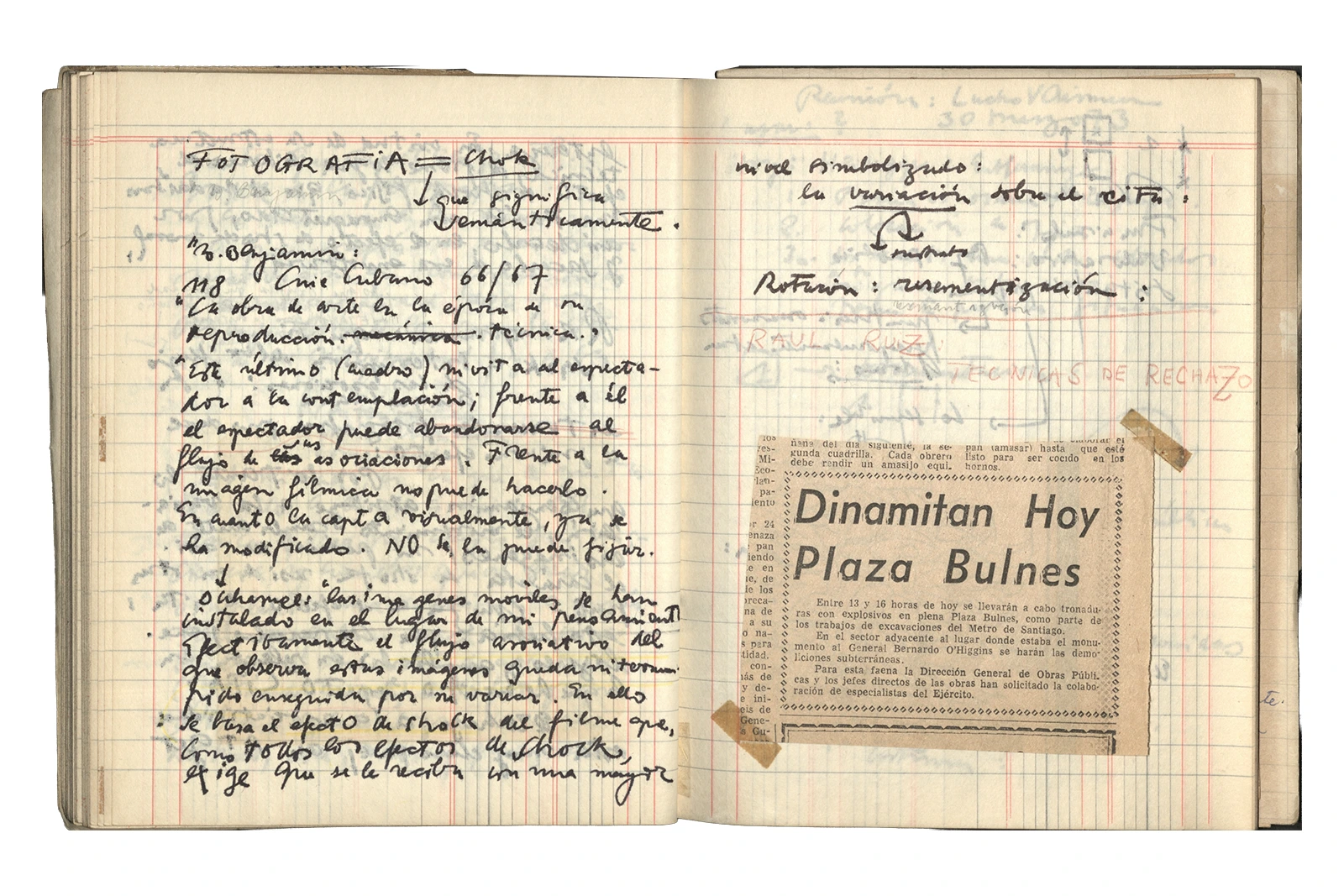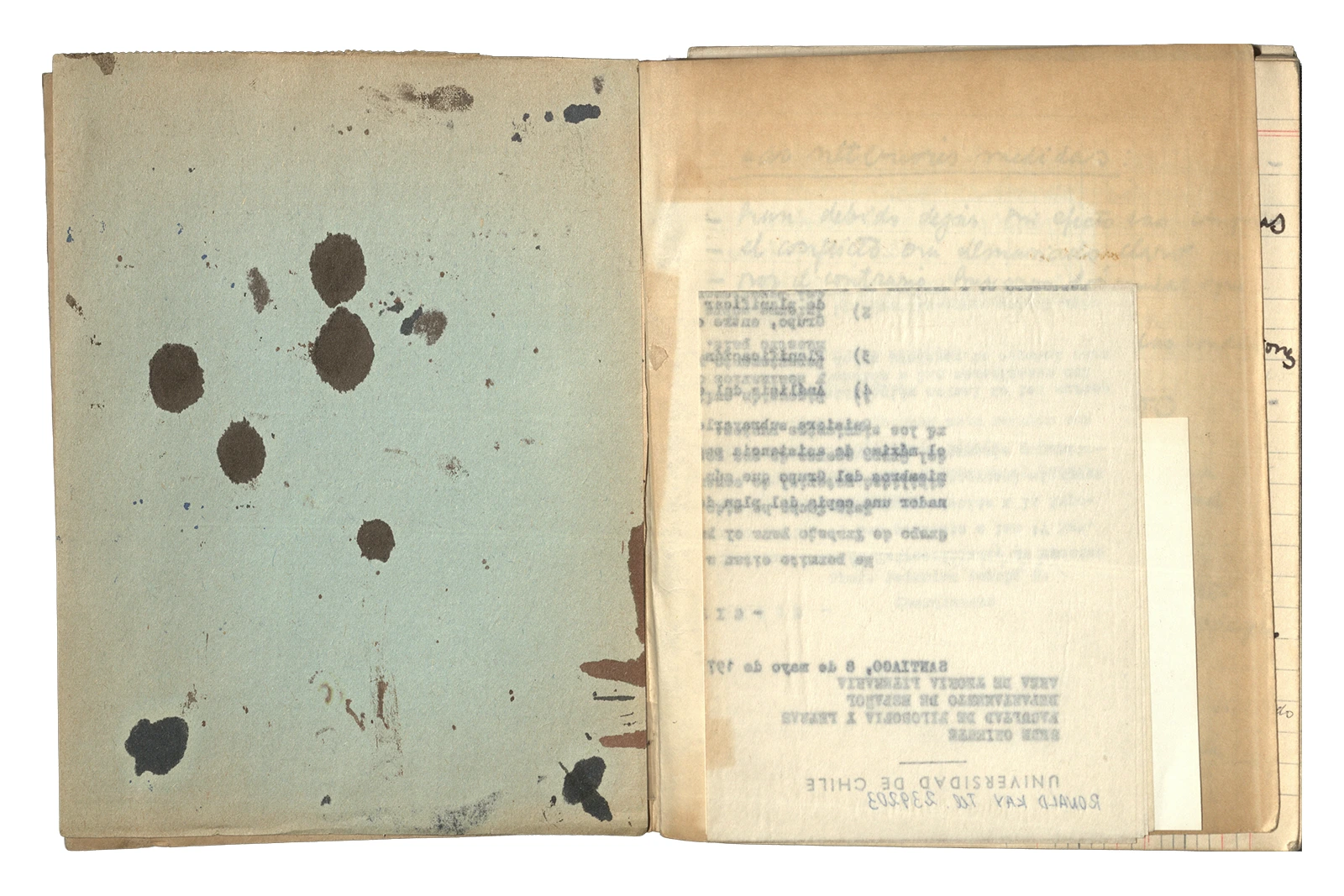 Este cuaderno reúne apuntes del primer semestre de 1973, período en el que Ronald Kay dicta el seminario Análisis del tratado teórico de Walter Benjamin “La obra de arte en la época de la reproducción mecánica” y el curso “La estructuración sígnica del tiempo en la “Récherche du temps perdu” de Marcel Proust” en el Departamento de Estudios Humanísticos de la Universidad de Chile. Incluye notas y listas de materiales para la realización práctica del curso, donde los estudiantes debían documentar espacios públicos. Este cuaderno contiene además una lista extensa de frases extraídas posiblemente de medios de comunicación masiva, recortes de diario, definiciones del concepto de “azar” y referencias a S. Mallarmé, M. Proust, C. Baudelaire, A. Breton, M. Heidegger, J. Beuys, J. Cocteau, F. Bacon, R. Ruiz y N. Parra, entre otros.