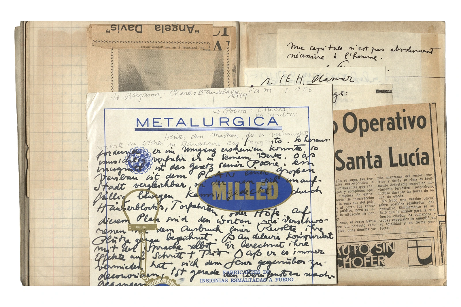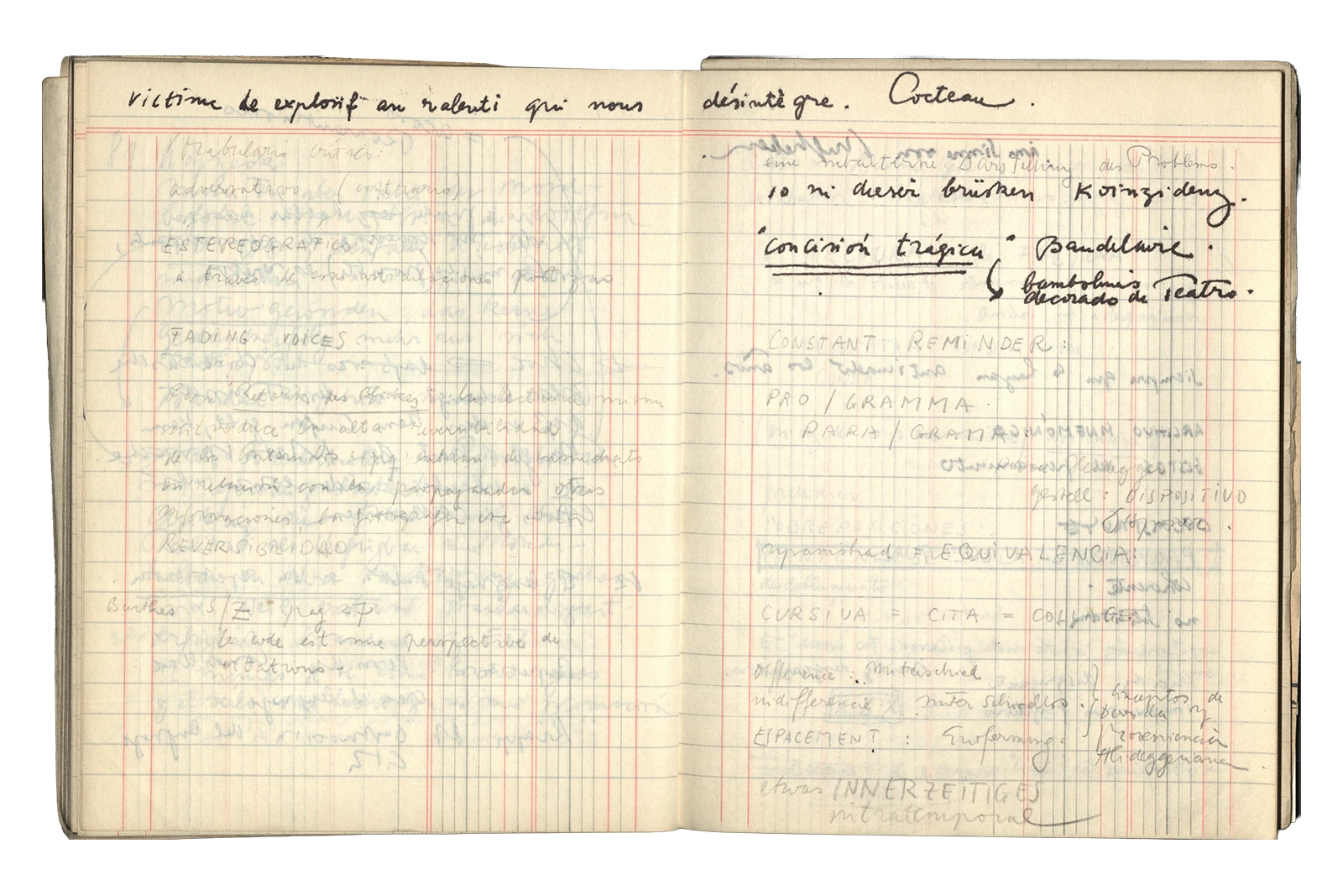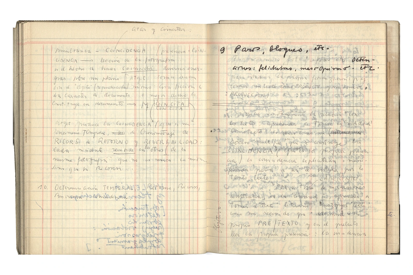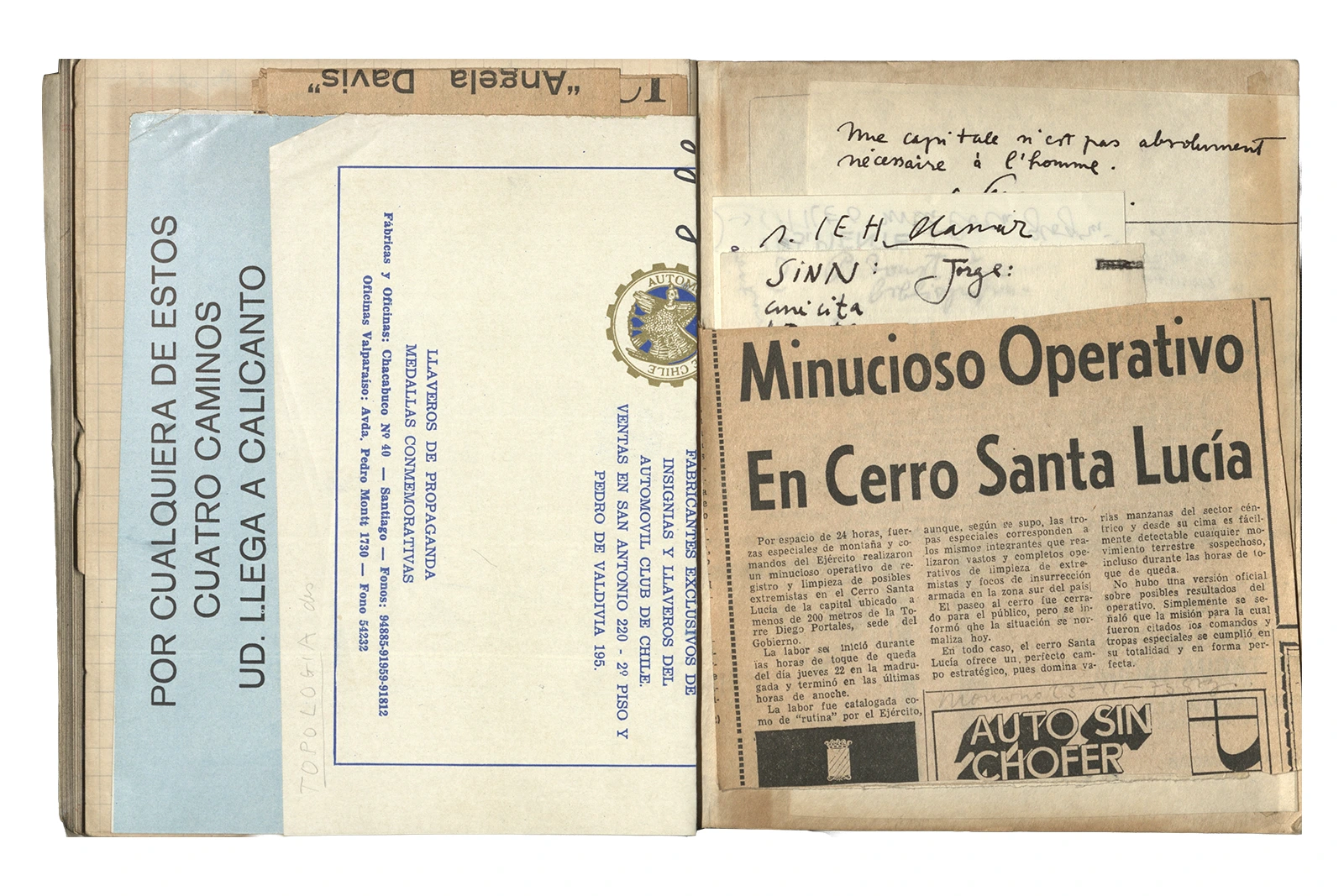 Este cuaderno reúne apuntes del primer semestre de 1973, período en el que Ronald Kay dicta el seminario Análisis del tratado teórico de Walter Benjamin “La obra de arte en la época de la reproducción mecánica” y el curso “La estructuración sígnica del tiempo en la “Récherche du temps perdu” de Marcel Proust” en el Departamento de Estudios Humanísticos de la Universidad de Chile. Incluye notas y listas de materiales para la realización práctica del curso, donde los estudiantes debían documentar espacios públicos. Este cuaderno contiene además una lista extensa de frases extraídas posiblemente de medios de comunicación masiva, recortes de diario, definiciones del concepto de “azar” y referencias a S. Mallarmé, M. Proust, C. Baudelaire, A. Breton, M. Heidegger, J. Beuys, J. Cocteau, F. Bacon, R. Ruiz y N. Parra, entre otros.