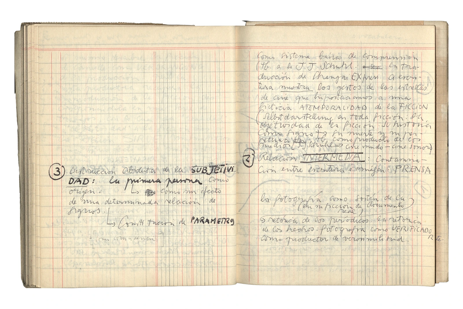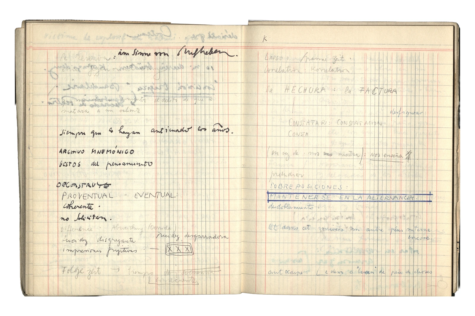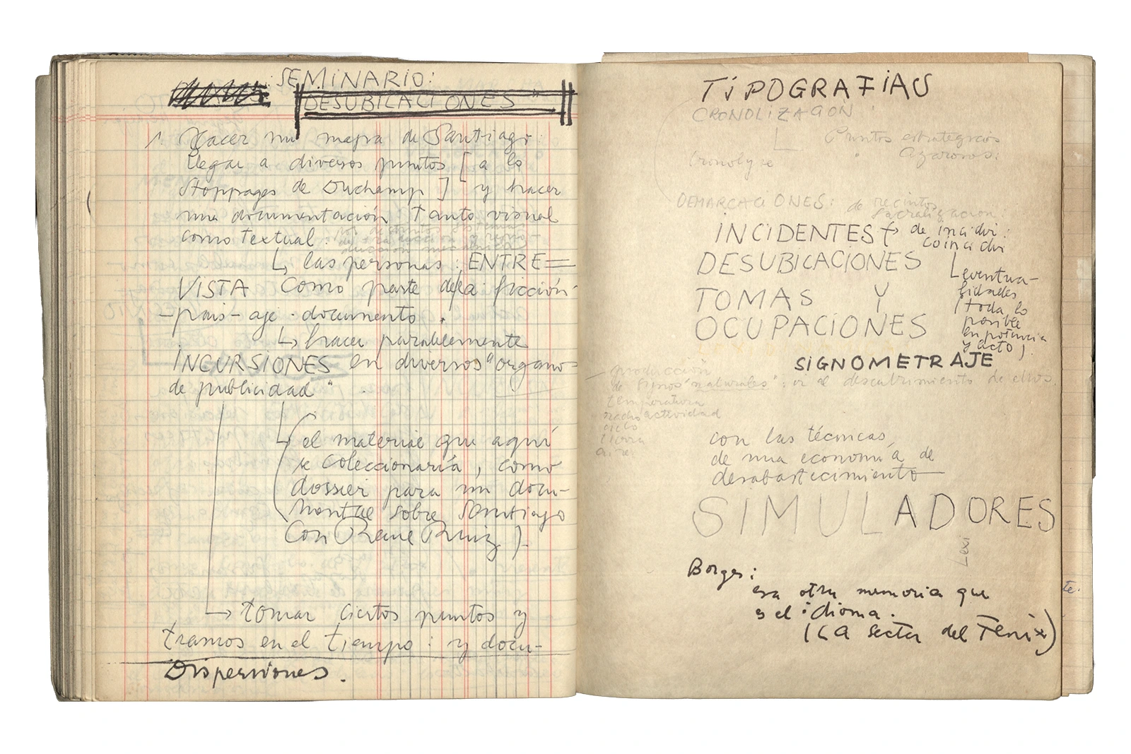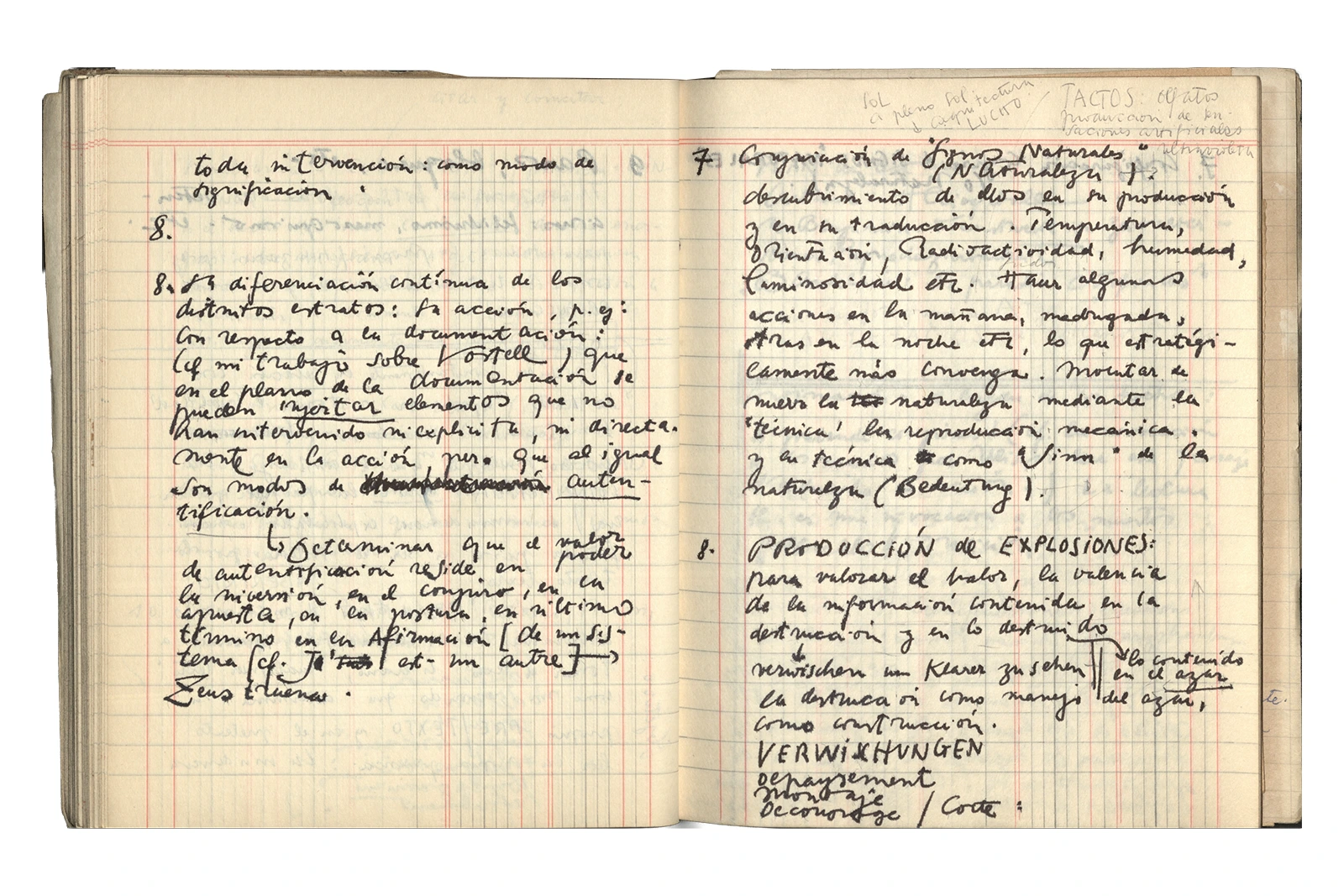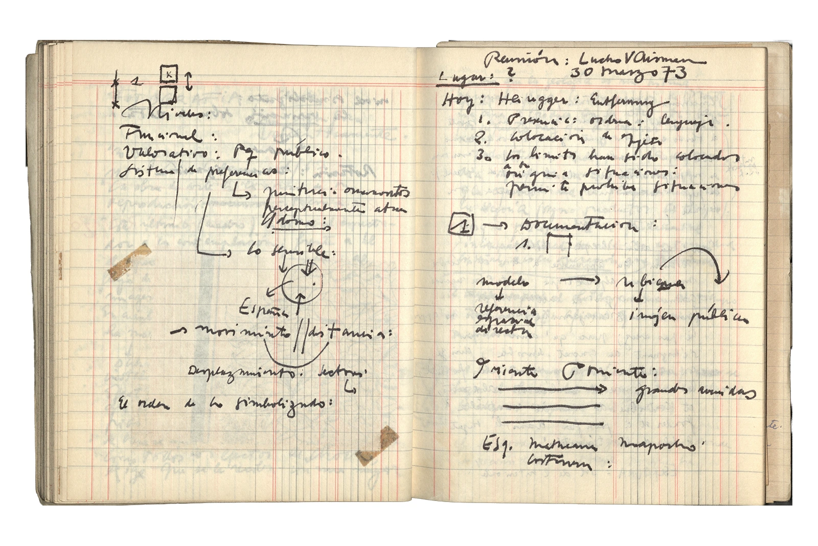 Este cuaderno reúne apuntes del primer semestre de 1973, período en el que Ronald Kay dicta el seminario Análisis del tratado teórico de Walter Benjamin “La obra de arte en la época de la reproducción mecánica” y el curso “La estructuración sígnica del tiempo en la “Récherche du temps perdu” de Marcel Proust” en el Departamento de Estudios Humanísticos de la Universidad de Chile. Incluye notas y listas de materiales para la realización práctica del curso, donde los estudiantes debían documentar espacios públicos. Este cuaderno contiene además una lista extensa de frases extraídas posiblemente de medios de comunicación masiva, recortes de diario, definiciones del concepto de “azar” y referencias a S. Mallarmé, M. Proust, C. Baudelaire, A. Breton, M. Heidegger, J. Beuys, J. Cocteau, F. Bacon, R. Ruiz y N. Parra, entre otros.