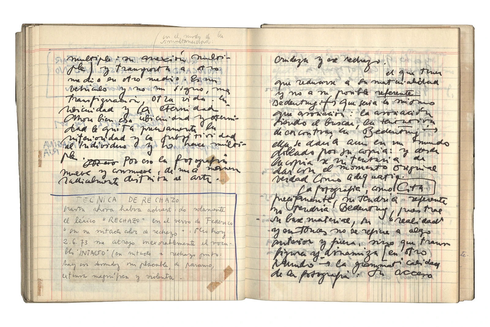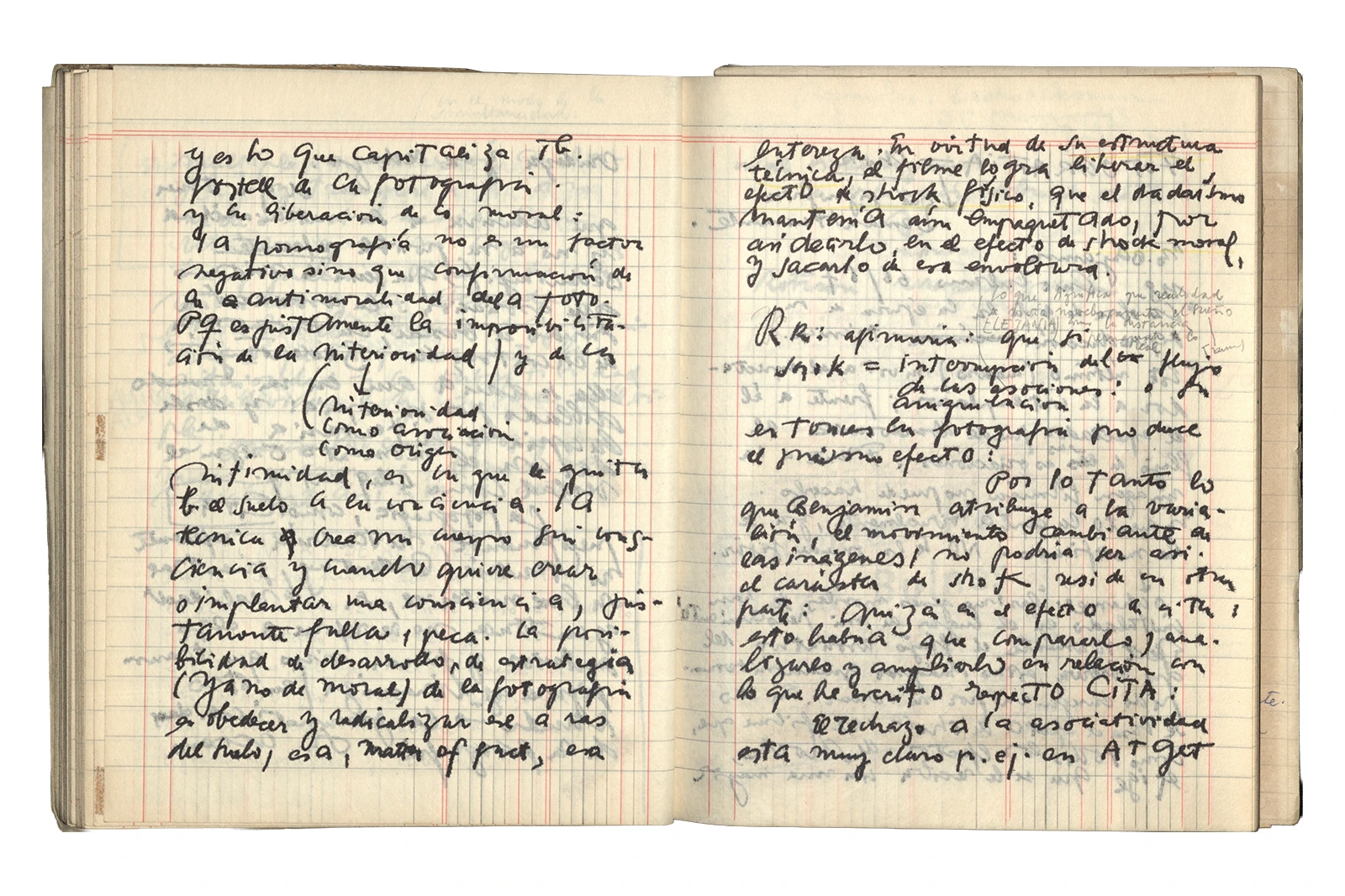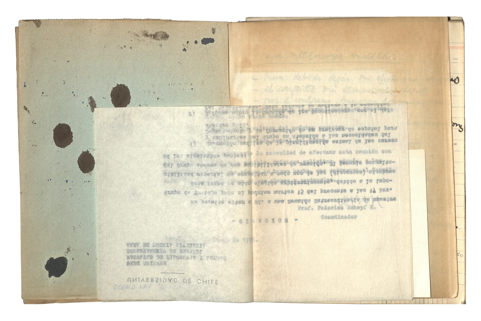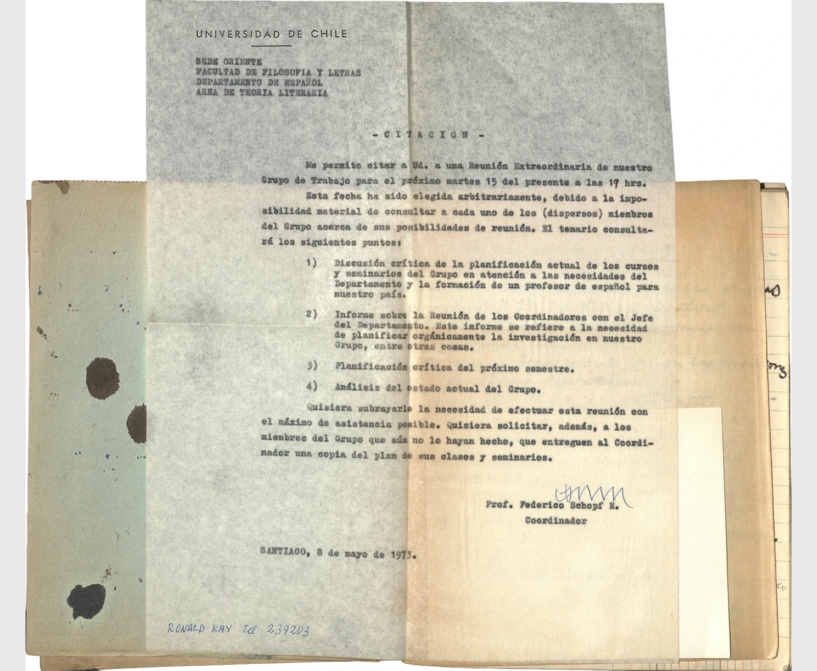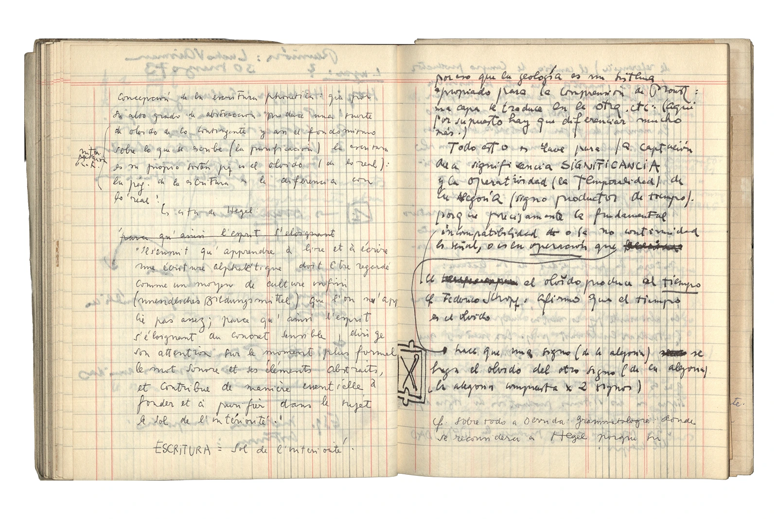 Este cuaderno reúne apuntes del primer semestre de 1973, período en el que Ronald Kay dicta el seminario Análisis del tratado teórico de Walter Benjamin “La obra de arte en la época de la reproducción mecánica” y el curso “La estructuración sígnica del tiempo en la “Récherche du temps perdu” de Marcel Proust” en el Departamento de Estudios Humanísticos de la Universidad de Chile. Incluye notas y listas de materiales para la realización práctica del curso, donde los estudiantes debían documentar espacios públicos. Este cuaderno contiene además una lista extensa de frases extraídas posiblemente de medios de comunicación masiva, recortes de diario, definiciones del concepto de “azar” y referencias a S. Mallarmé, M. Proust, C. Baudelaire, A. Breton, M. Heidegger, J. Beuys, J. Cocteau, F. Bacon, R. Ruiz y N. Parra, entre otros.