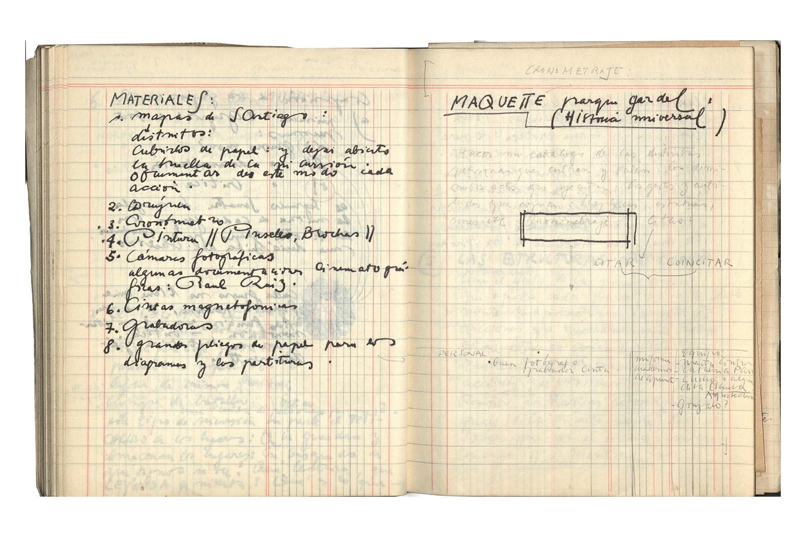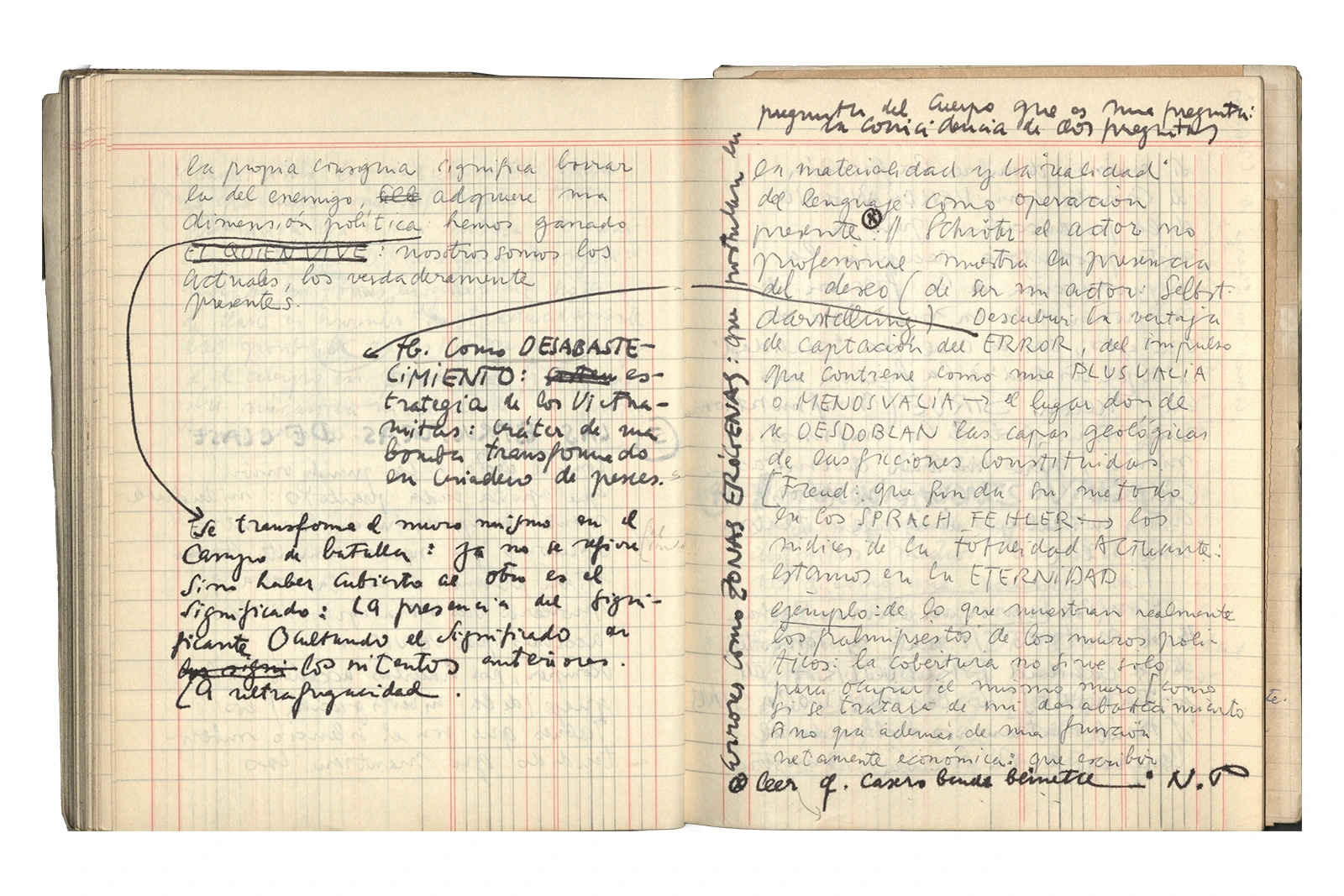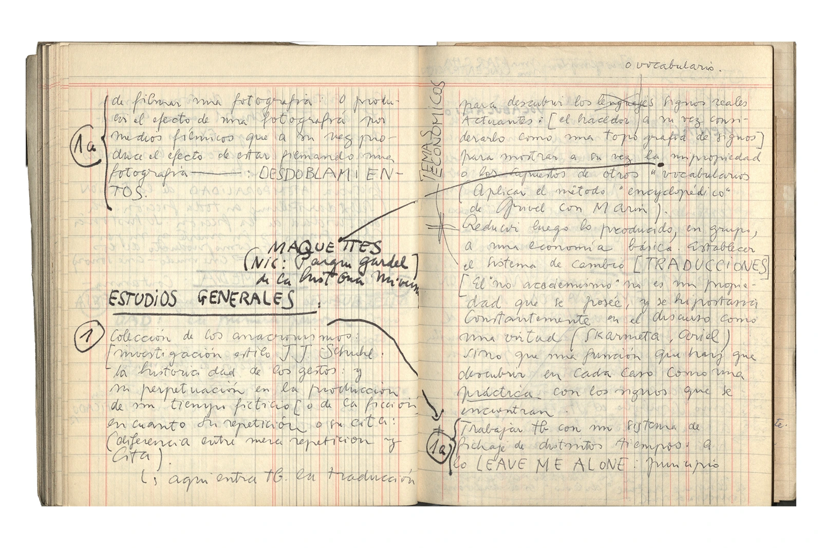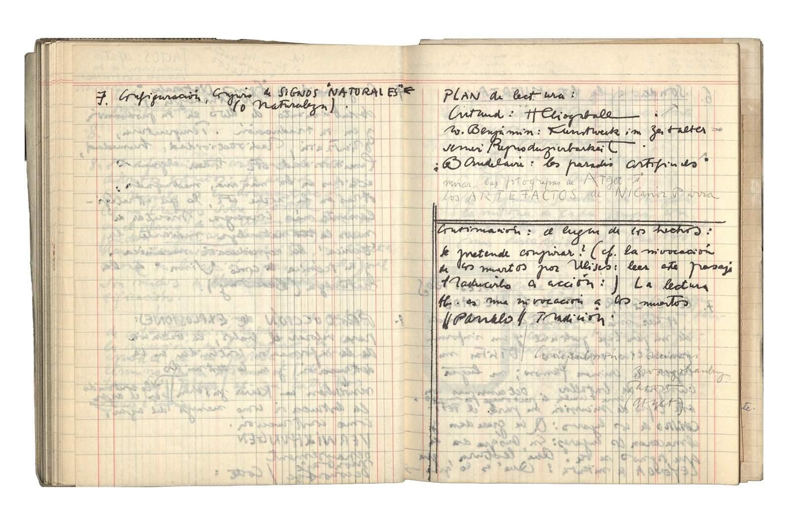 Este cuaderno reúne apuntes del primer semestre de 1973, período en el que Ronald Kay dicta el seminario Análisis del tratado teórico de Walter Benjamin “La obra de arte en la época de la reproducción mecánica” y el curso “La estructuración sígnica del tiempo en la “Récherche du temps perdu” de Marcel Proust” en el Departamento de Estudios Humanísticos de la Universidad de Chile. Incluye notas y listas de materiales para la realización práctica del curso, donde los estudiantes debían documentar espacios públicos. Este cuaderno contiene además una lista extensa de frases extraídas posiblemente de medios de comunicación masiva, recortes de diario, definiciones del concepto de “azar” y referencias a S. Mallarmé, M. Proust, C. Baudelaire, A. Breton, M. Heidegger, J. Beuys, J. Cocteau, F. Bacon, R. Ruiz y N. Parra, entre otros.